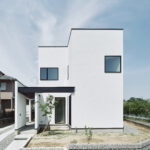 ゆったりした旗竿敷地で敷地の余白を上手く活用し内部と外部のつながりを強調したシンプルモダン住宅です。外観は軒を大きく出し落ち着いた雰囲気とし、外壁はシンプルモダン住宅を強調する白いフラットサイディングボードで仕上げました。2階は勾配天井で広がりのあるLDK空間としました。