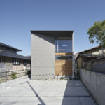 海と⼭の境⽬の崖に建つ、⽊の箱のような⼆世帯住宅です。南側には⼭が、北側には海が広がっています。