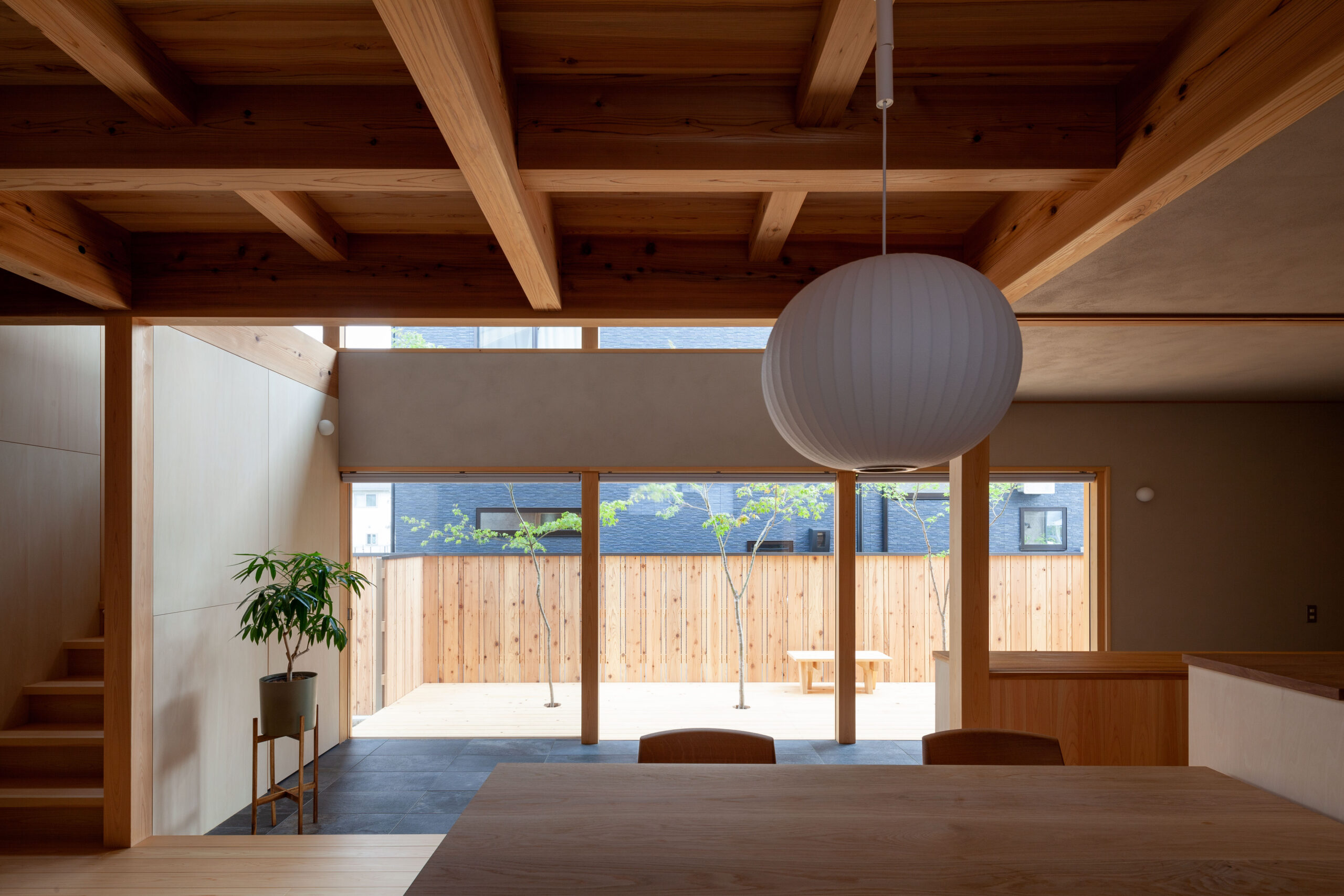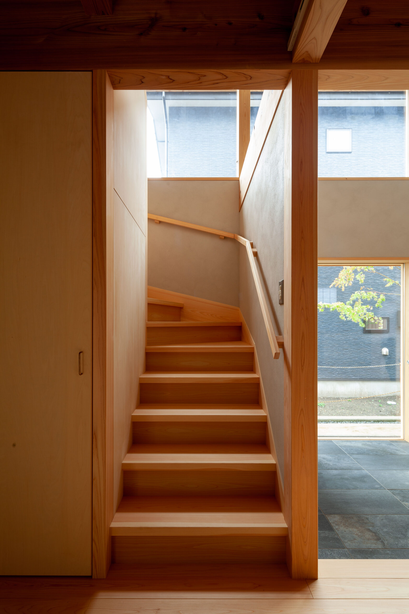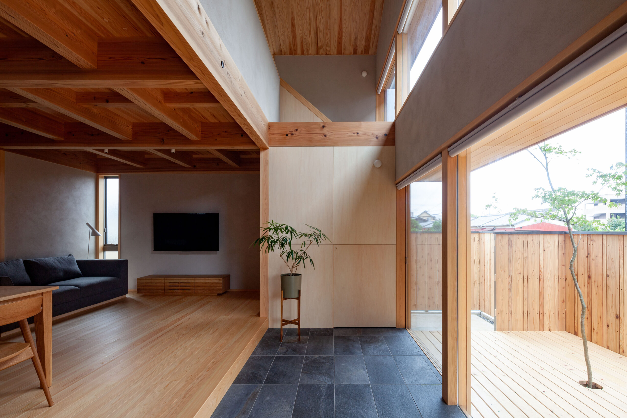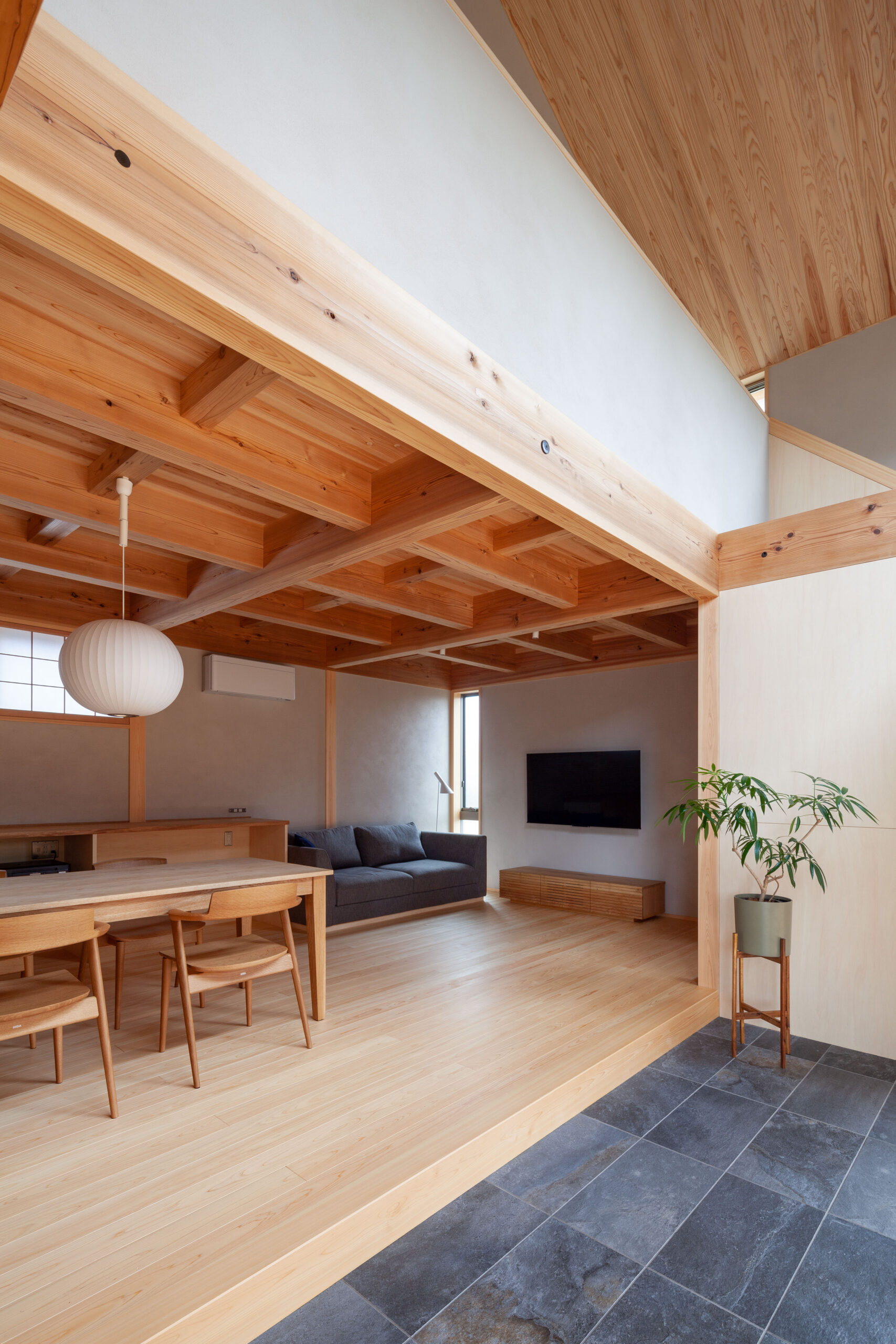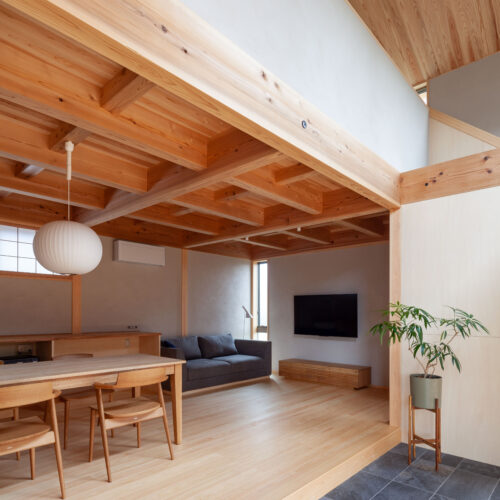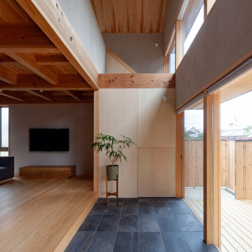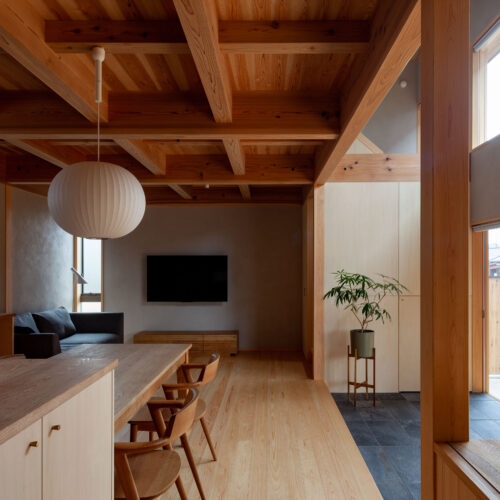吹抜のある土間空間が特徴的な住宅。建蔽率/容積率=40/60、第一種低層住居専用地域という面積的・容積的に厳しい制約がある中で、あえて取り入れた吹抜の土間空間によって、内部と外部を緩やかに繋いだ、新たな居場所としての「ゆとり」をもたらすことを意図した。また施主が大工ということもあり、造作材は基本的にスギやヒノキといった国産材を使い、構造の現しや製作の建具・家具、瓦や塗壁など、内・外ともに一貫して職人らしい、手仕事が現れる仕上を多く採用している。