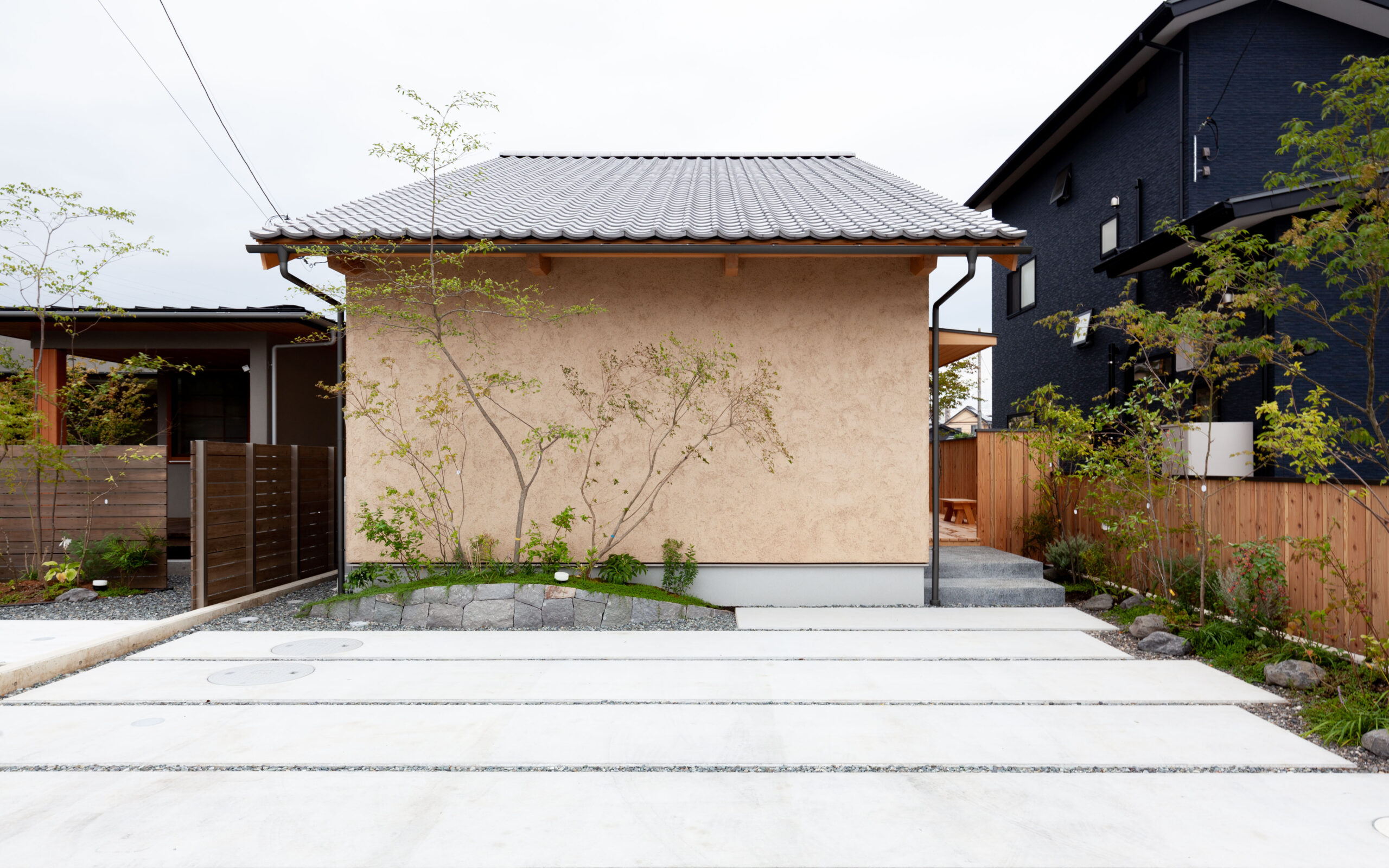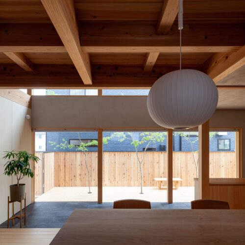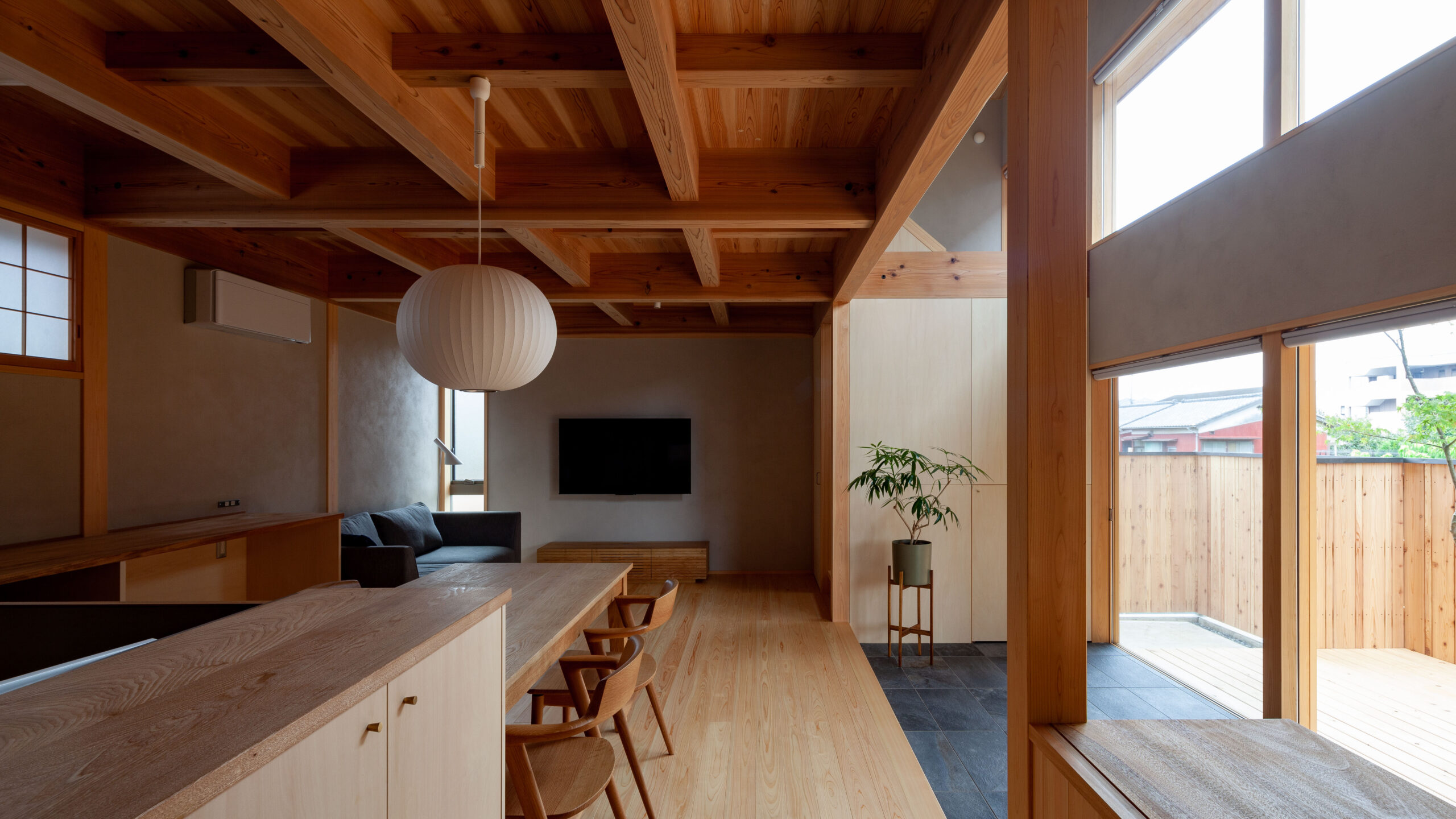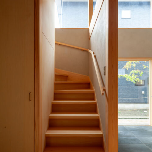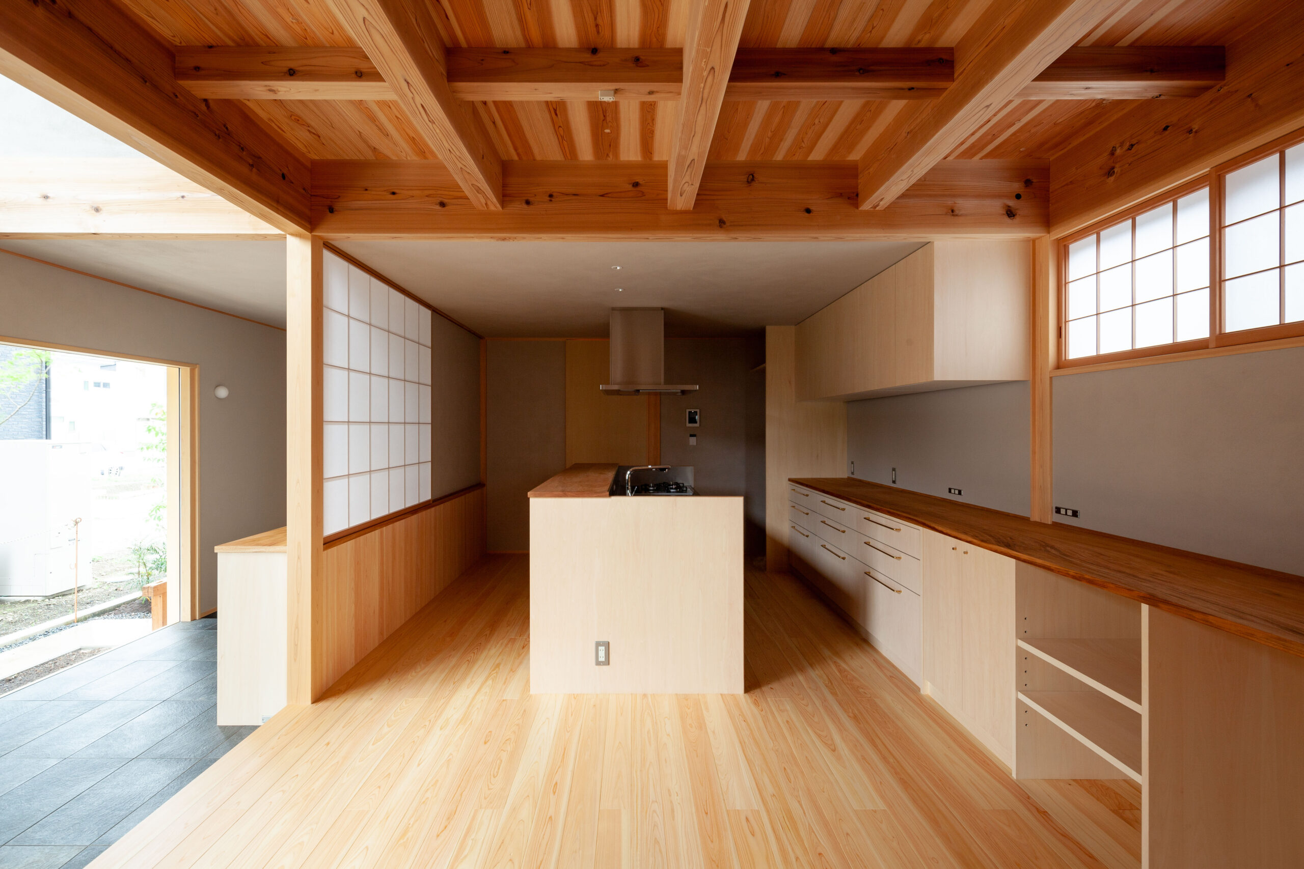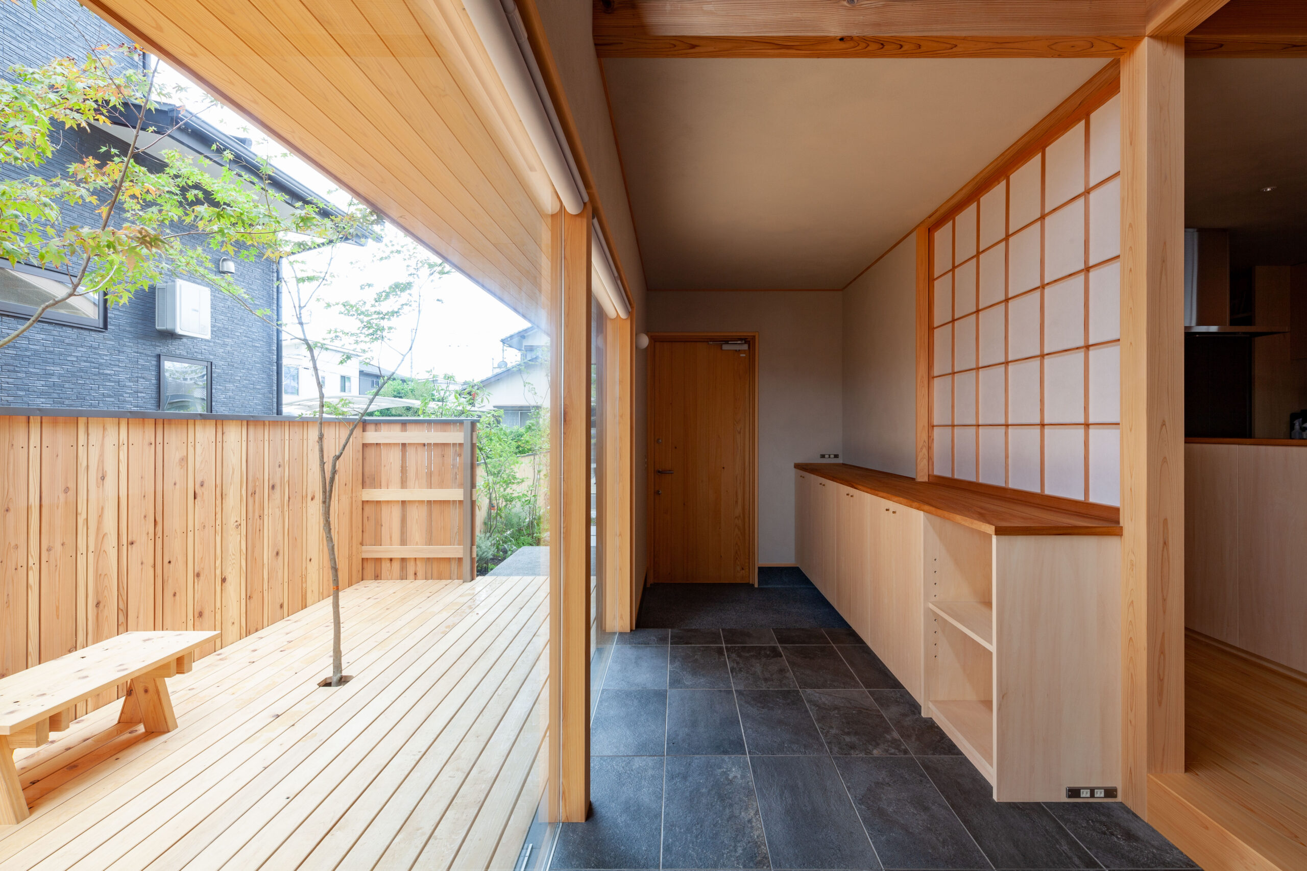 吹抜のある土間空間が特徴的な住宅。建蔽率/容積率=40/60、第一種低層住居専用地域という面積的・容積的に厳しい制約がある中で、あえて取り入れた吹抜の土間空間によって、内部と外部を緩やかに繋いだ、新たな居場所としての「ゆとり」をもたらすことを意図した。また施主が大工ということもあり、造作材は基本的にスギやヒノキといった国産材を使い、構造の現しや製作の建具・家具、瓦や塗壁など、内・外ともに一貫して職人らしい、手仕事が現れる仕上を多く採用している。
