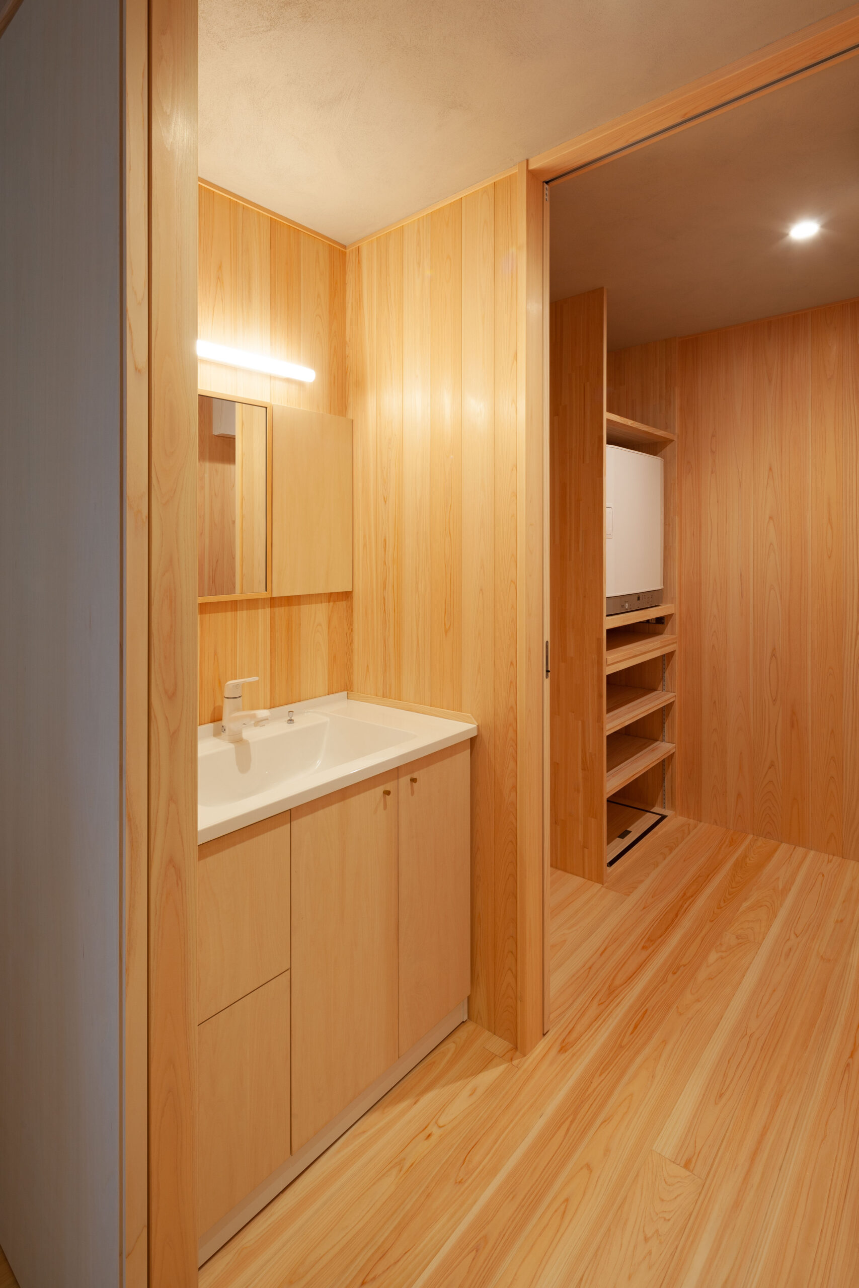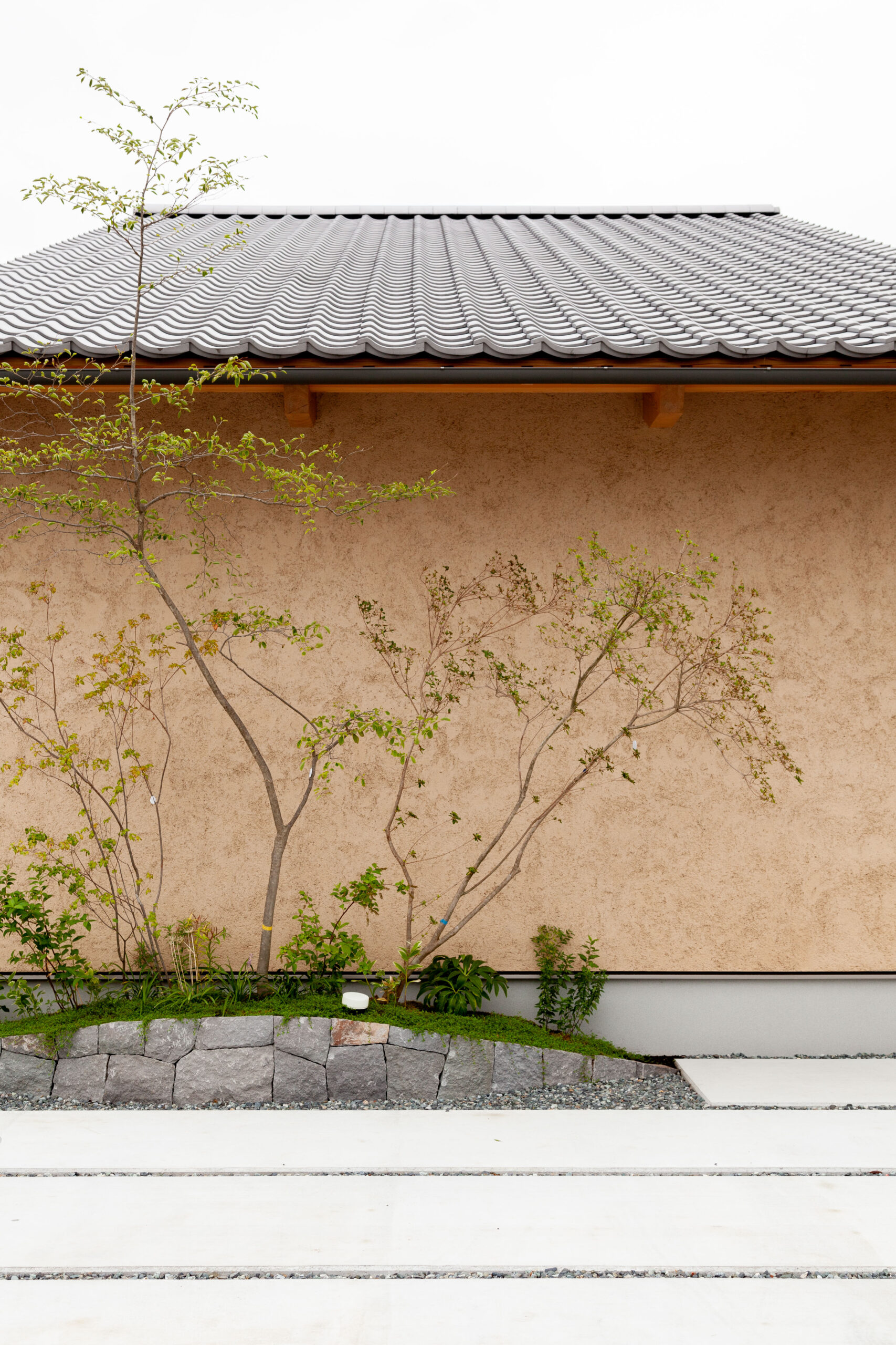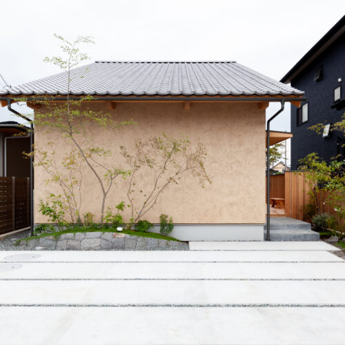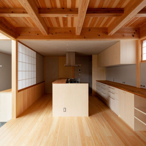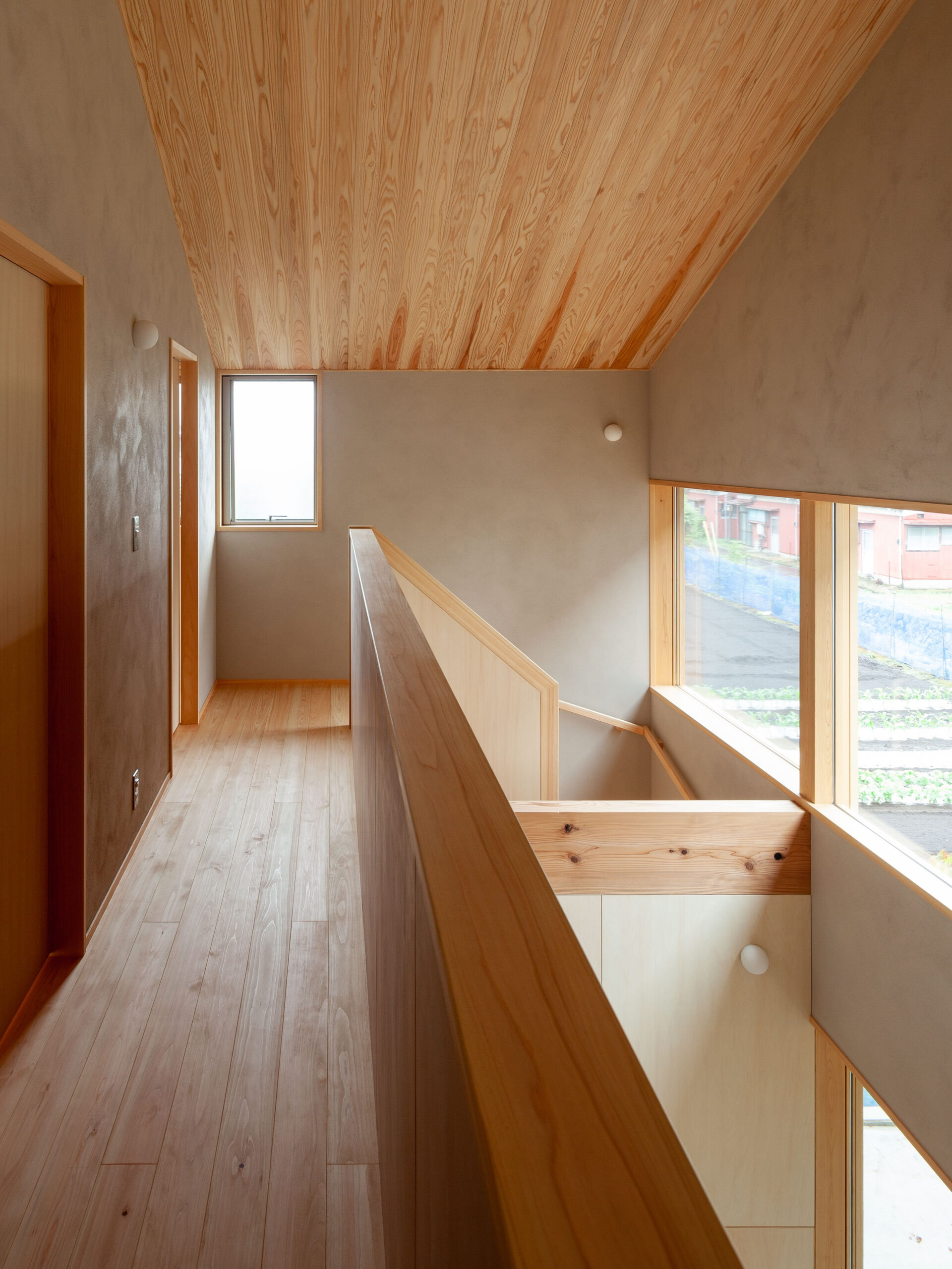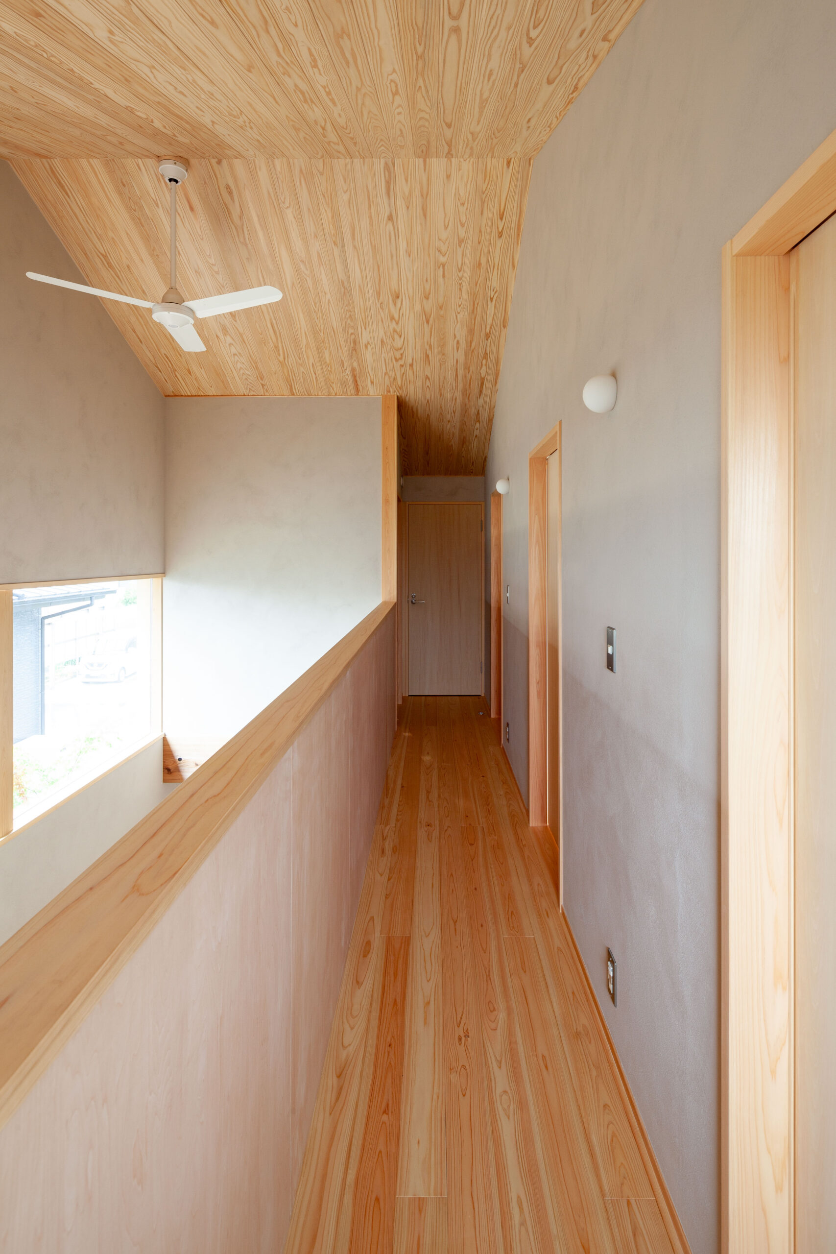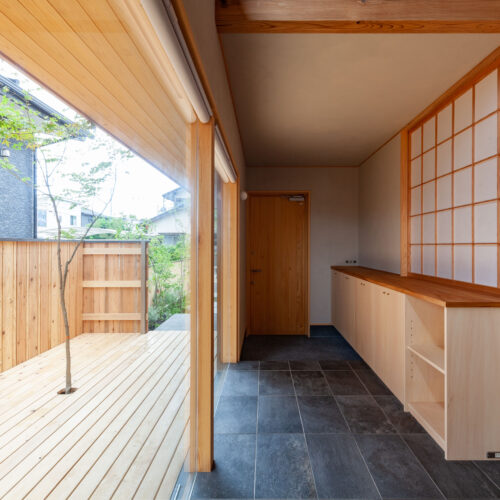 吹抜のある土間空間が特徴的な住宅。建蔽率/容積率=40/60、第一種低層住居専用地域という面積的・容積的に厳しい制約がある中で、あえて取り入れた吹抜の土間空間によって、内部と外部を緩やかに繋いだ、新たな居場所としての「ゆとり」をもたらすことを意図した。また施主が大工ということもあり、造作材は基本的にスギやヒノキといった国産材を使い、構造の現しや製作の建具・家具、瓦や塗壁など、内・外ともに一貫して職人らしい、手仕事が現れる仕上を多く採用している。