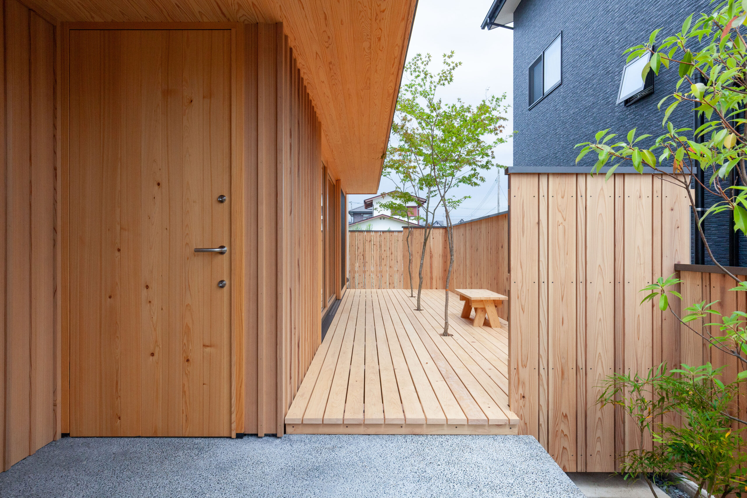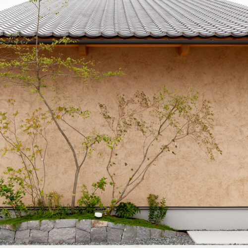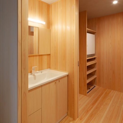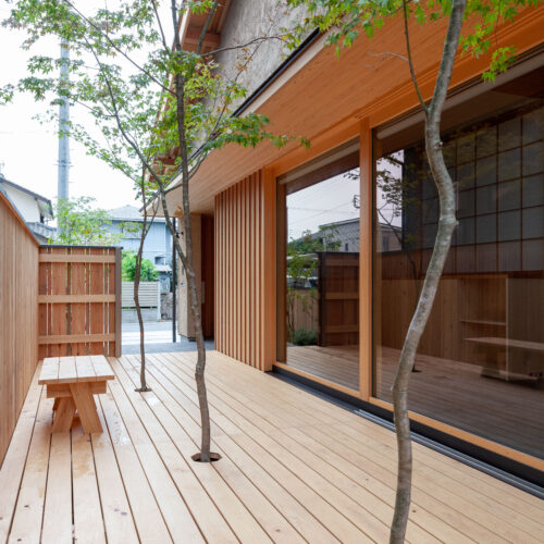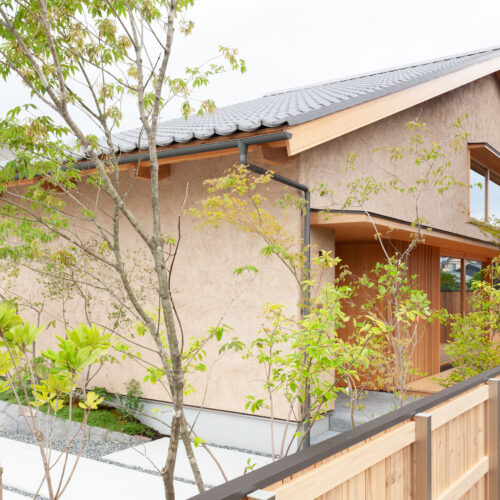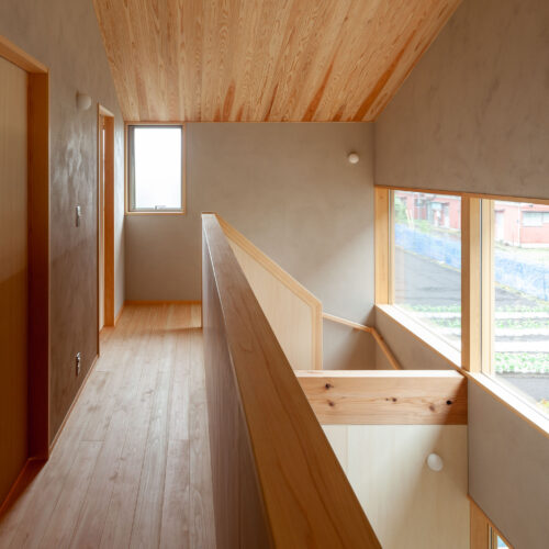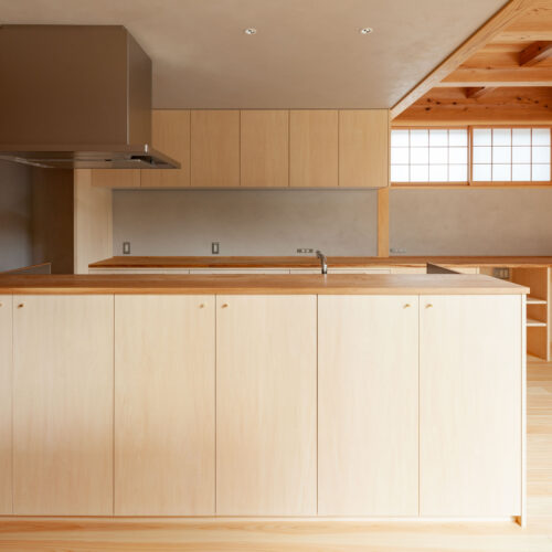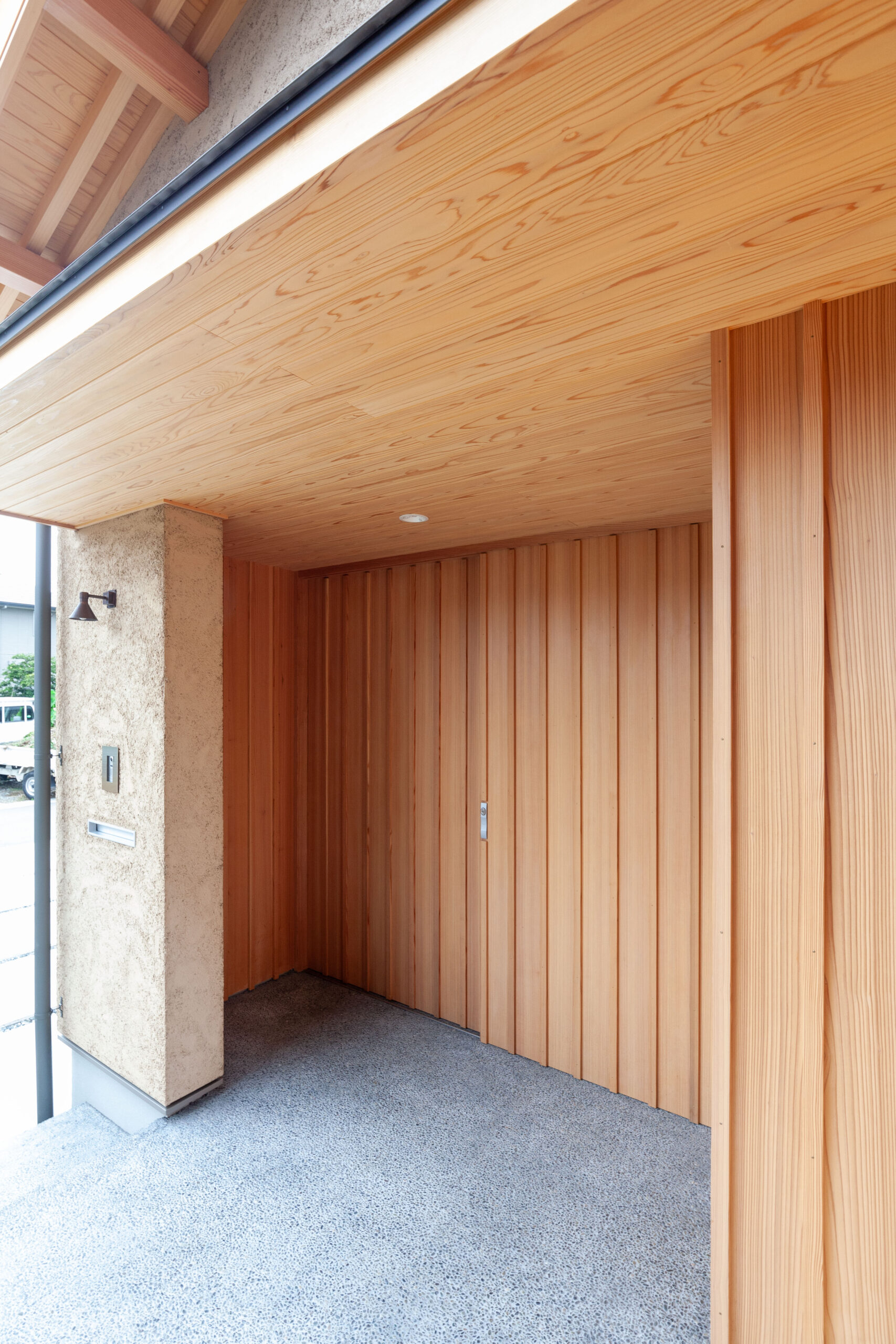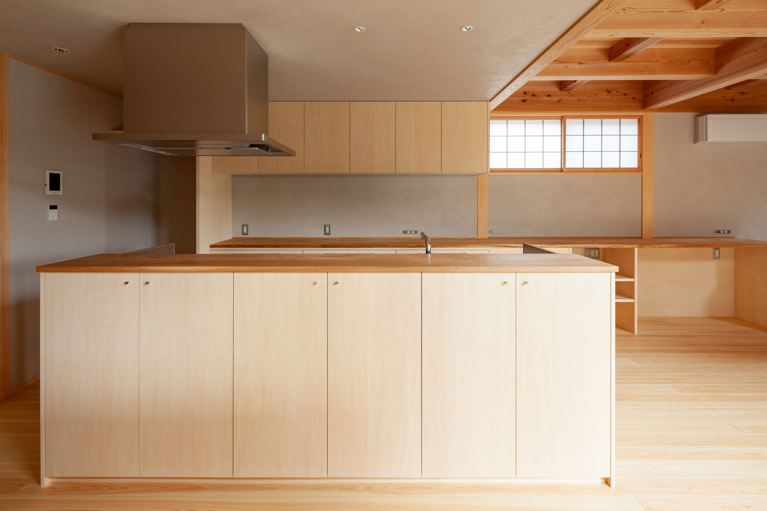 吹抜のある土間空間が特徴的な住宅。建蔽率/容積率=40/60、第一種低層住居専用地域という面積的・容積的に厳しい制約がある中で、あえて取り入れた吹抜の土間空間によって、内部と外部を緩やかに繋いだ、新たな居場所としての「ゆとり」をもたらすことを意図した。また施主が大工ということもあり、造作材は基本的にスギやヒノキといった国産材を使い、構造の現しや製作の建具・家具、瓦や塗壁など、内・外ともに一貫して職人らしい、手仕事が現れる仕上を多く採用している。