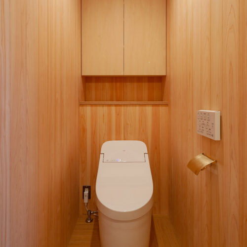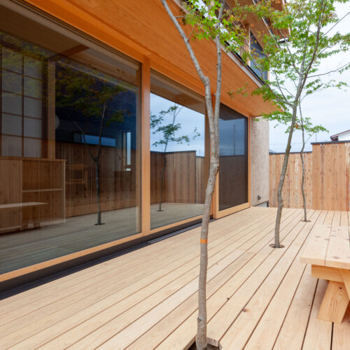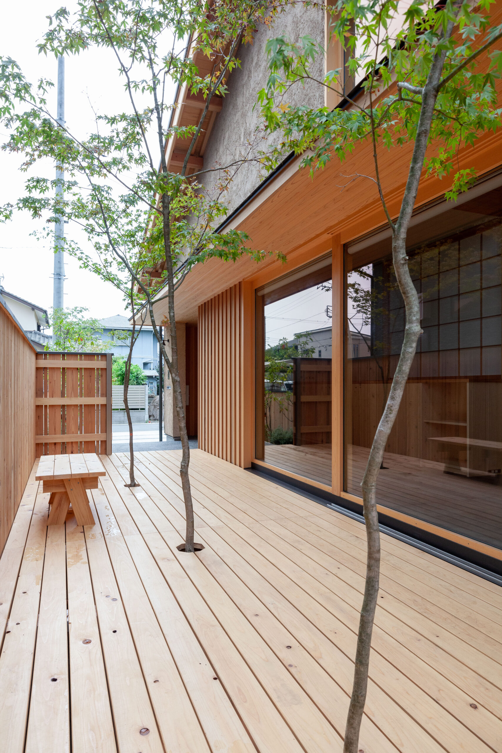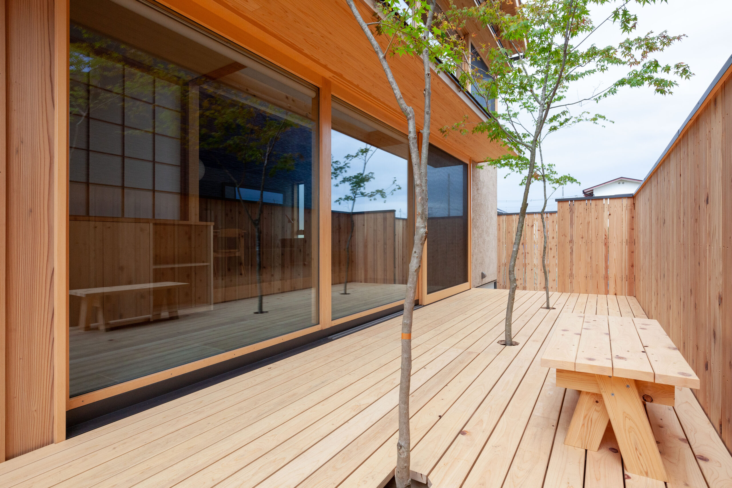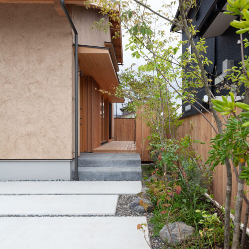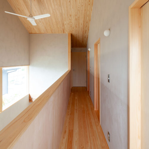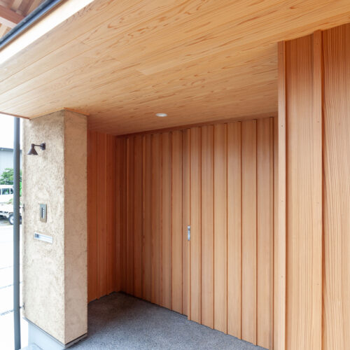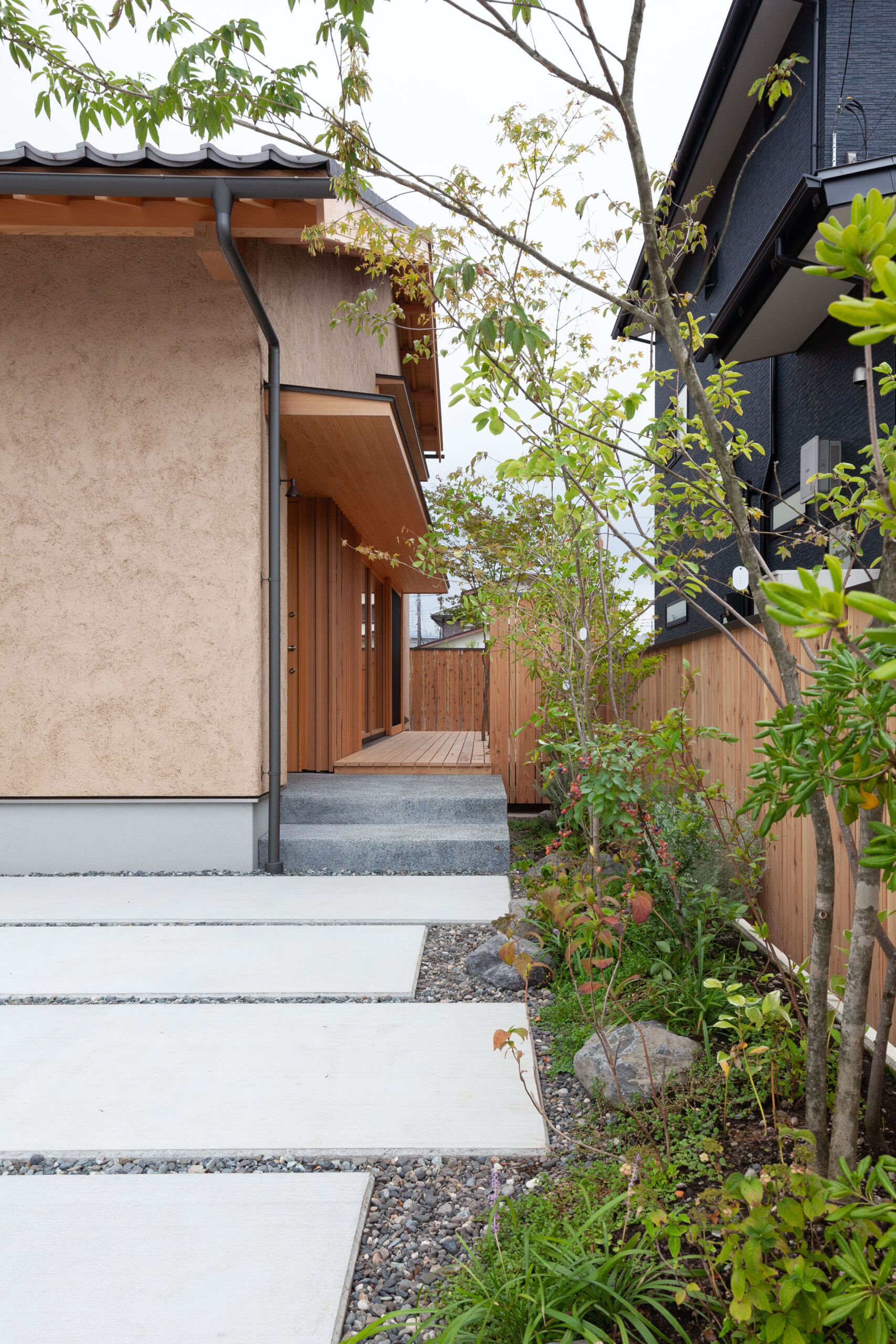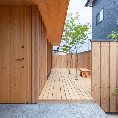 吹抜のある土間空間が特徴的な住宅。建蔽率/容積率=40/60、第一種低層住居専用地域という面積的・容積的に厳しい制約がある中で、あえて取り入れた吹抜の土間空間によって、内部と外部を緩やかに繋いだ、新たな居場所としての「ゆとり」をもたらすことを意図した。また施主が大工ということもあり、造作材は基本的にスギやヒノキといった国産材を使い、構造の現しや製作の建具・家具、瓦や塗壁など、内・外ともに一貫して職人らしい、手仕事が現れる仕上を多く採用している。