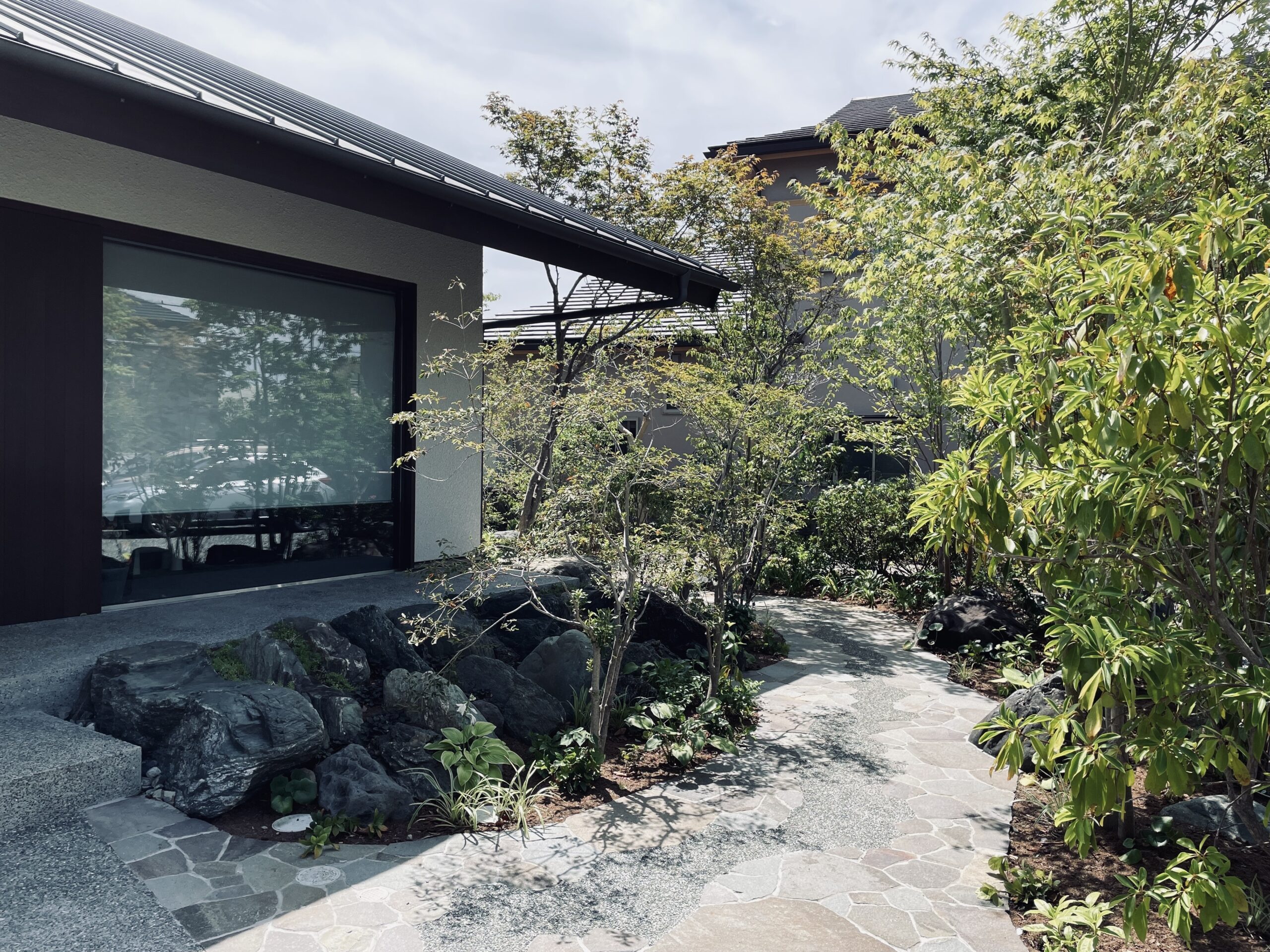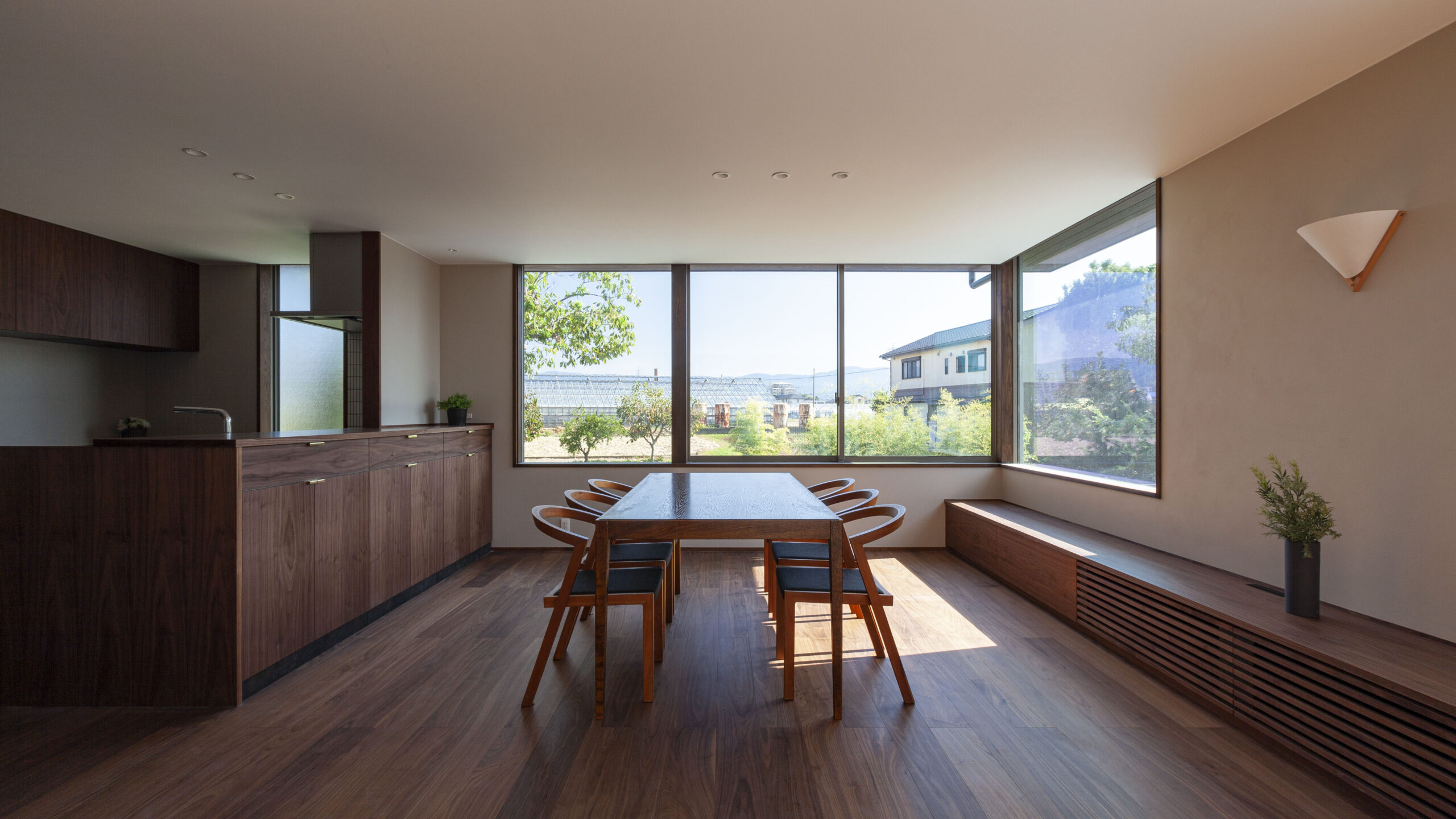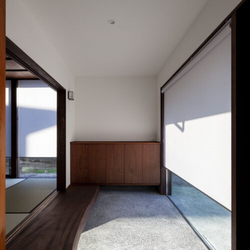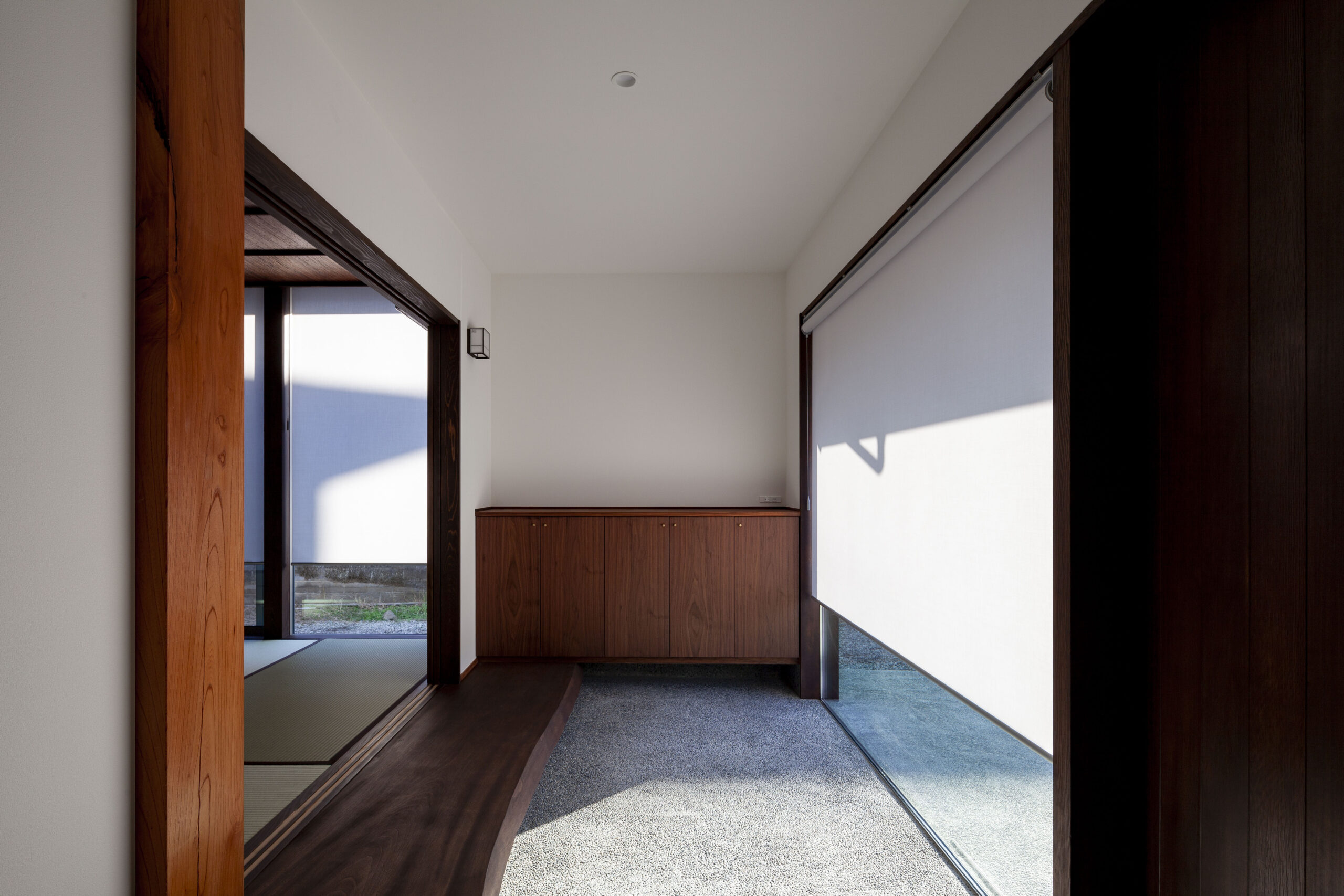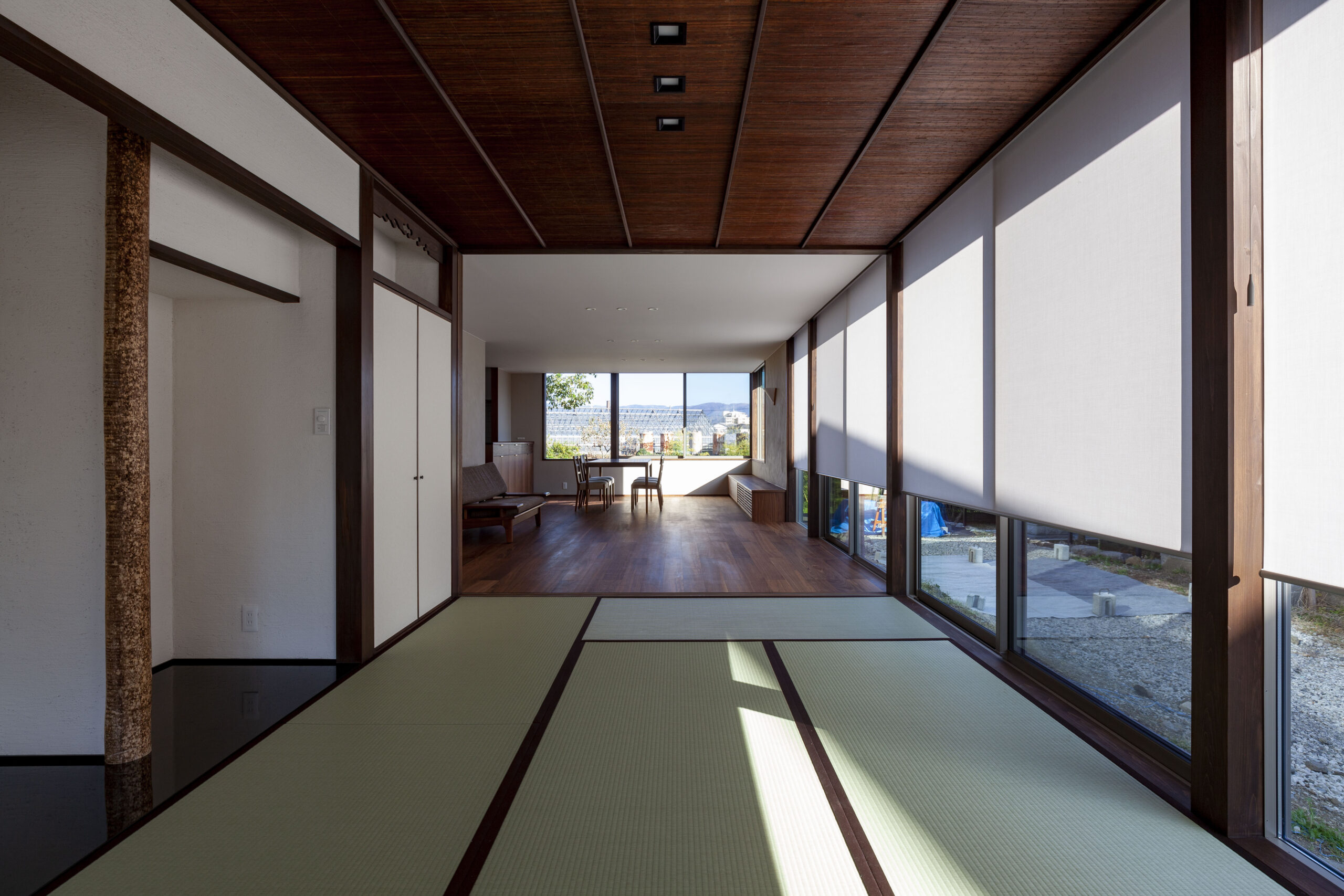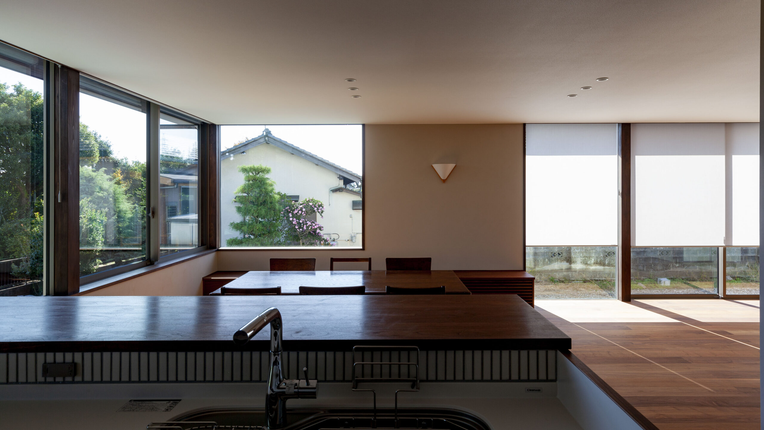 隣地建物の影や視線を考慮しつつ、広い敷地を活かし、外部環境を積極的に取り込んだ計画。開口部は、採光のための南側の掃出しだけでなく、東側の開けた景色や、玄関ポーチ前の庭を望むものなど、東西にも各所大胆に設けている。和室は普段は客間として利用できるよう、玄関から単独の動線で入ることもできるが、LDKと一体で使うことも想定しており、天井いっぱいの建具を開ければシームレスに繋がる。玄関は先述の大きな開口のほか、従前の家屋の大黒柱や一枚板の式台などが出迎え、客間へといざなう、来客を意識した設えとなっている。軒の深い大屋根や庇により、夏の日差しを遮る日本家屋的な趣をもつ外観となった。