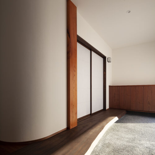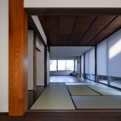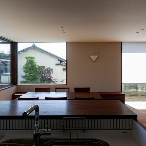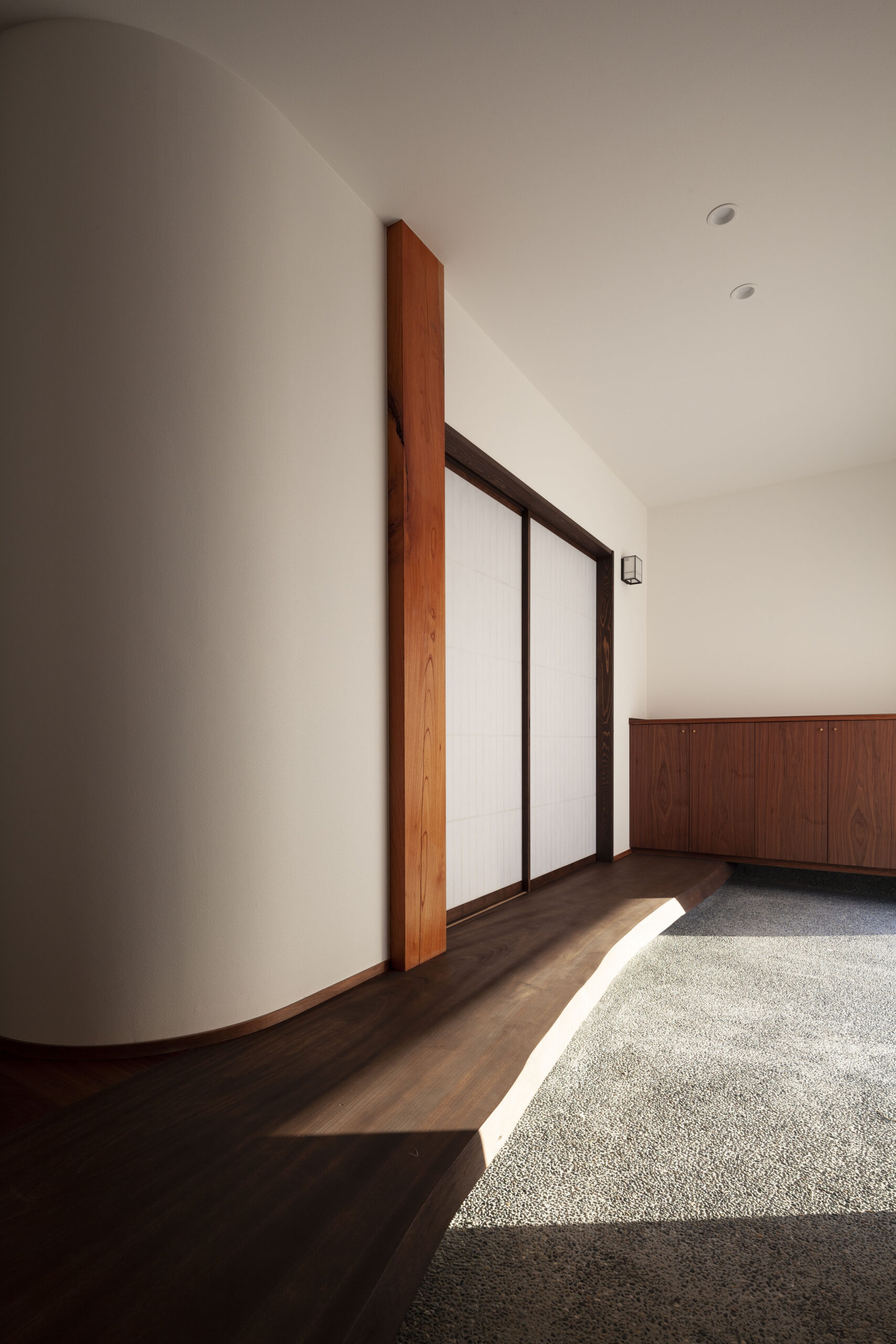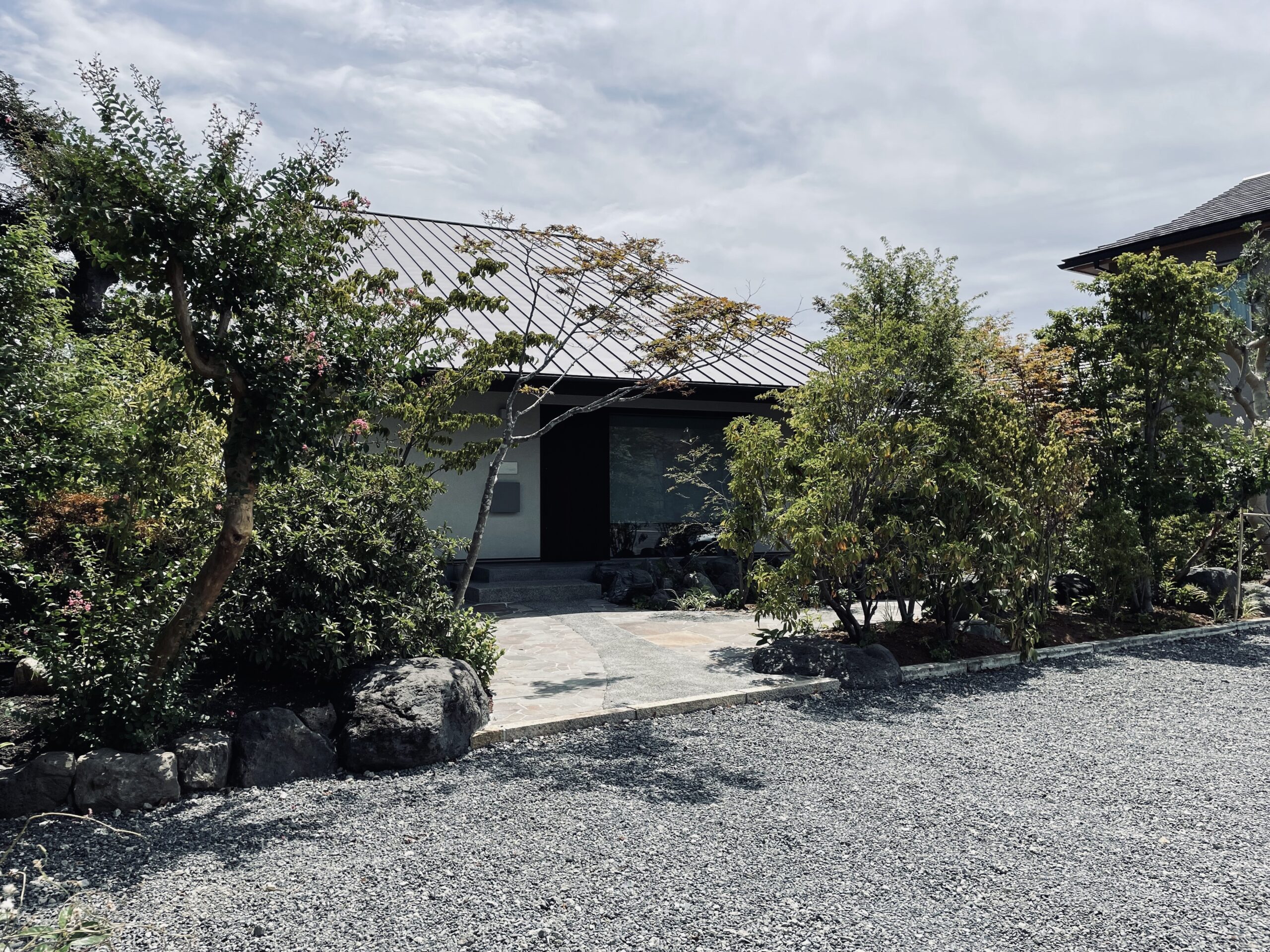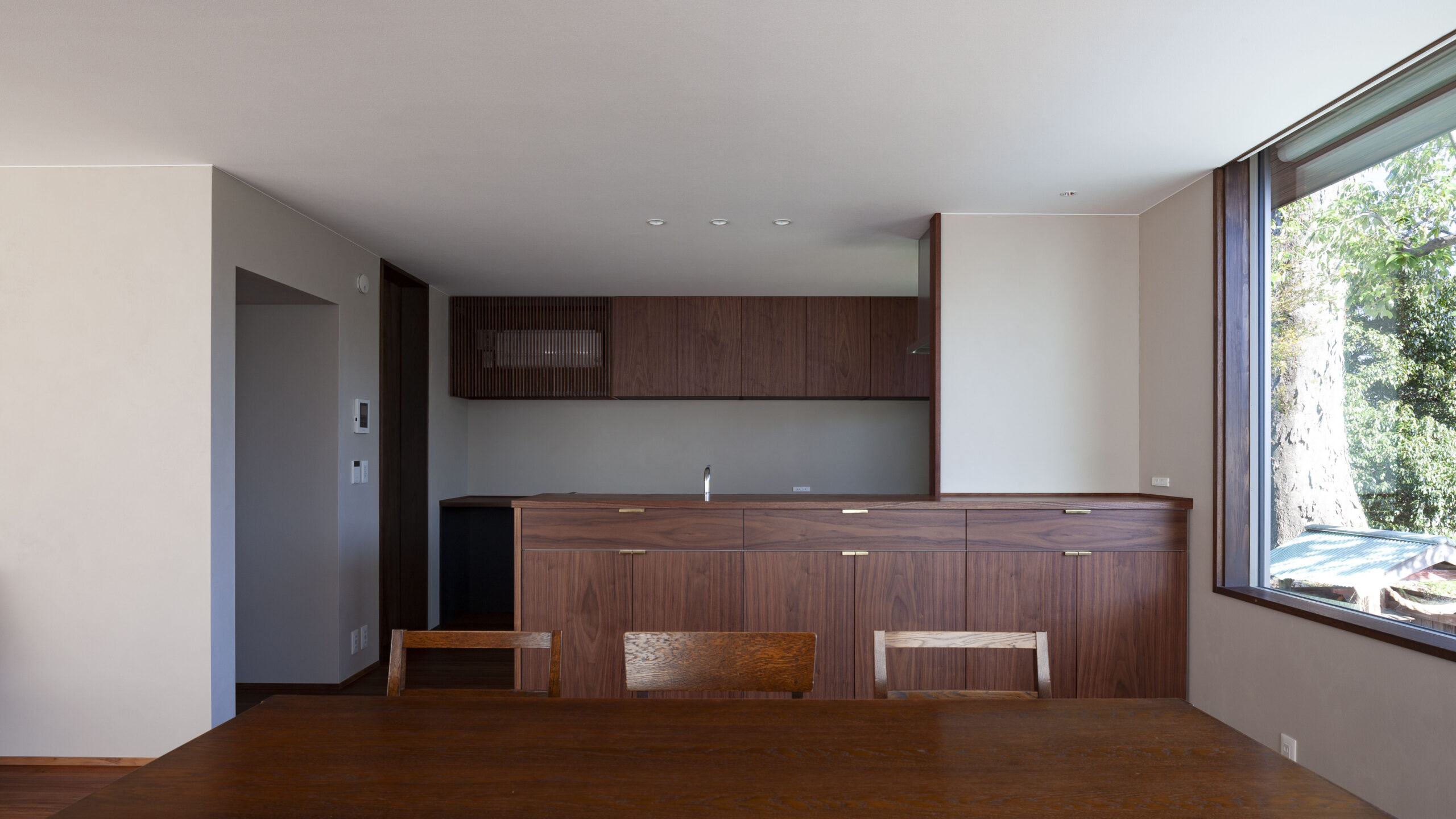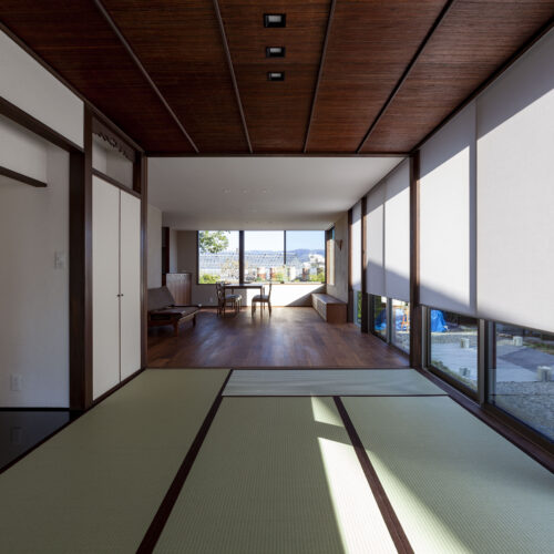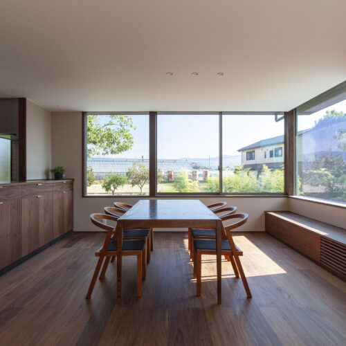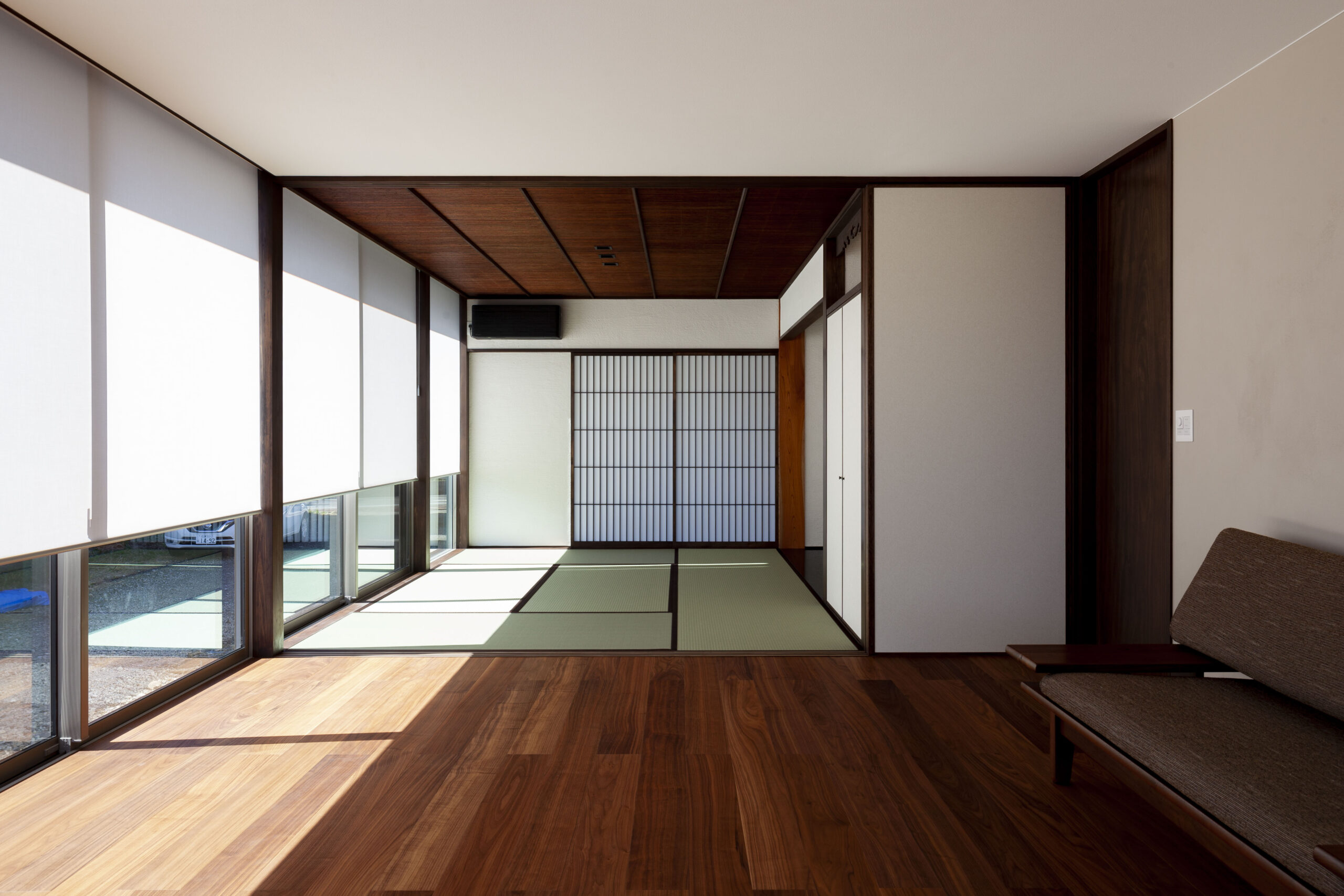 隣地建物の影や視線を考慮しつつ、広い敷地を活かし、外部環境を積極的に取り込んだ計画。開口部は、採光のための南側の掃出しだけでなく、東側の開けた景色や、玄関ポーチ前の庭を望むものなど、東西にも各所大胆に設けている。和室は普段は客間として利用できるよう、玄関から単独の動線で入ることもできるが、LDKと一体で使うことも想定しており、天井いっぱいの建具を開ければシームレスに繋がる。玄関は先述の大きな開口のほか、従前の家屋の大黒柱や一枚板の式台などが出迎え、客間へといざなう、来客を意識した設えとなっている。軒の深い大屋根や庇により、夏の日差しを遮る日本家屋的な趣をもつ外観となった。