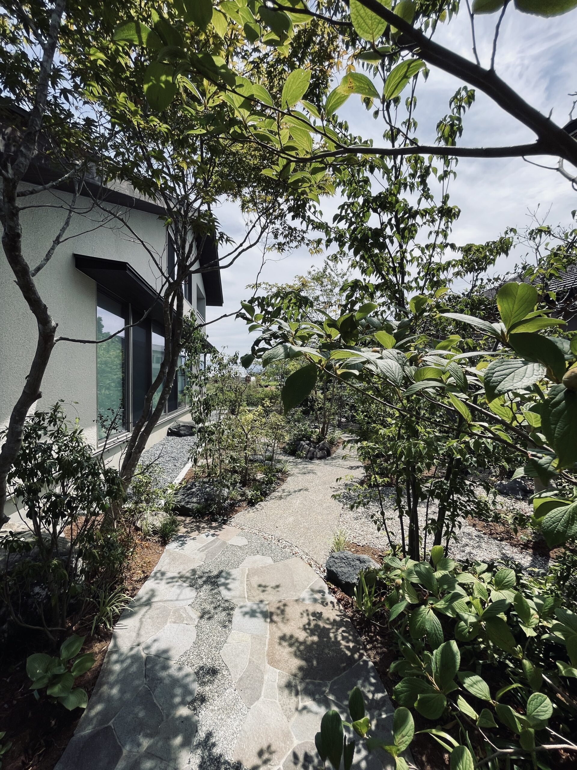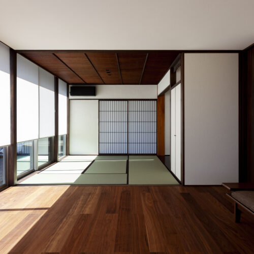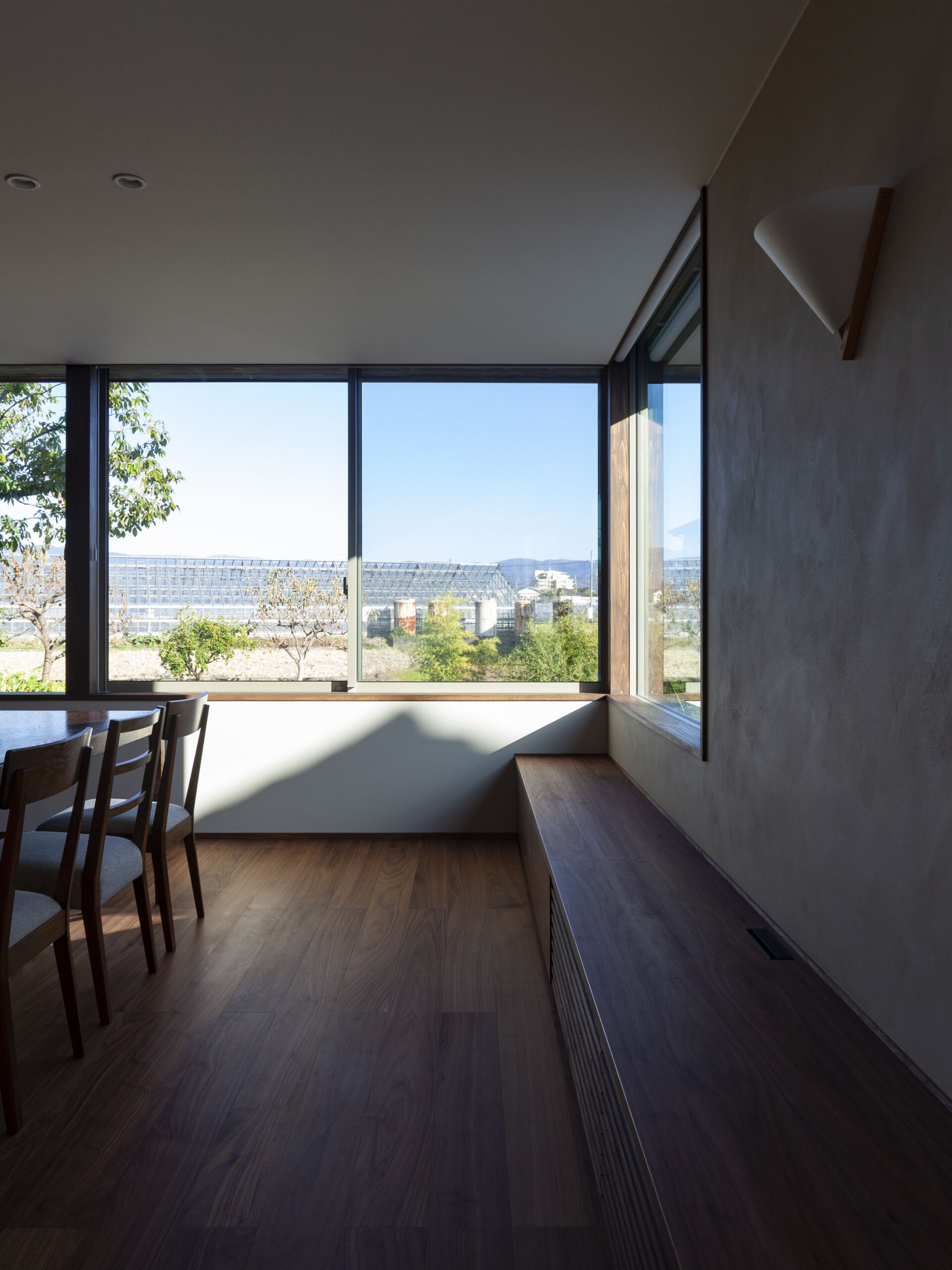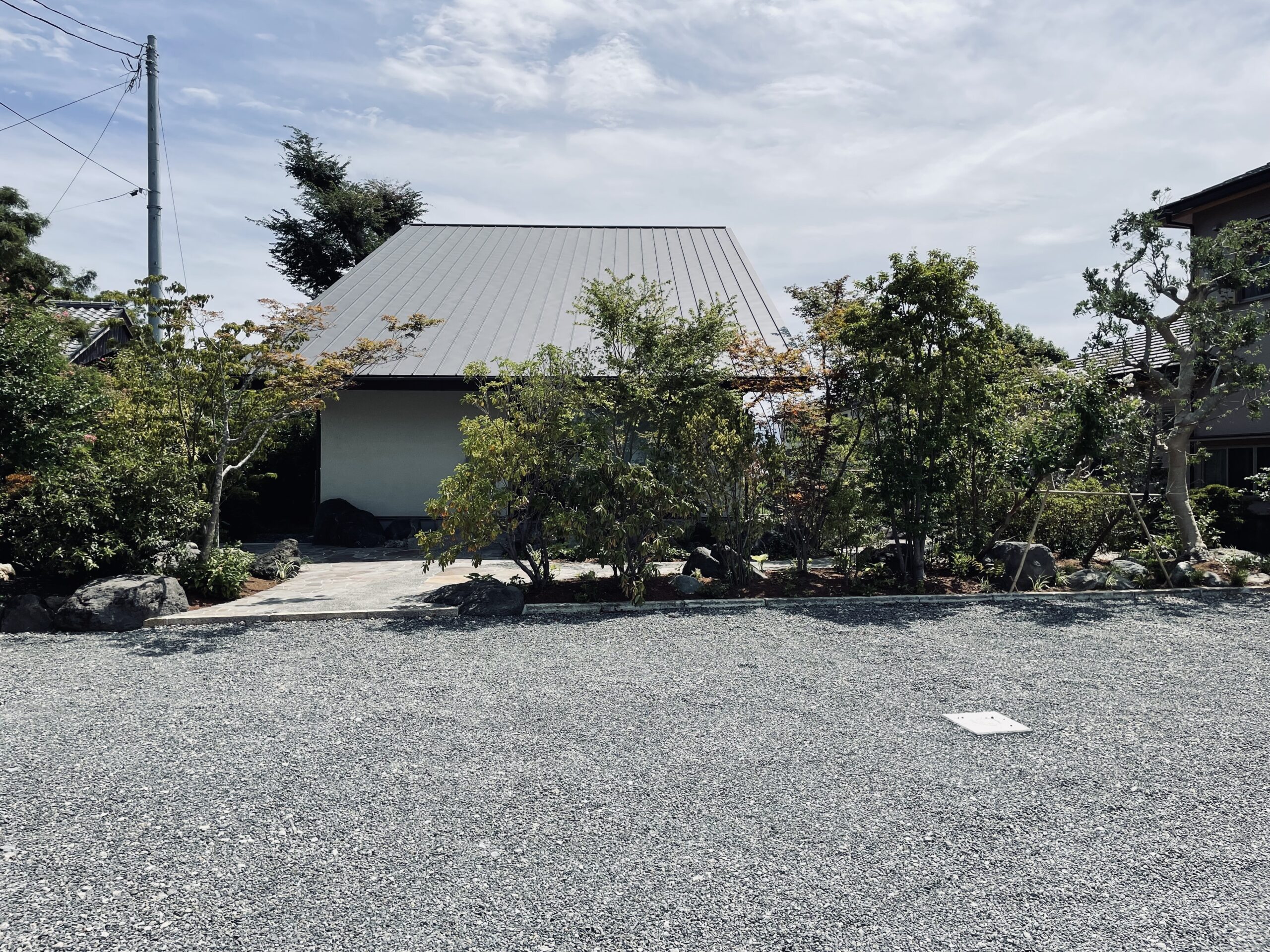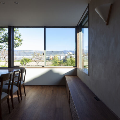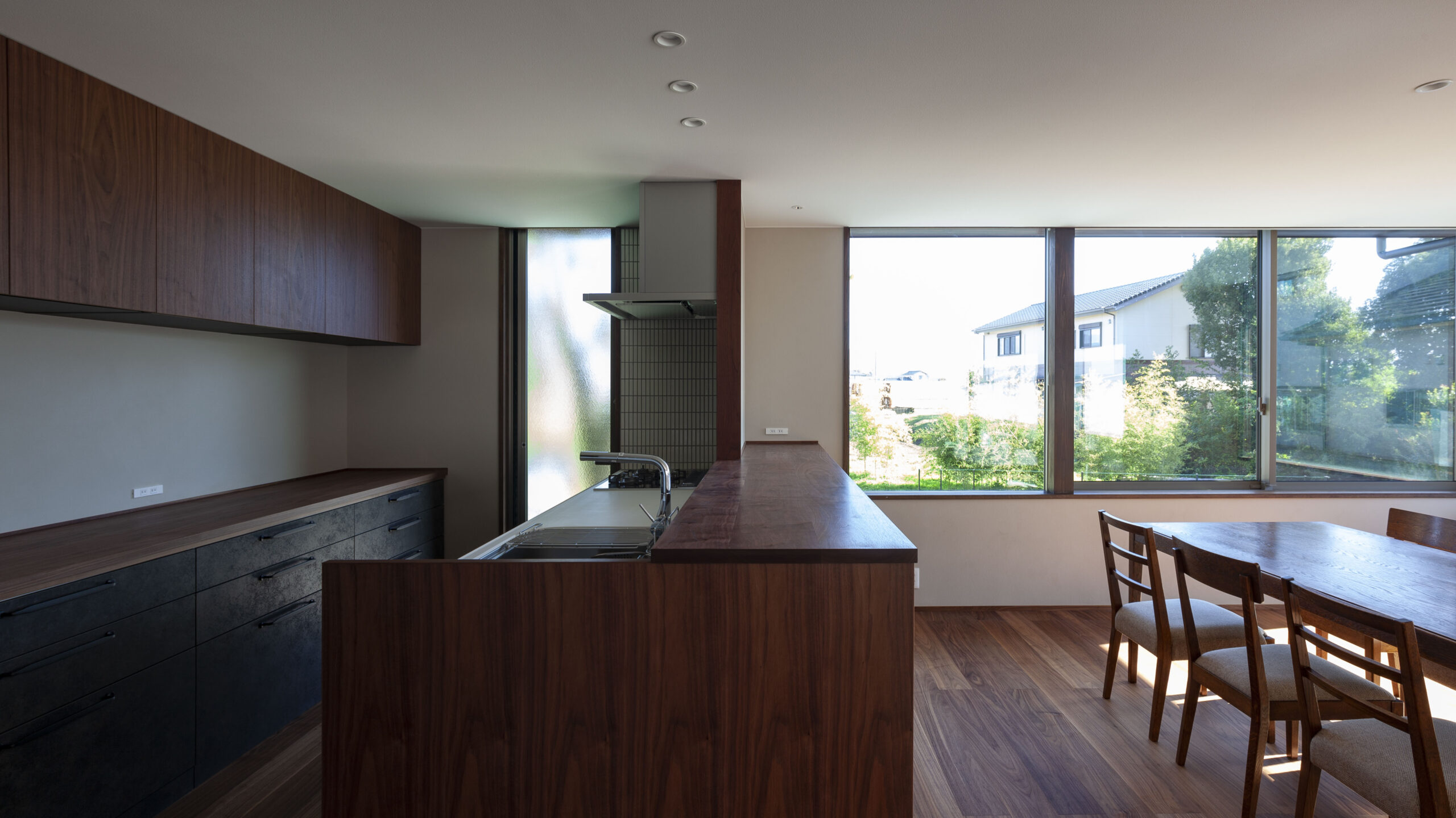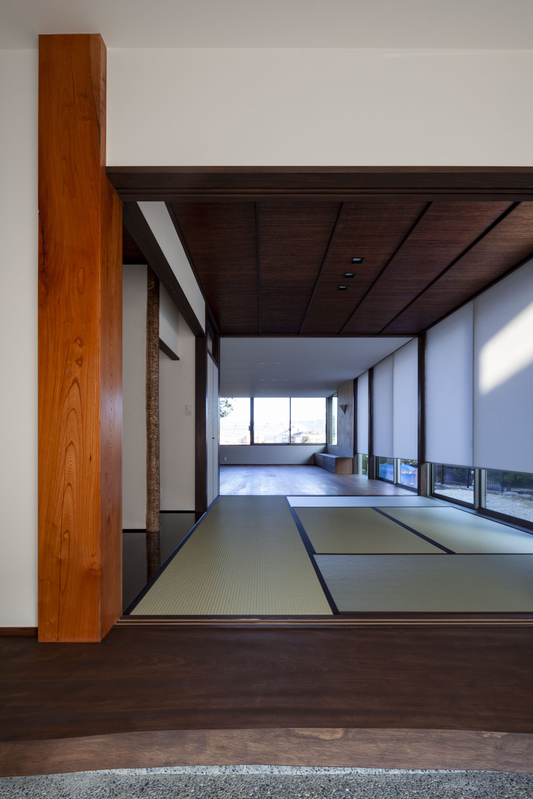 隣地建物の影や視線を考慮しつつ、広い敷地を活かし、外部環境を積極的に取り込んだ計画。開口部は、採光のための南側の掃出しだけでなく、東側の開けた景色や、玄関ポーチ前の庭を望むものなど、東西にも各所大胆に設けている。和室は普段は客間として利用できるよう、玄関から単独の動線で入ることもできるが、LDKと一体で使うことも想定しており、天井いっぱいの建具を開ければシームレスに繋がる。玄関は先述の大きな開口のほか、従前の家屋の大黒柱や一枚板の式台などが出迎え、客間へといざなう、来客を意識した設えとなっている。軒の深い大屋根や庇により、夏の日差しを遮る日本家屋的な趣をもつ外観となった。