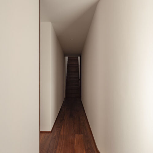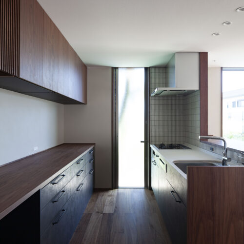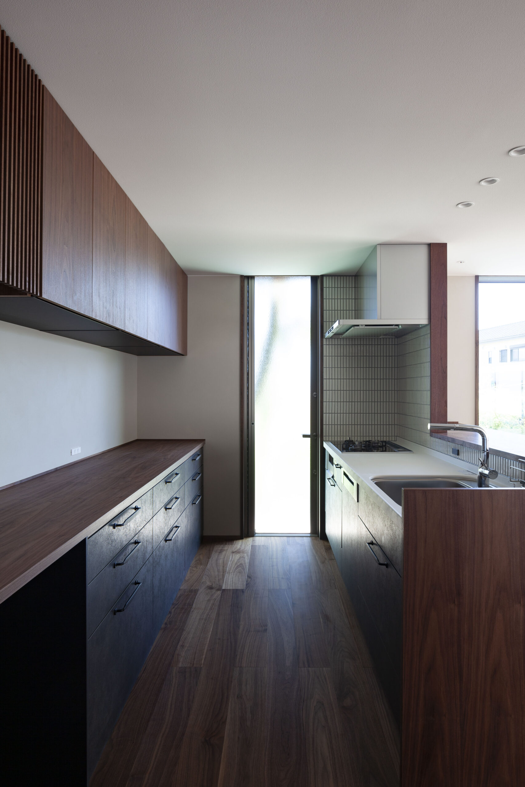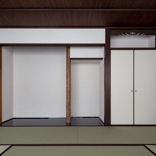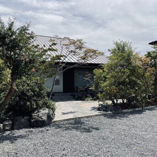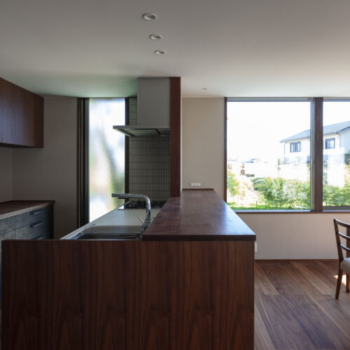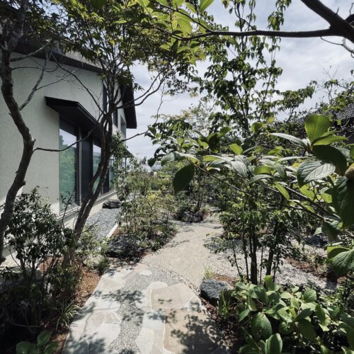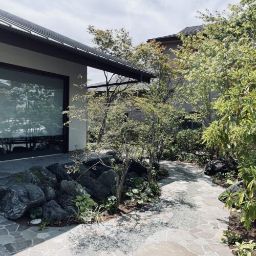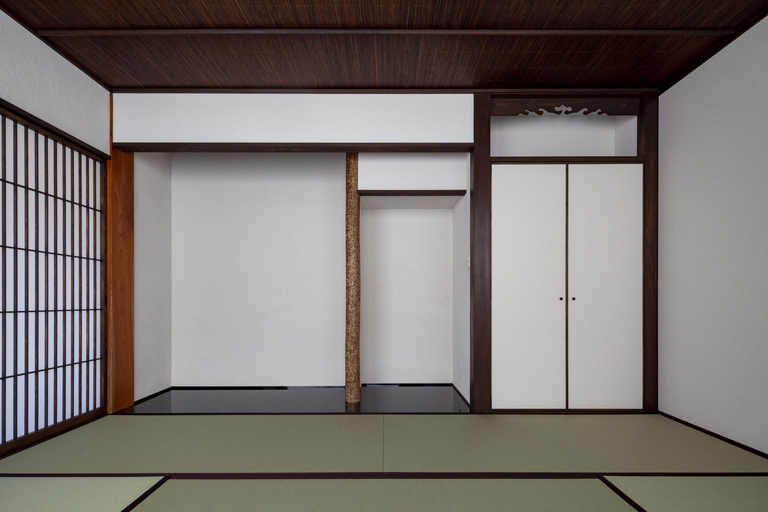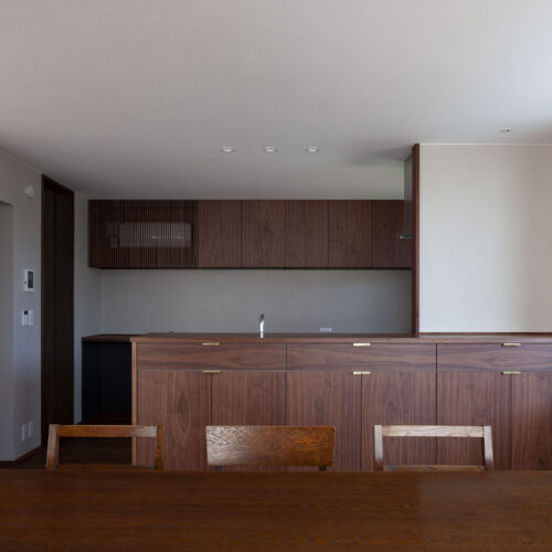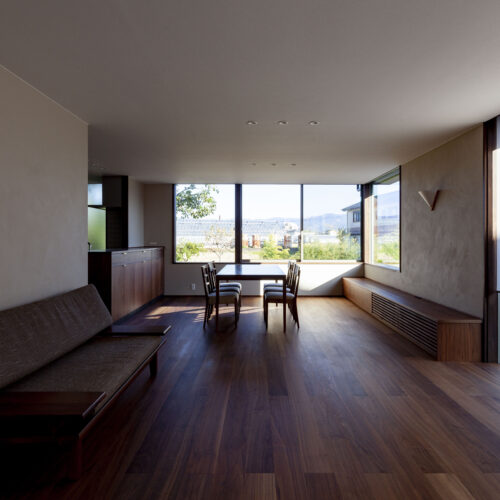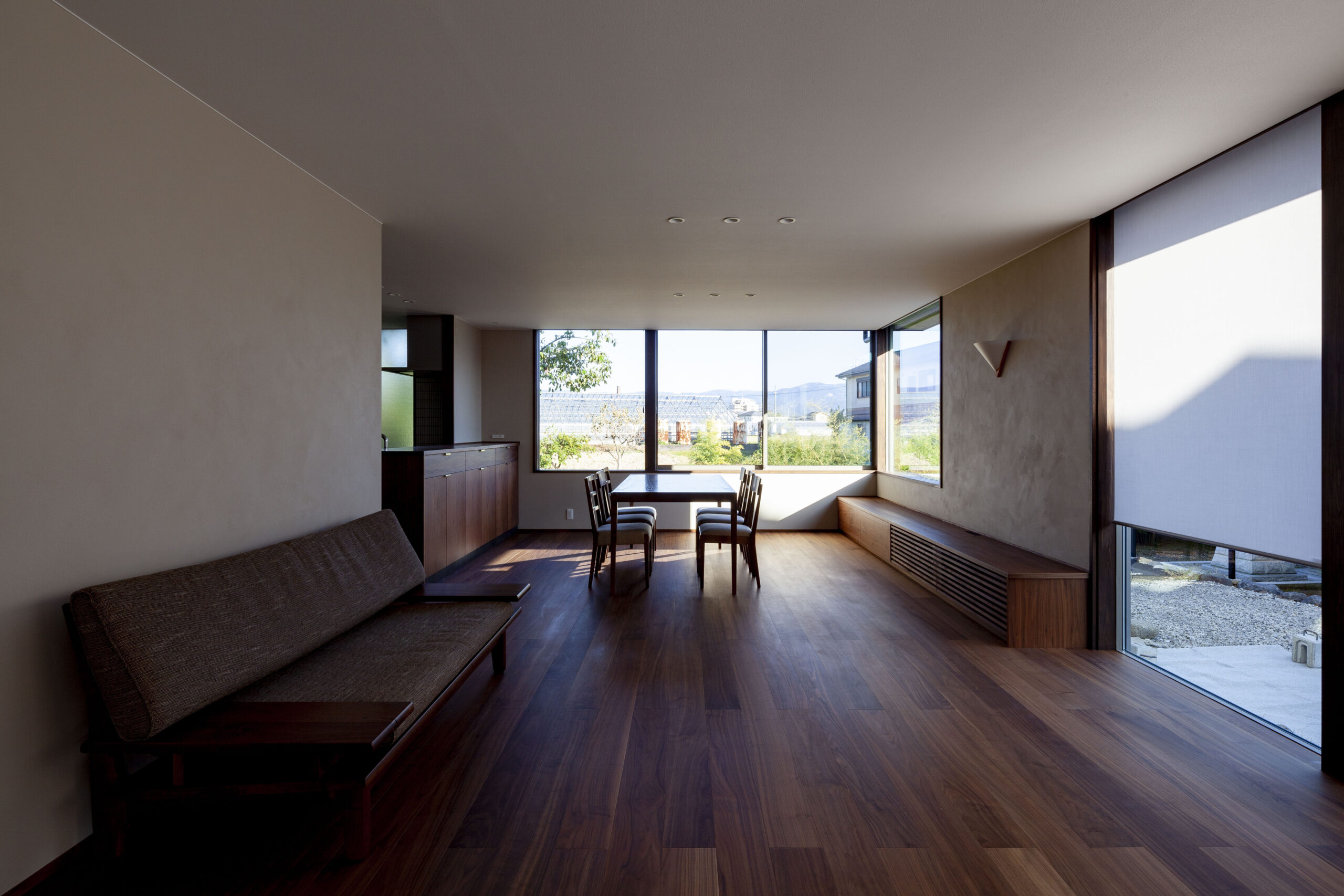 隣地建物の影や視線を考慮しつつ、広い敷地を活かし、外部環境を積極的に取り込んだ計画。開口部は、採光のための南側の掃出しだけでなく、東側の開けた景色や、玄関ポーチ前の庭を望むものなど、東西にも各所大胆に設けている。和室は普段は客間として利用できるよう、玄関から単独の動線で入ることもできるが、LDKと一体で使うことも想定しており、天井いっぱいの建具を開ければシームレスに繋がる。玄関は先述の大きな開口のほか、従前の家屋の大黒柱や一枚板の式台などが出迎え、客間へといざなう、来客を意識した設えとなっている。軒の深い大屋根や庇により、夏の日差しを遮る日本家屋的な趣をもつ外観となった。