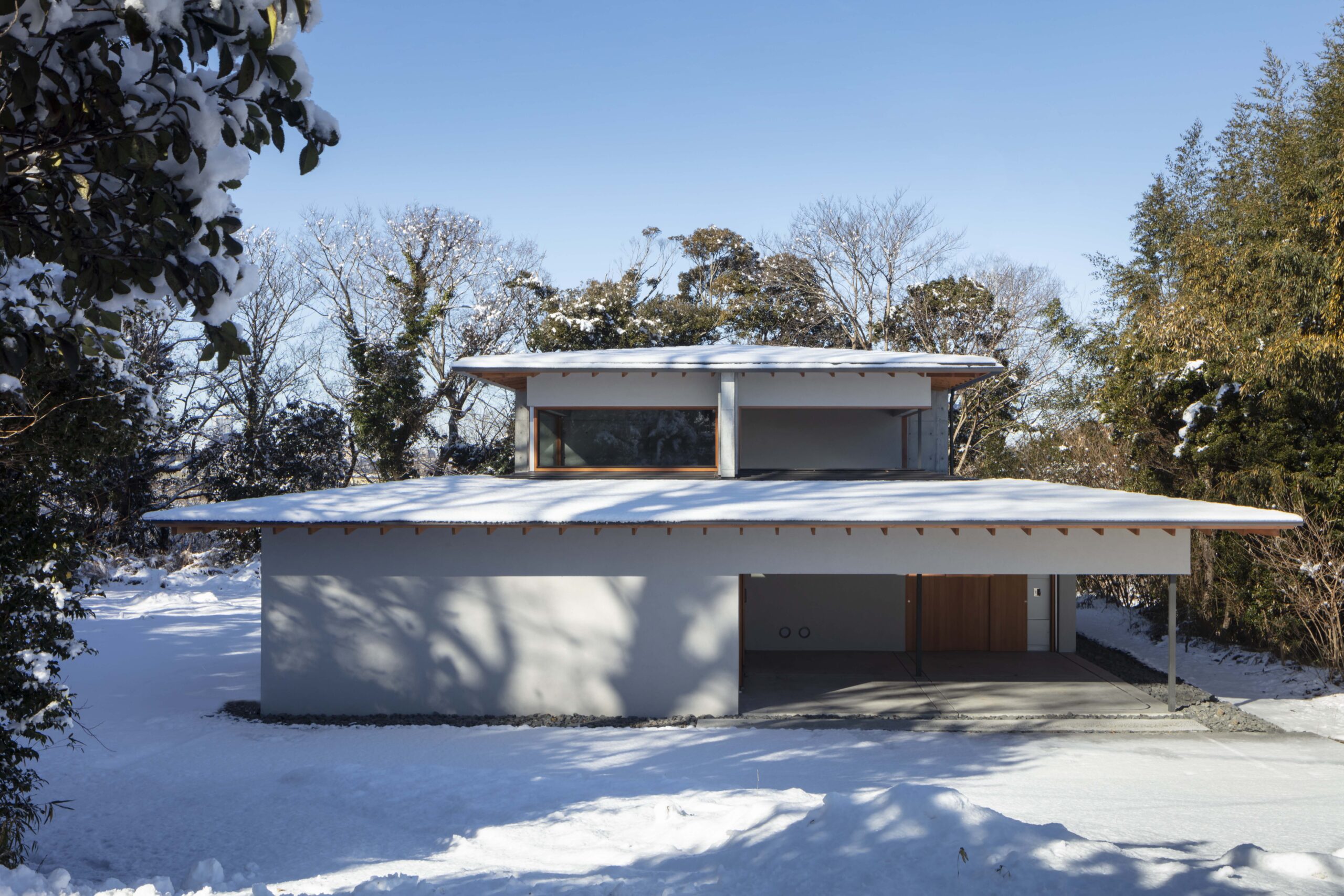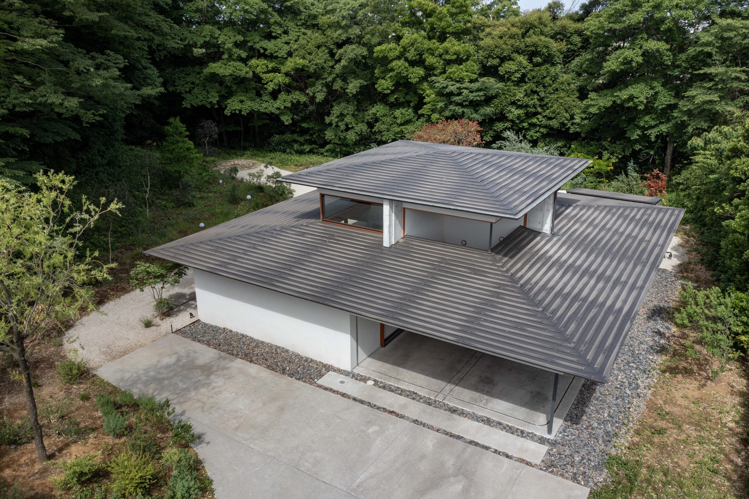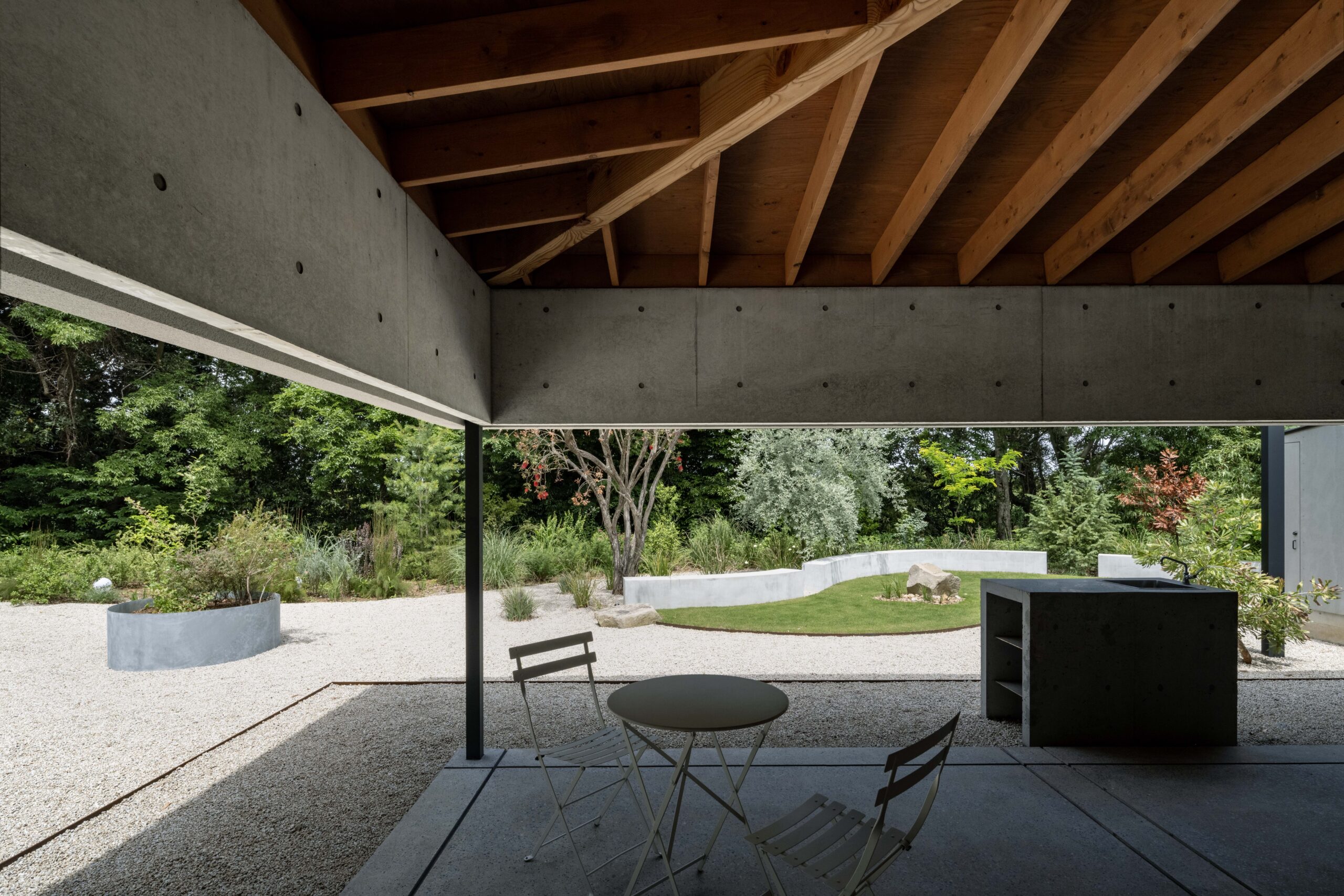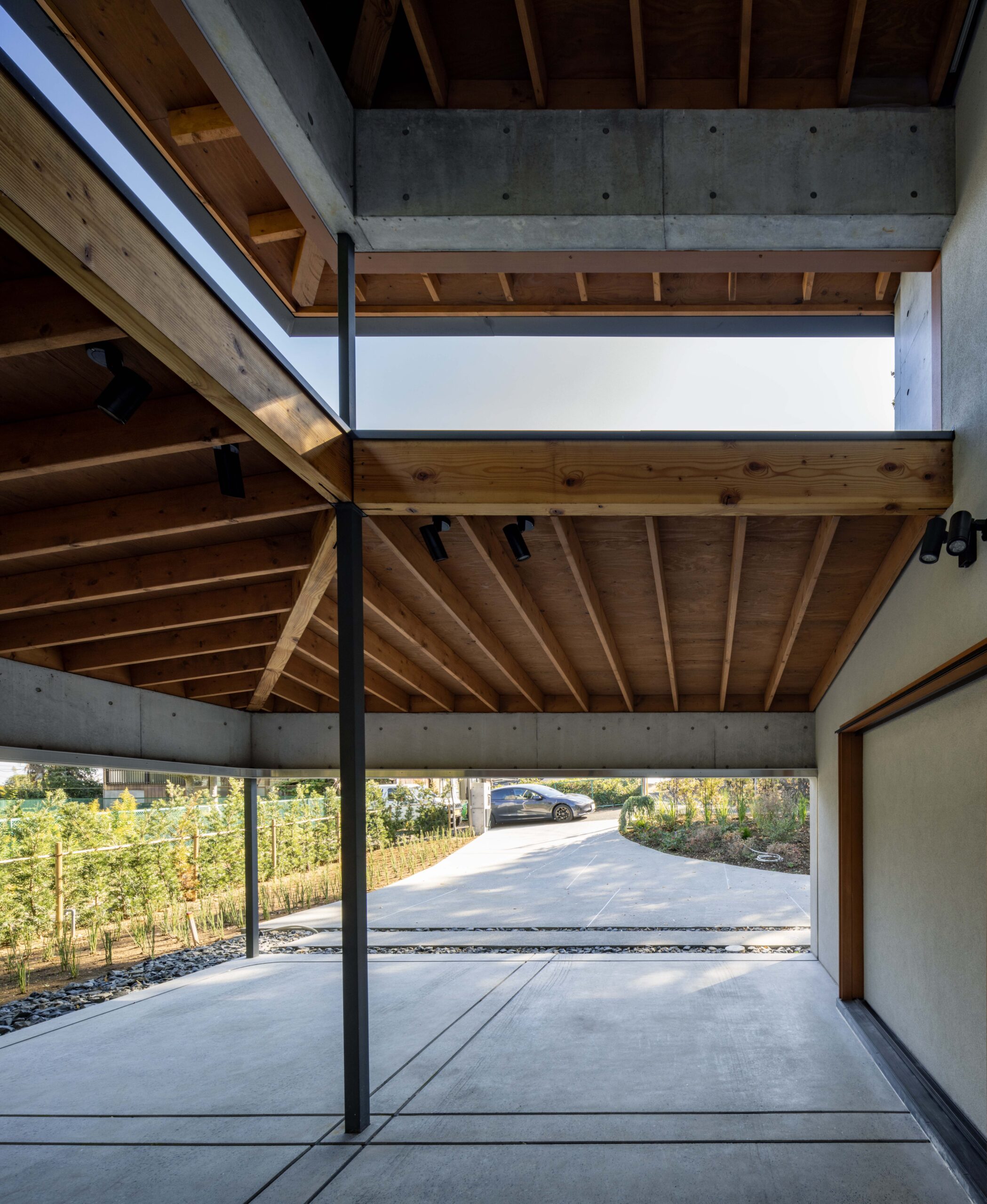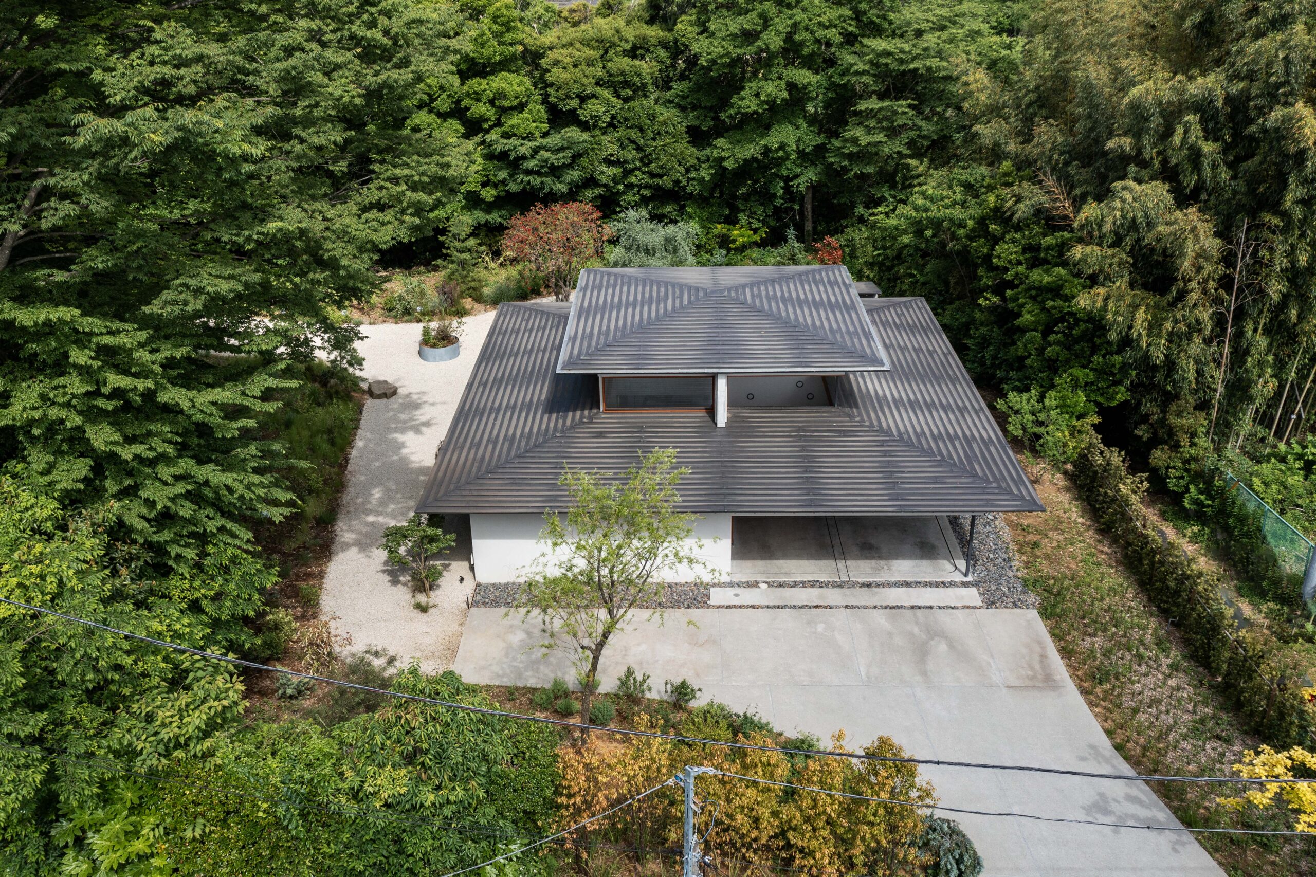 緑に囲まれた環境で、日常生活でもアウトドアを楽しみたいという建て主の希望をかたちにした住宅です。低い軒と緩やかな屋根が、外部からの視線は遮りながらも室内と庭をつなげています。また、テラスとアトリエという半外部空間が仲介することで、住まいと豊かな自然が一体化することに一役買っています。周辺の高木が日光を遮ってしまうのですが、上階のハイサイドライトや吹き抜けを設けることで光を室内に取り込むと同時に、そこからも木々や青空が眺められ、どこにいても自然を感じられる空間になっています。