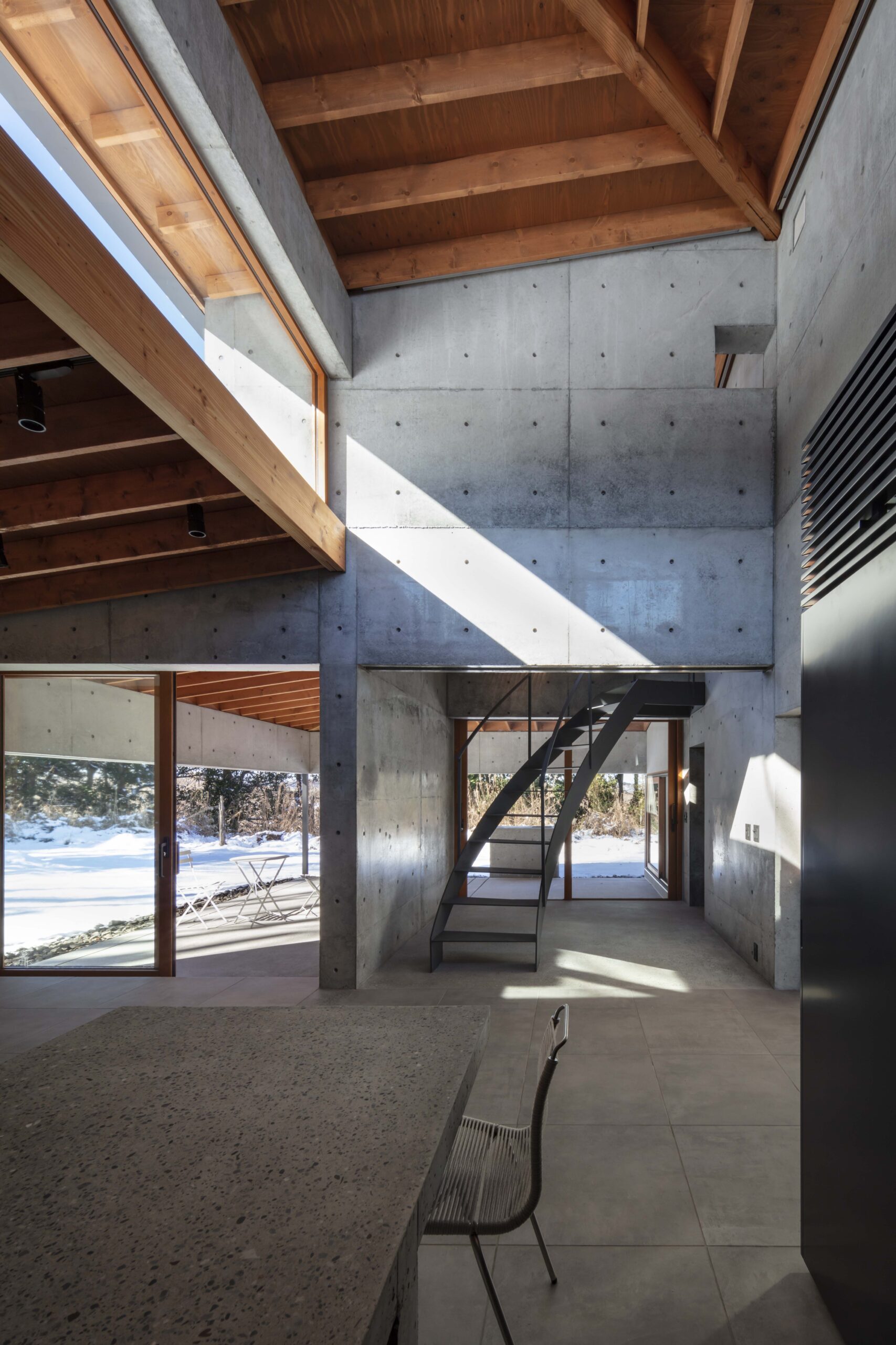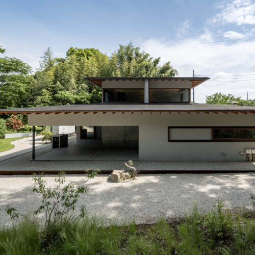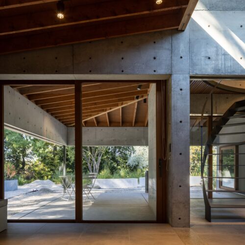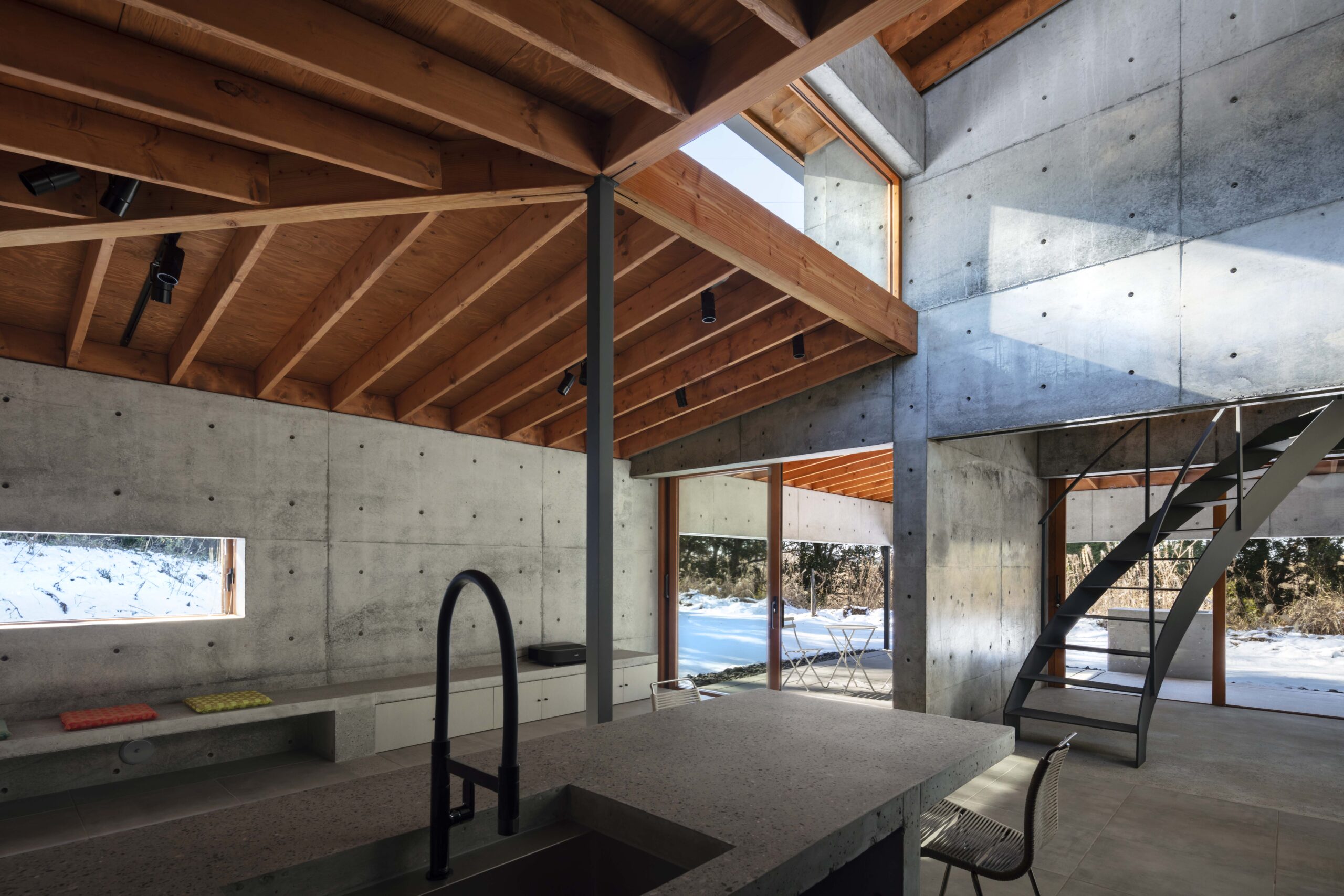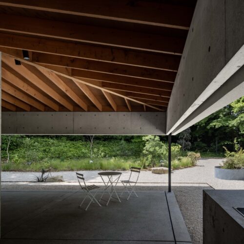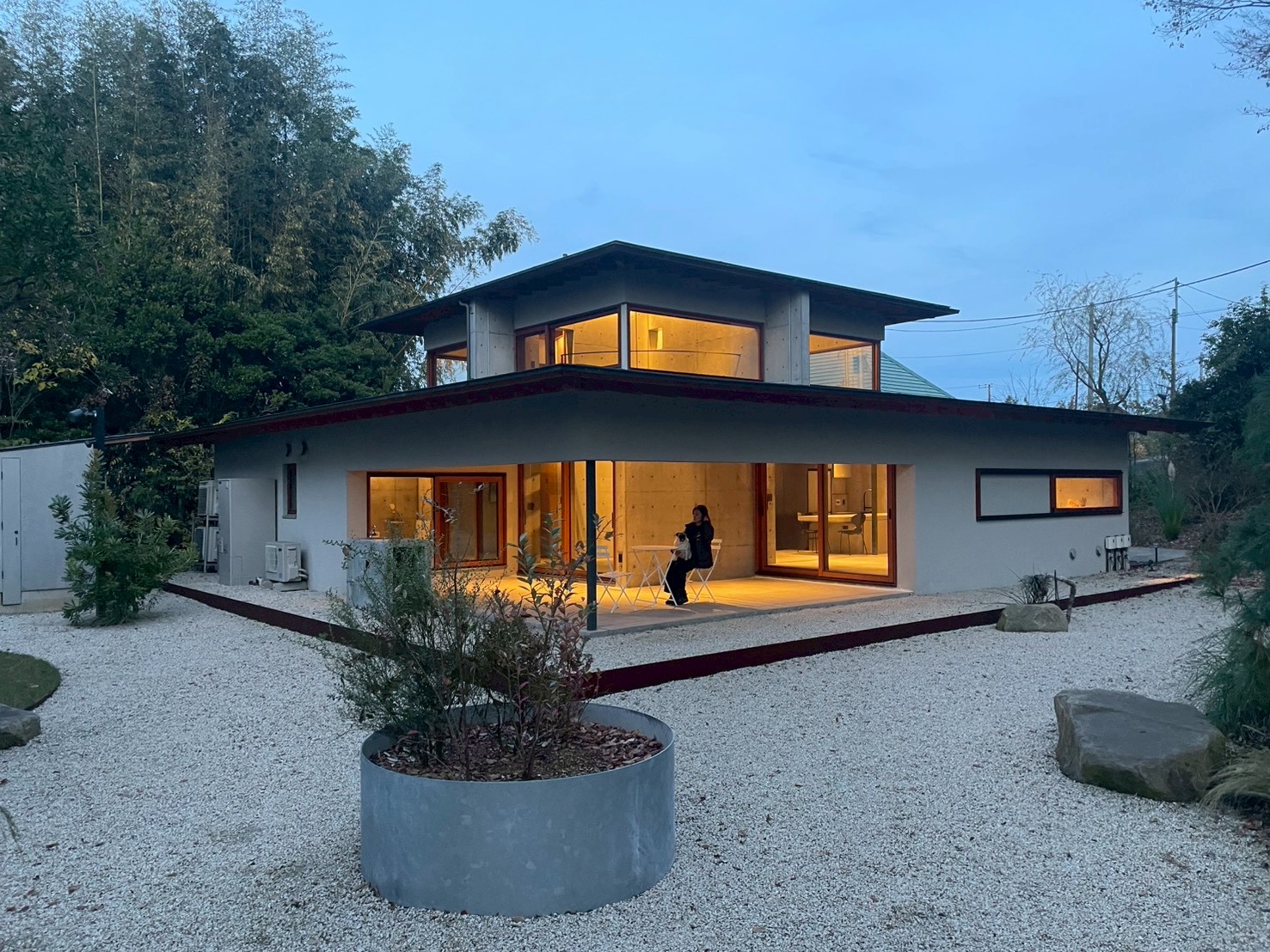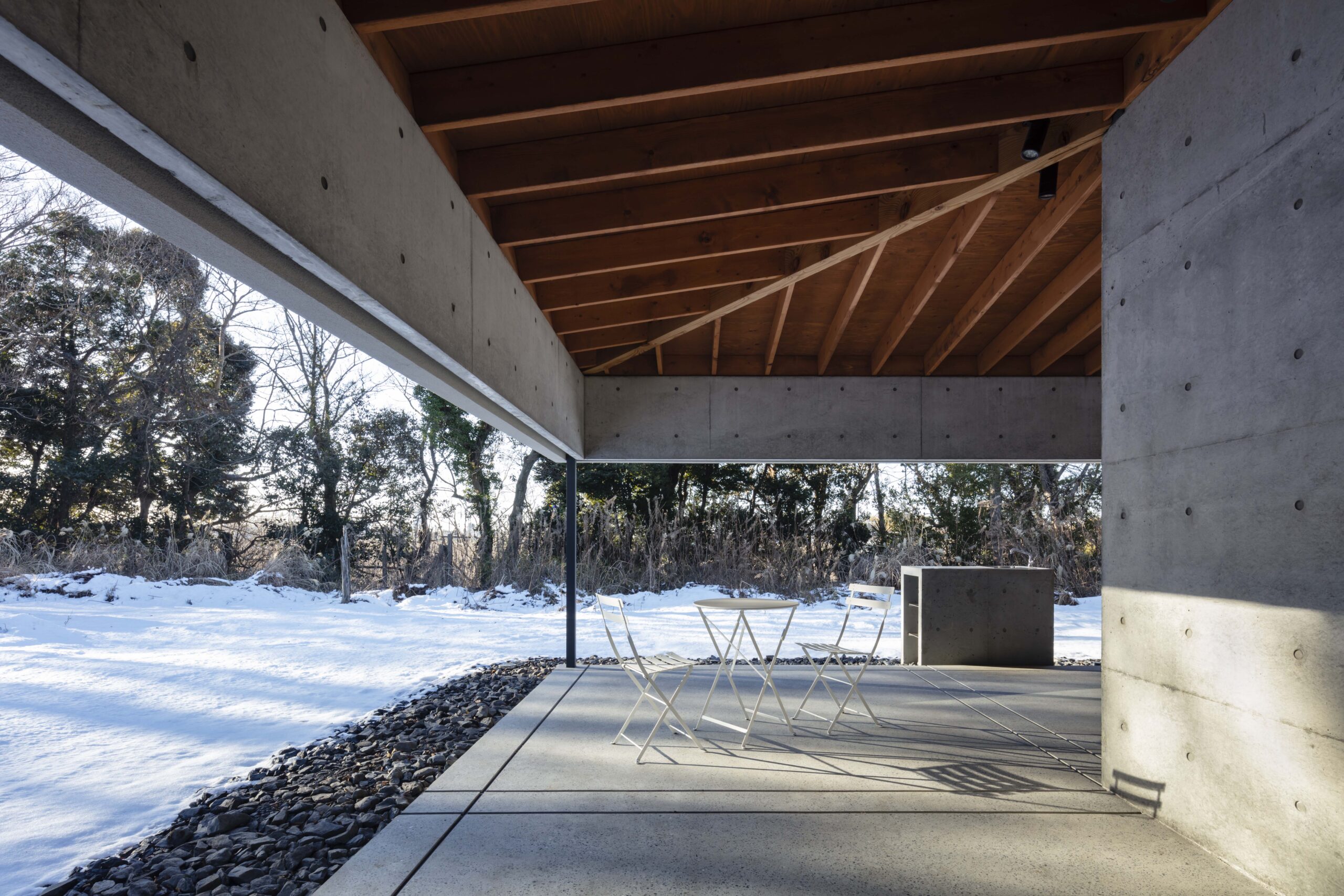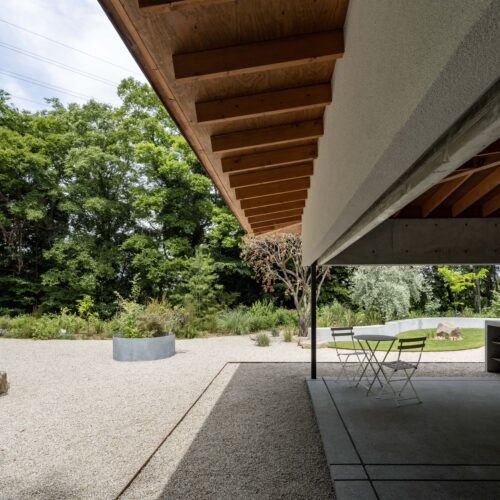 緑に囲まれた環境で、日常生活でもアウトドアを楽しみたいという建て主の希望をかたちにした住宅です。低い軒と緩やかな屋根が、外部からの視線は遮りながらも室内と庭をつなげています。また、テラスとアトリエという半外部空間が仲介することで、住まいと豊かな自然が一体化することに一役買っています。周辺の高木が日光を遮ってしまうのですが、上階のハイサイドライトや吹き抜けを設けることで光を室内に取り込むと同時に、そこからも木々や青空が眺められ、どこにいても自然を感じられる空間になっています。
