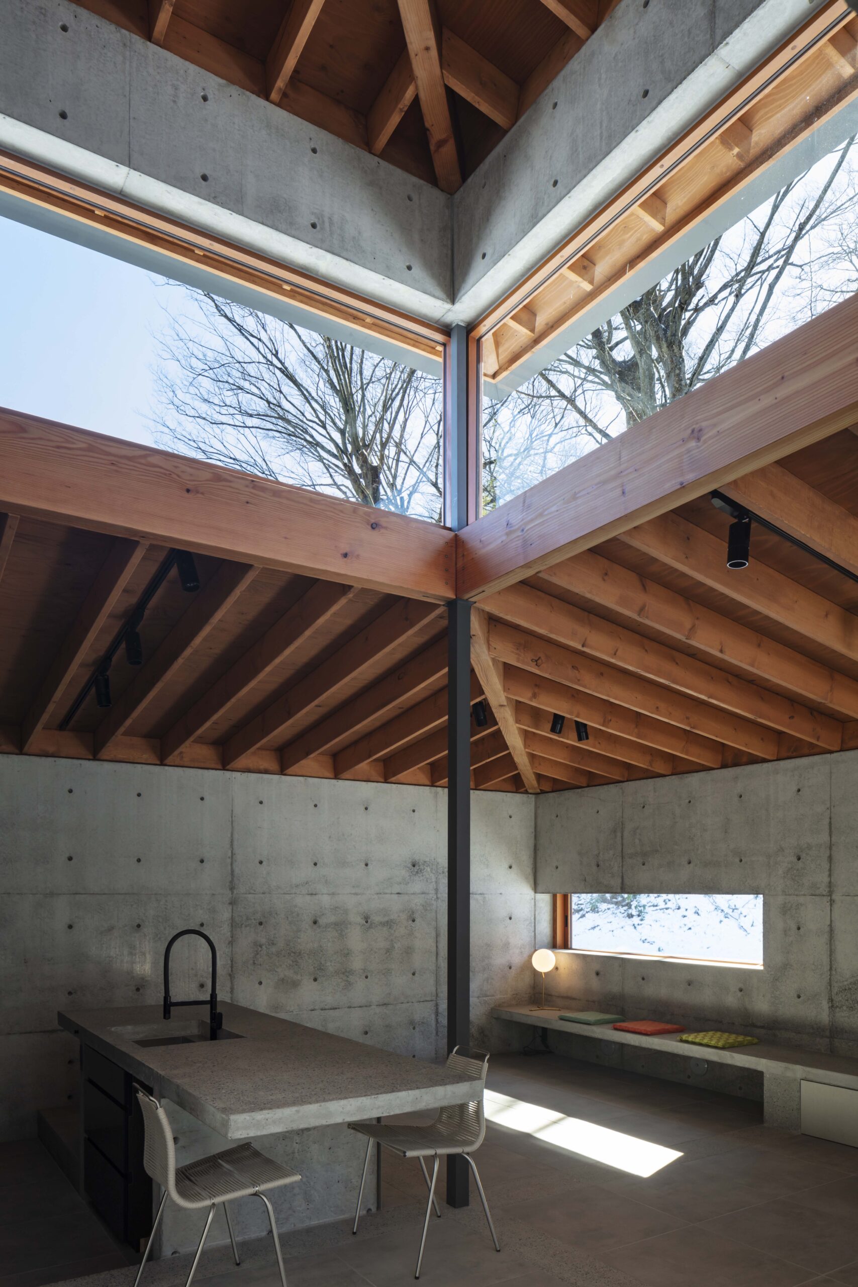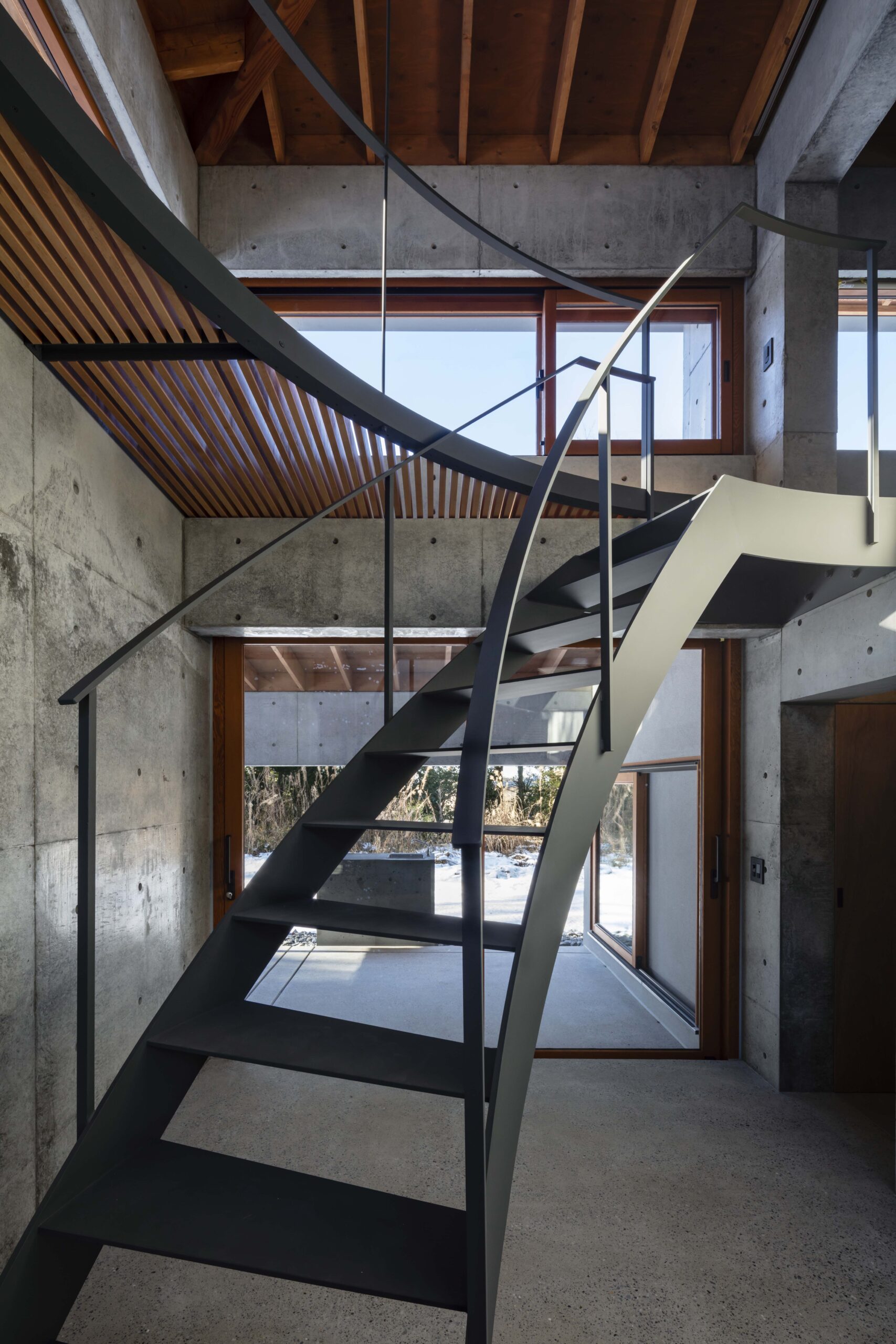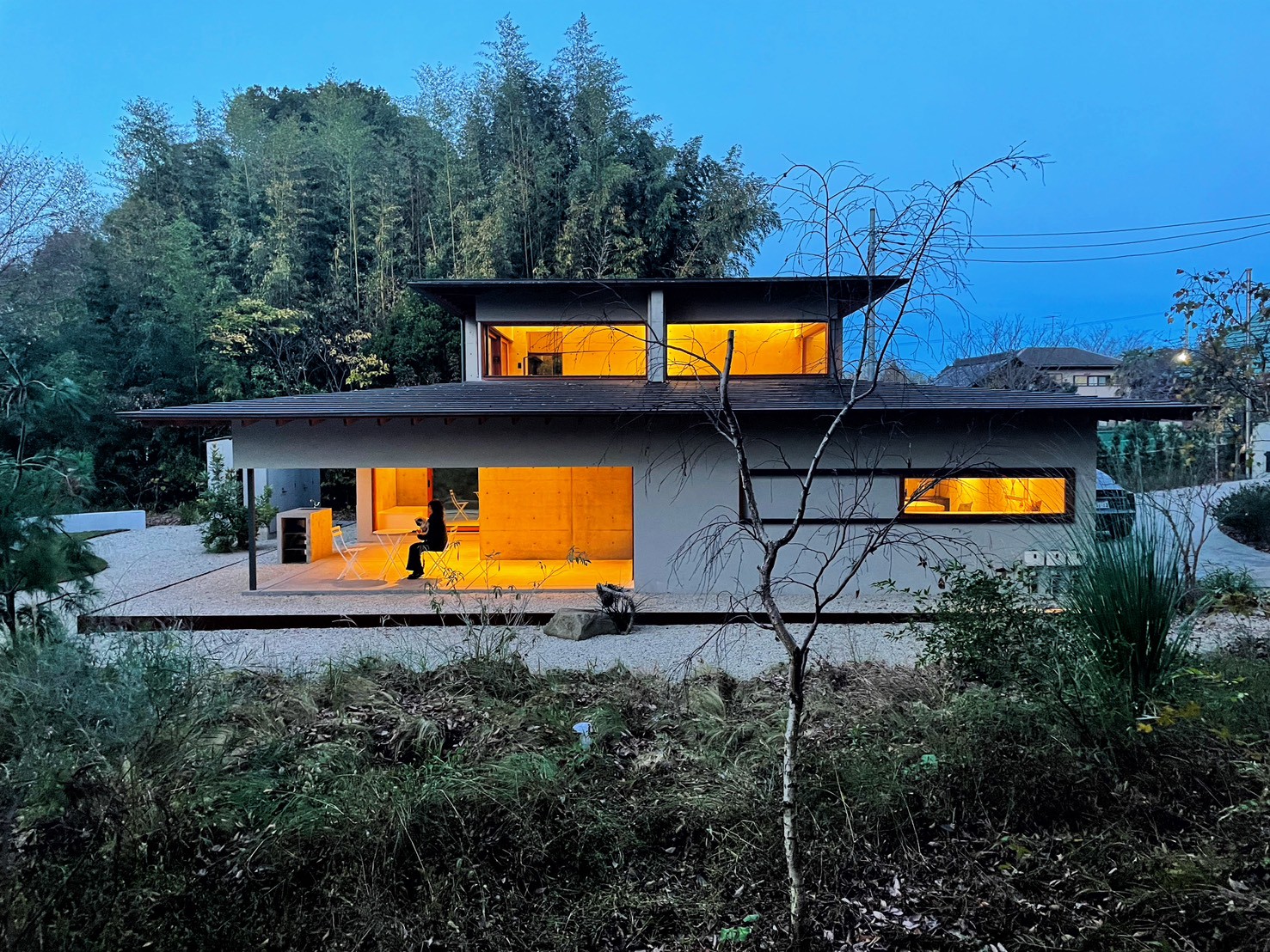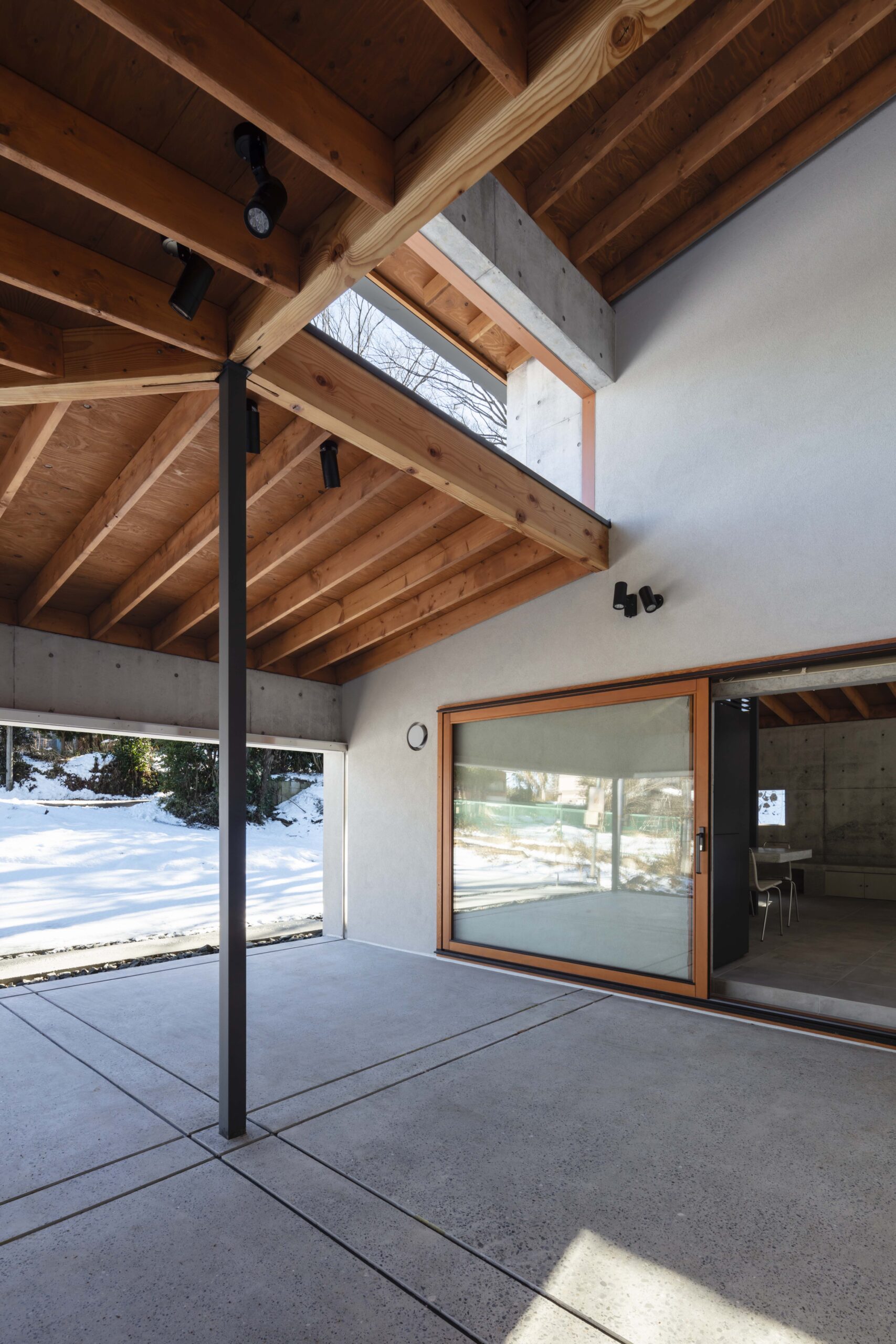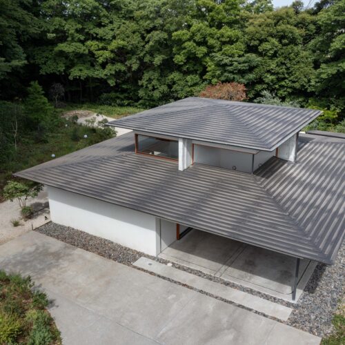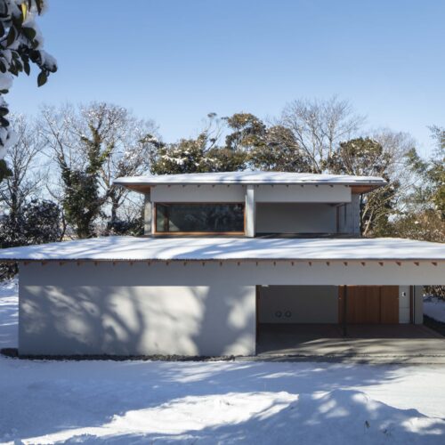 緑に囲まれた環境で、日常生活でもアウトドアを楽しみたいという建て主の希望をかたちにした住宅です。低い軒と緩やかな屋根が、外部からの視線は遮りながらも室内と庭をつなげています。また、テラスとアトリエという半外部空間が仲介することで、住まいと豊かな自然が一体化することに一役買っています。周辺の高木が日光を遮ってしまうのですが、上階のハイサイドライトや吹き抜けを設けることで光を室内に取り込むと同時に、そこからも木々や青空が眺められ、どこにいても自然を感じられる空間になっています。