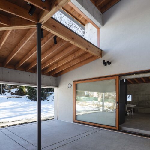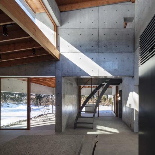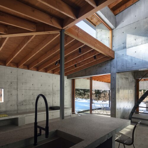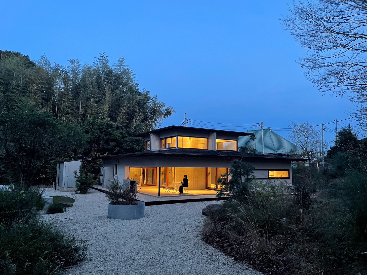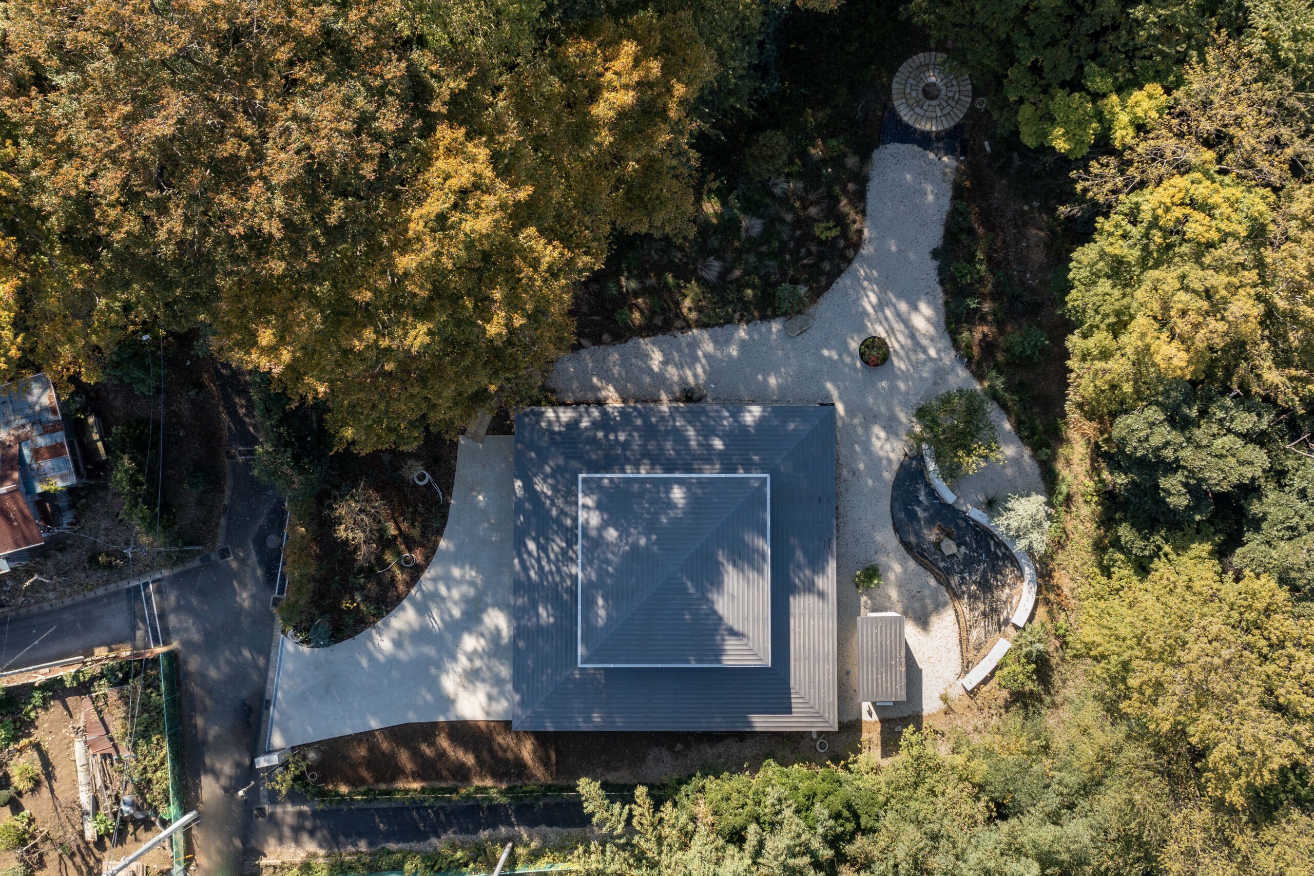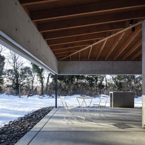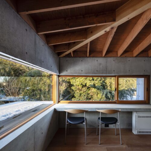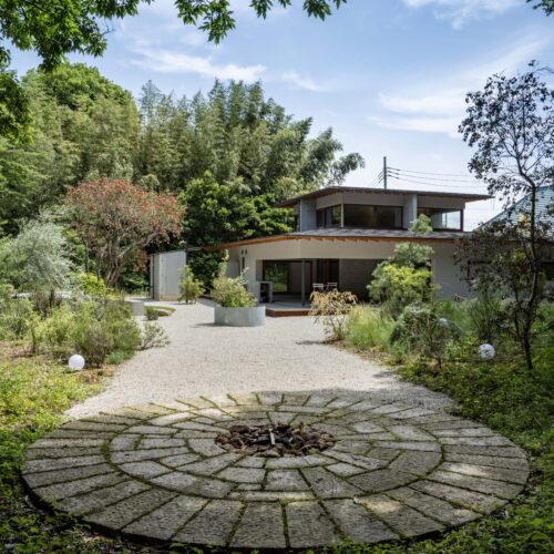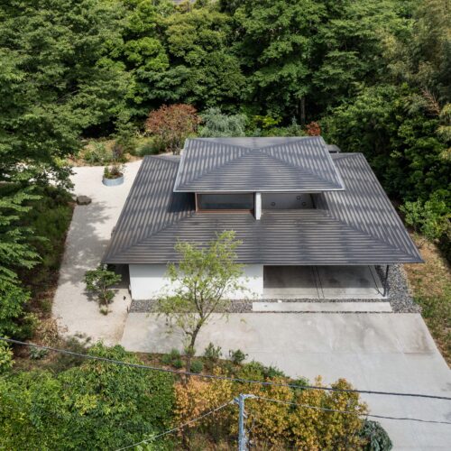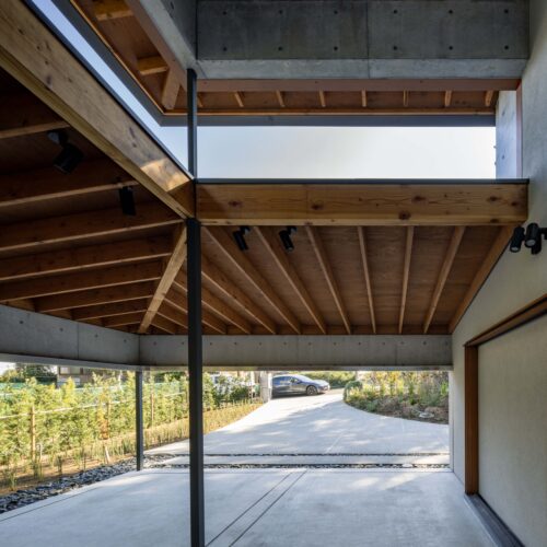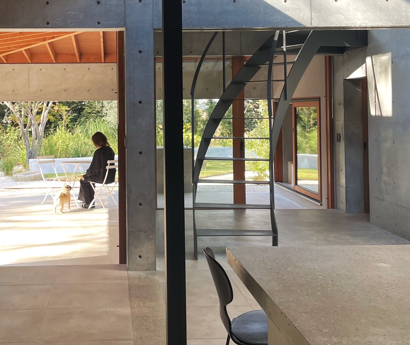 緑に囲まれた環境で、日常生活でもアウトドアを楽しみたいという建て主の希望をかたちにした住宅です。低い軒と緩やかな屋根が、外部からの視線は遮りながらも室内と庭をつなげています。また、テラスとアトリエという半外部空間が仲介することで、住まいと豊かな自然が一体化することに一役買っています。周辺の高木が日光を遮ってしまうのですが、上階のハイサイドライトや吹き抜けを設けることで光を室内に取り込むと同時に、そこからも木々や青空が眺められ、どこにいても自然を感じられる空間になっています。