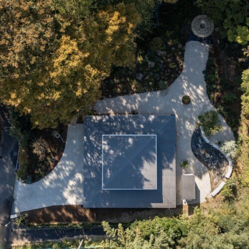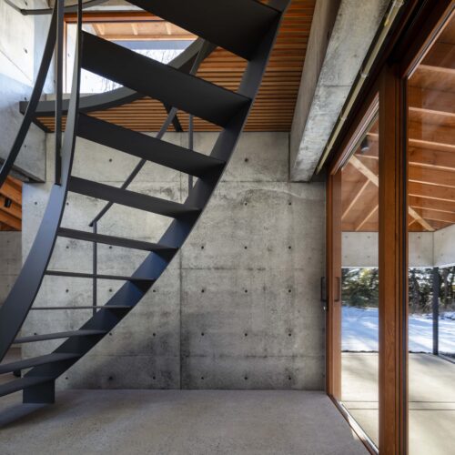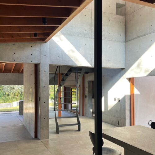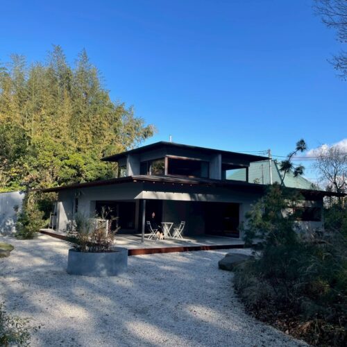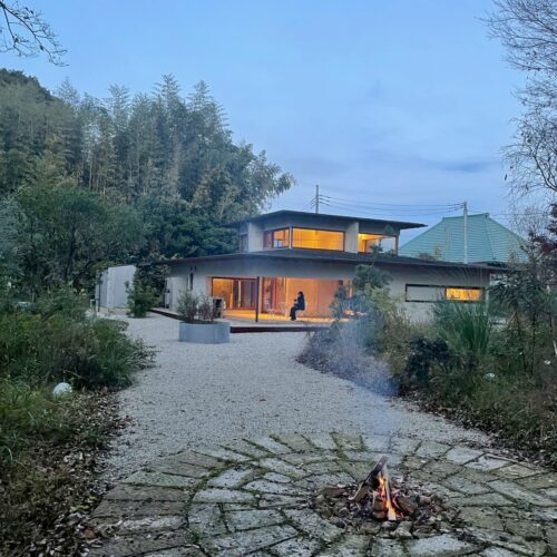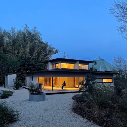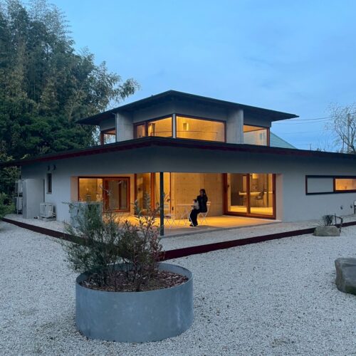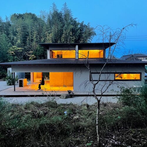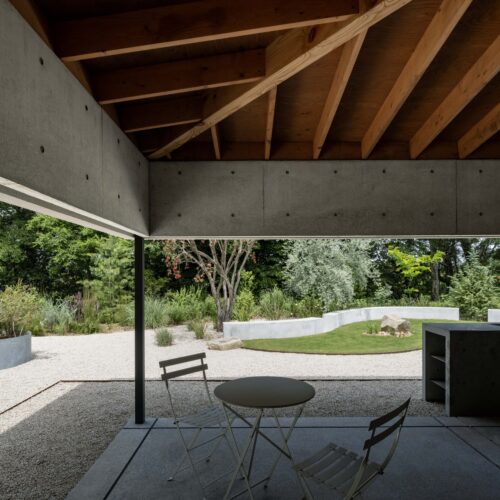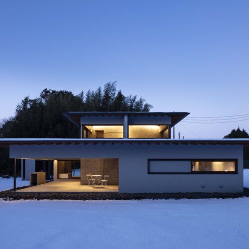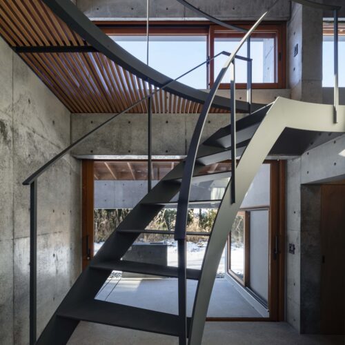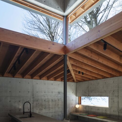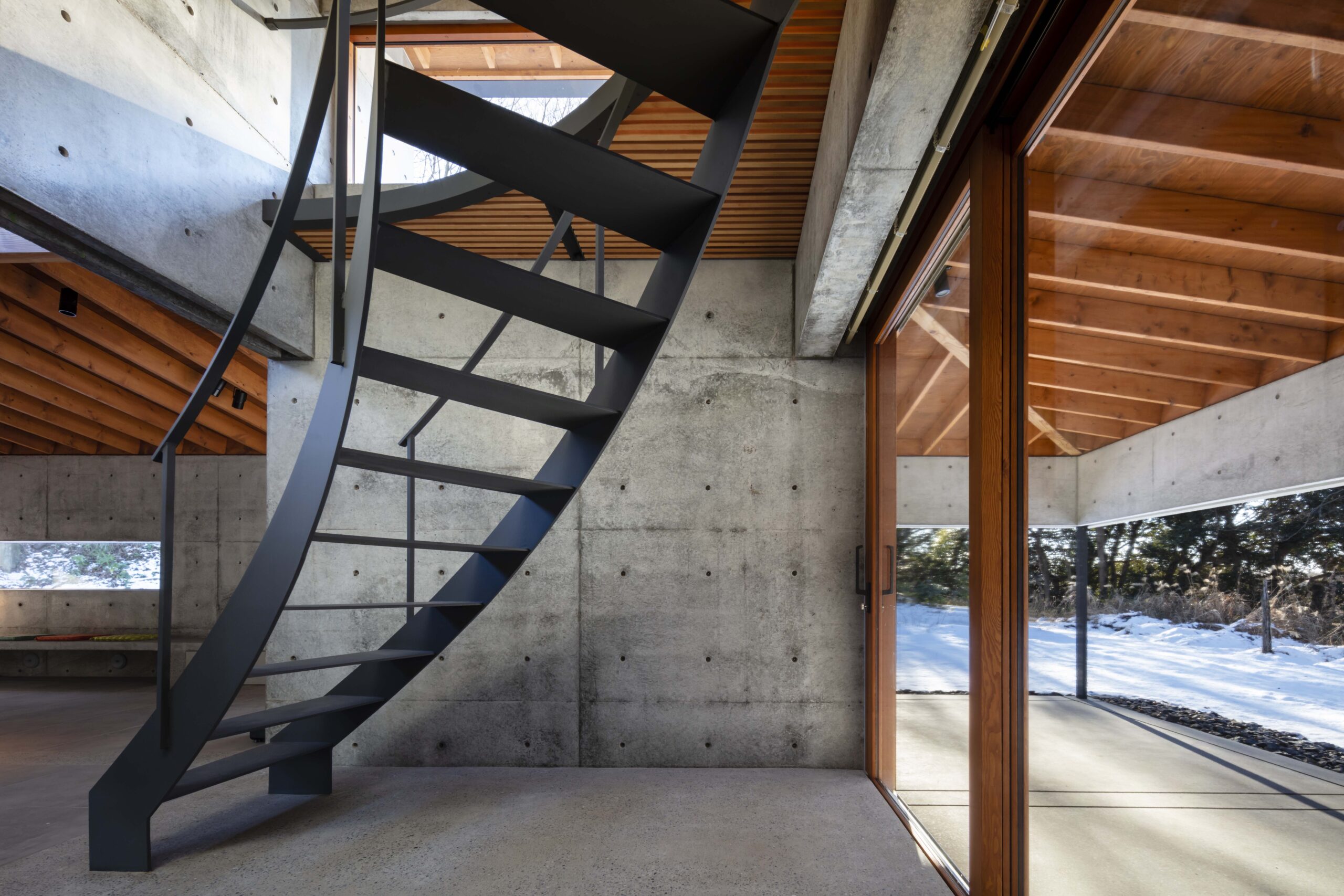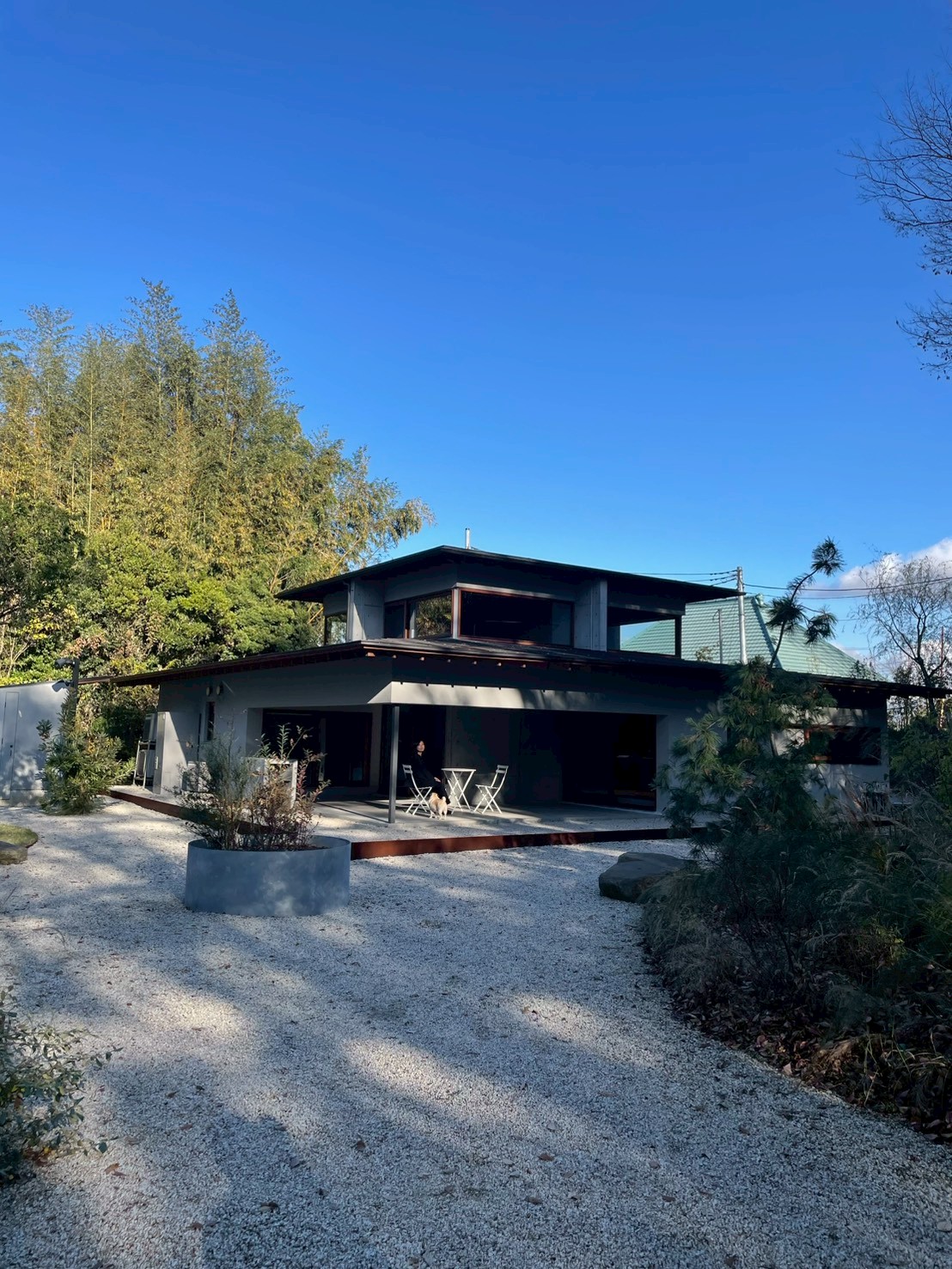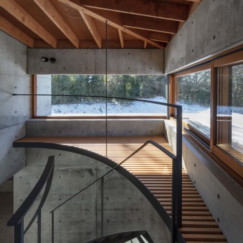 緑に囲まれた環境で、日常生活でもアウトドアを楽しみたいという建て主の希望をかたちにした住宅です。低い軒と緩やかな屋根が、外部からの視線は遮りながらも室内と庭をつなげています。また、テラスとアトリエという半外部空間が仲介することで、住まいと豊かな自然が一体化することに一役買っています。周辺の高木が日光を遮ってしまうのですが、上階のハイサイドライトや吹き抜けを設けることで光を室内に取り込むと同時に、そこからも木々や青空が眺められ、どこにいても自然を感じられる空間になっています。