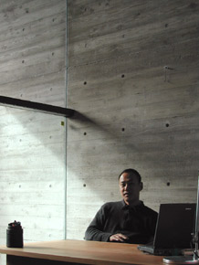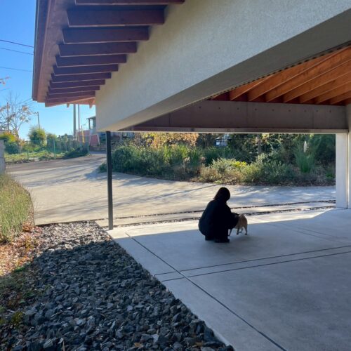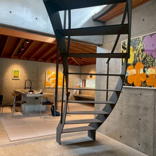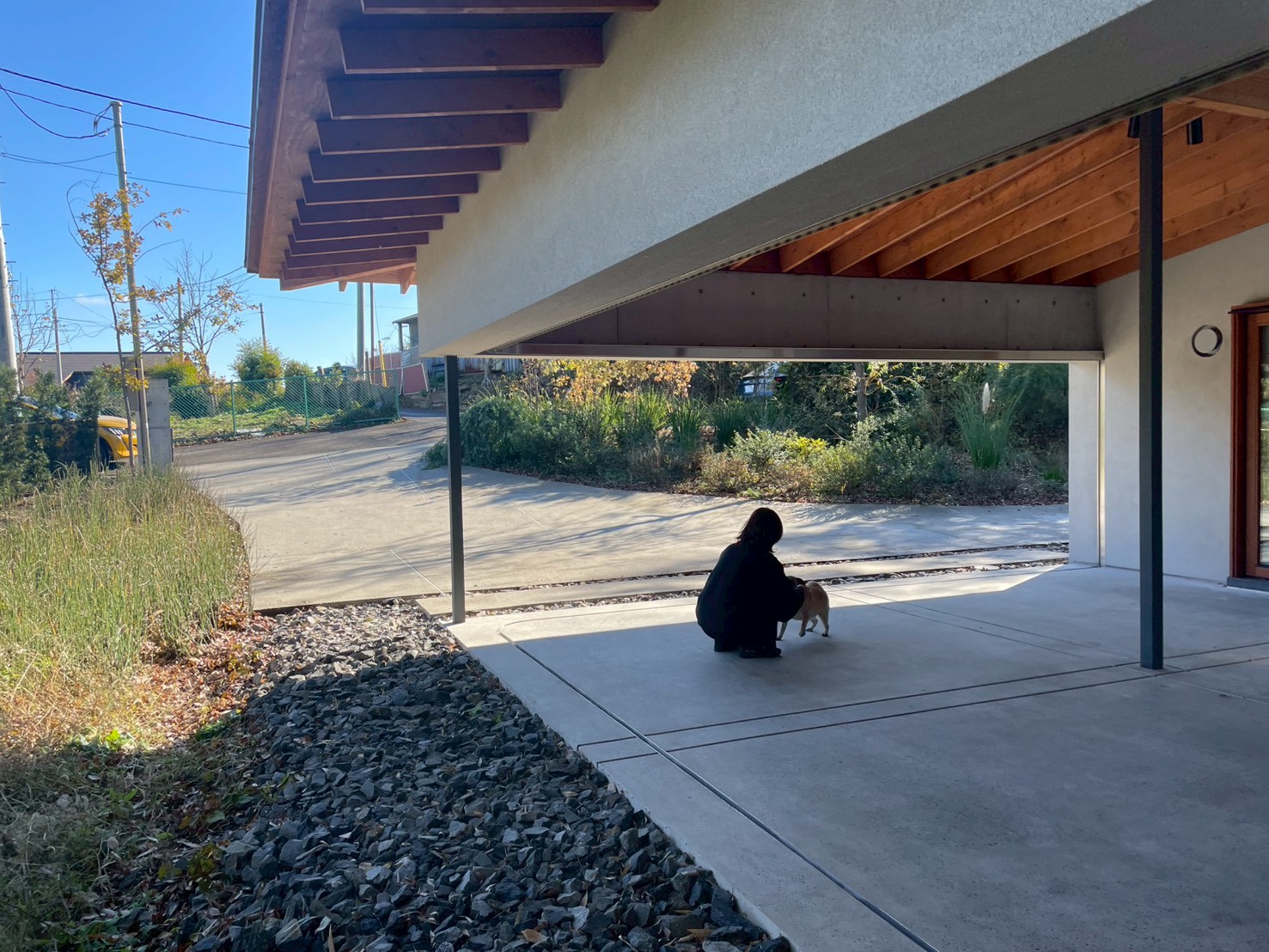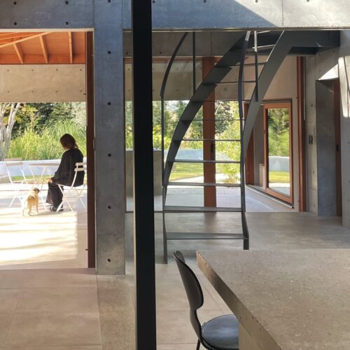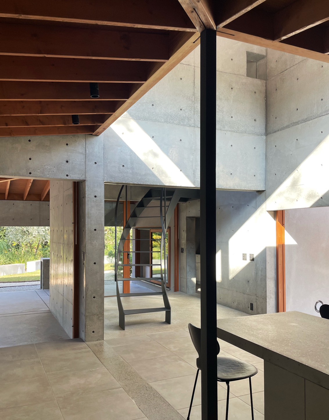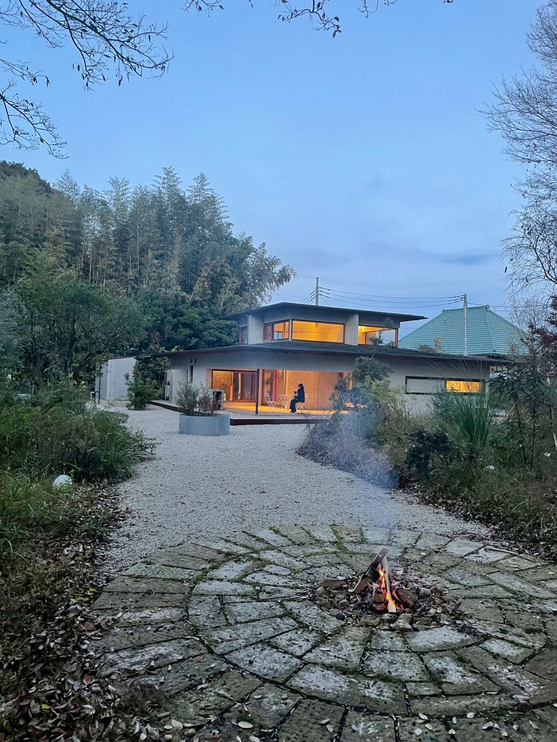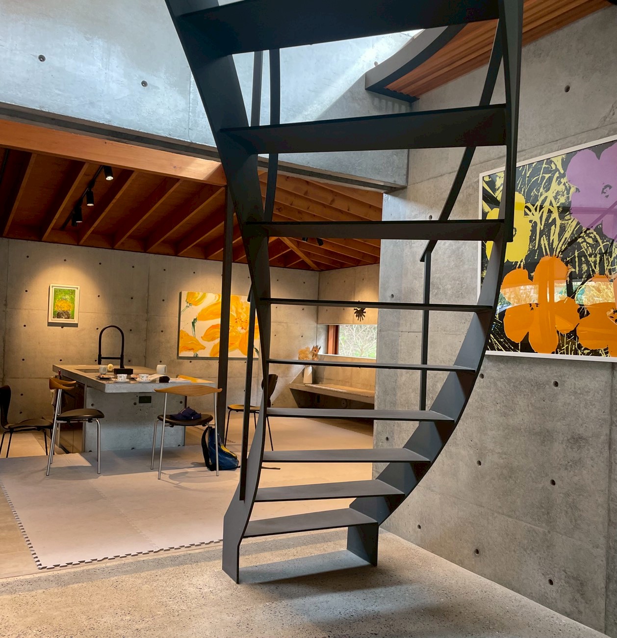 緑に囲まれた環境で、日常生活でもアウトドアを楽しみたいという建て主の希望をかたちにした住宅です。低い軒と緩やかな屋根が、外部からの視線は遮りながらも室内と庭をつなげています。また、テラスとアトリエという半外部空間が仲介することで、住まいと豊かな自然が一体化することに一役買っています。周辺の高木が日光を遮ってしまうのですが、上階のハイサイドライトや吹き抜けを設けることで光を室内に取り込むと同時に、そこからも木々や青空が眺められ、どこにいても自然を感じられる空間になっています。