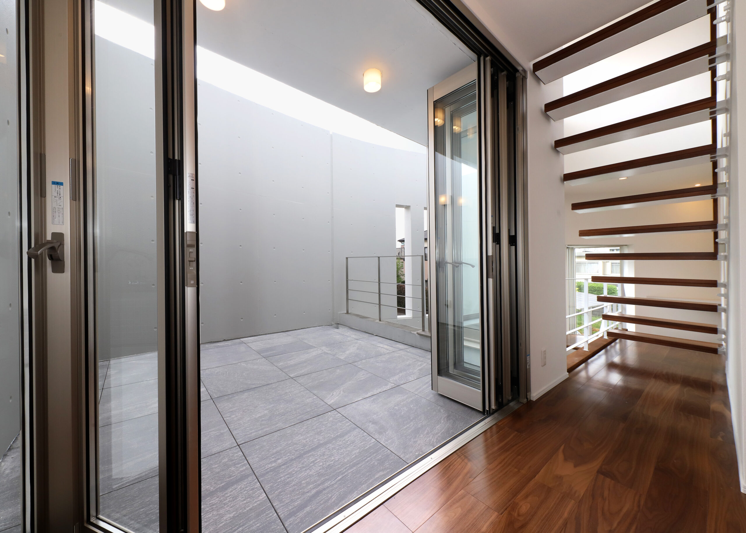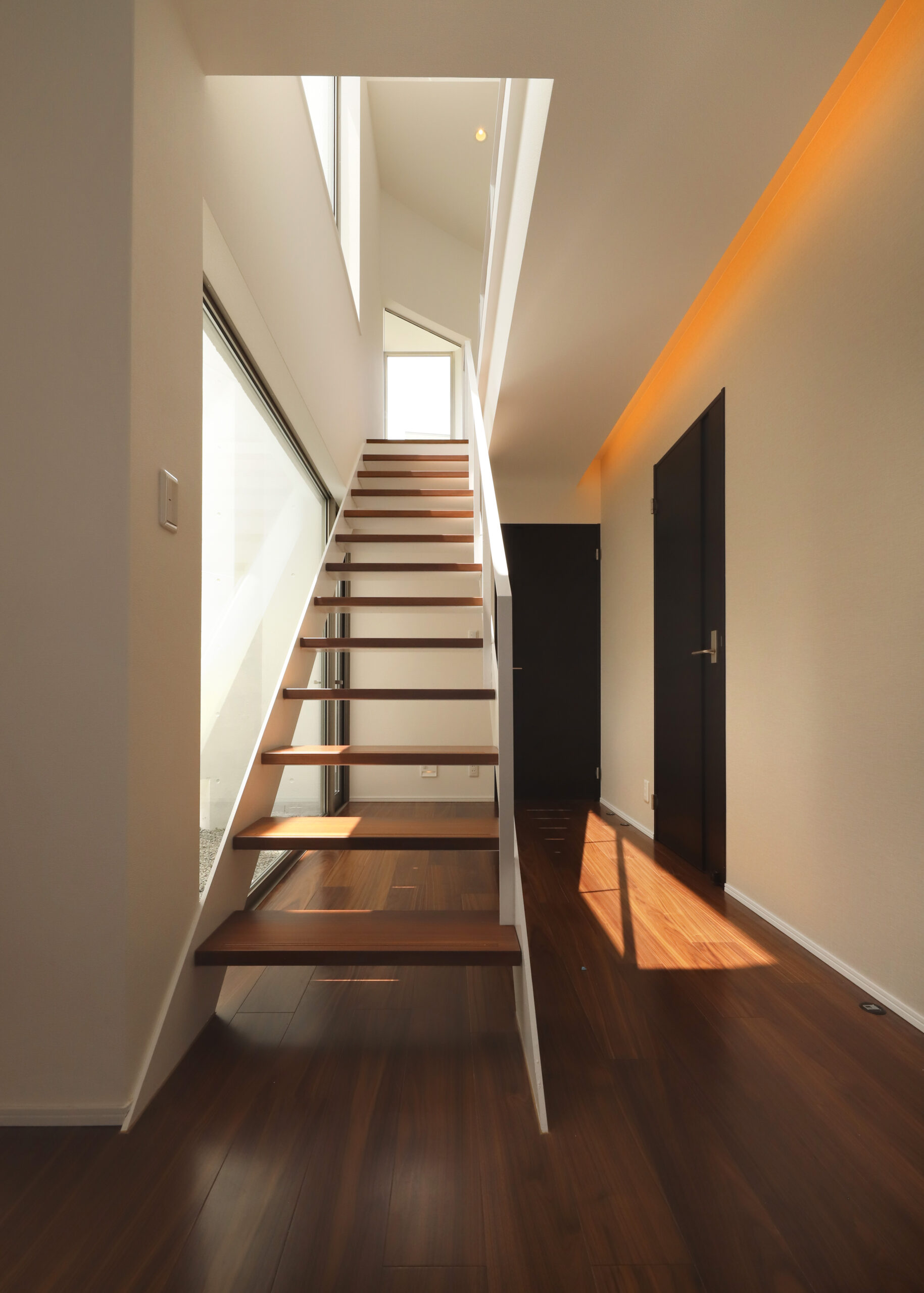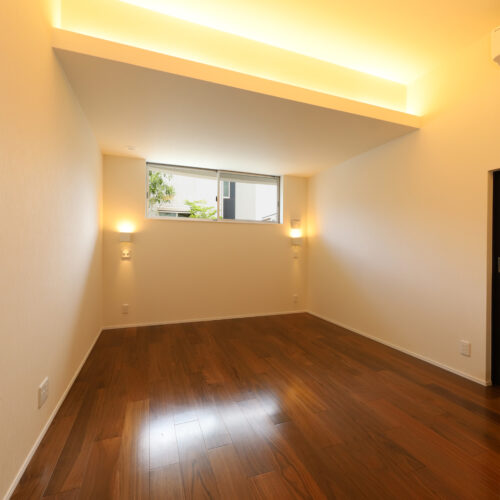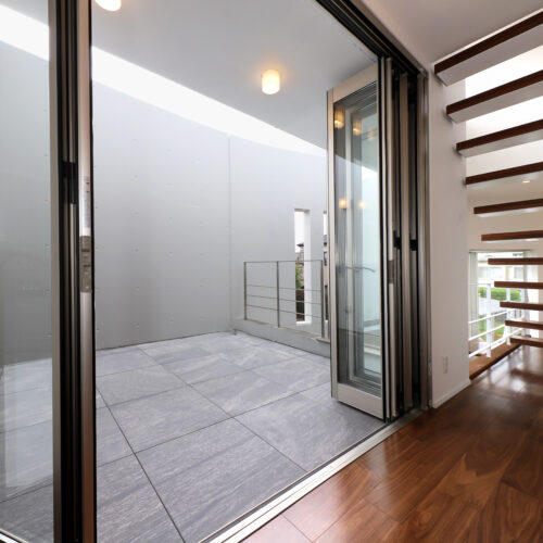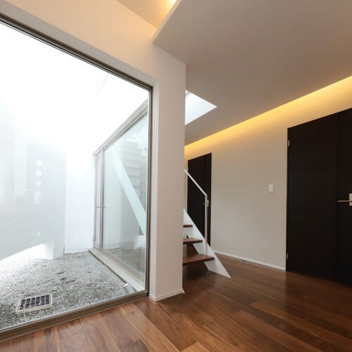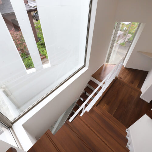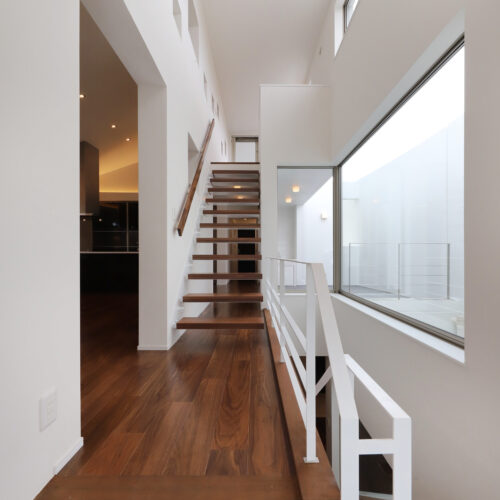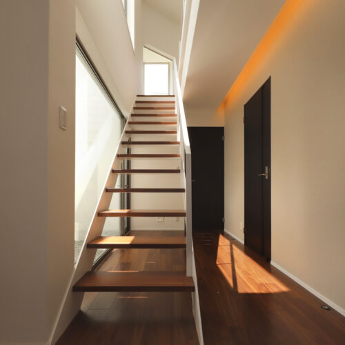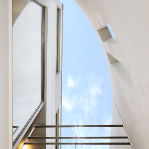 また、強い日差しを直接室内に取り込むのでは無く、近隣の視線を遮りつつ居室の外気負荷を抑えるよう、弧の壁の裏側に階段や坪庭・テラスなどを設けて、その空間で一旦日光を受け、そこで拡散された間接光のようなやさしい光が、その奥に配したリビングや個室にはいるように意図しています。