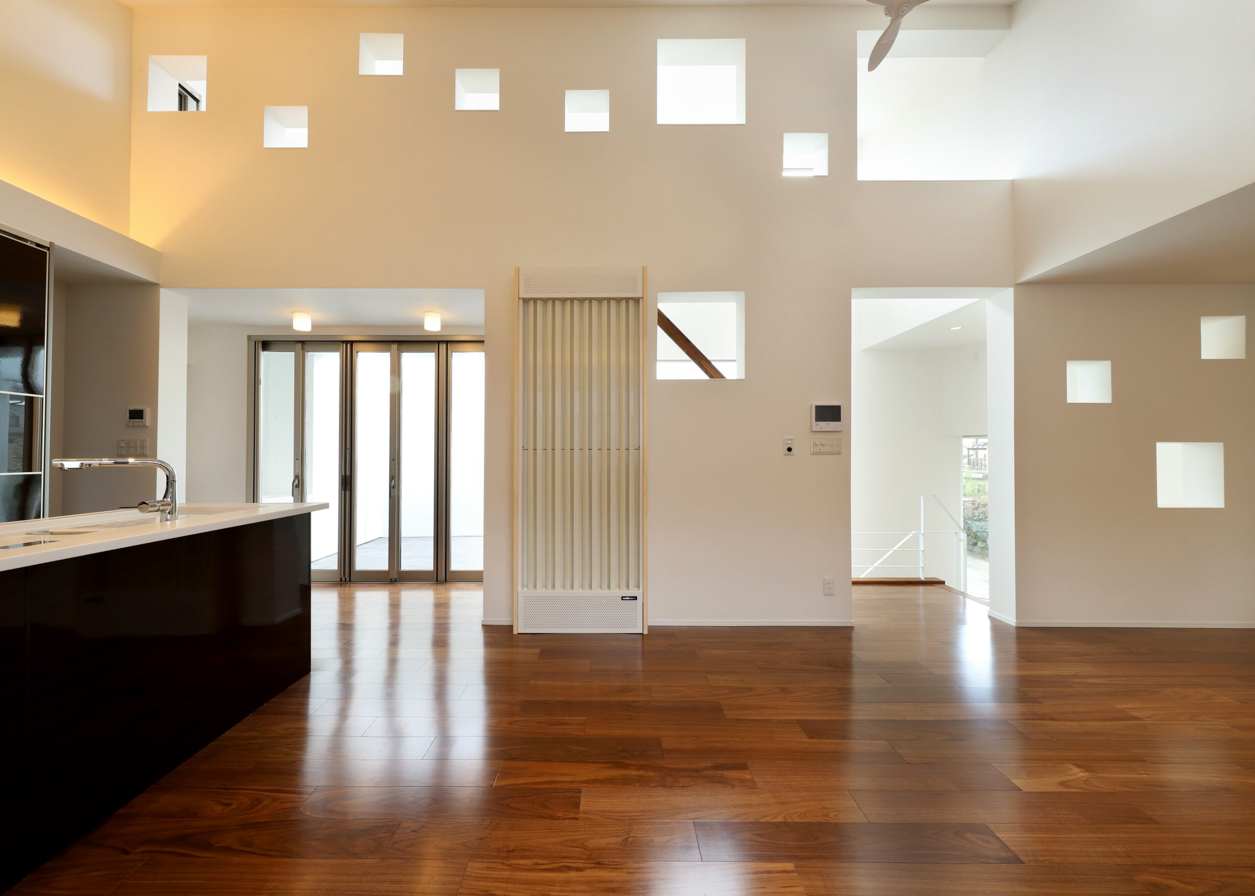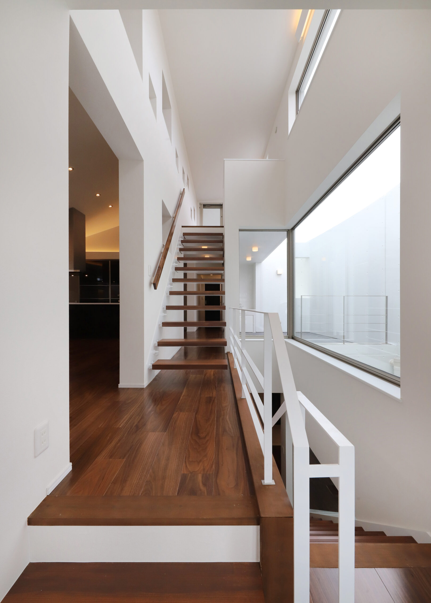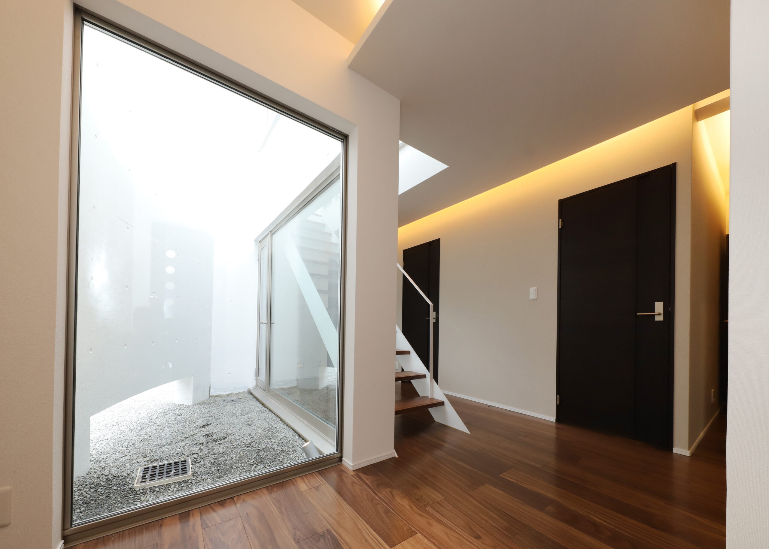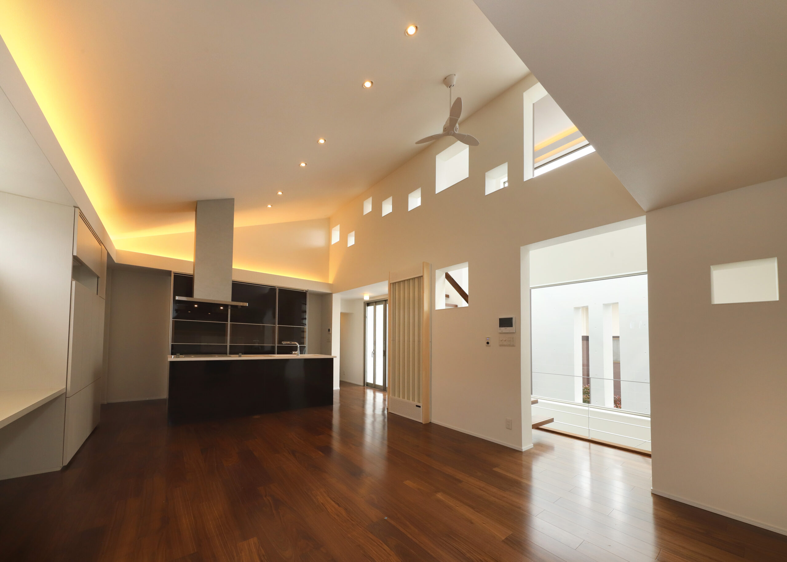 また、強い日差しを直接室内に取り込むのでは無く、近隣の視線を遮りつつ居室の外気負荷を抑えるよう、弧の壁の裏側に階段や坪庭・テラスなどを設けて、その空間で一旦日光を受け、そこで拡散された間接光のようなやさしい光が、その奥に配したリビングや個室にはいるように意図しています。