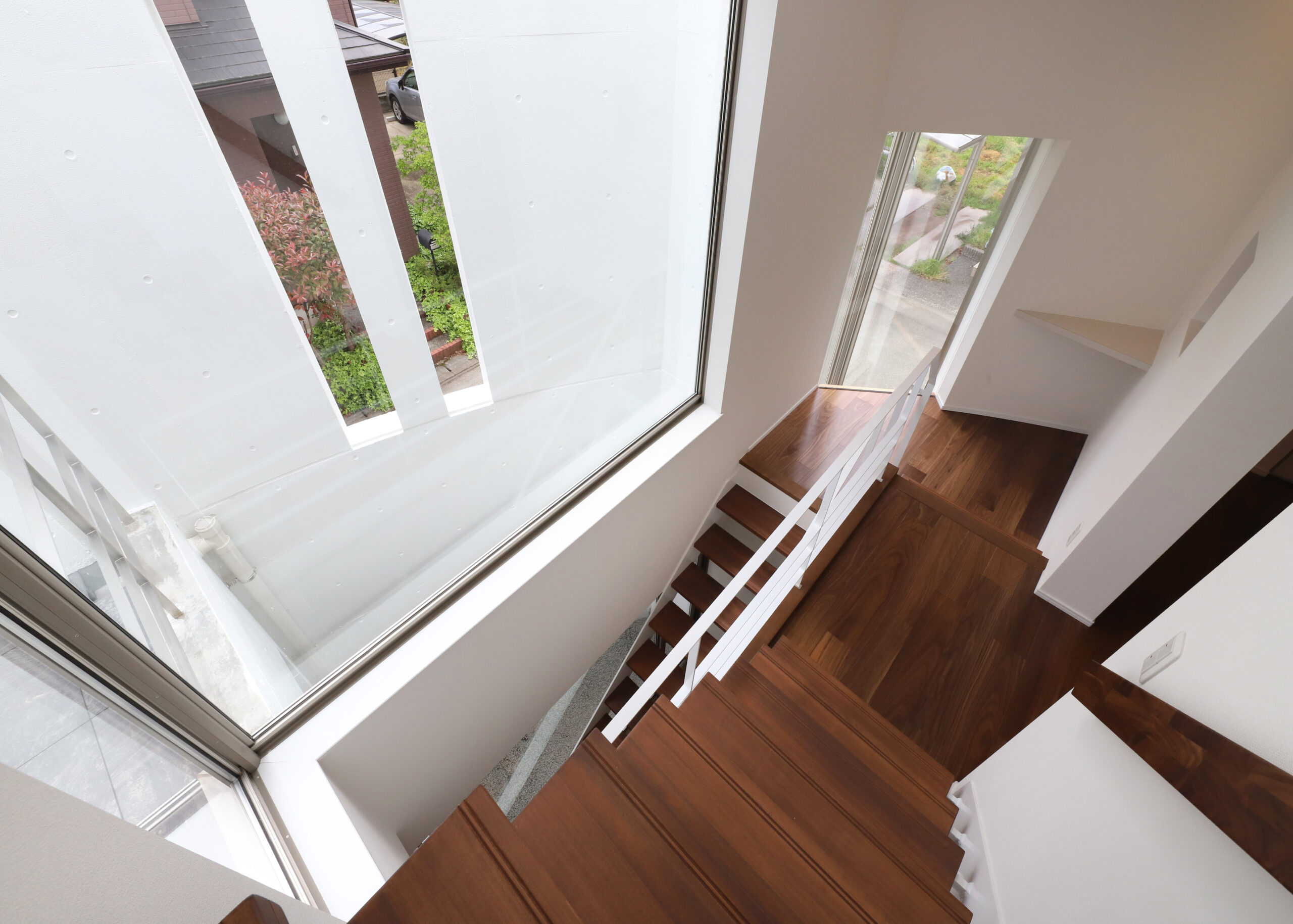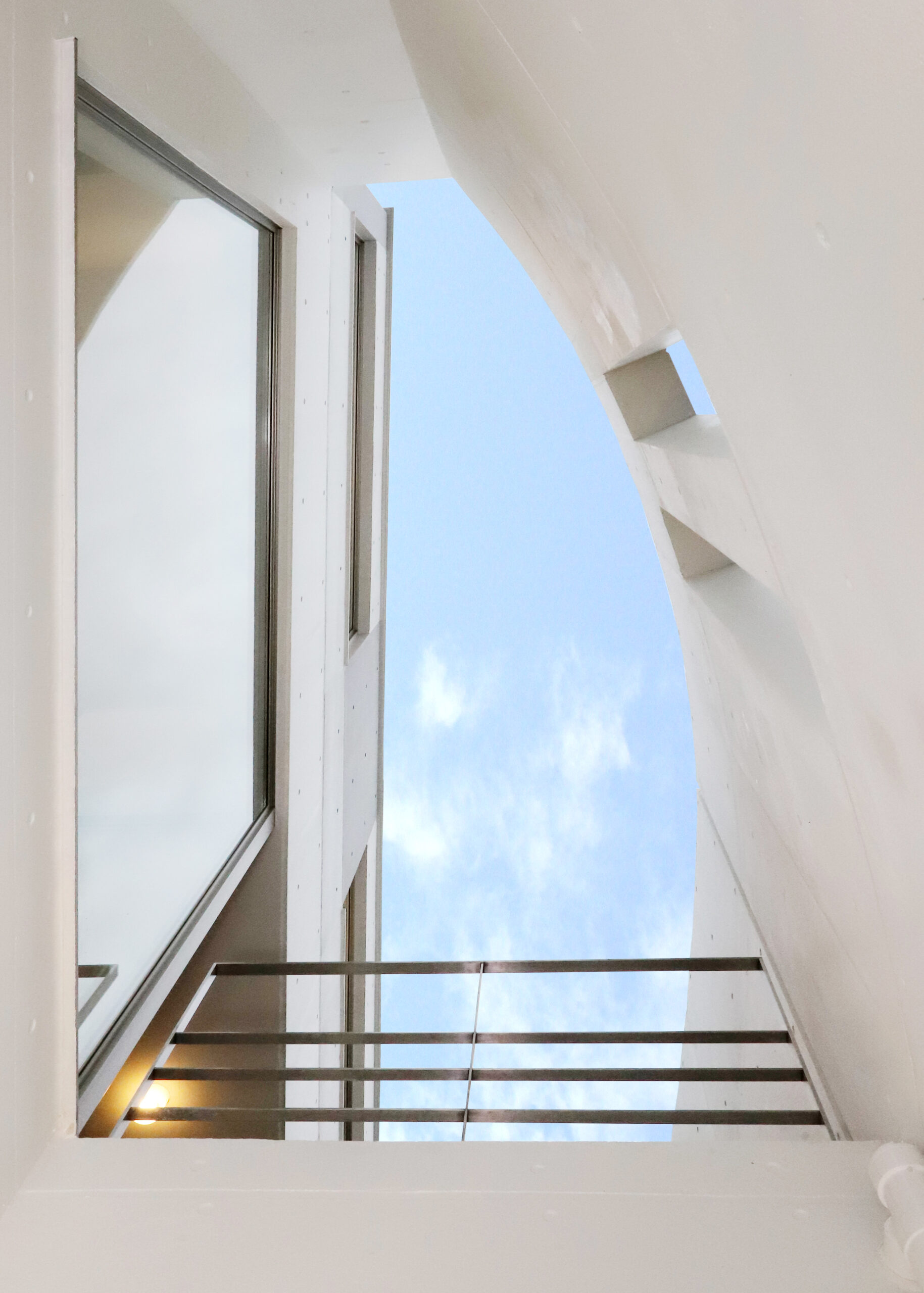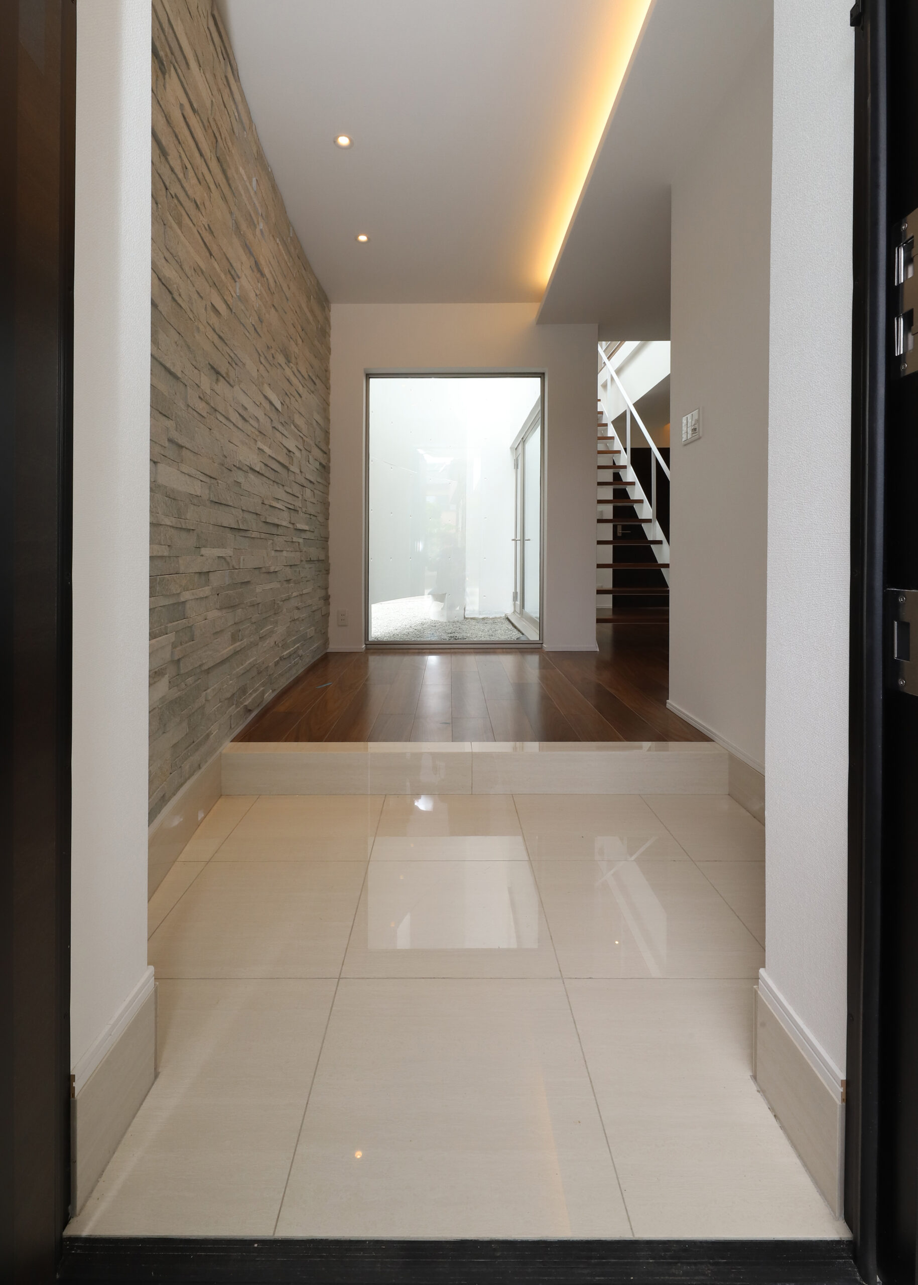 また、強い日差しを直接室内に取り込むのでは無く、近隣の視線を遮りつつ居室の外気負荷を抑えるよう、弧の壁の裏側に階段や坪庭・テラスなどを設けて、その空間で一旦日光を受け、そこで拡散された間接光のようなやさしい光が、その奥に配したリビングや個室にはいるように意図しています。