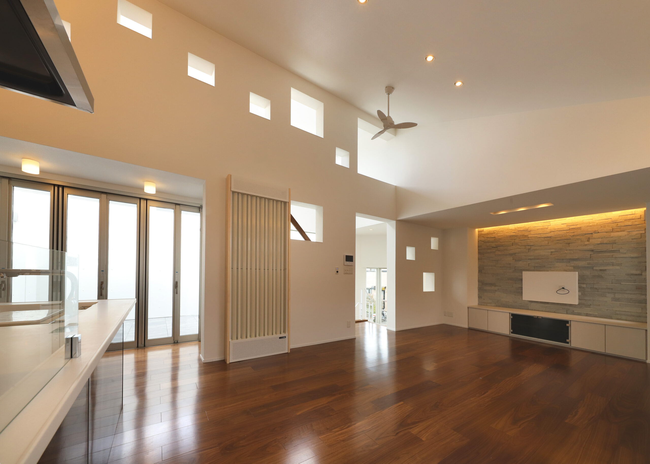 カーテン類の必要の無い開放的な暮らしが実現と、熊本は西日の日差しが強い地域であり、真南の日射であれば太陽の高度から庇を設けることで日射制御はできますが、高度が低い西日の強い日差しに対しては壁によって制御をする必要があるため、弧の壁の膨らみと内部空間との距離が、南から西にかけて狭めることでパッシブデザインの考えを取り入れ、室内環境の形成からも効果的になっています。