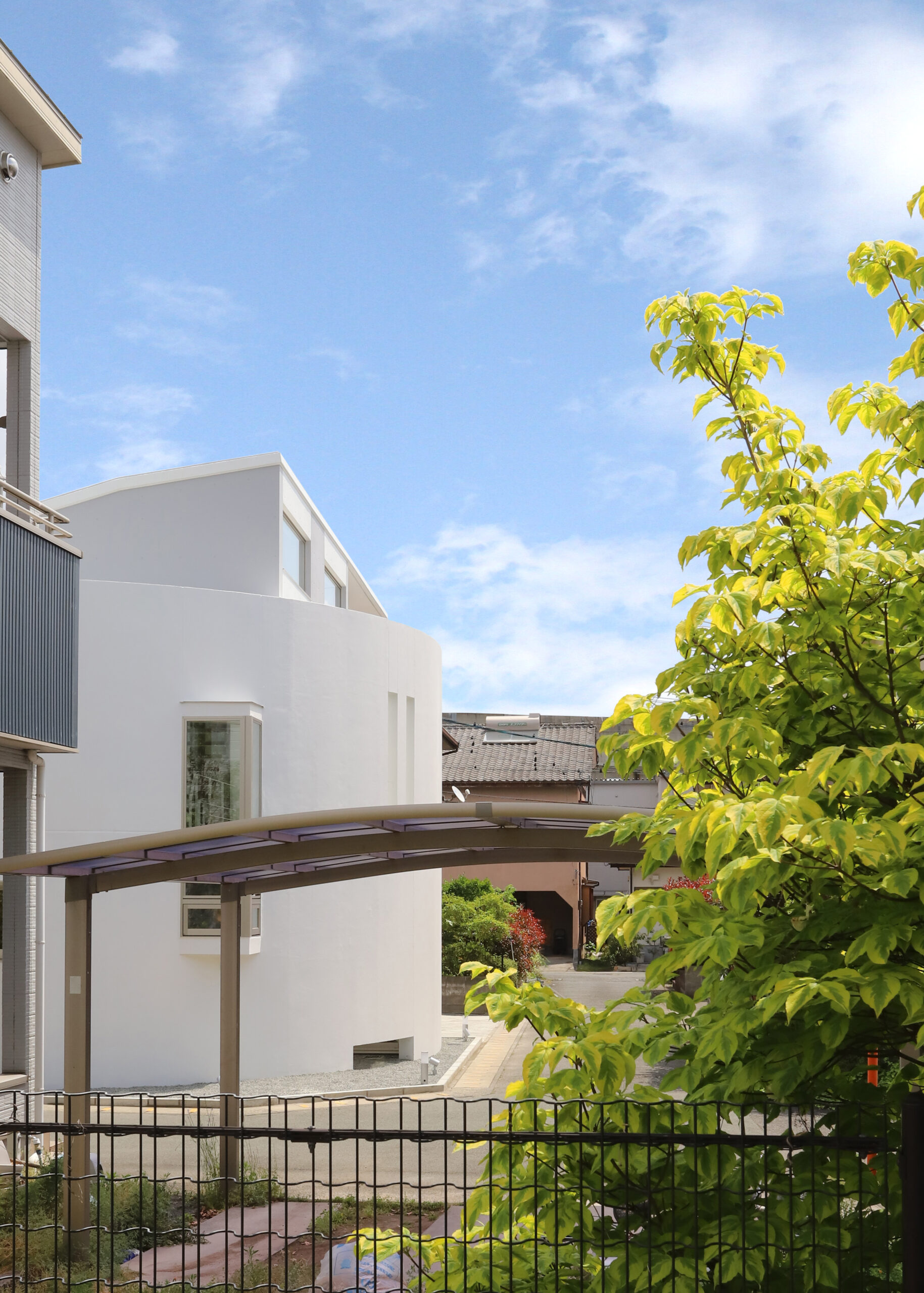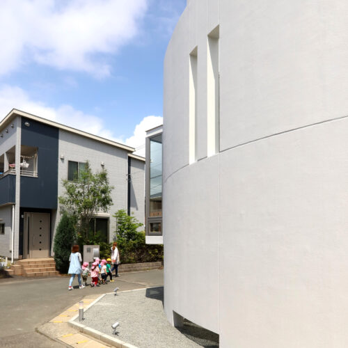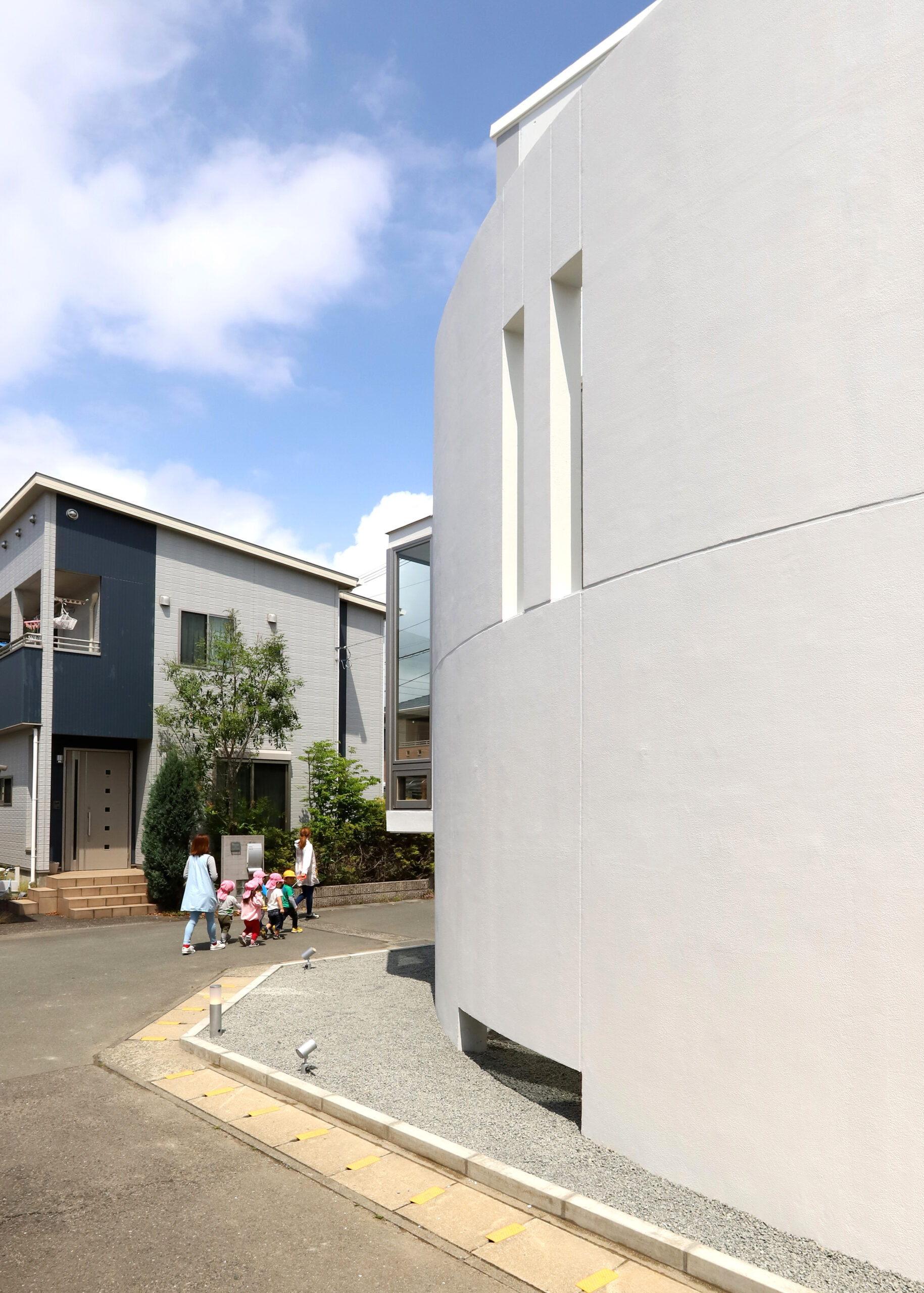 初めて現地確認に行った際、偶然、近所の保育園児が日課としている散歩と出会いました。しばらく眺めていると、道路には歩道が無く生垣や塀によって見通しが悪かった角地を、引率の先生方が車に注意しながら大廻りに進んでいく光景が目に飛び込んできました。その瞬間、敷地の角をこの子達の安全性の確保のために外壁と目隠し塀を兼ね見通しがきくカーブ(弧)を描いた壁による建築の姿がごく自然に浮かびました。