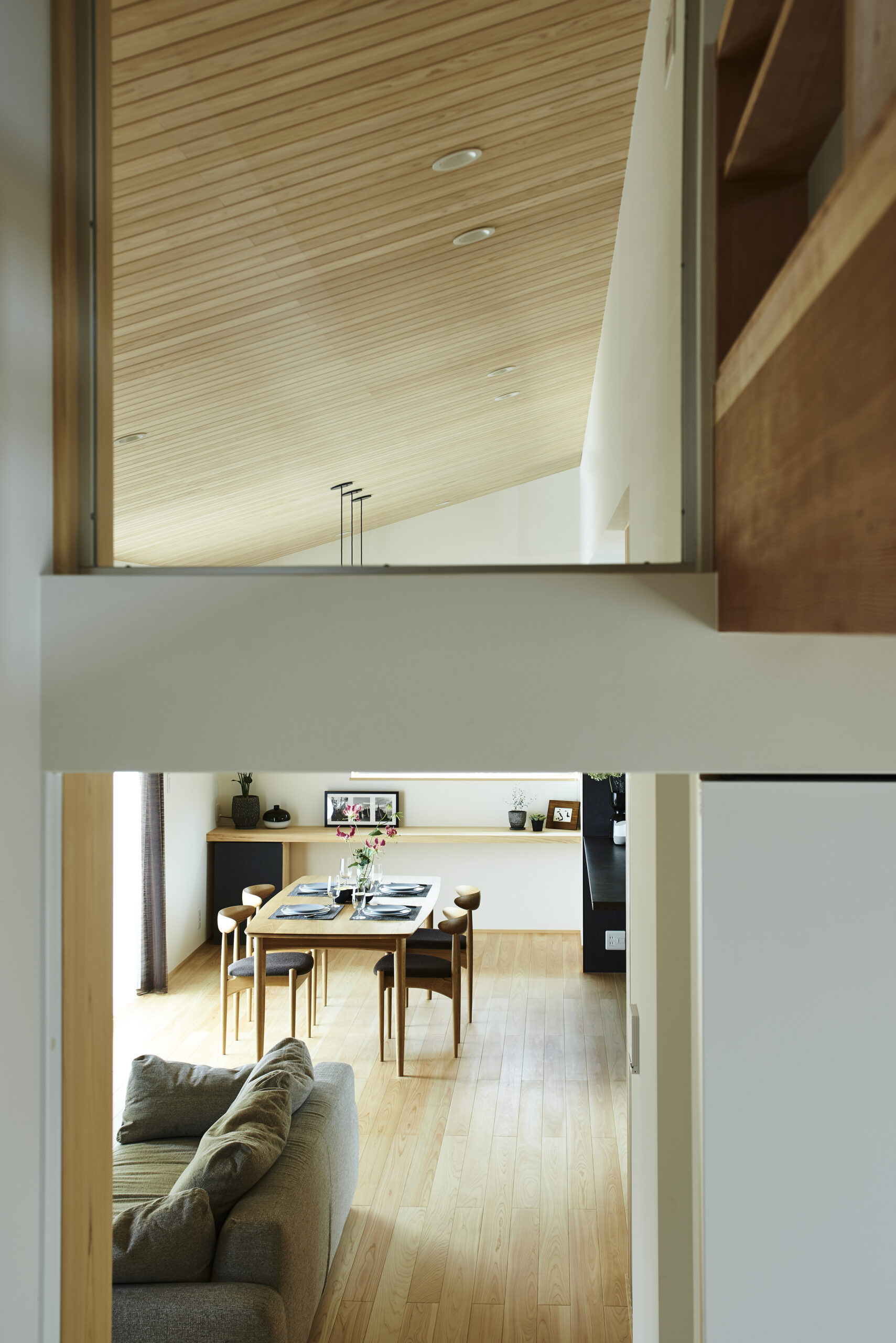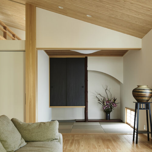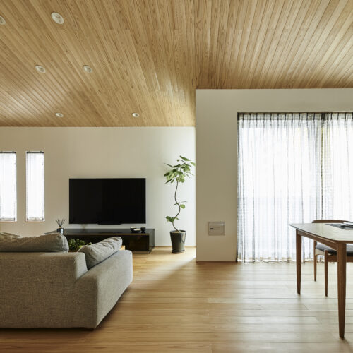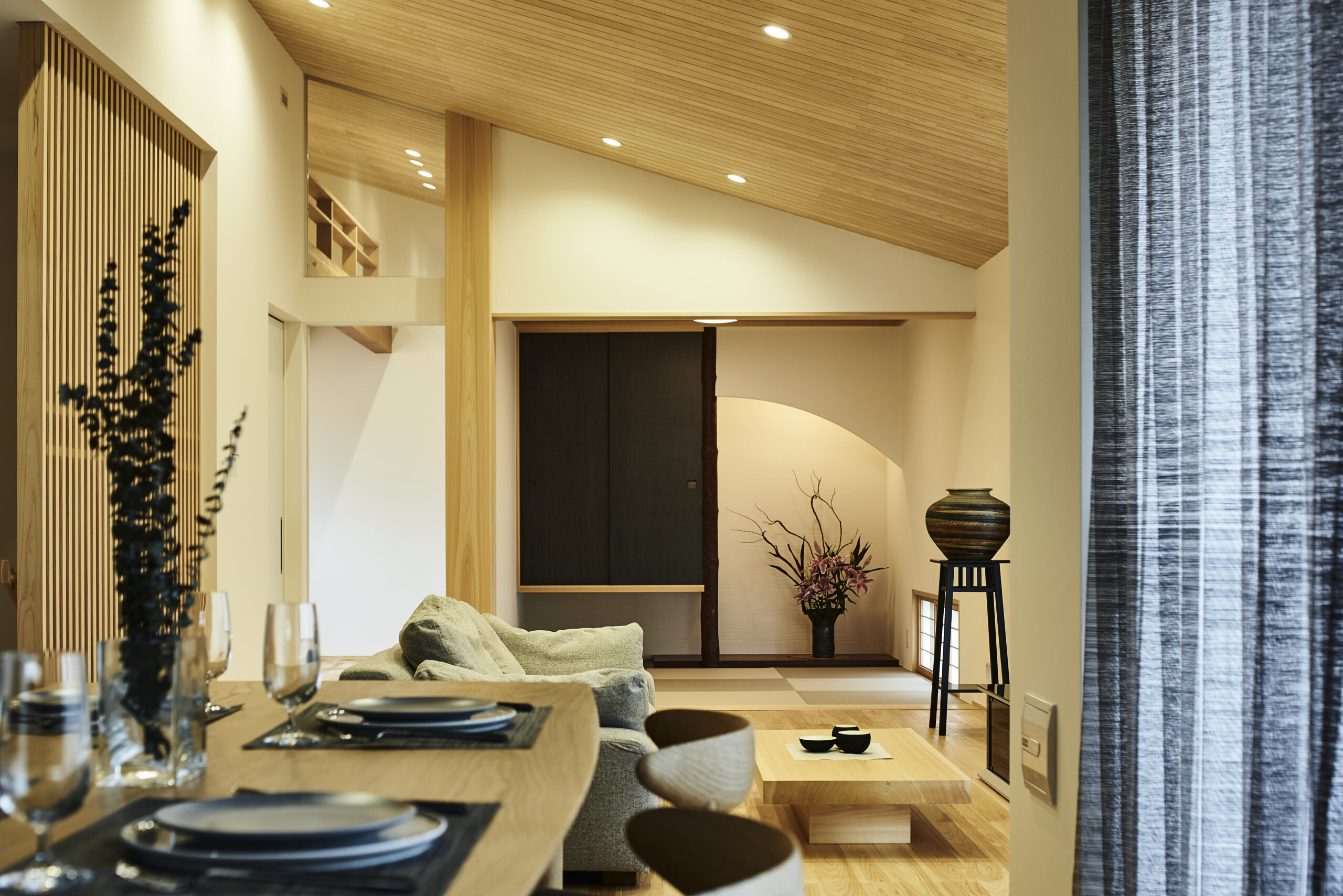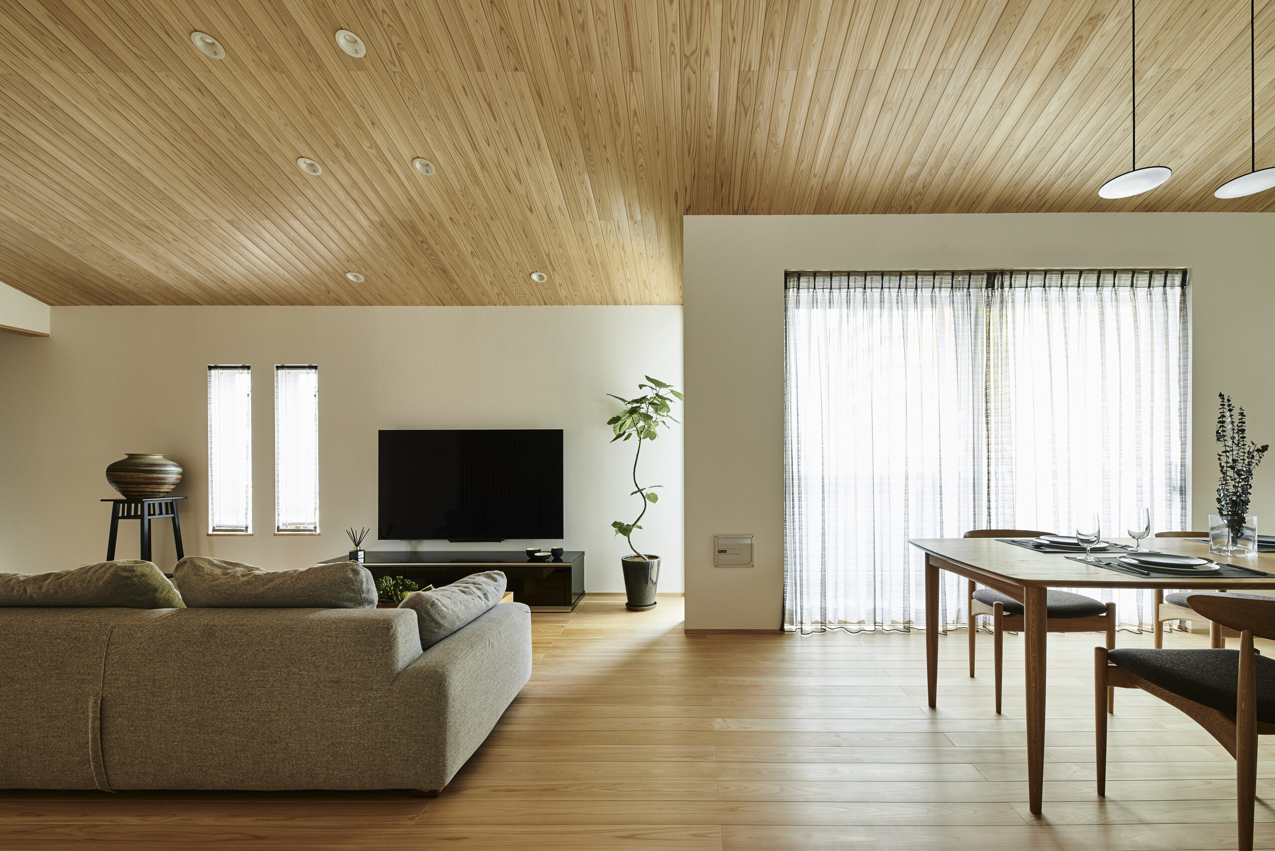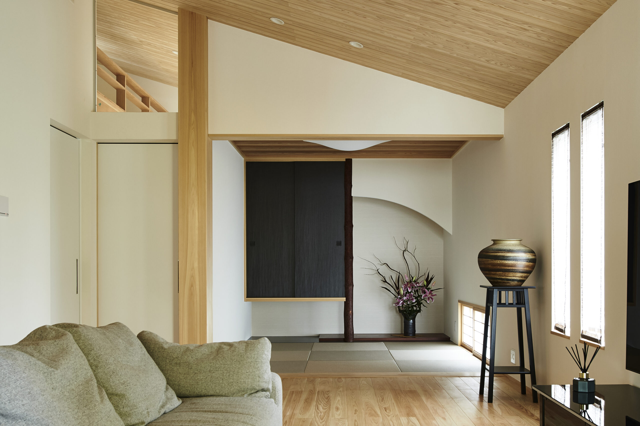 勾配天井には杉材、壁はシラス壁を採用しています。