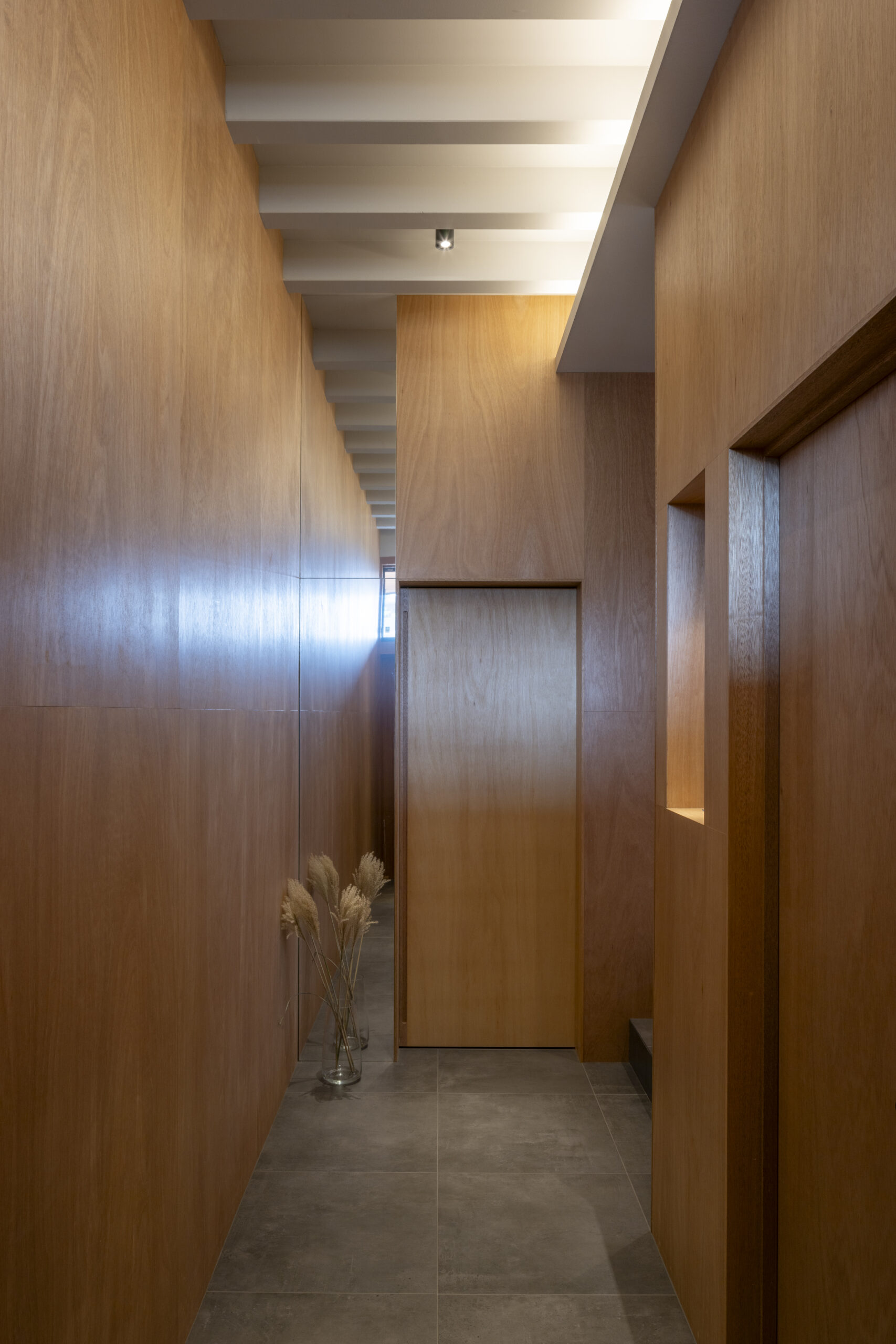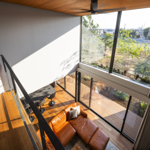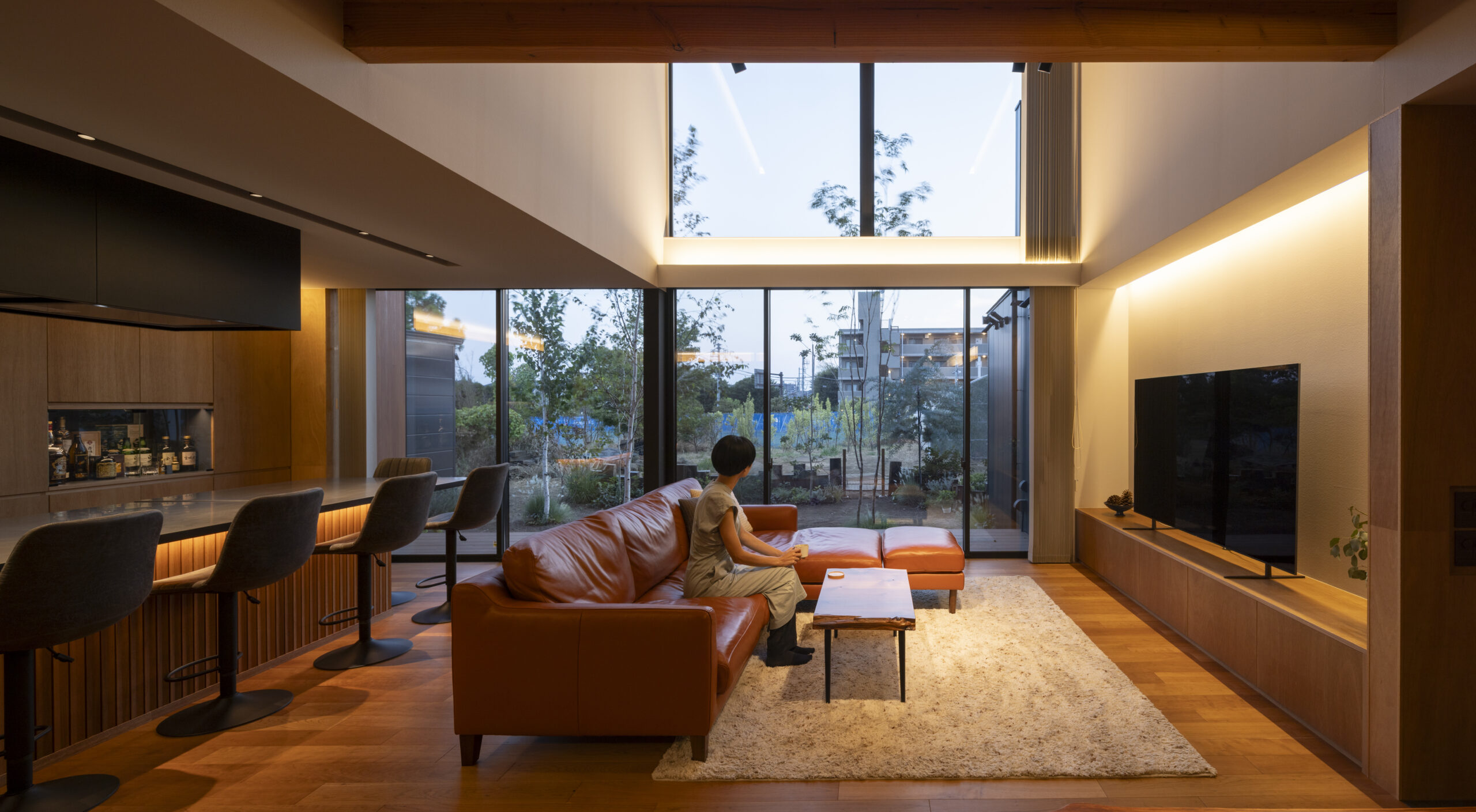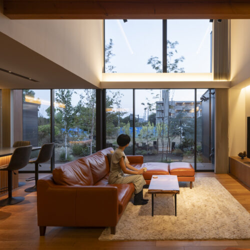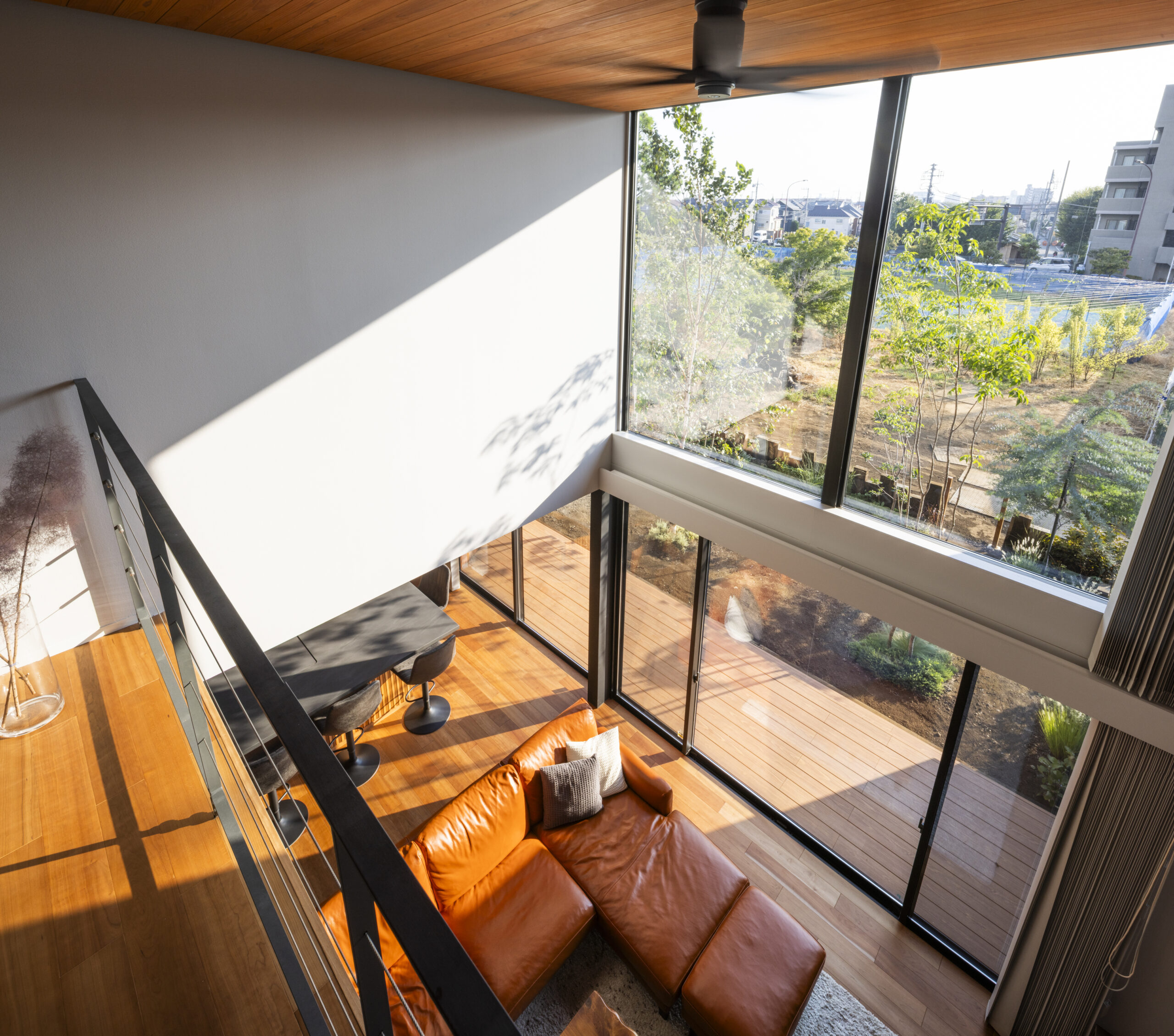 前面道路は、交通量が多い都道であり、騒音の観点から開口部は設けず、逆に、生産緑地側は全面を開口とし生産緑地を借景として利用する計画とした。