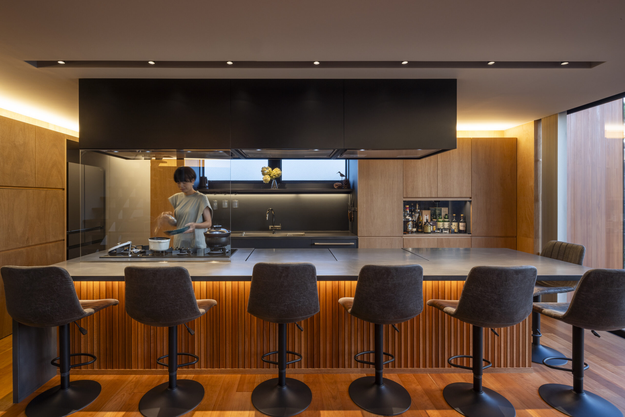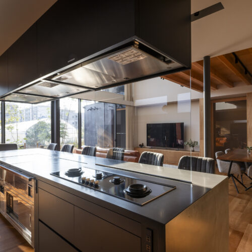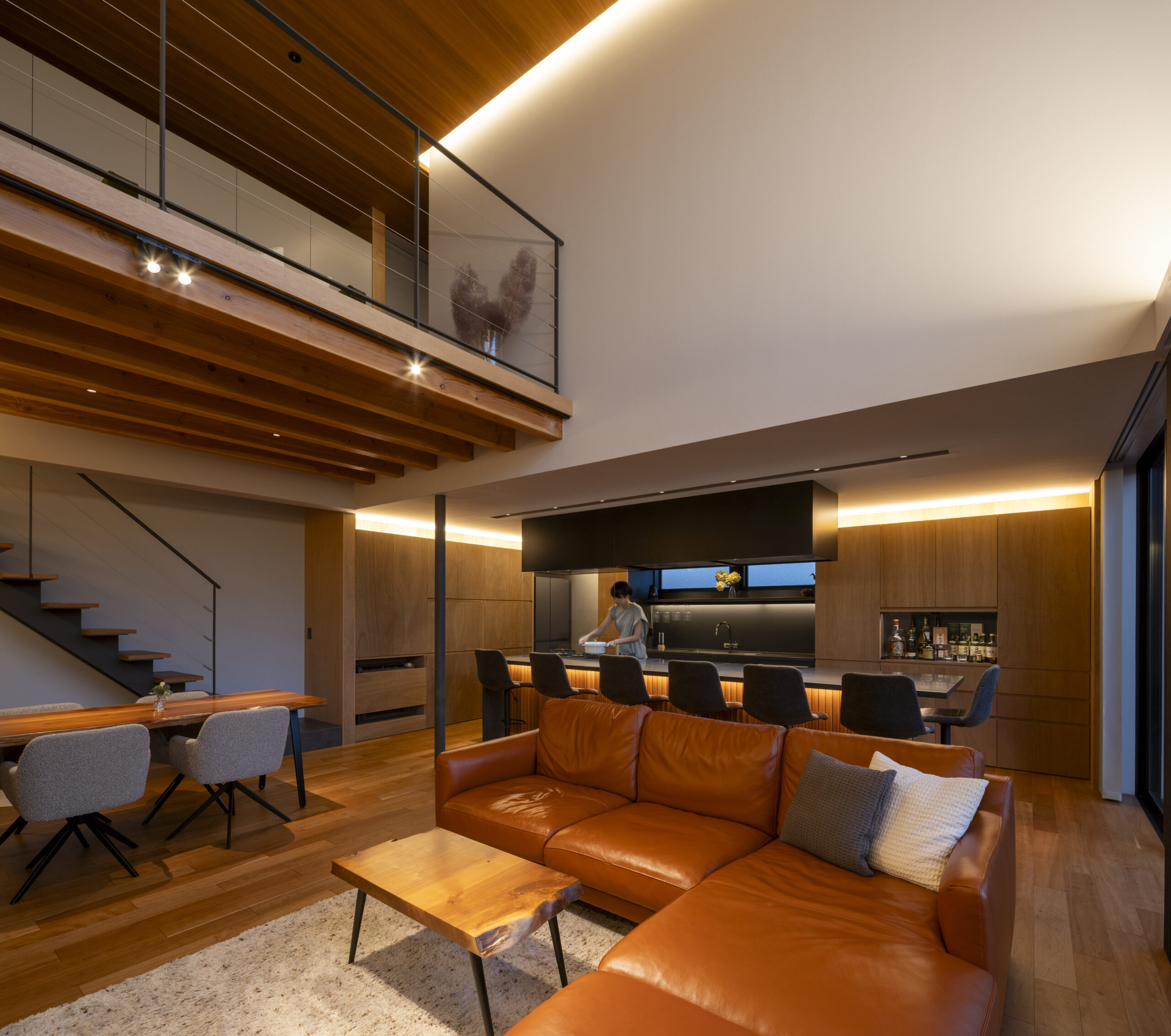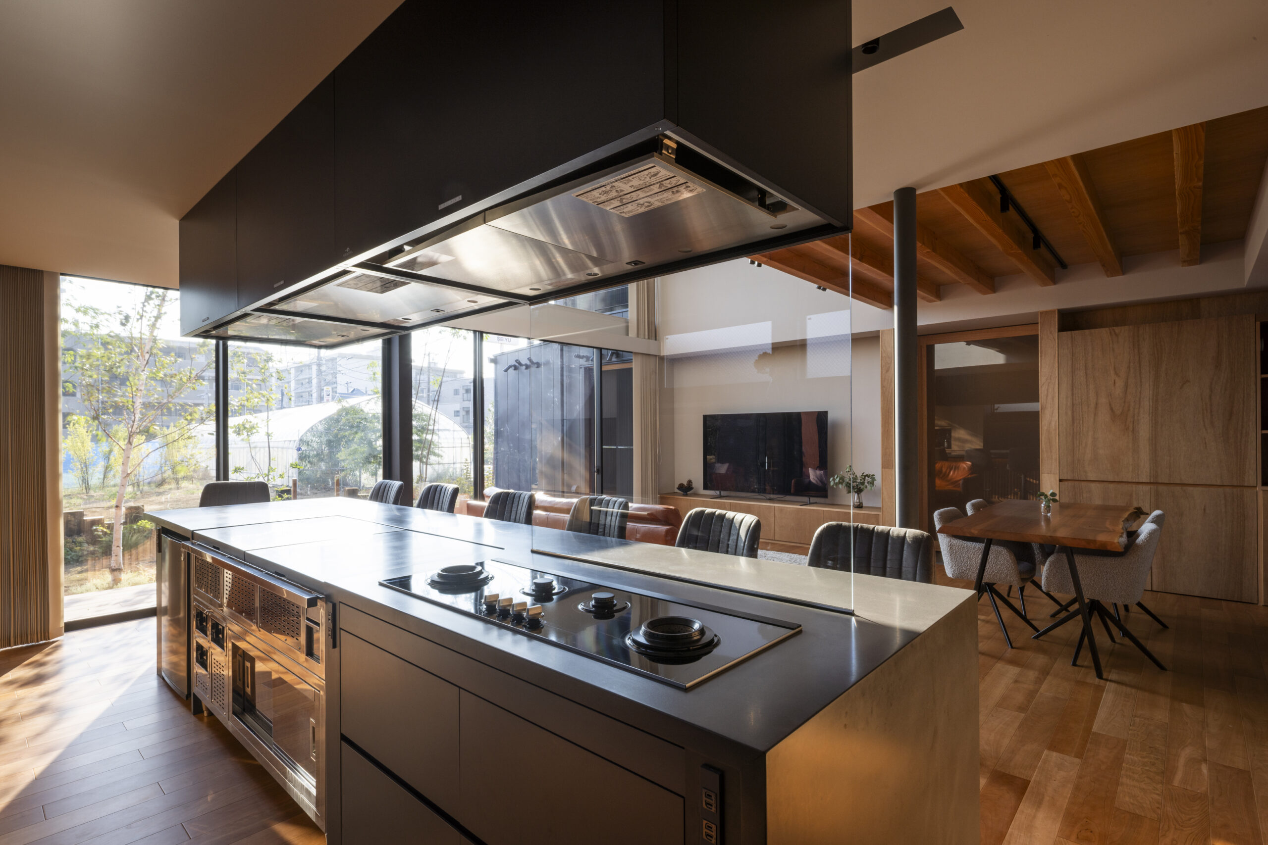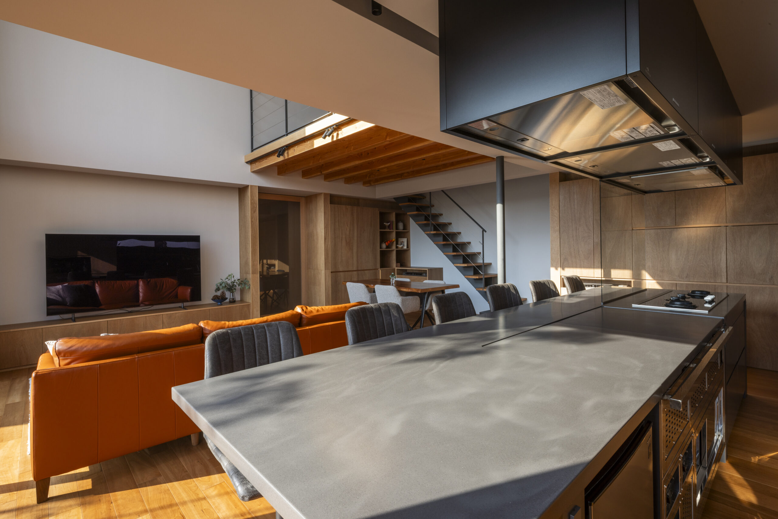 親族や友人たちが集まれる家にしたいという要望から、鉄板焼き機が組み込まれた約4mのカウンターキッチンをリビングの中心に設け、趣味の料理を皆に振る舞えるようにした。