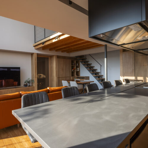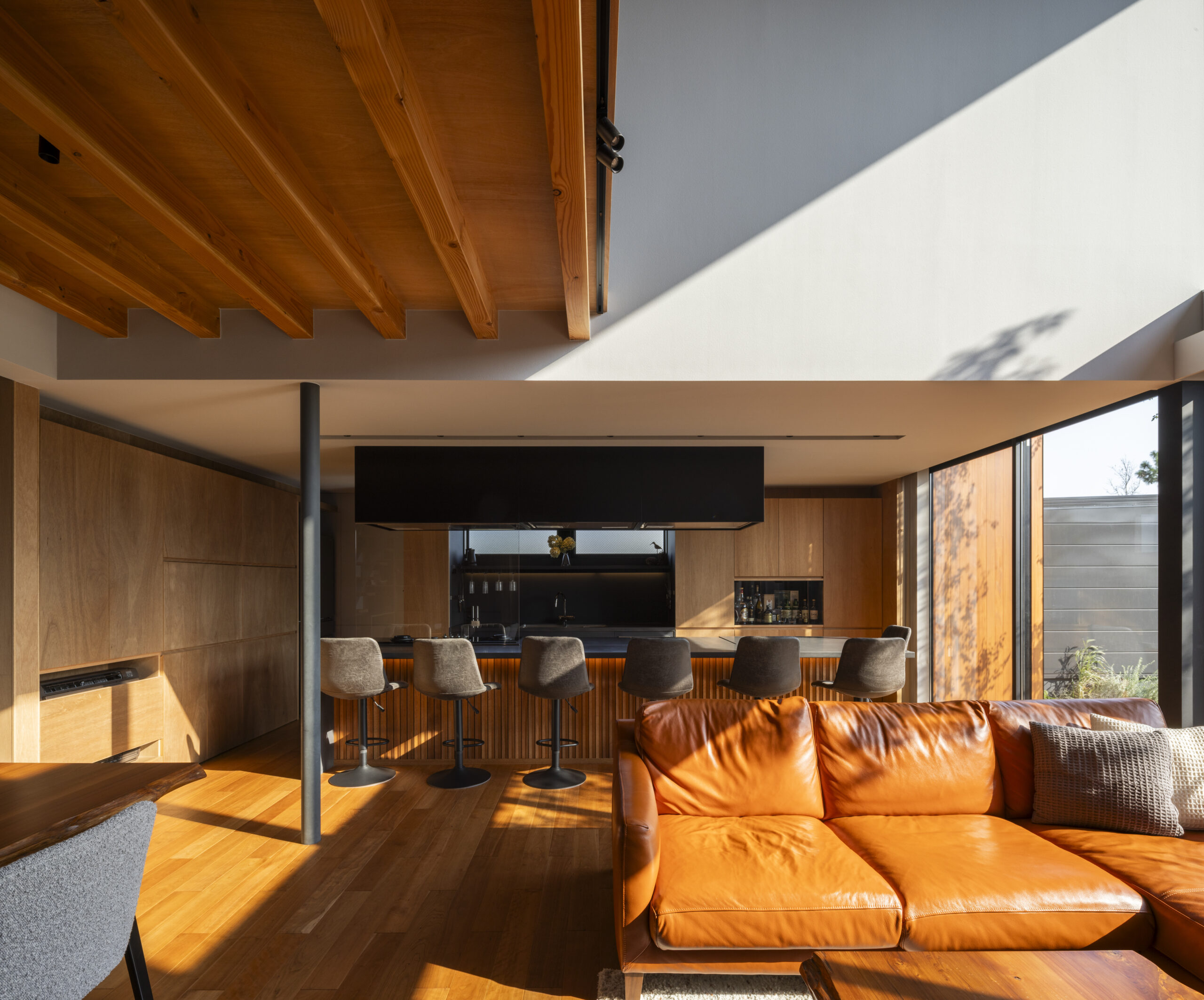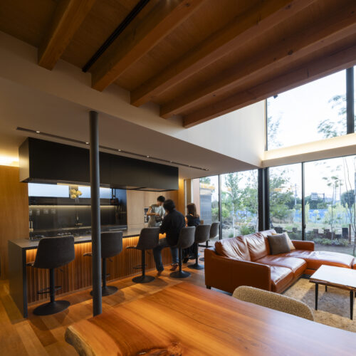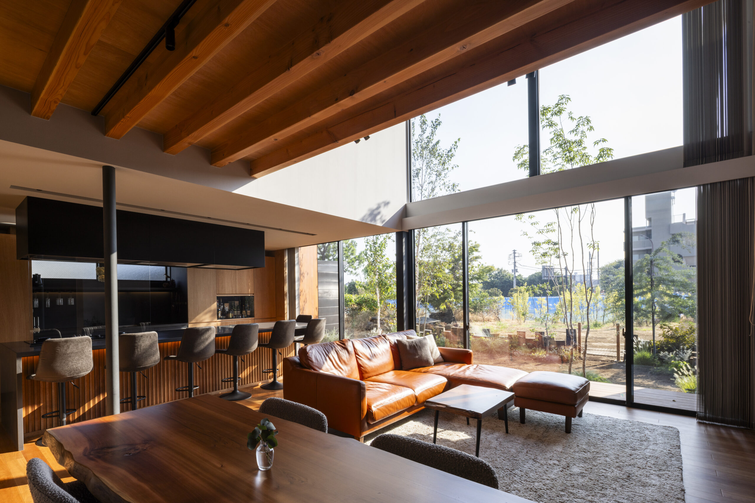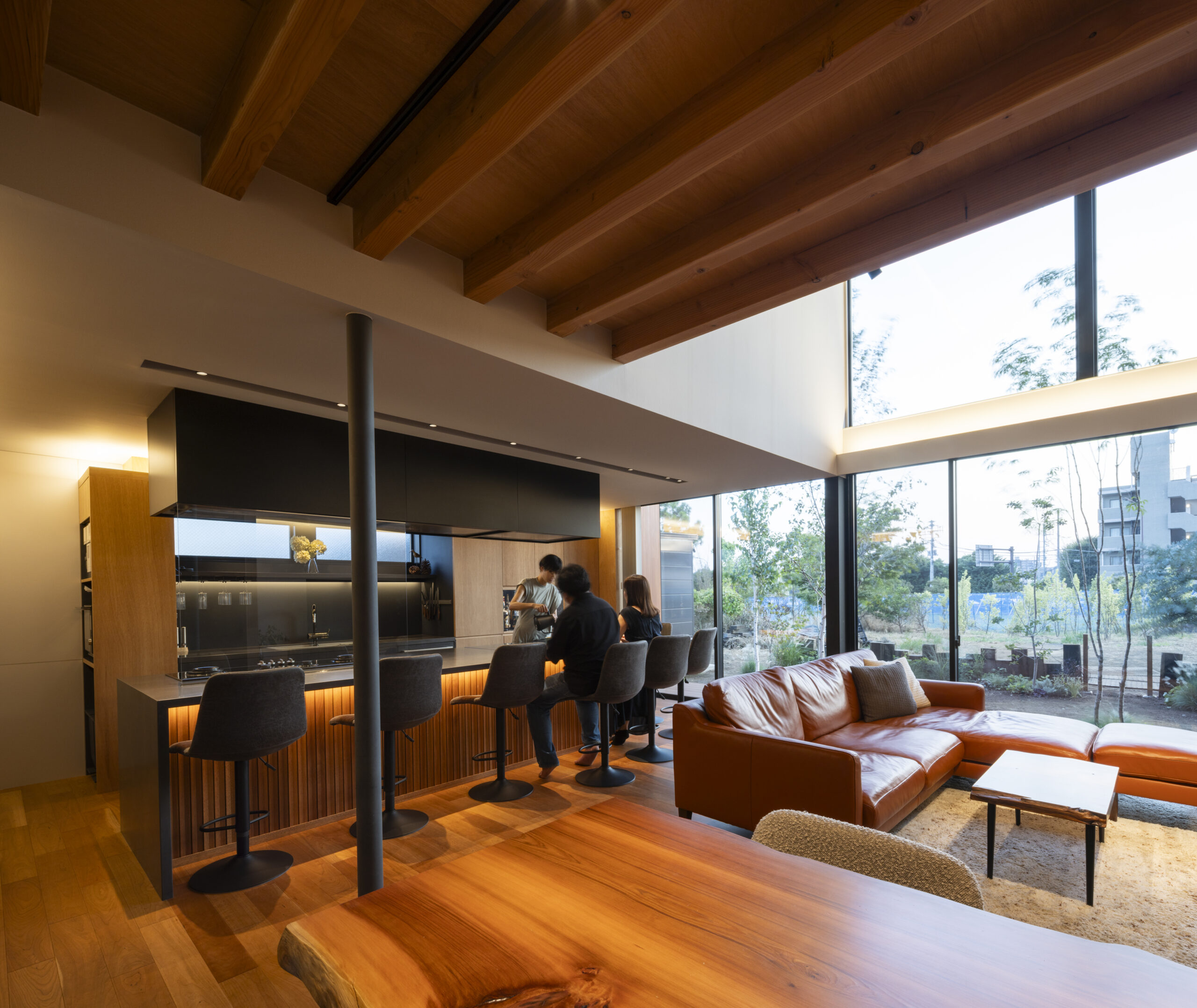 親族や友人たちが集まれる家にしたいという要望から、鉄板焼き機が組み込まれた約4mのカウンターキッチンをリビングの中心に設け、趣味の料理を皆に振る舞えるようにした。