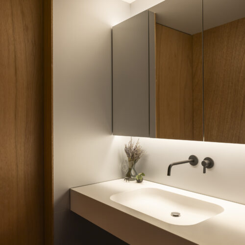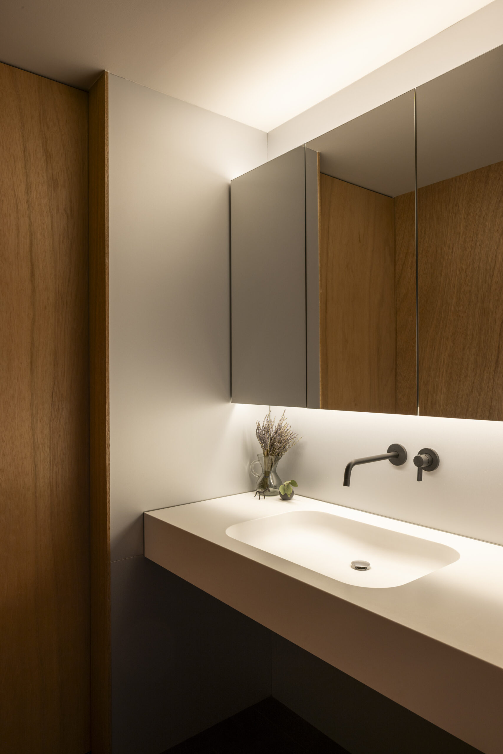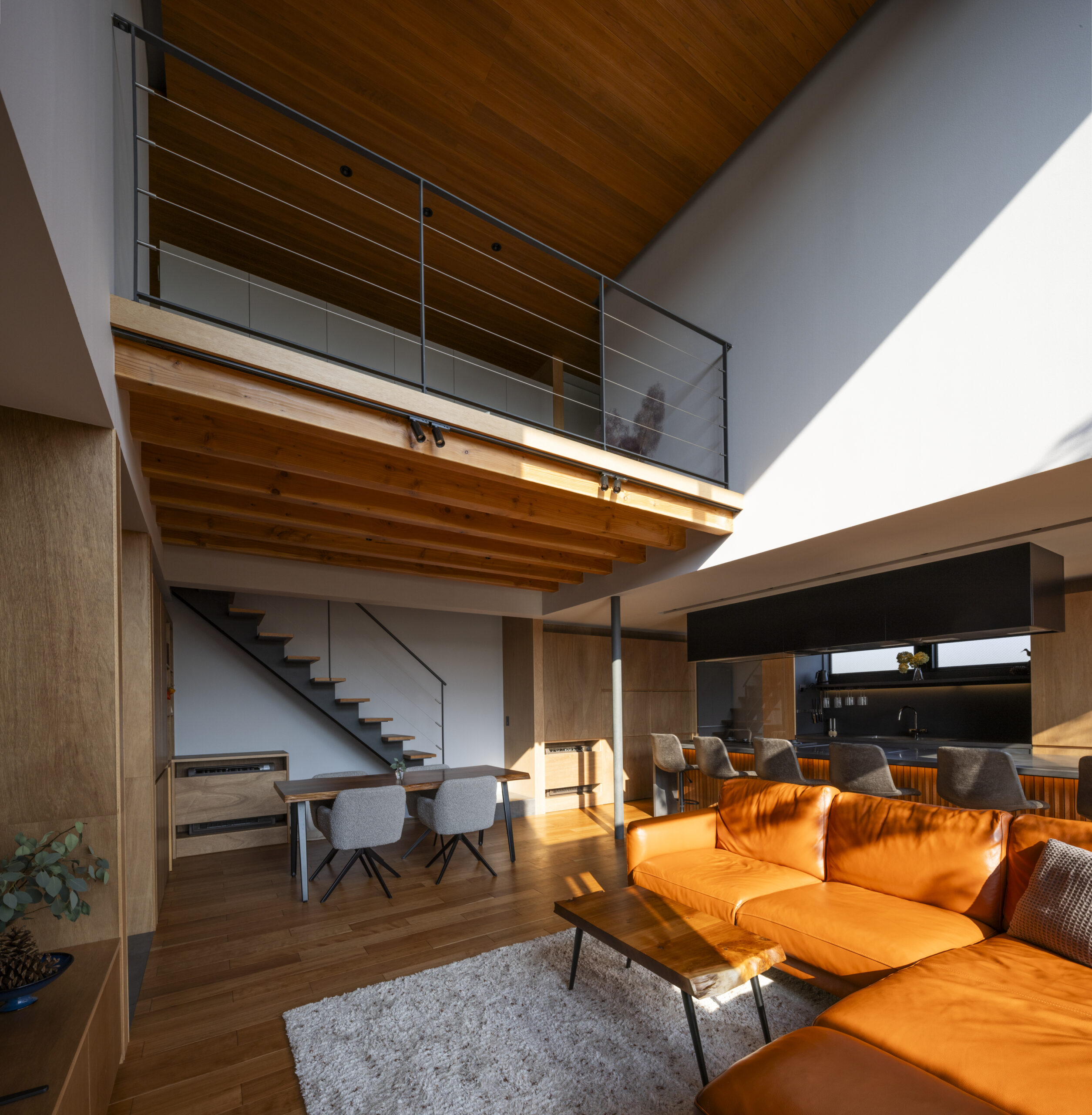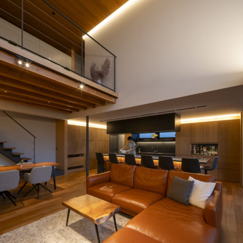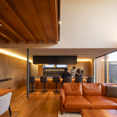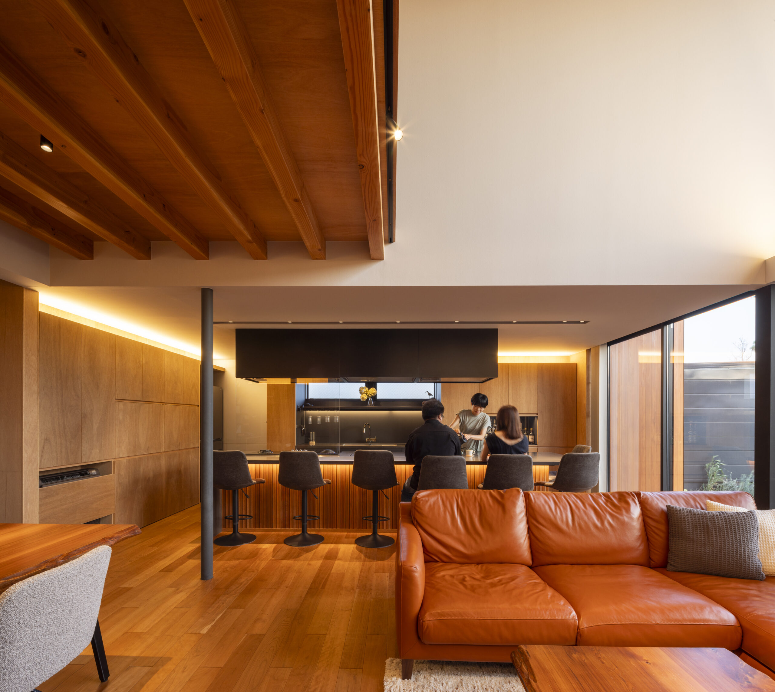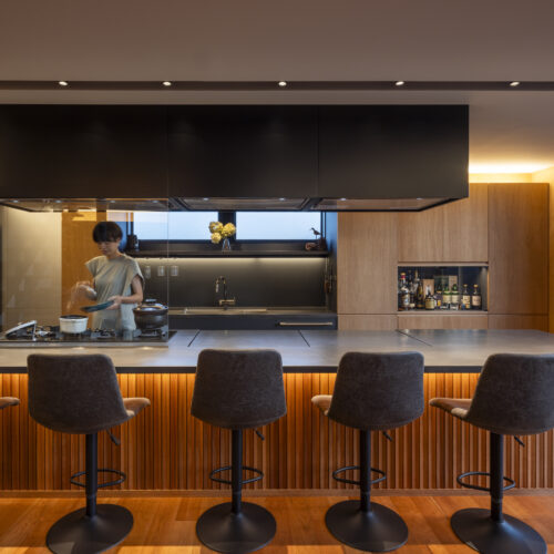 親族や友人たちが集まれる家にしたいという要望から、鉄板焼き機が組み込まれた約4mのカウンターキッチンをリビングの中心に設け、趣味の料理を皆に振る舞えるようにした。
