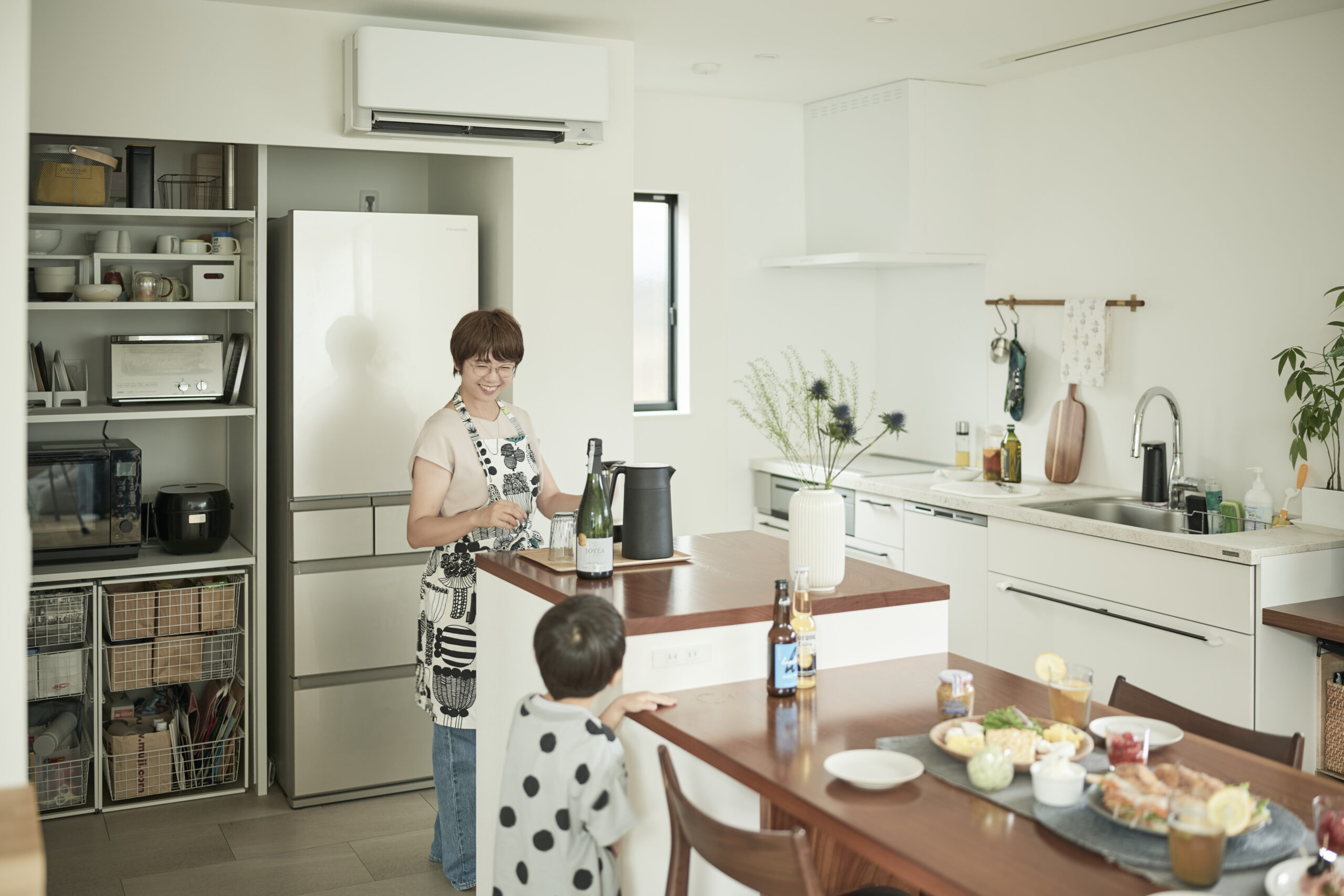 テーブルを囲むように、キッチン、家電、パントリーなどを配置。家事をするのが『お母さん』だけではなく、家族で役割分担をしながら支度するイメージは正にクライアントの理想でした。