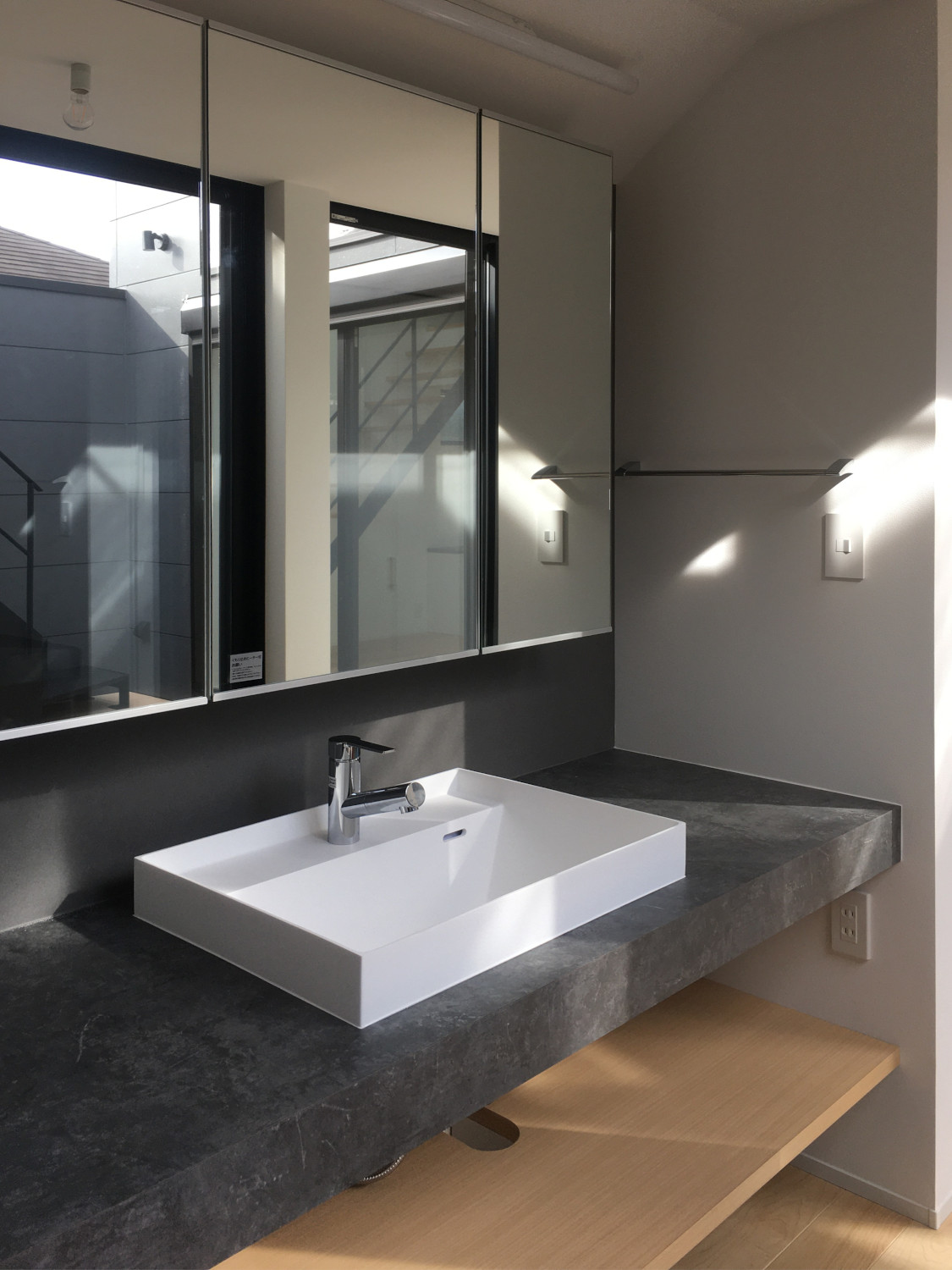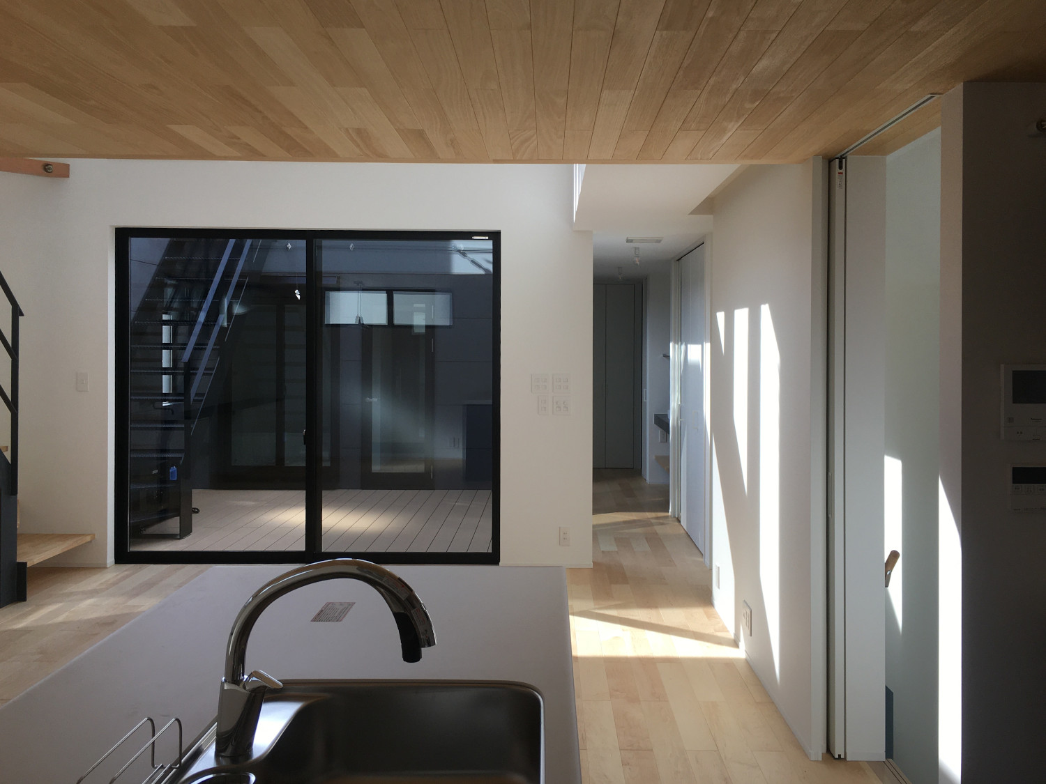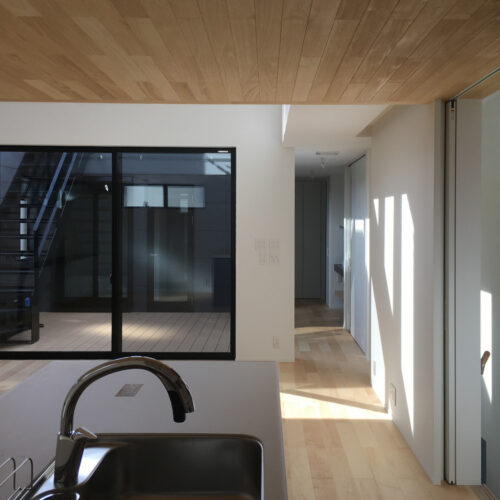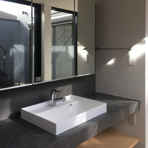 都心の閑静な住宅街での専用住宅の計画。中庭を活用して内側に最大限広がりをもたせたプランニングとしました。プライバシーを確保した上で、サウナ、水風呂、外気浴を楽しむことが出来ます。1階はギャラリー利用を見据えて、自由度の高い間取りとしています。