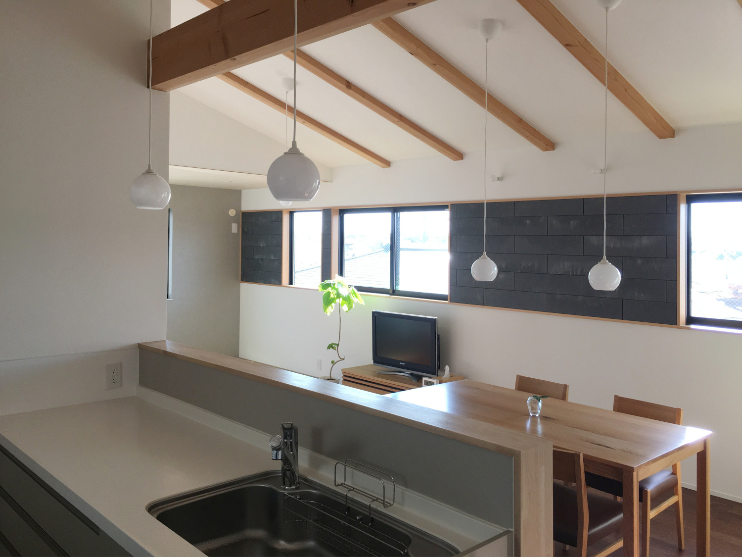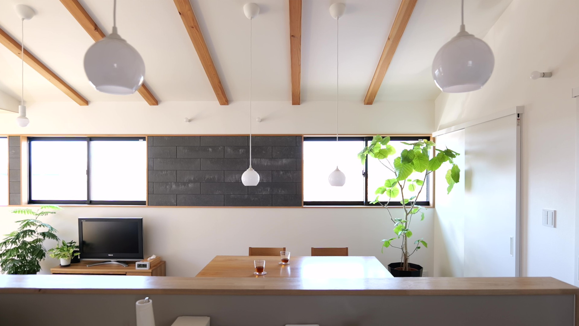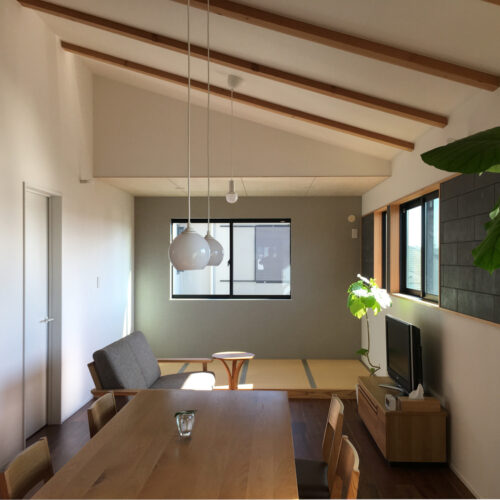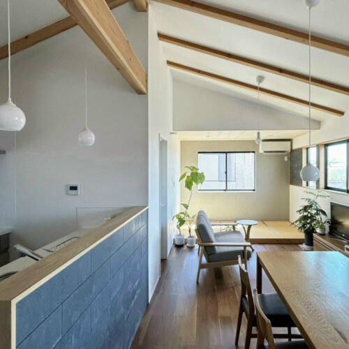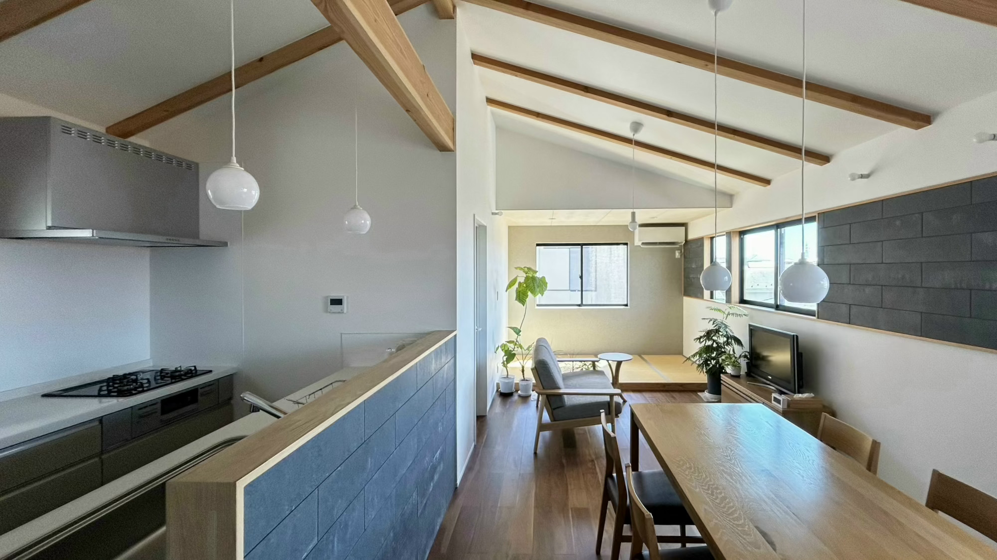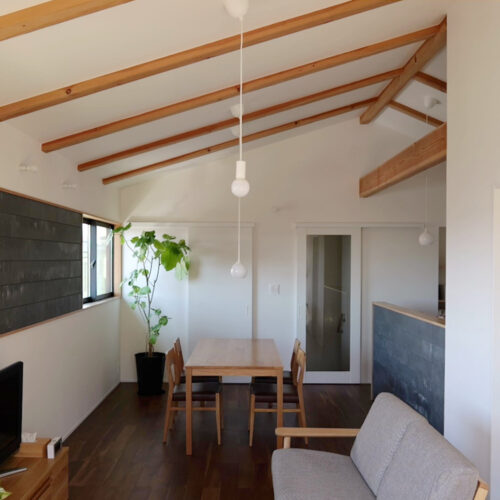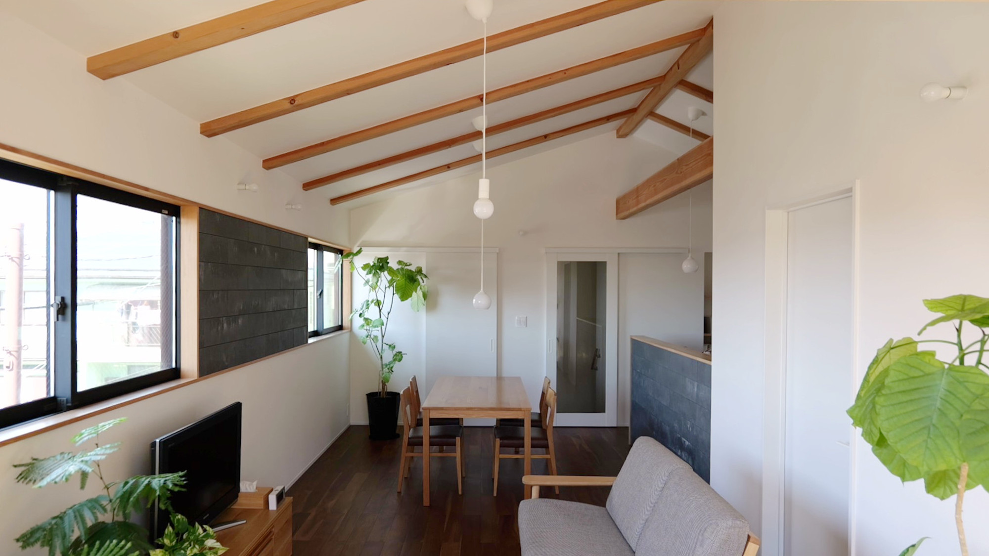 眺望とあわせてLDKはワンルームで梁をあらわしとした勾配天井とすることで、木の温かみとくつろぎを感じれられる空間に仕上げています。