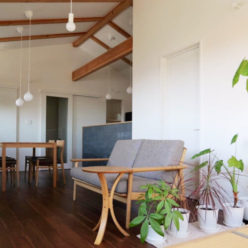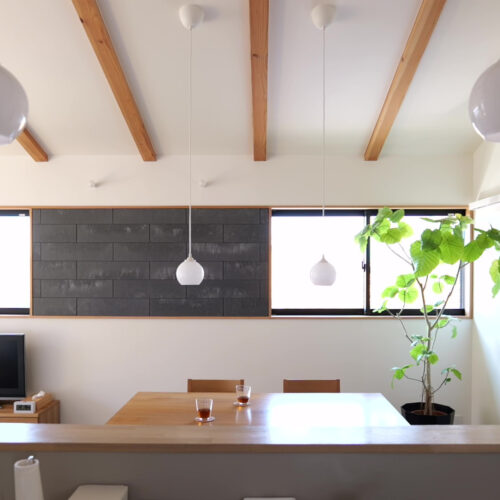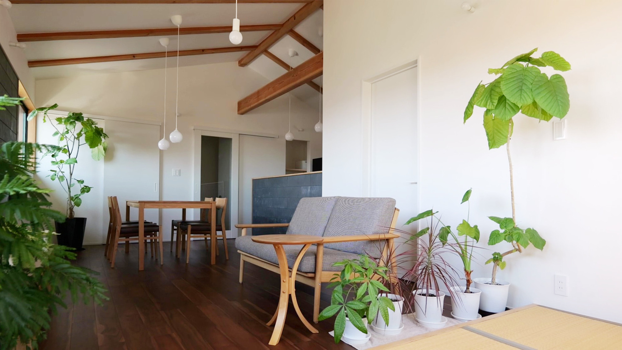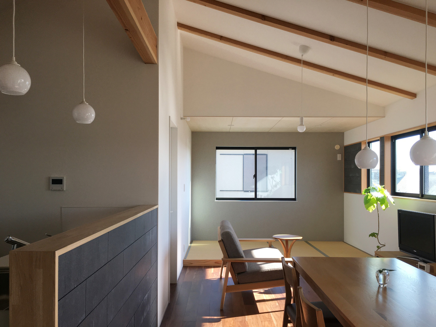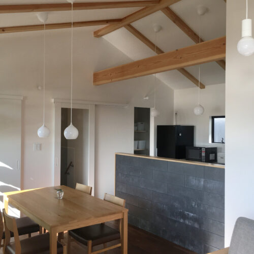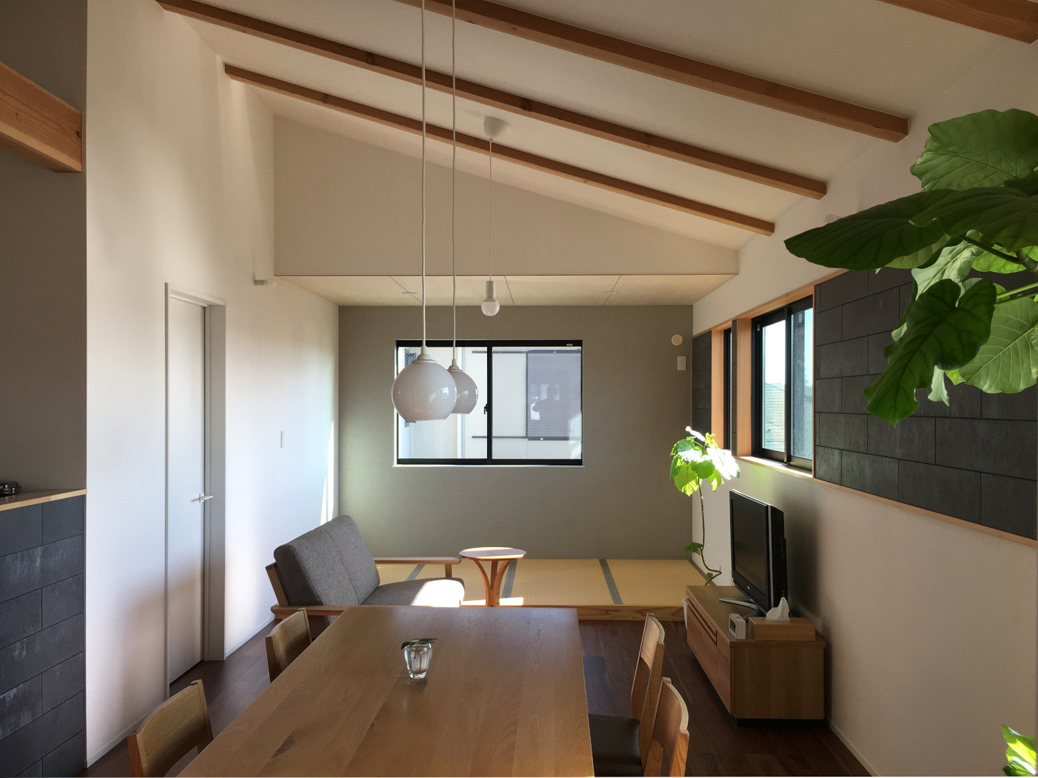 眺望とあわせてLDKはワンルームで梁をあらわしとした勾配天井とすることで、木の温かみとくつろぎを感じれられる空間に仕上げています。
