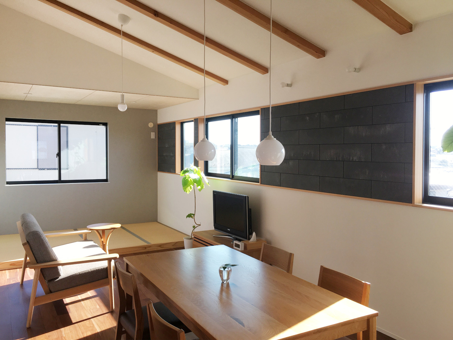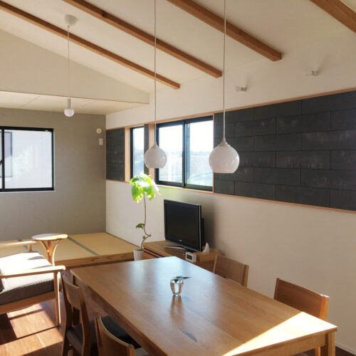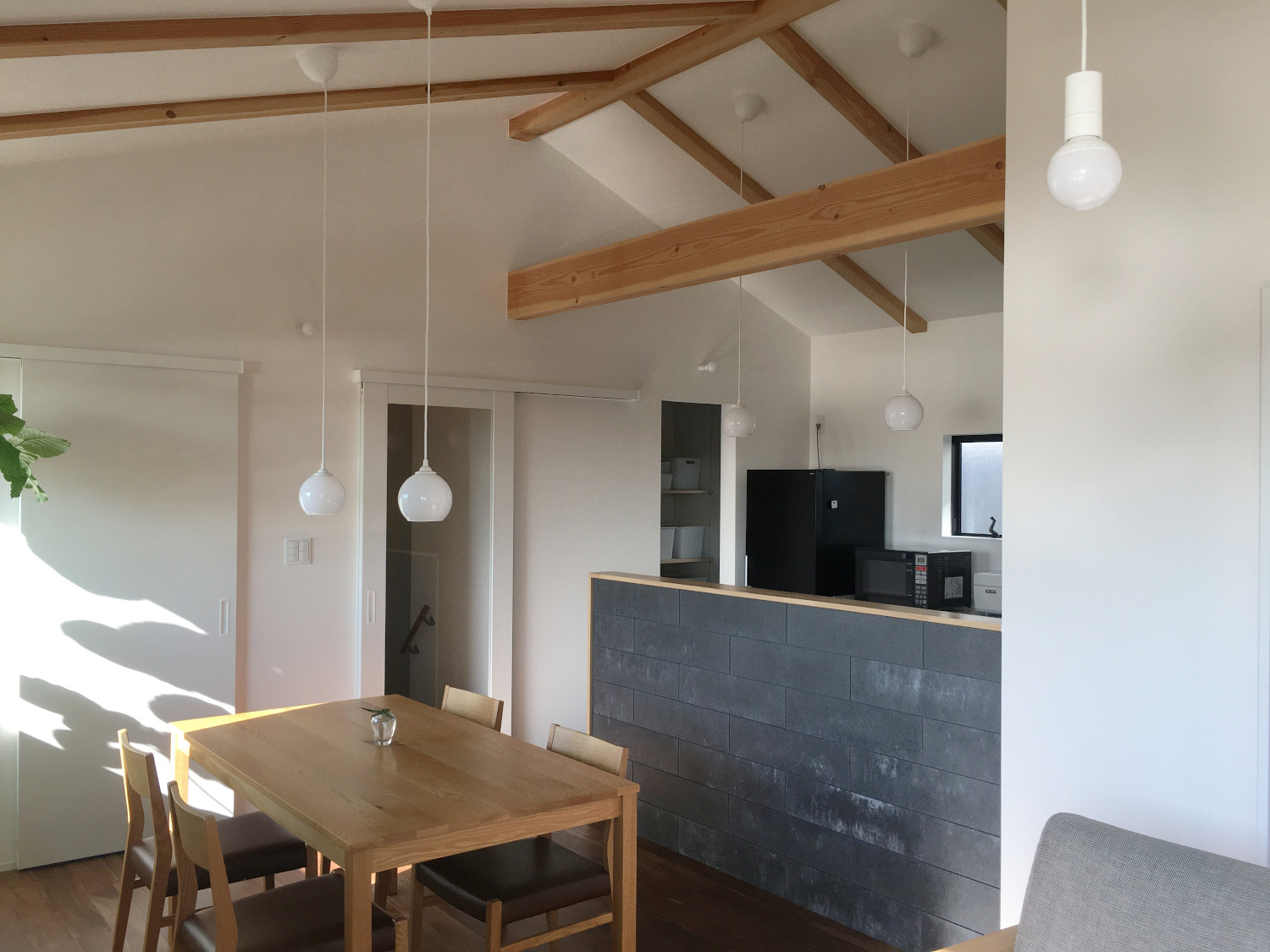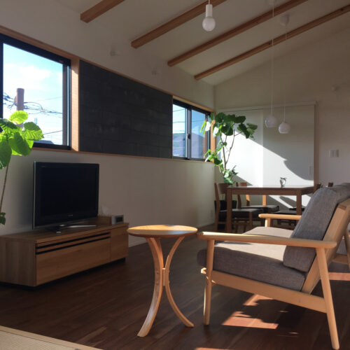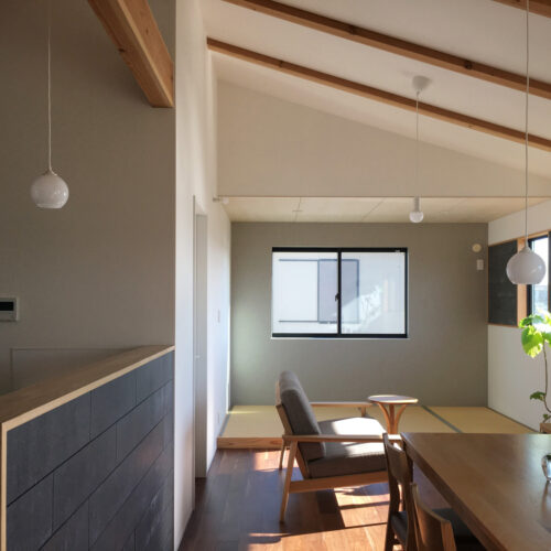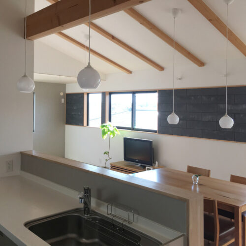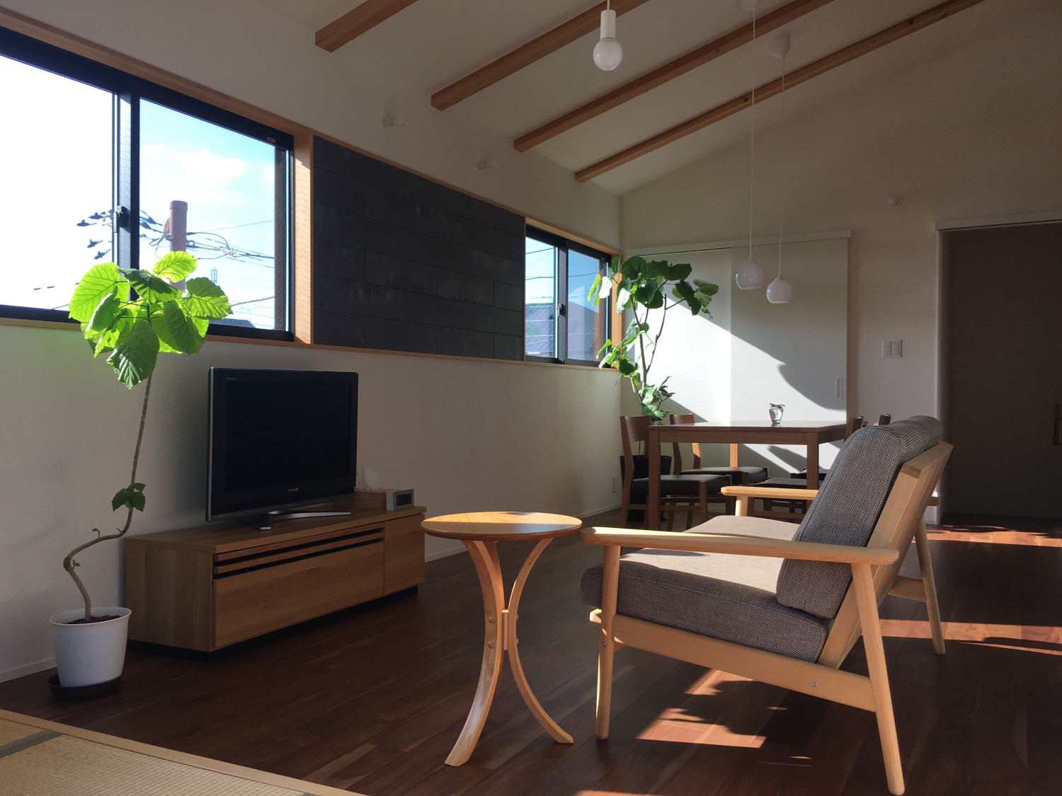 眺望とあわせてLDKはワンルームで梁をあらわしとした勾配天井とすることで、木の温かみとくつろぎを感じれられる空間に仕上げています。