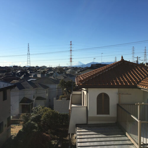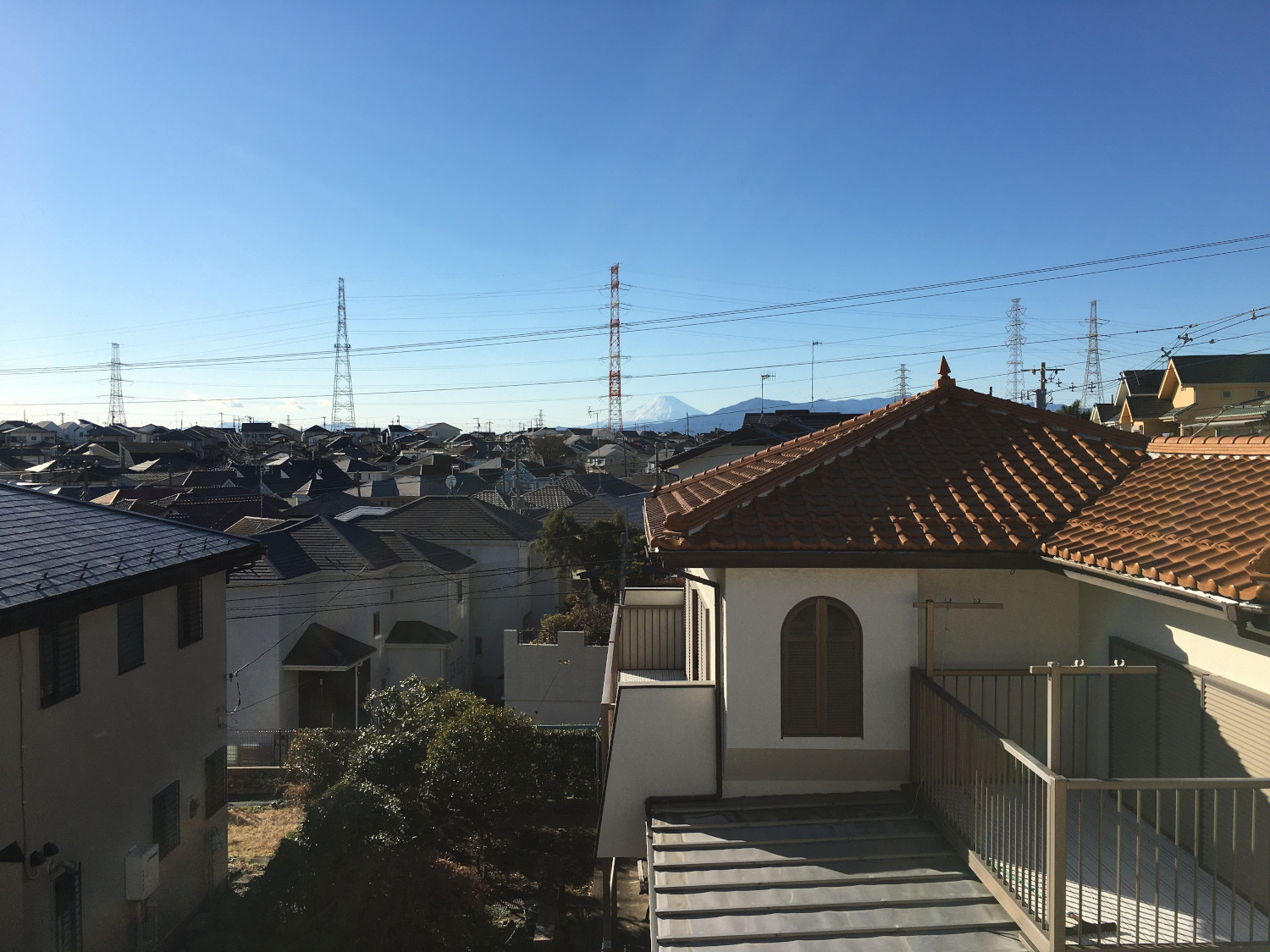 東側は隣家が接近して建っていますが、西側は隣家までの距離が保たれ地形が下っている為、2階レベルでは遠くに大山と富士山の山景が望める魅力的な環境でした。