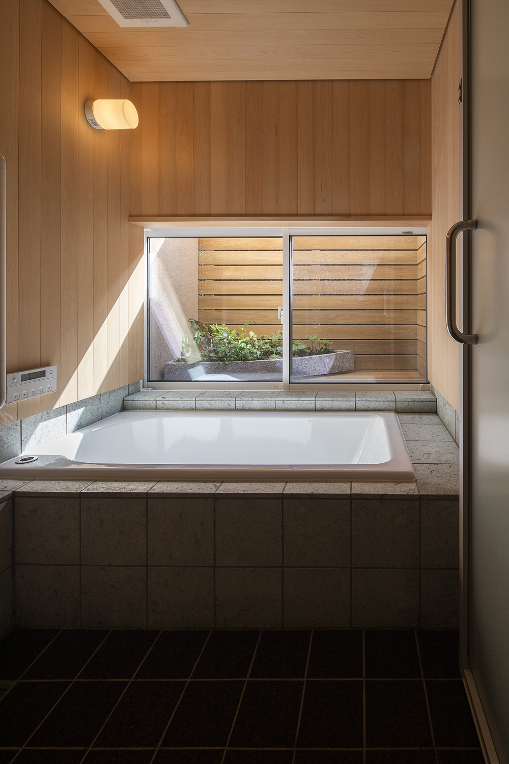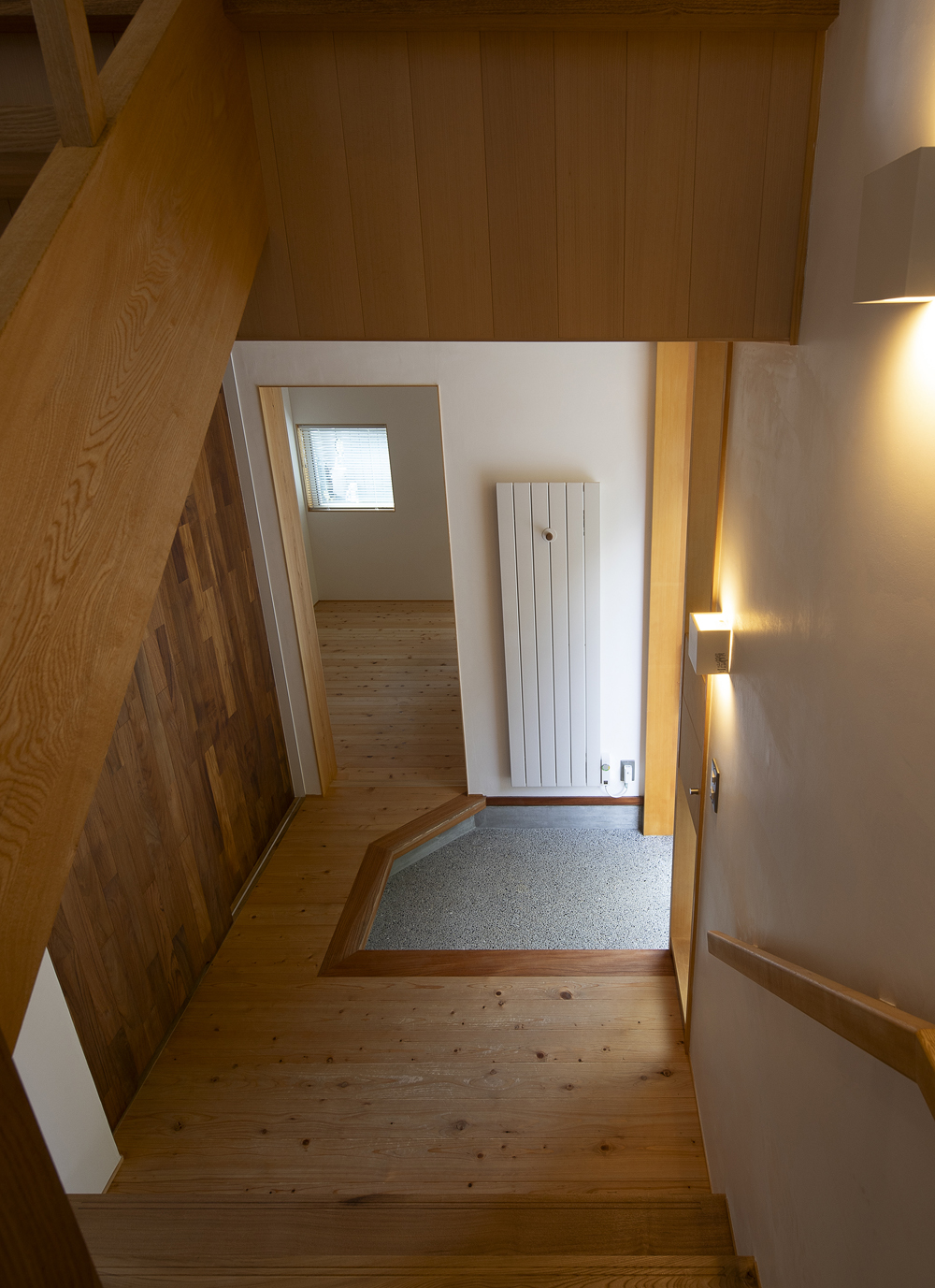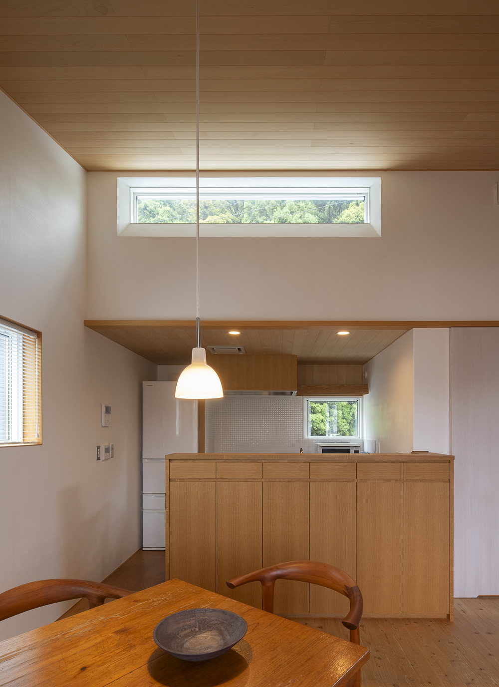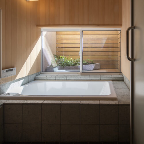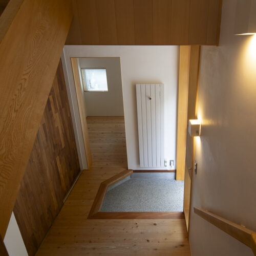 18年来の付き合いがある大工さんの自邸であり、子育てを終えた50代のご夫婦が愛犬とともに、時折80代のお母さまを迎えて暮らす住まいです。敷地は息子さん家族の隣に位置し、里山に囲まれた穏やかな環境の中、駐車スペースは息子さんの敷地と共有して5台分を確保しています。2階には最も居心地のよい場所にインナーバルコニーを設け、その周囲を家族室が囲むように配置。1階には個室やサニタリーをまとめています。仕上げ材には、天井に青森ヒバ、壁に漆喰、床にサワラを使用。バスコートを備えた浴室には青森ヒバを主材とし、腰壁には十和田石を採用しました。若い頃に自ら製作したダイニングテーブルで家族と囲む食卓、そして灯りを落とし、バスコートの光だけで湯に浸かる時間が、ご主人の日々の楽しみになっているそうです。