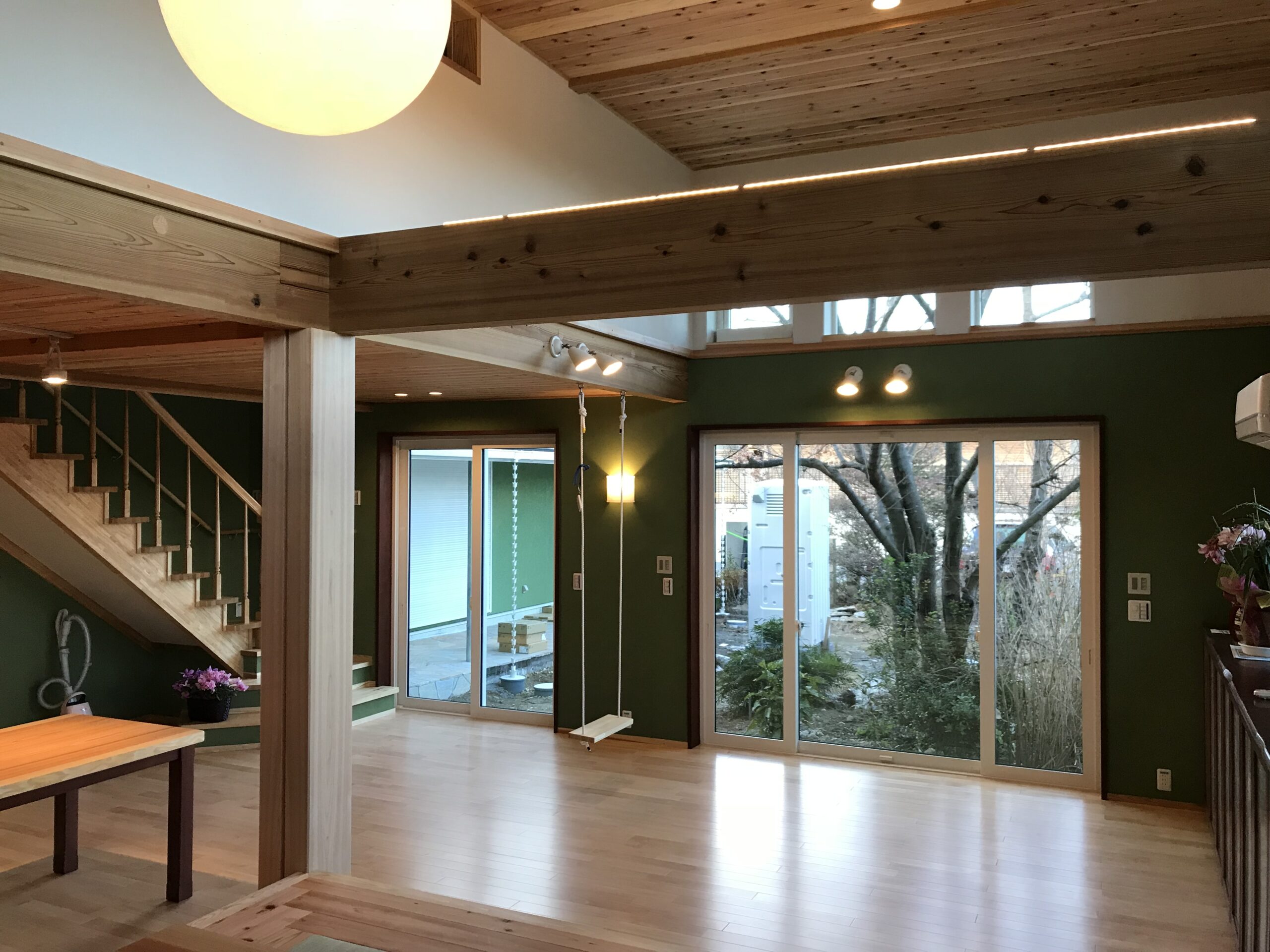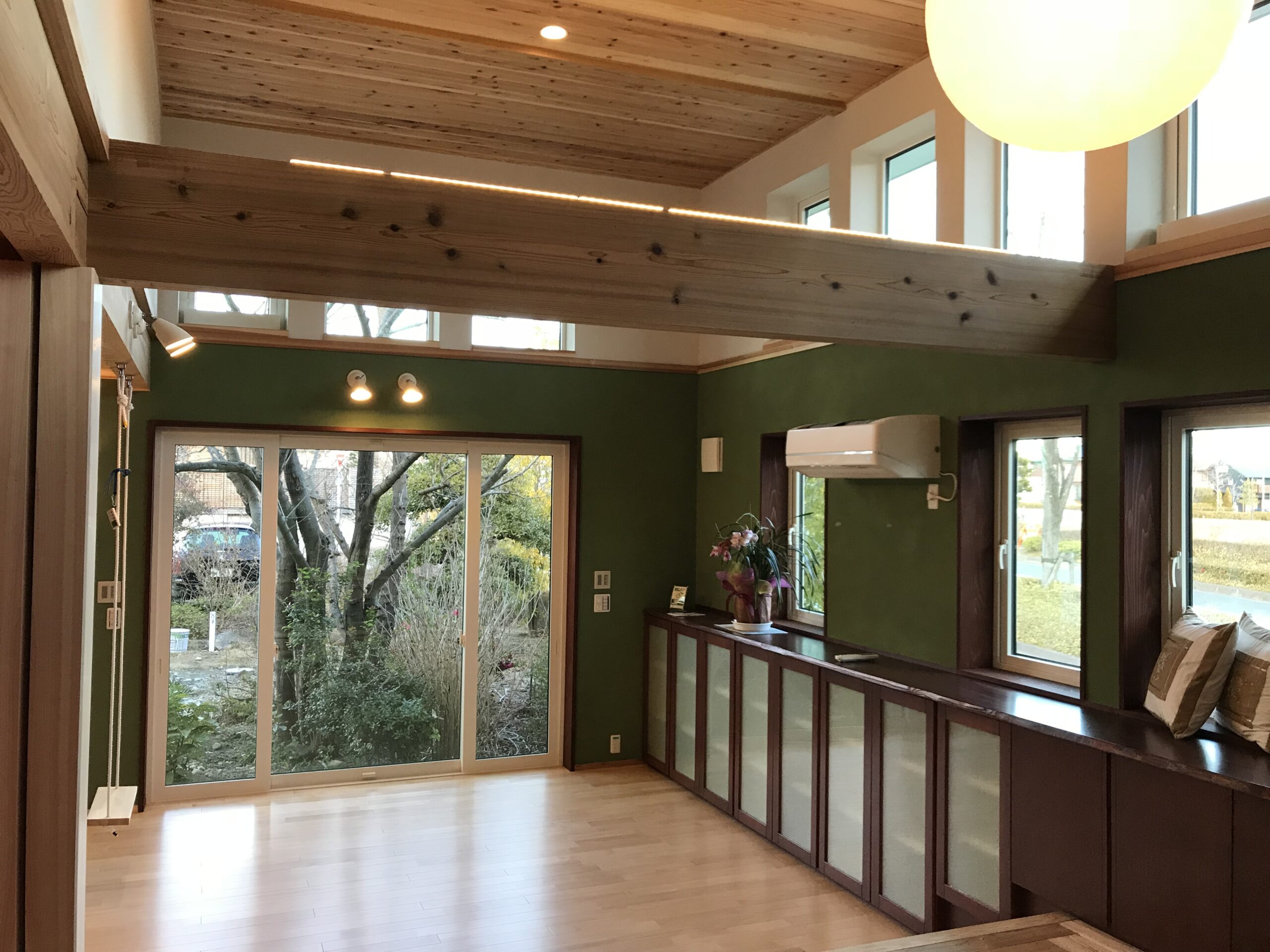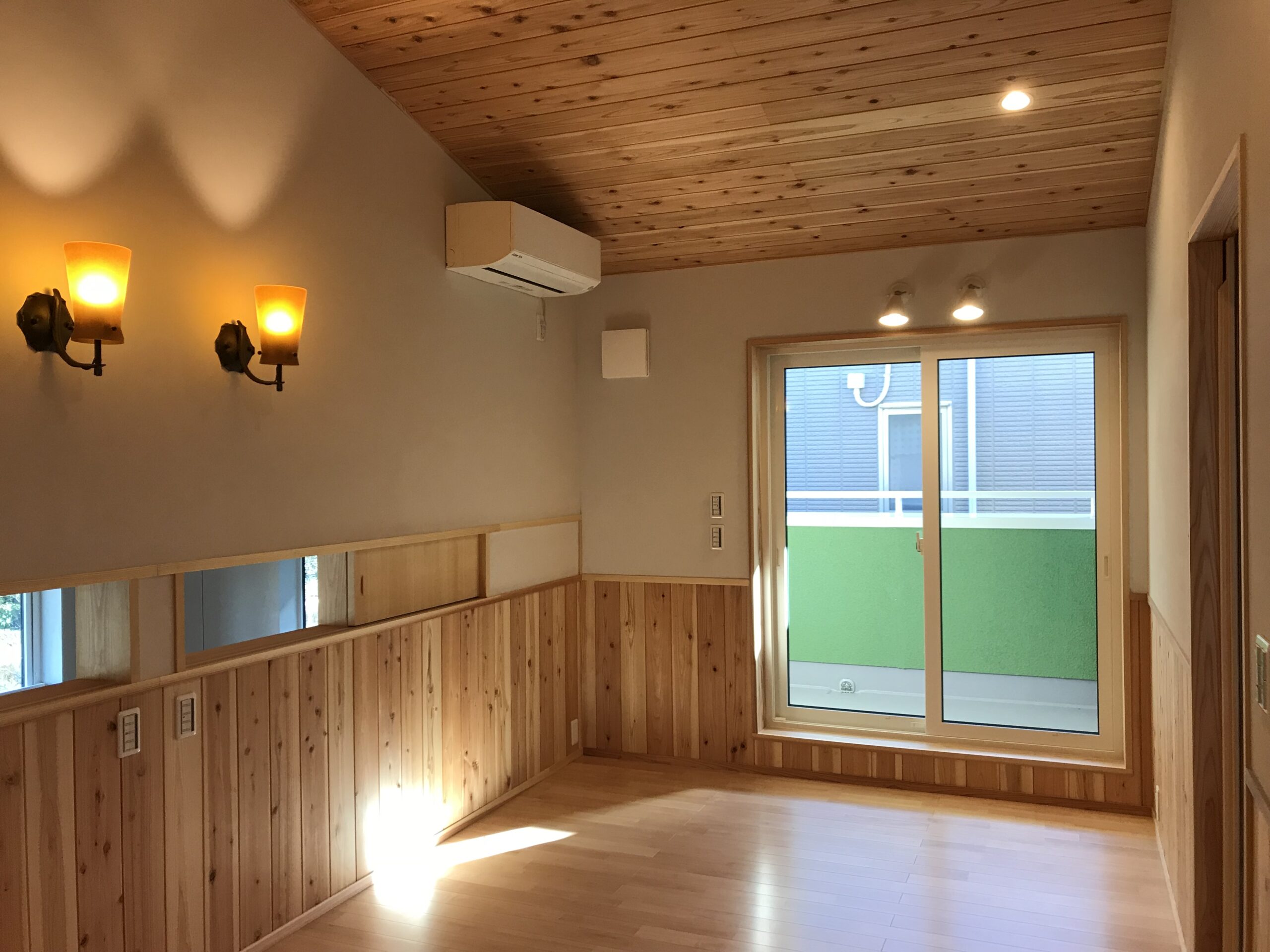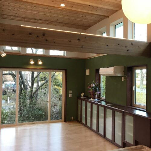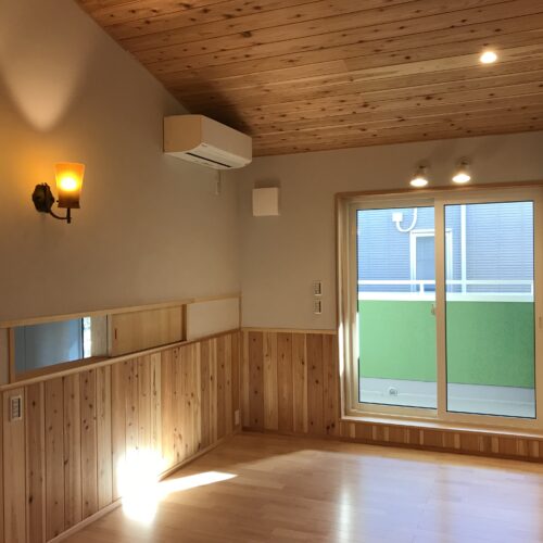室内はじゅらく壁と白州壁、天竜杉を使い、敷炭を施した床下をチャンバーとし、室内の空気を循環させながら一台のルームエアコンで家全体を空調している。