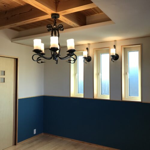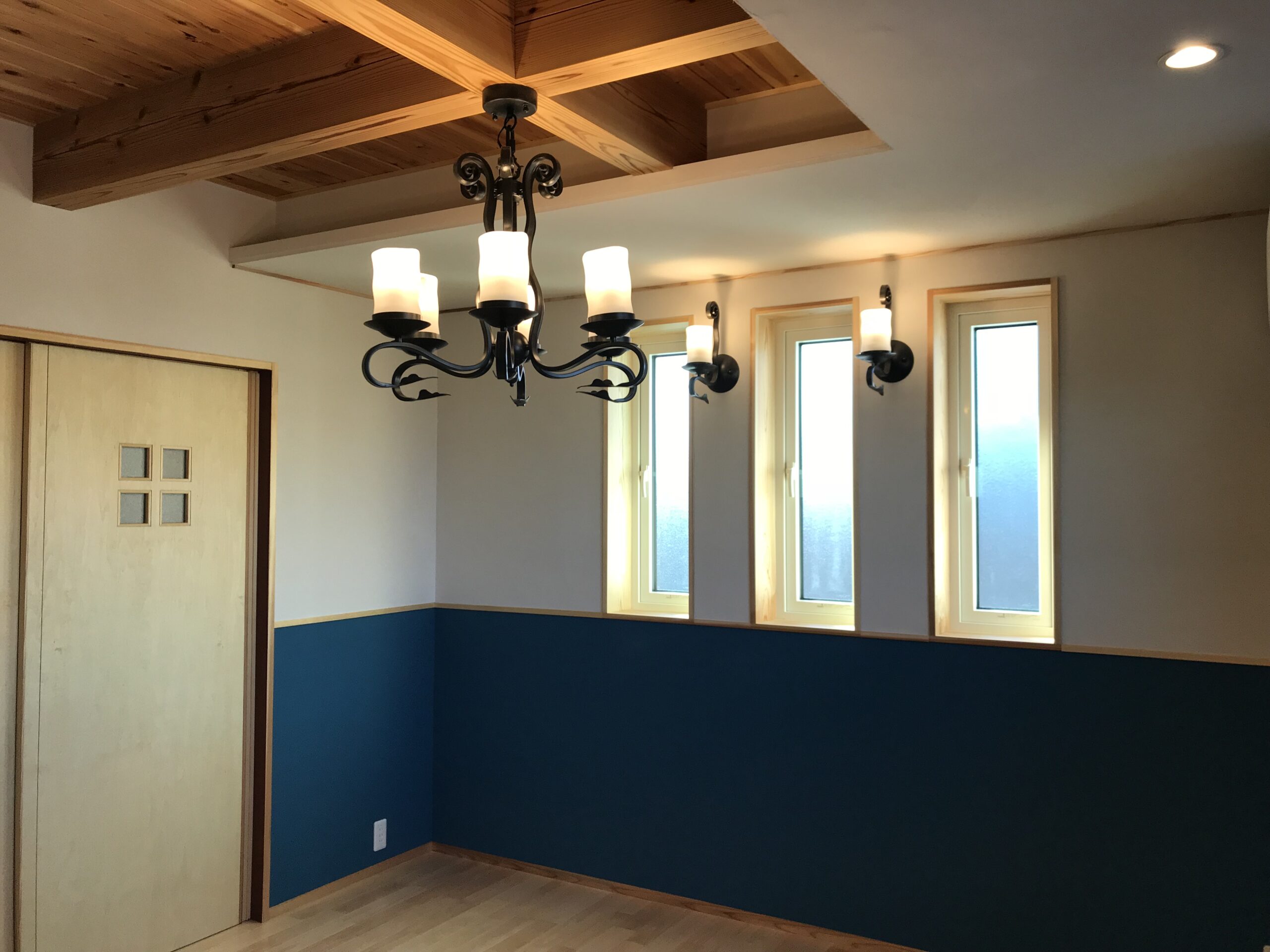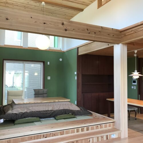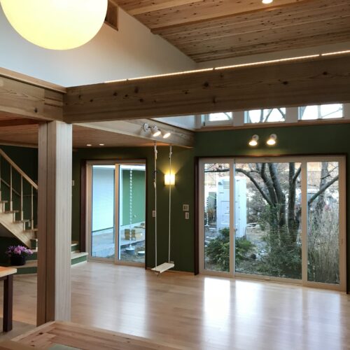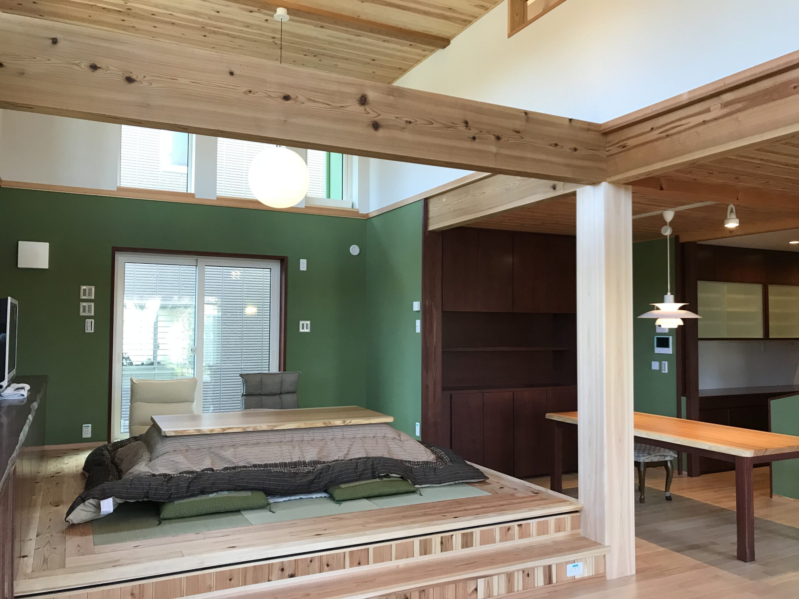 室内はじゅらく壁と白州壁、天竜杉を使い、敷炭を施した床下をチャンバーとし、室内の空気を循環させながら一台のルームエアコンで家全体を空調している。