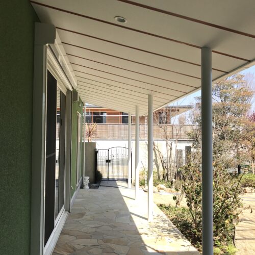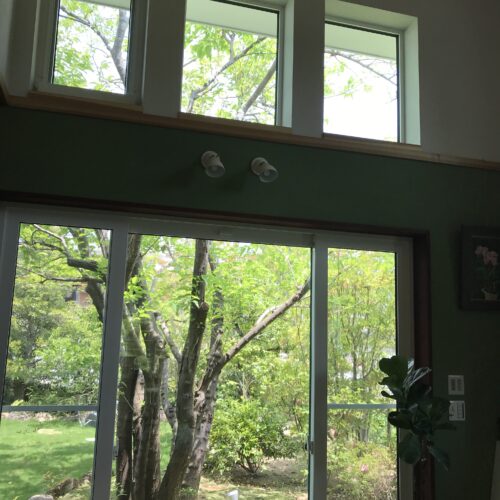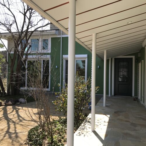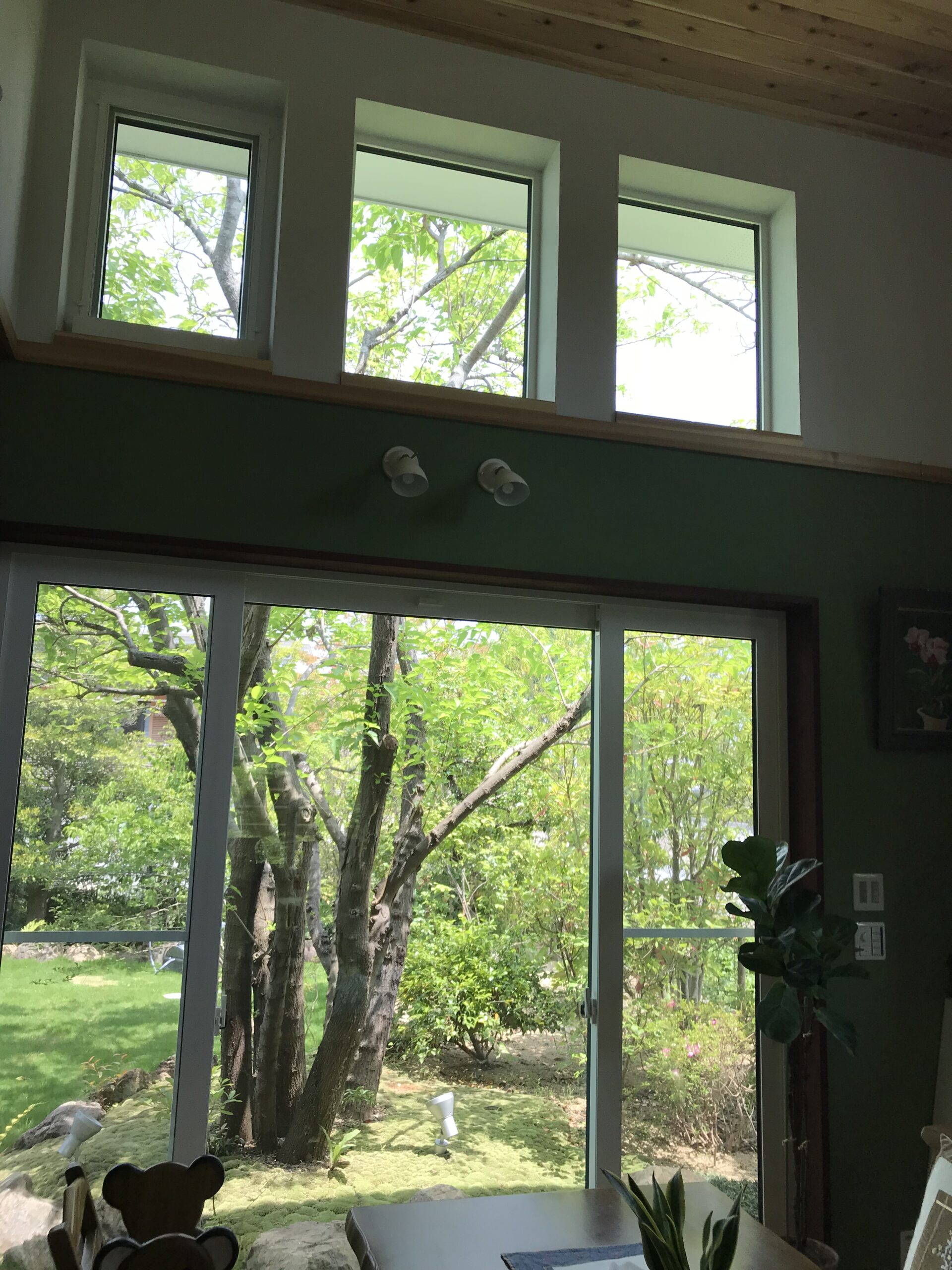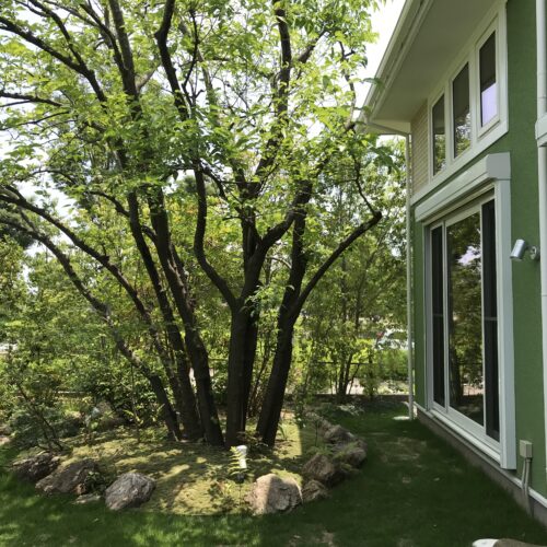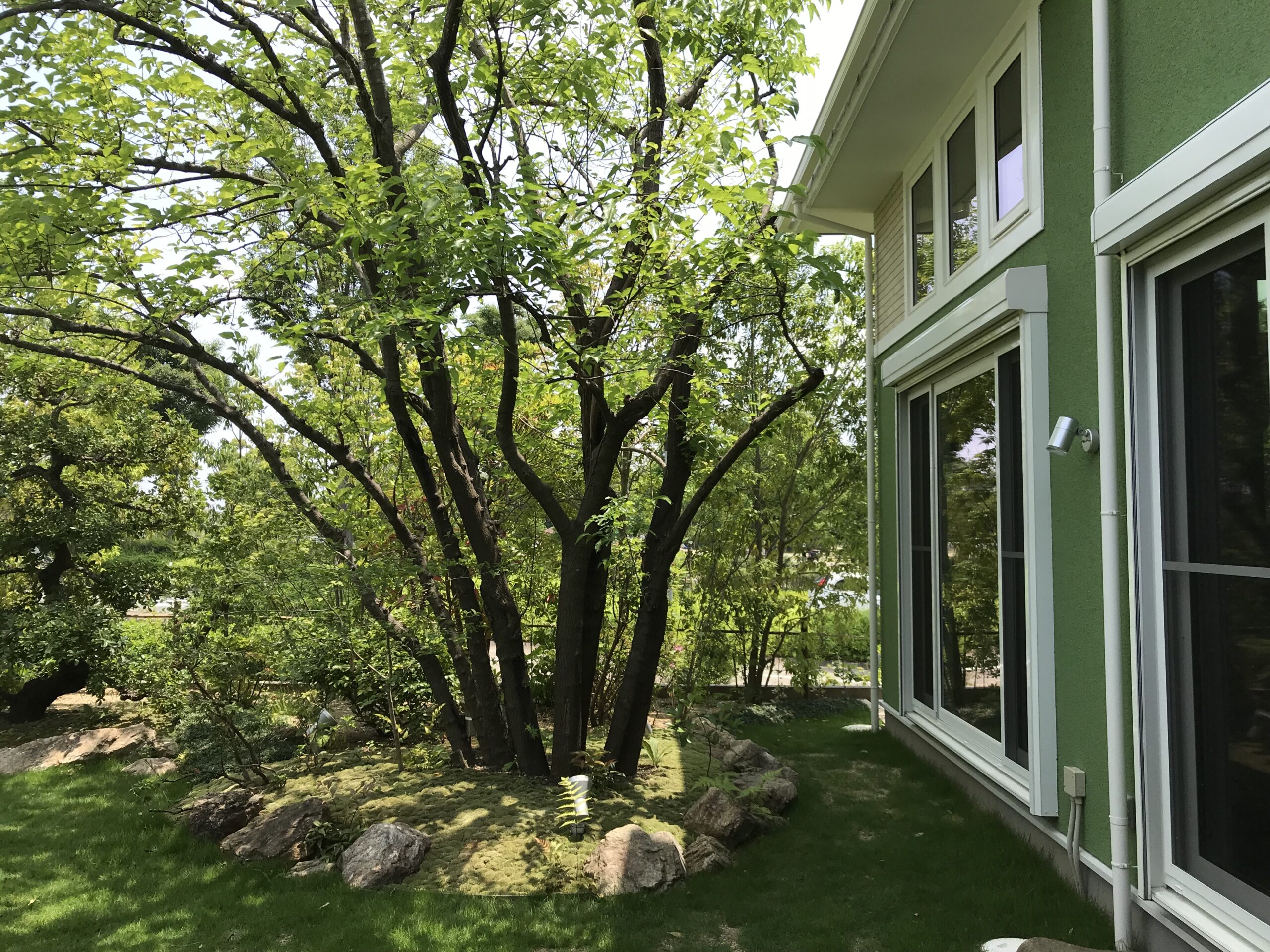 太陽に向かい成長した樹木は南側から見た方が美しい。忙しくて働いてきたご夫婦が、ゆっくりと過ごす住処として建築。庭の景観を楽しむ空間としている。