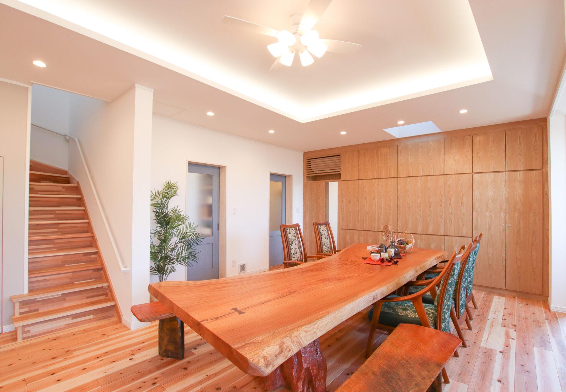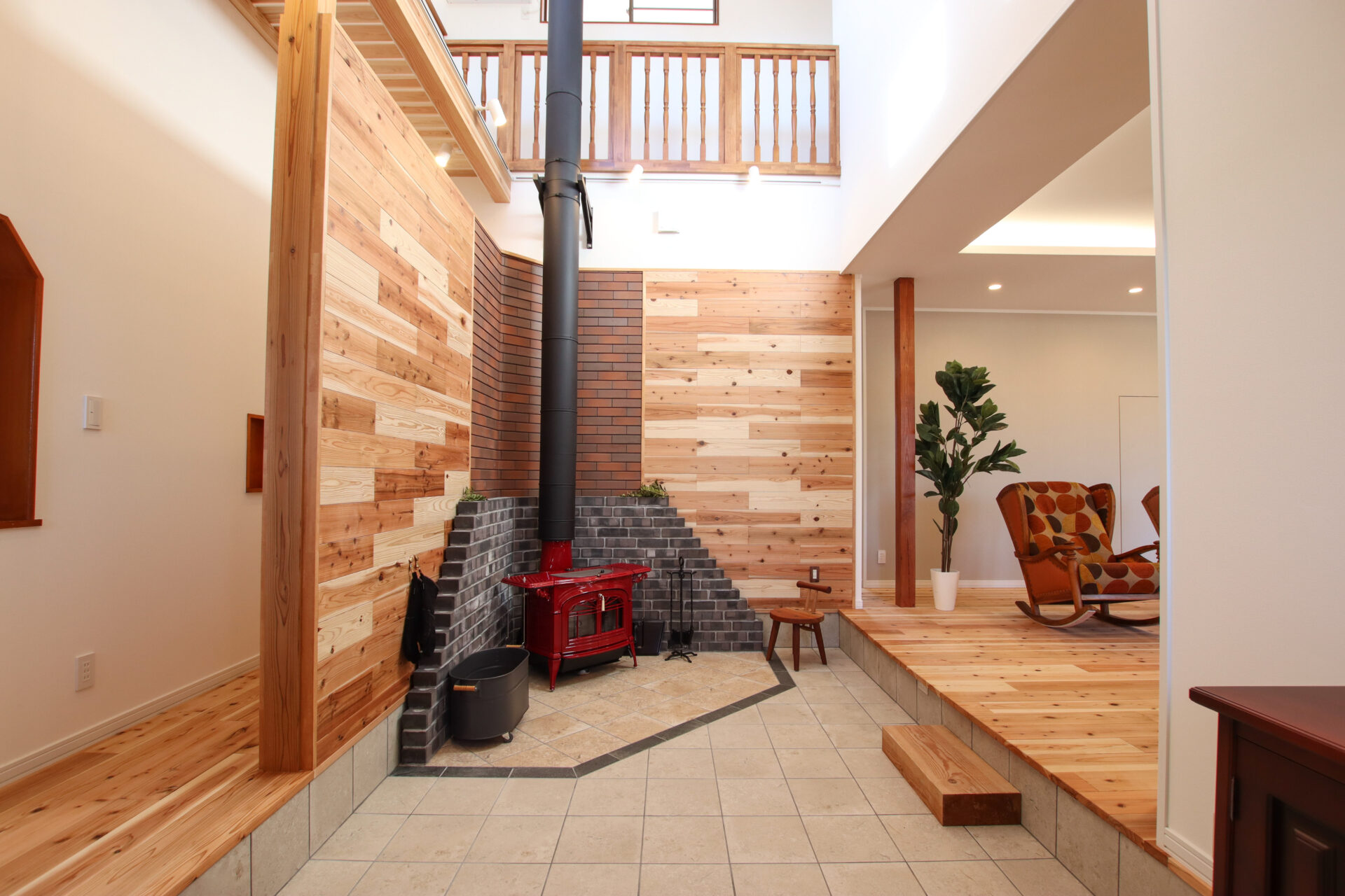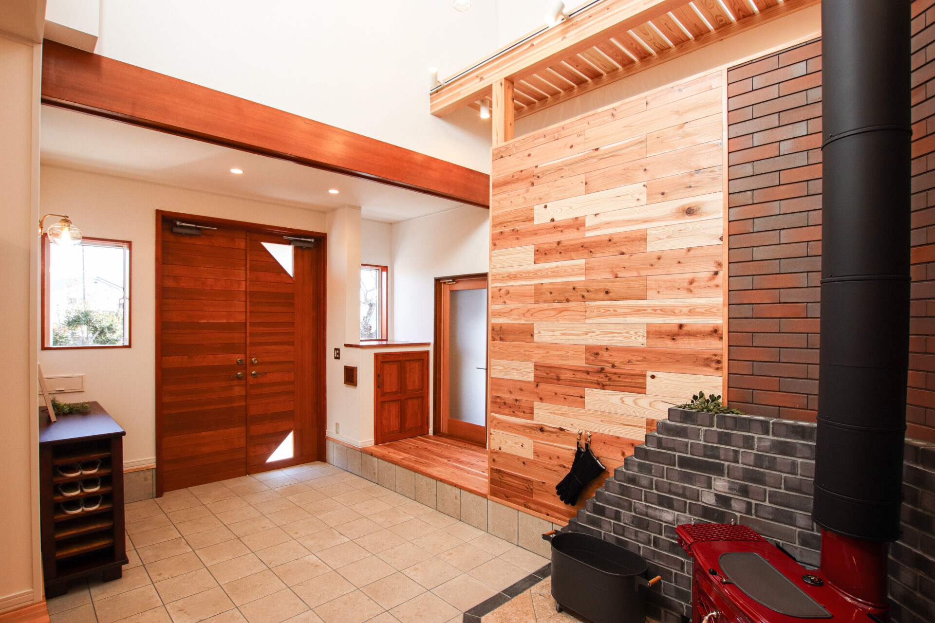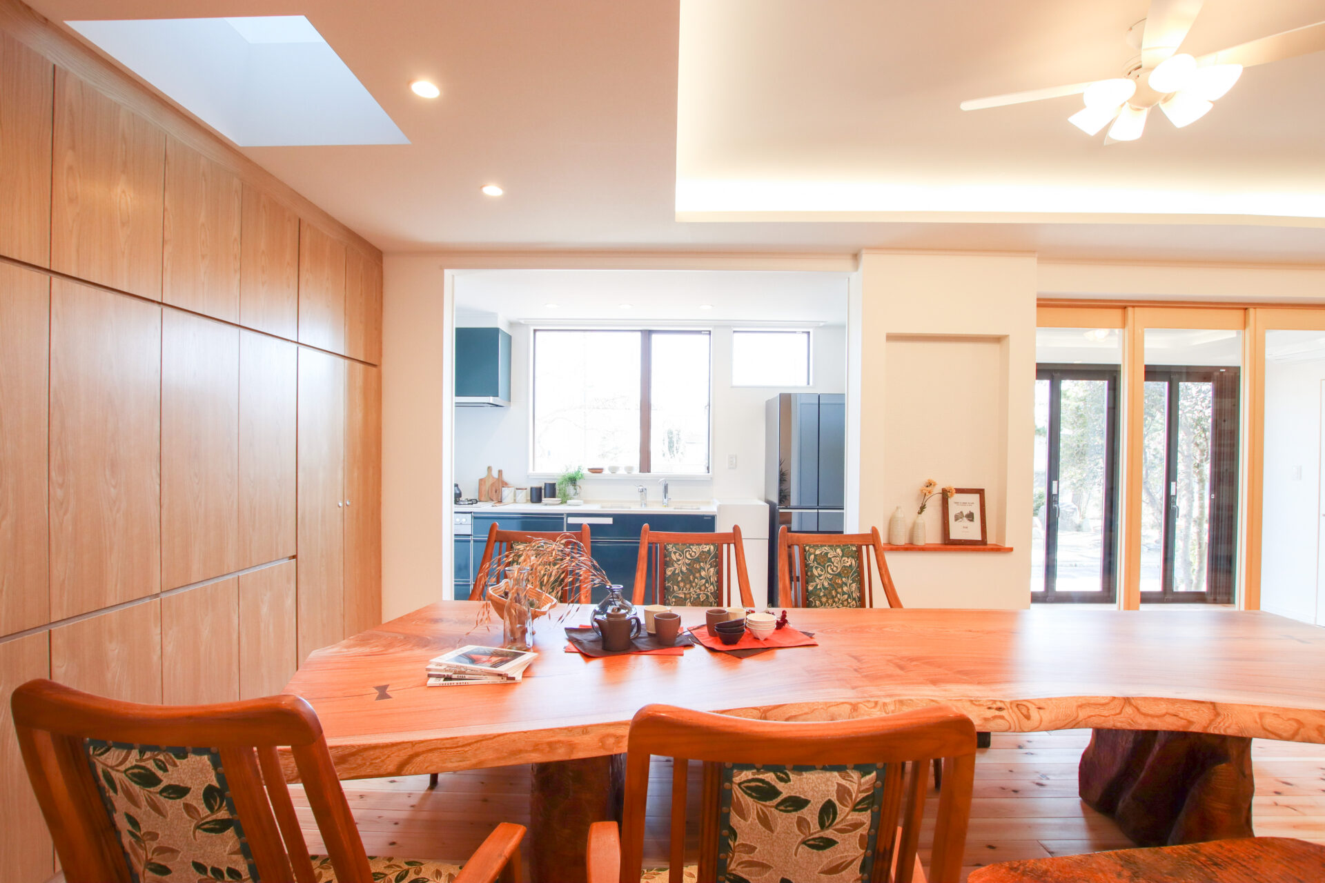 「この一枚板のテーブルに似合う家にしてほしい。」 このご要望から計画はスタートしました。 リビングとダイニングが分かれ、中廊下型だった間取りを一新し、LDK はワンルームに。 中廊下は無くなり、階段やトイレに代わりました。 階段を移設したことによって生まれた玄関スペースは、土間空間とし薪ストーブを設置しました。 同じ家での新たな暮らし方を実現したデザインです。