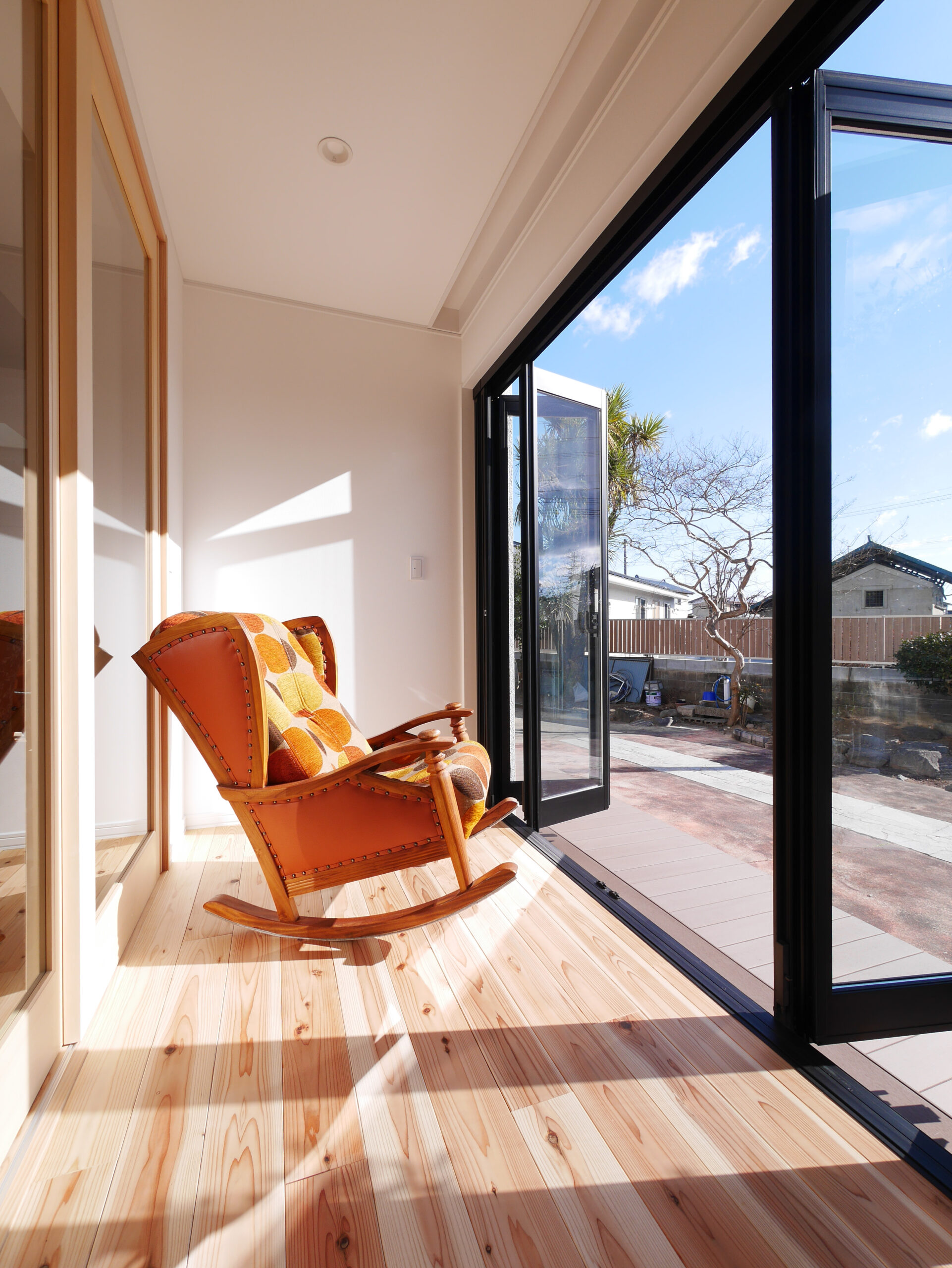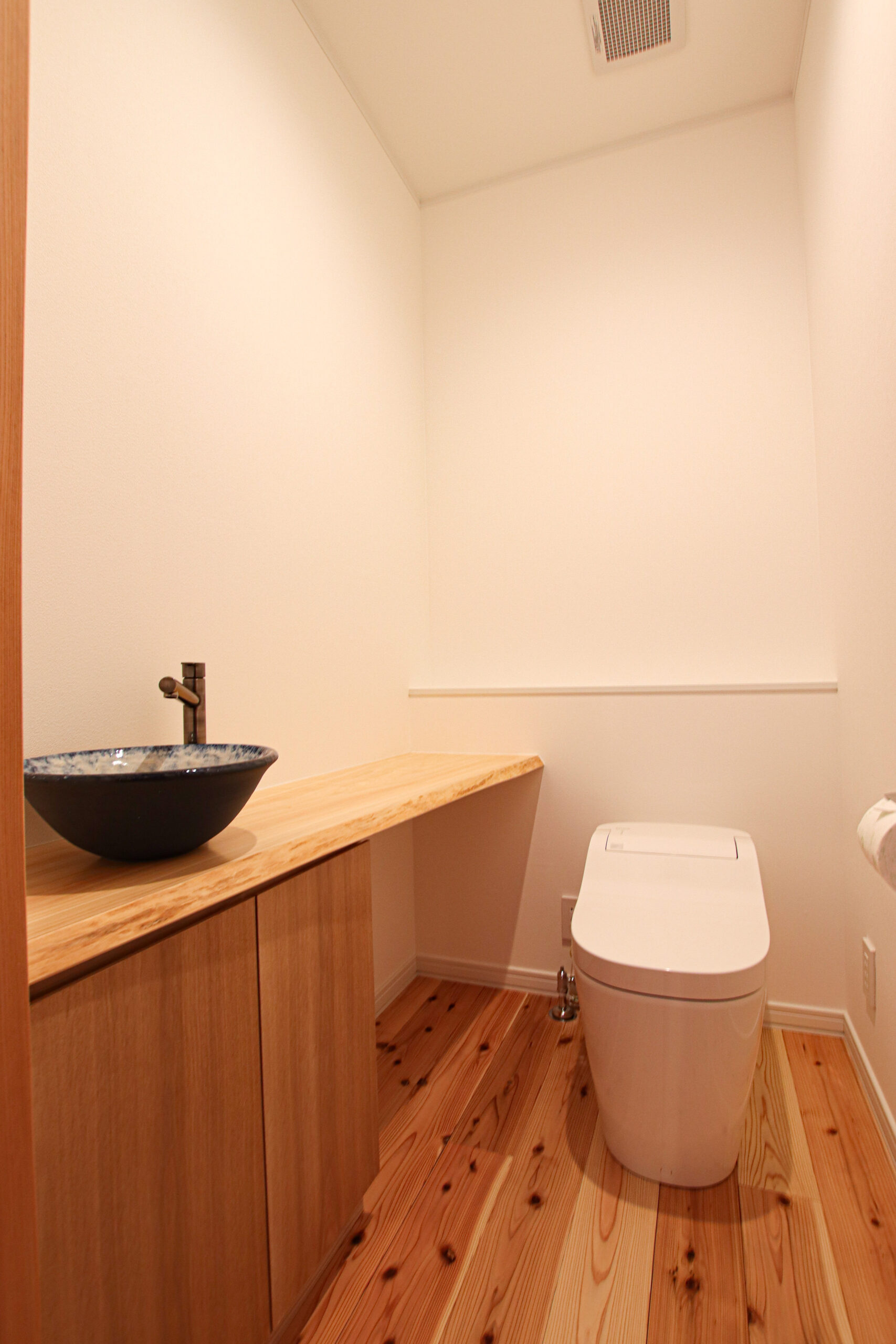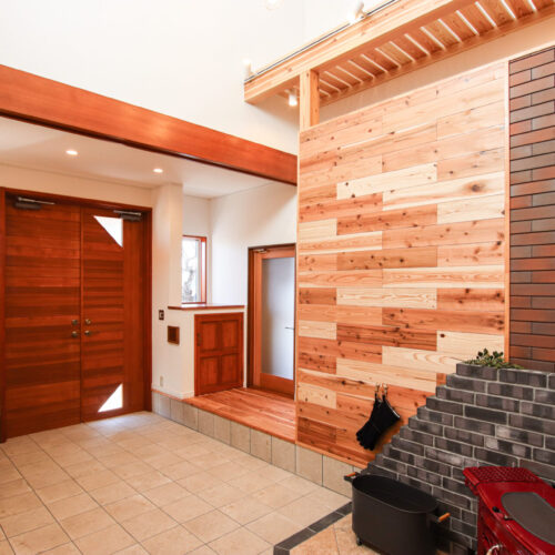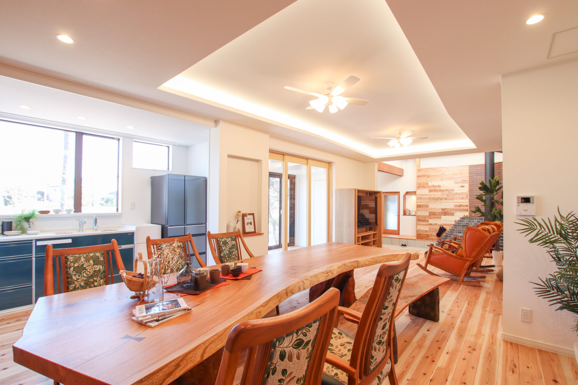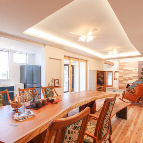 「この一枚板のテーブルに似合う家にしてほしい。」 このご要望から計画はスタートしました。 リビングとダイニングが分かれ、中廊下型だった間取りを一新し、LDK はワンルームに。 中廊下は無くなり、階段やトイレに代わりました。 階段を移設したことによって生まれた玄関スペースは、土間空間とし薪ストーブを設置しました。 同じ家での新たな暮らし方を実現したデザインです。