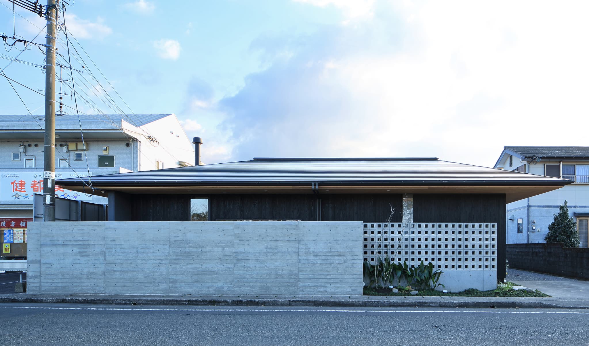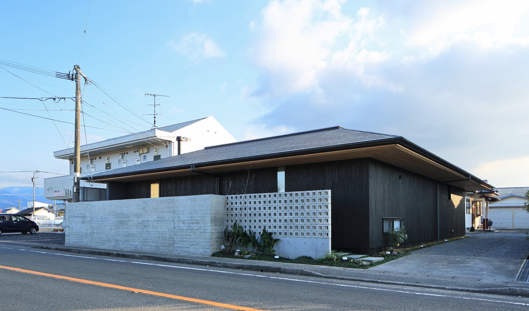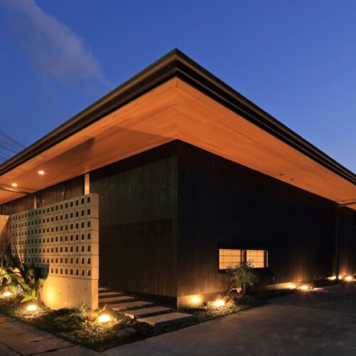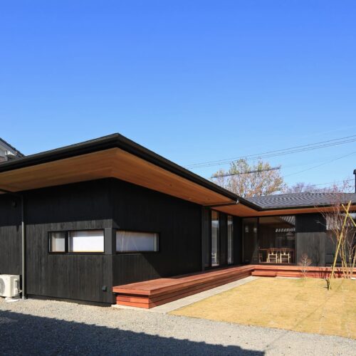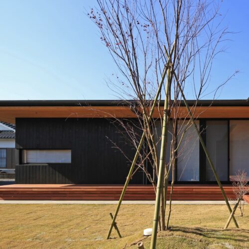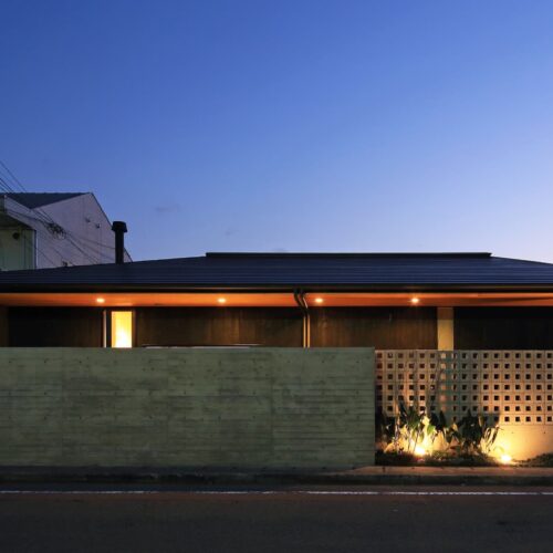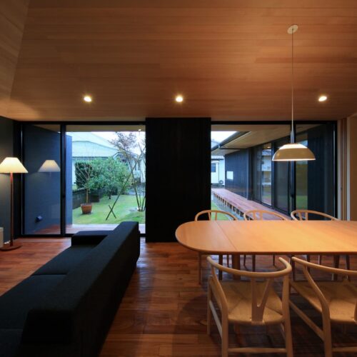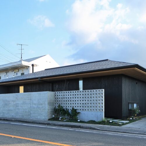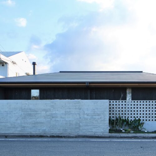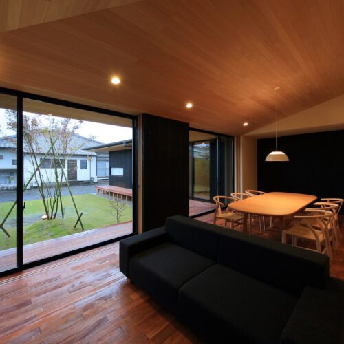 都城市の中⼼部から⾞で10分程度の住宅地に位置する住宅。前⾯道路からは閉鎖的であ