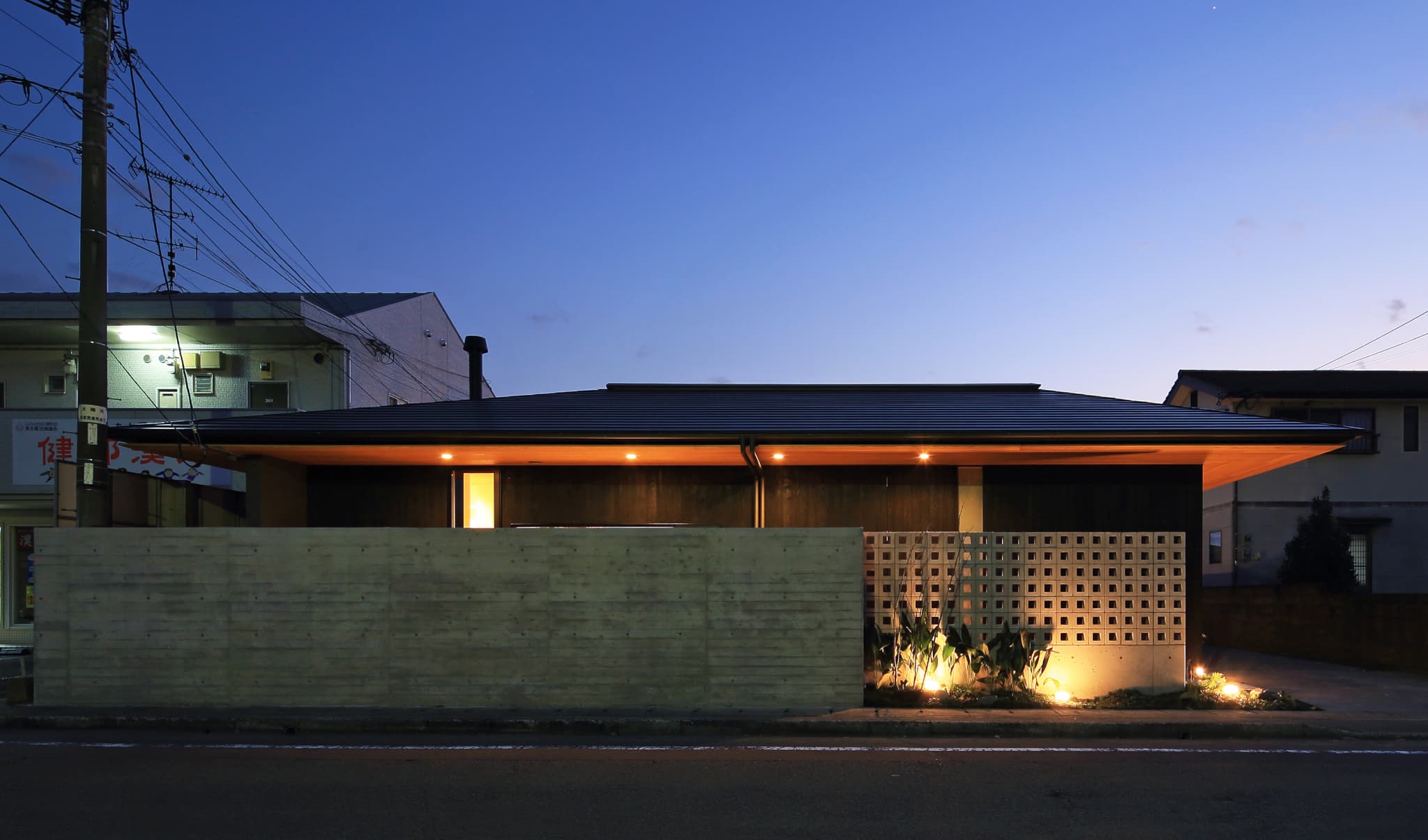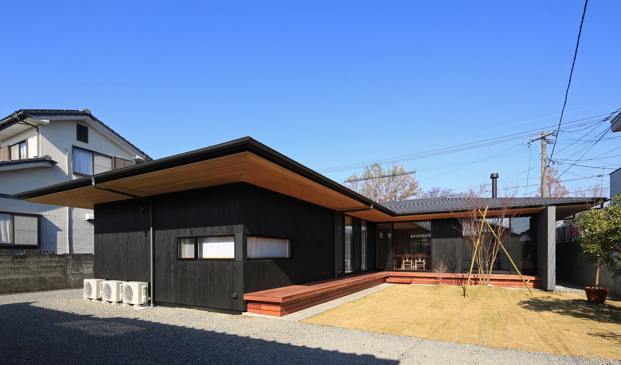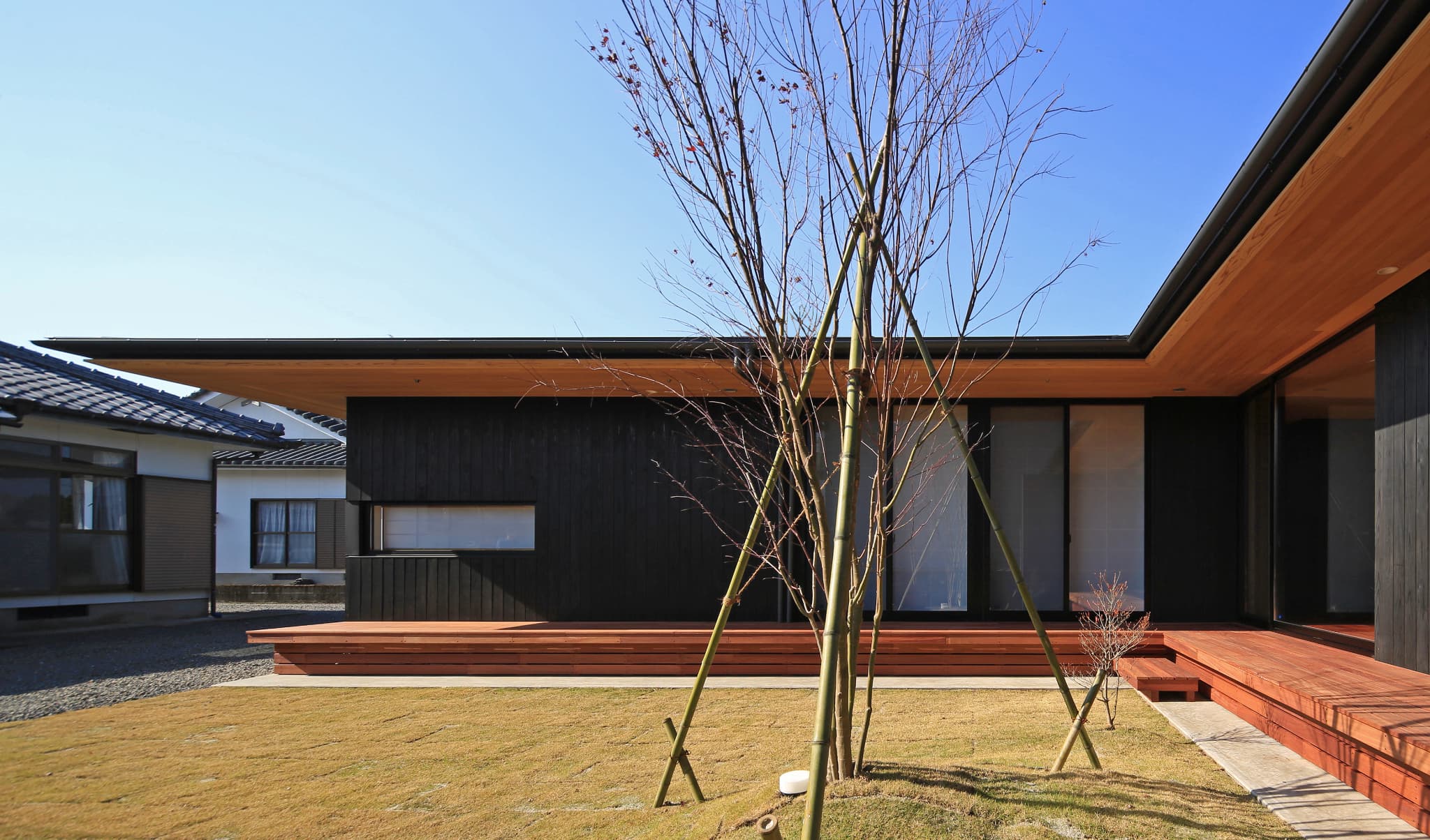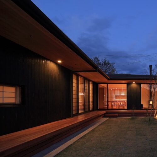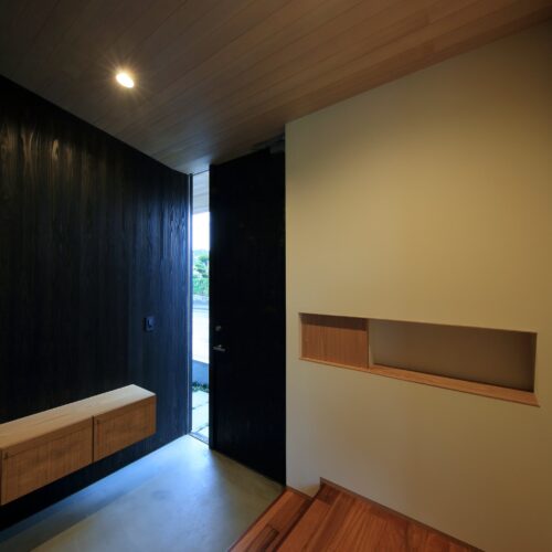 都城市の中⼼部から⾞で10分程度の住宅地に位置する住宅。前⾯道路からは閉鎖的であ