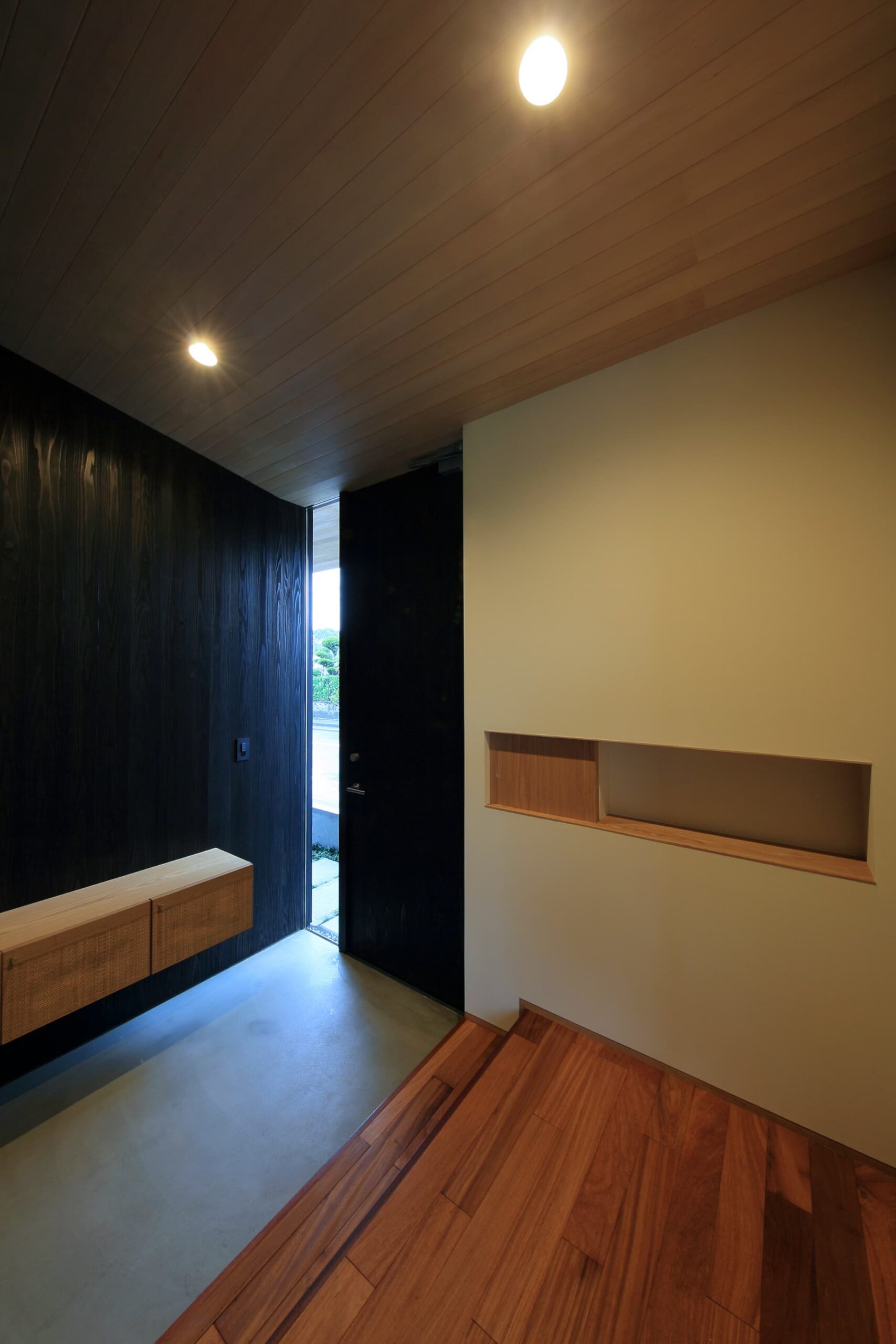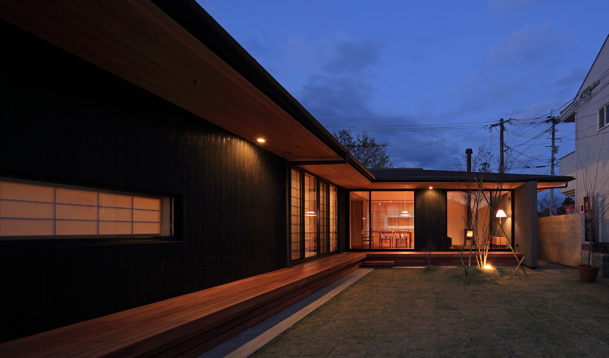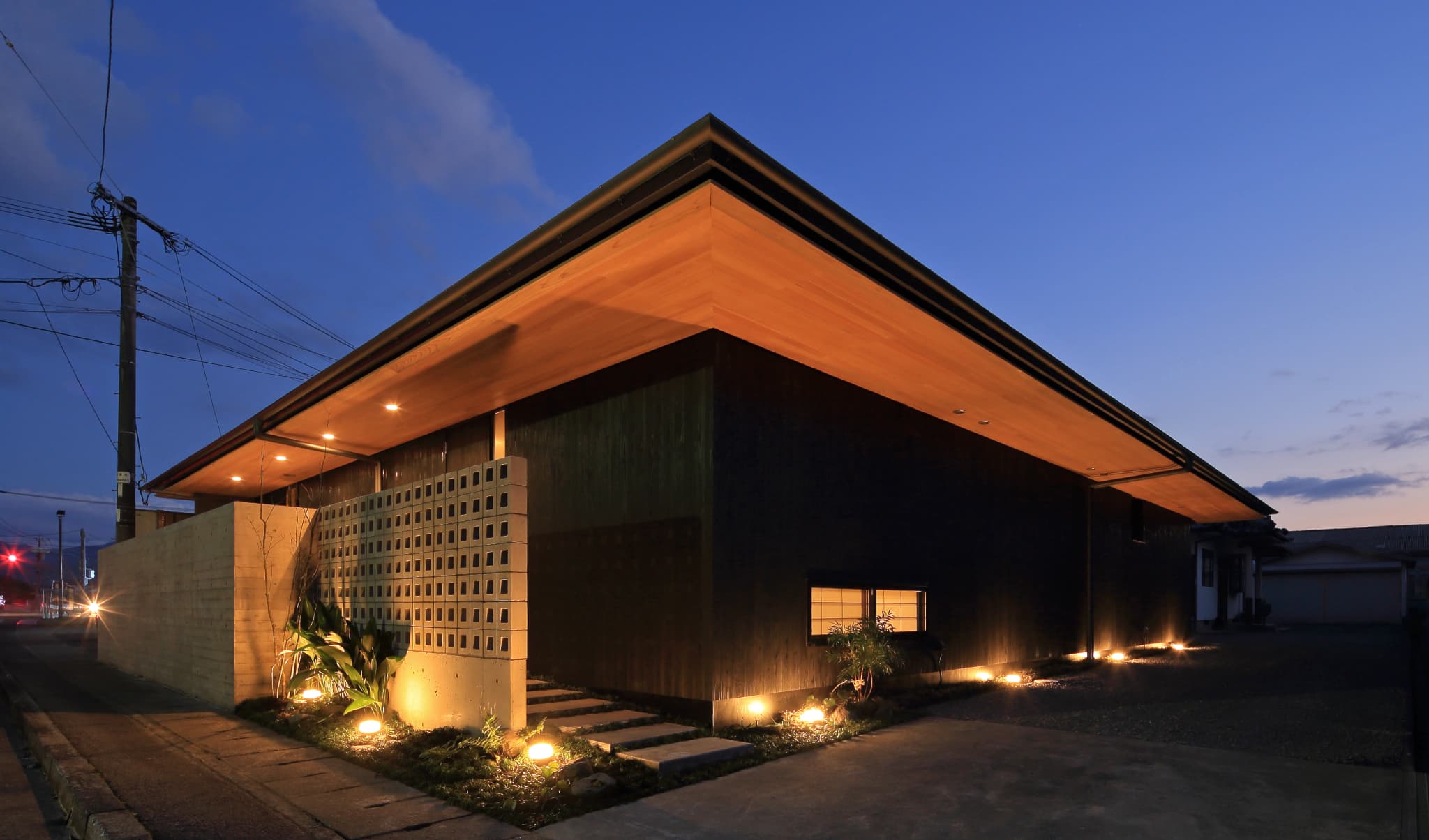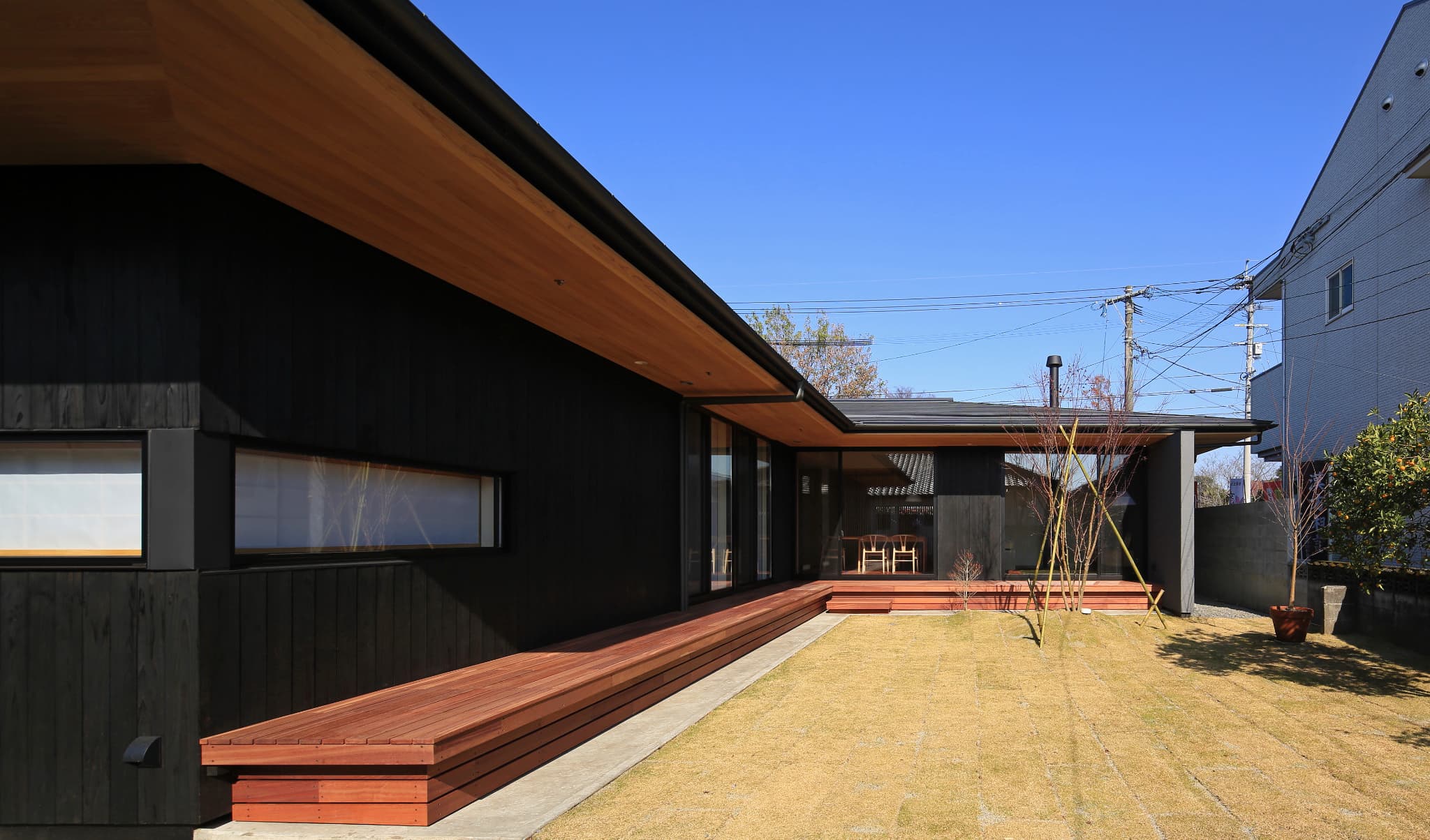 都城市の中⼼部から⾞で10分程度の住宅地に位置する住宅。前⾯道路からは閉鎖的であ