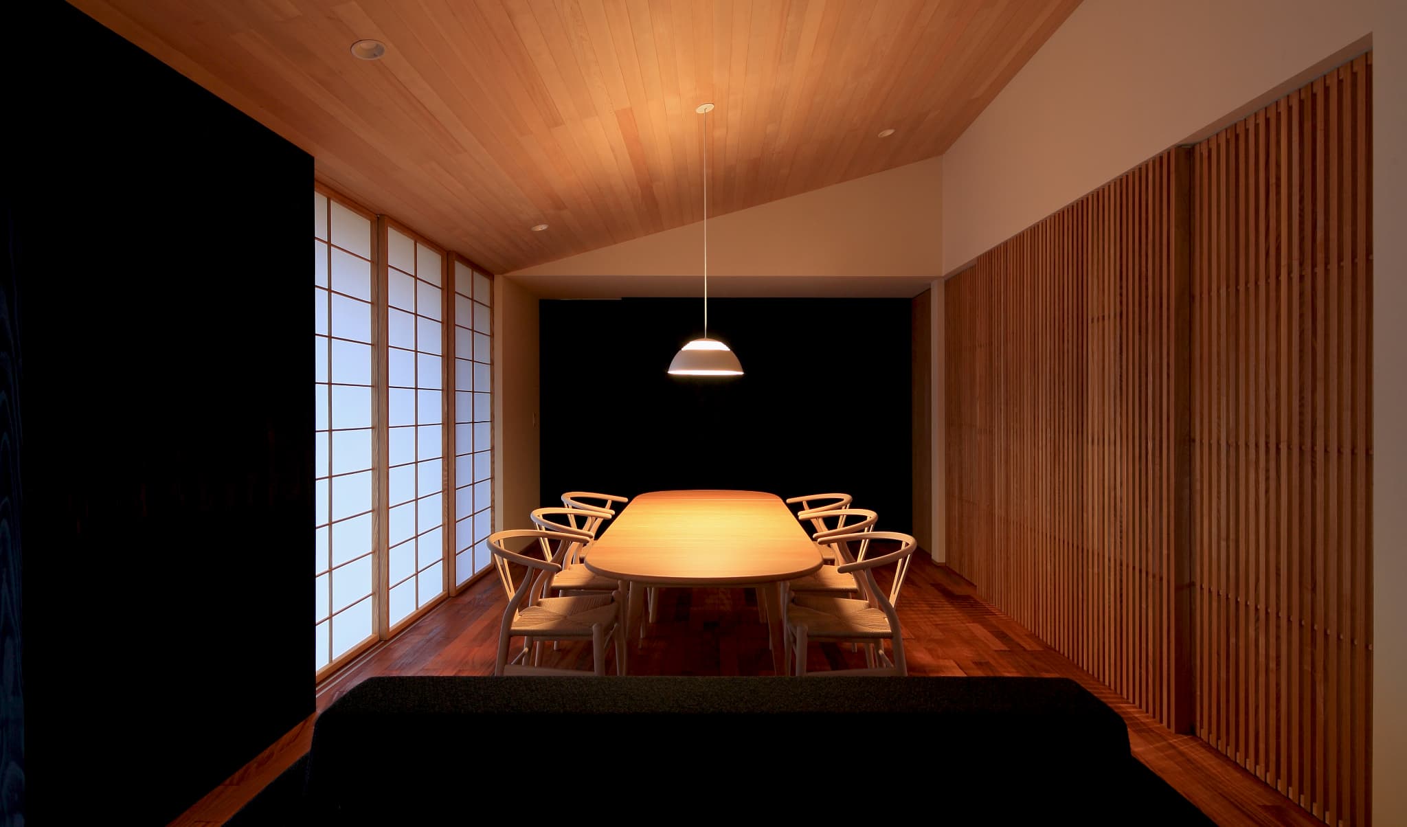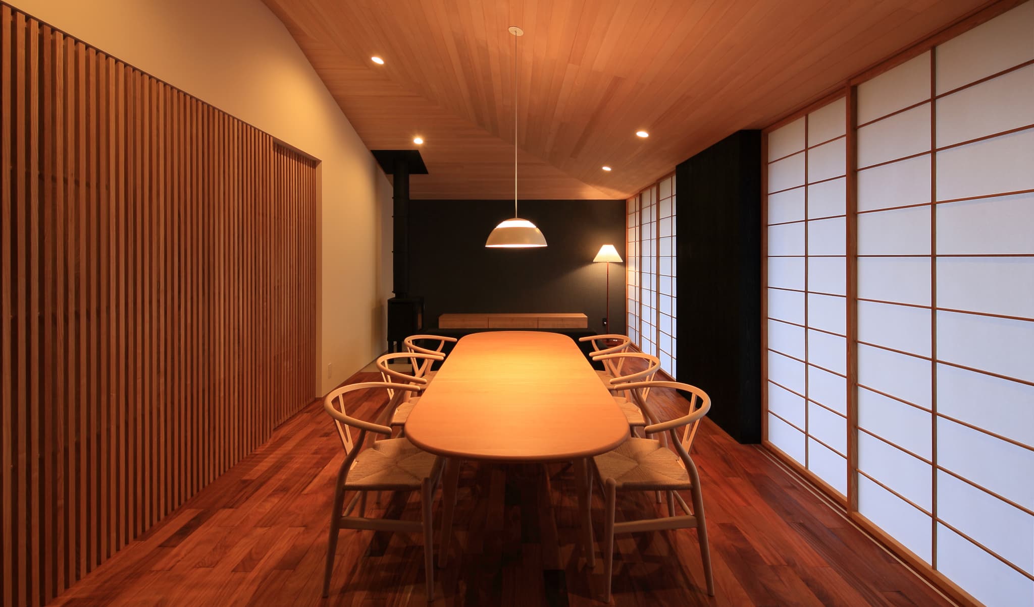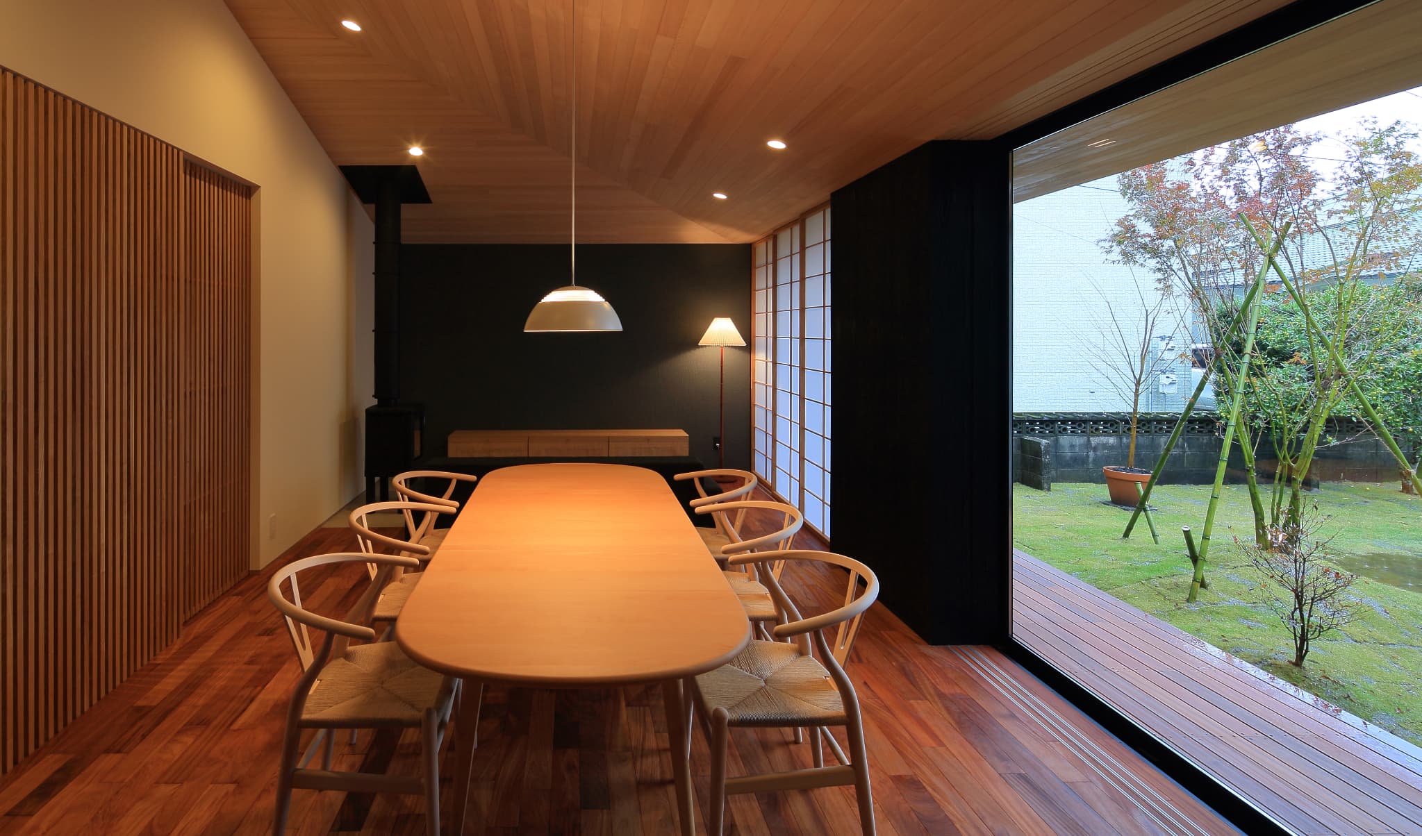 りながら、内側では開放的になるように計画。落ち着いた和の空間の中で北欧家具がしっ