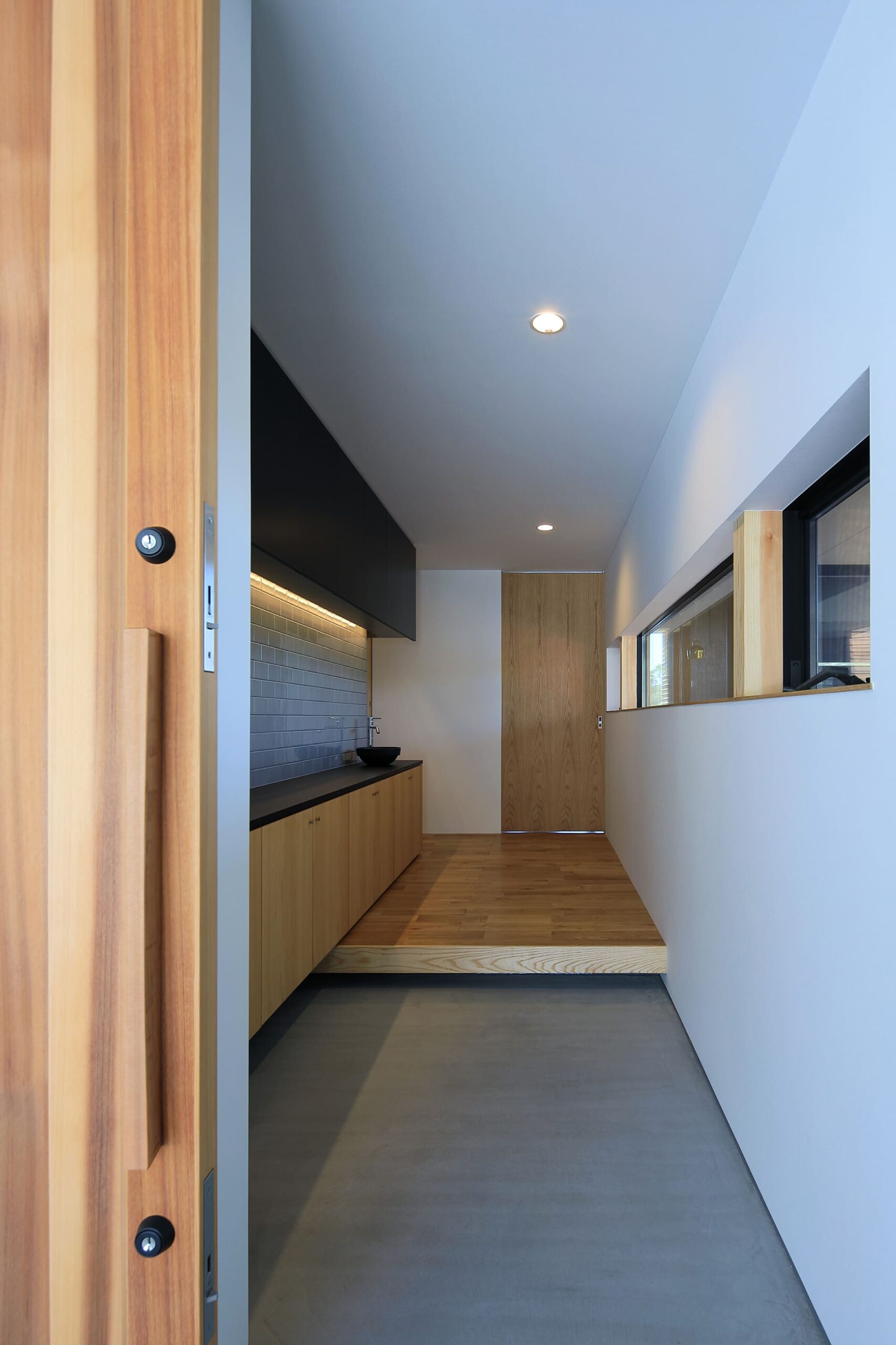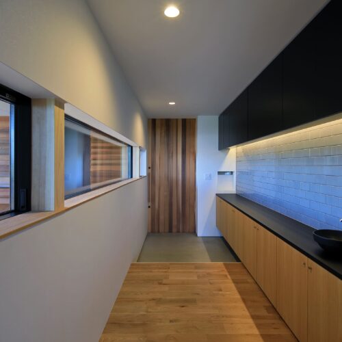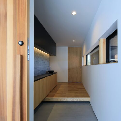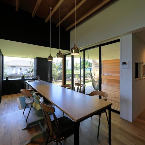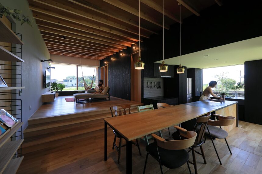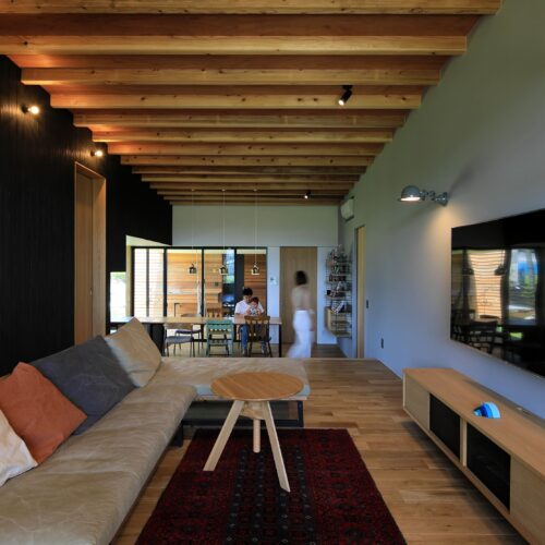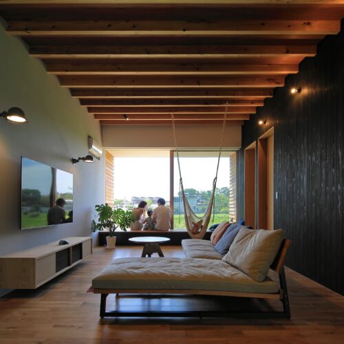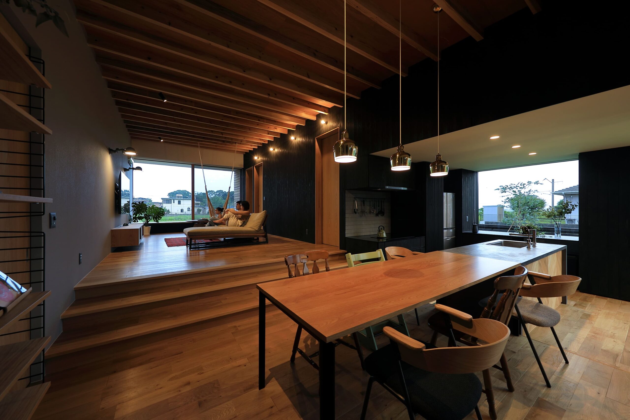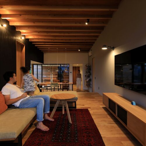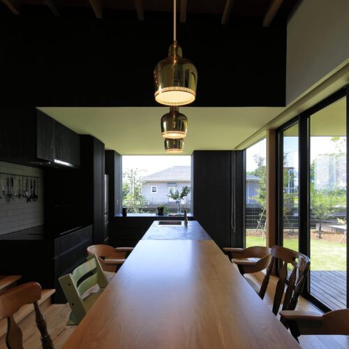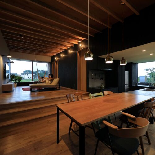 し、リビングは床⾼を上げて計画。南向きに⼤きく開いた住宅ではなく、東側と⼀部南側