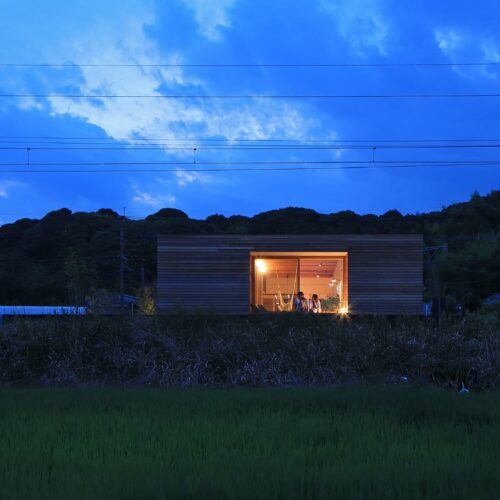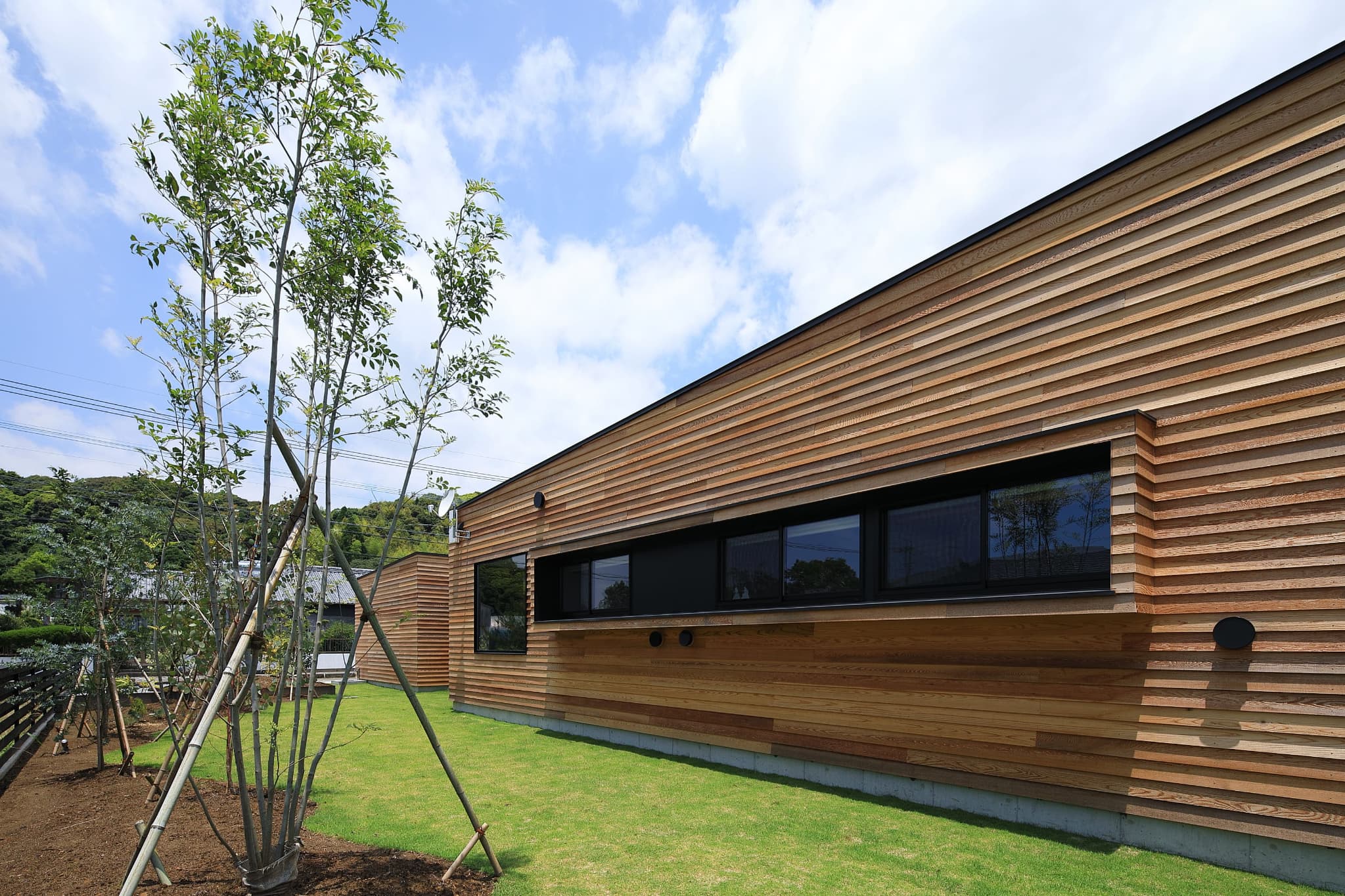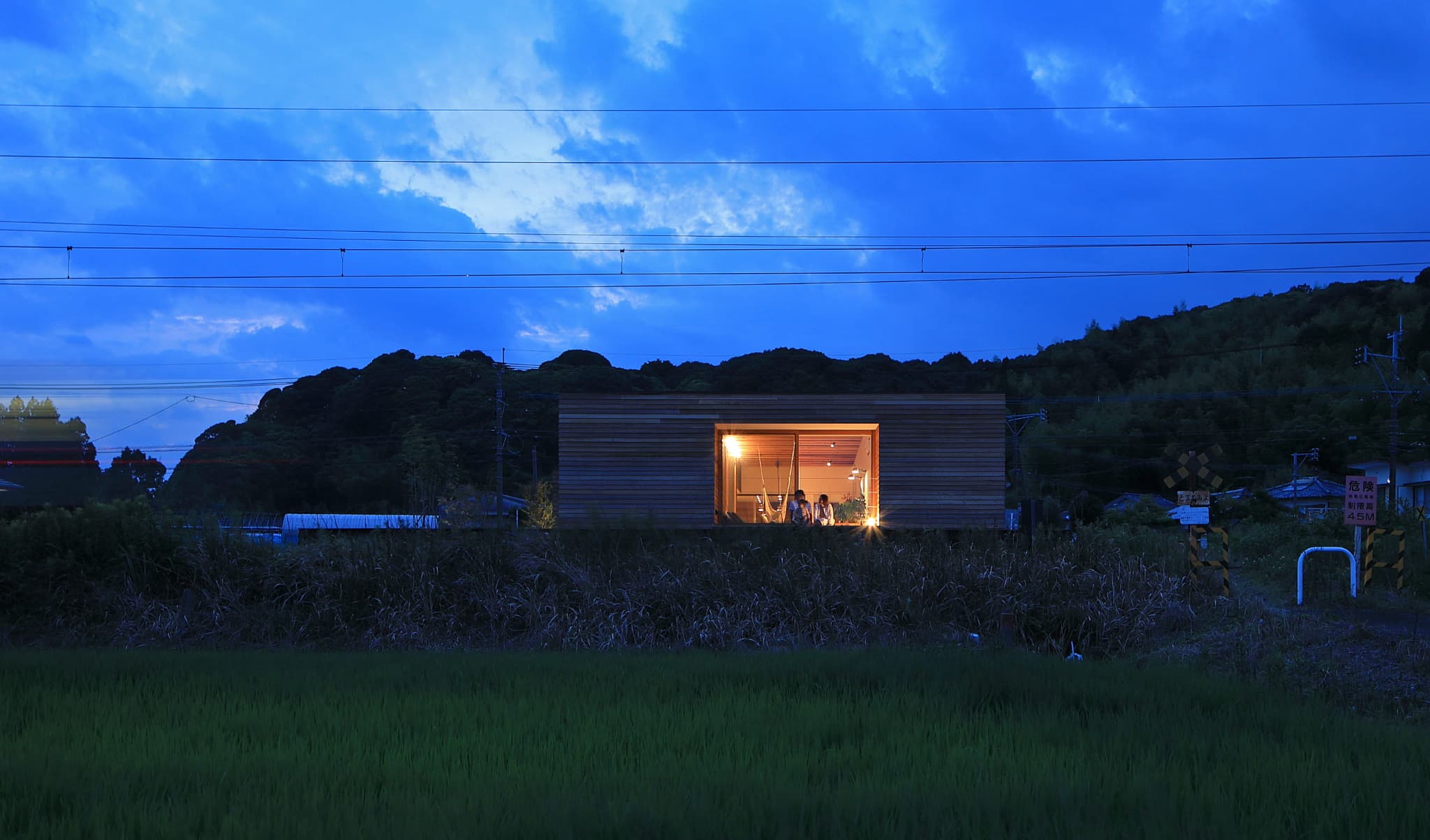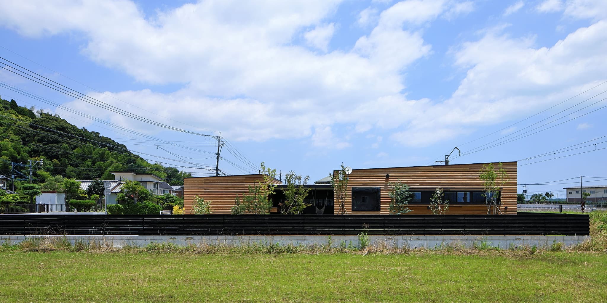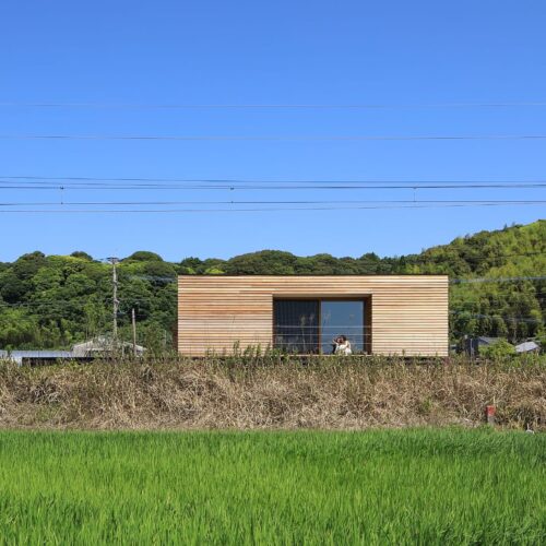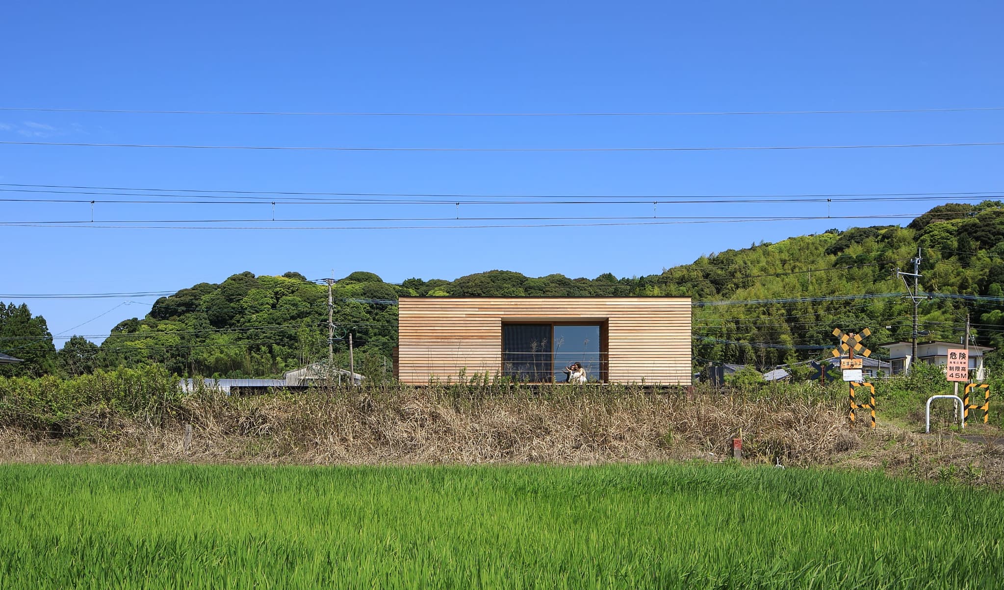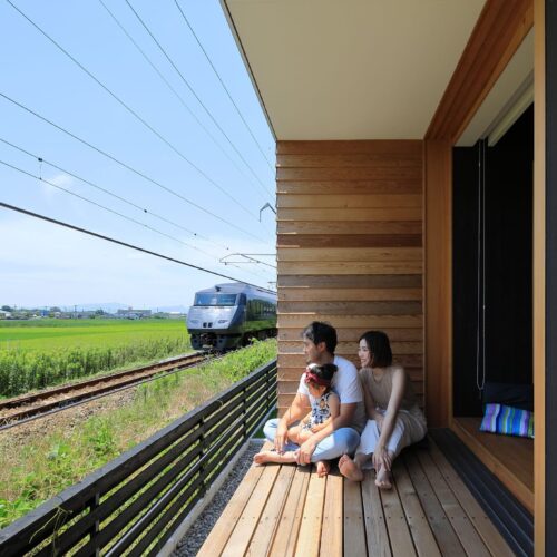 外壁をレッドシダーにすることで⽥園と線路の⾵景になじむ雰囲気。電⾞との視線を考慮