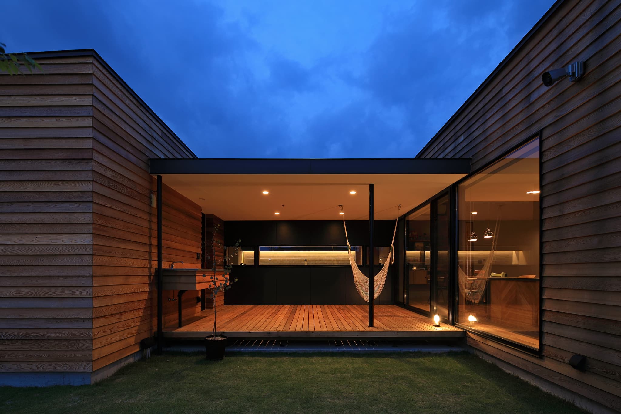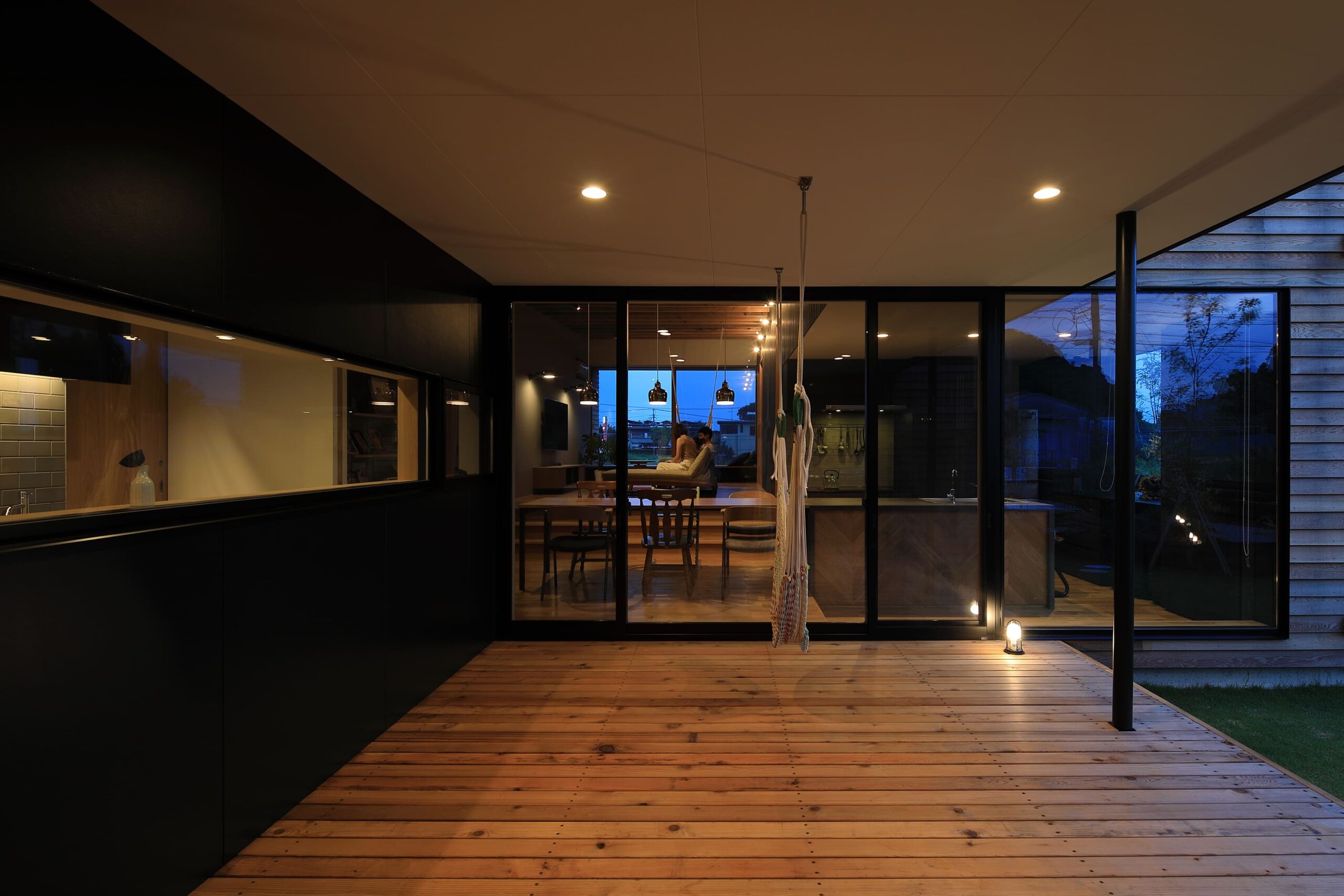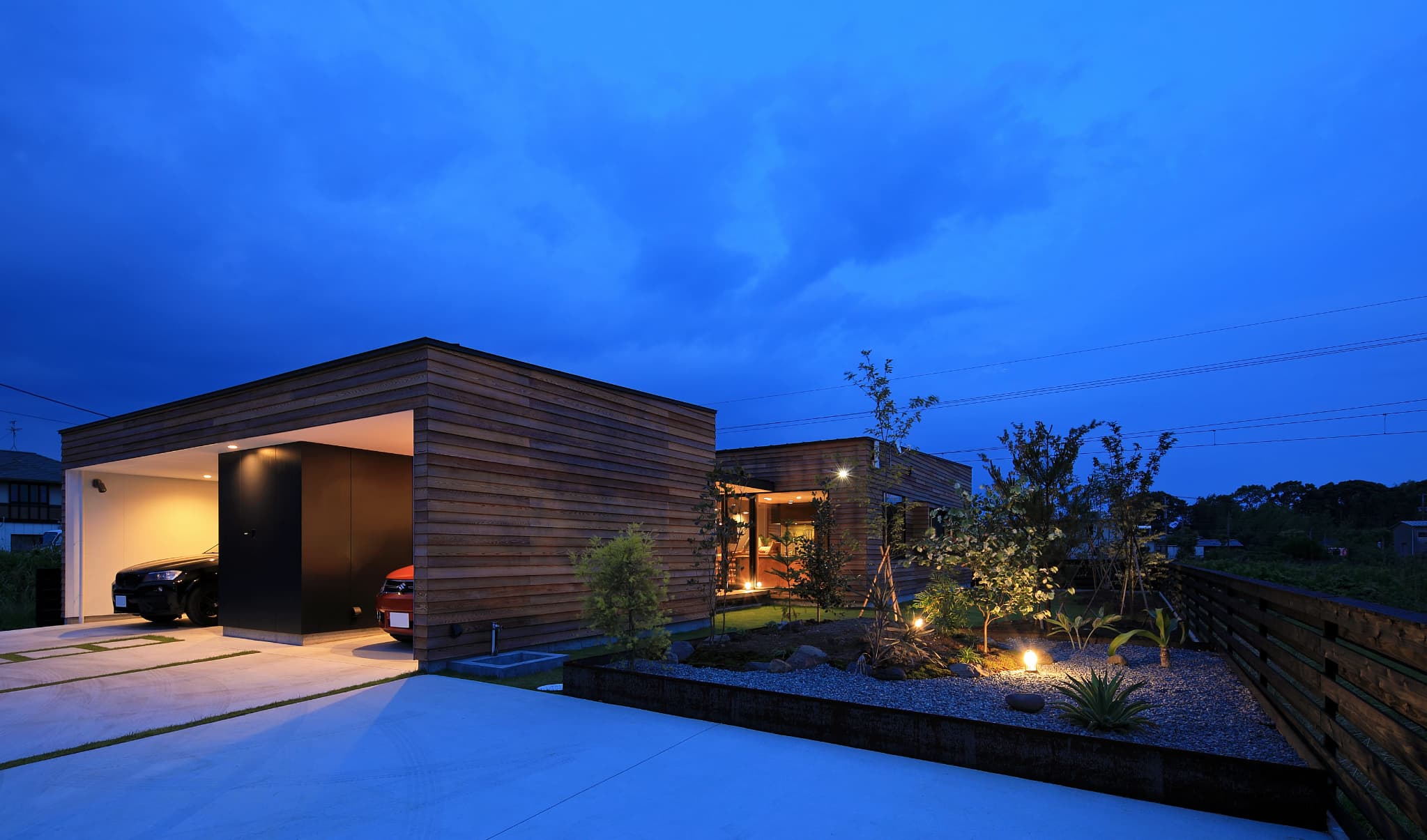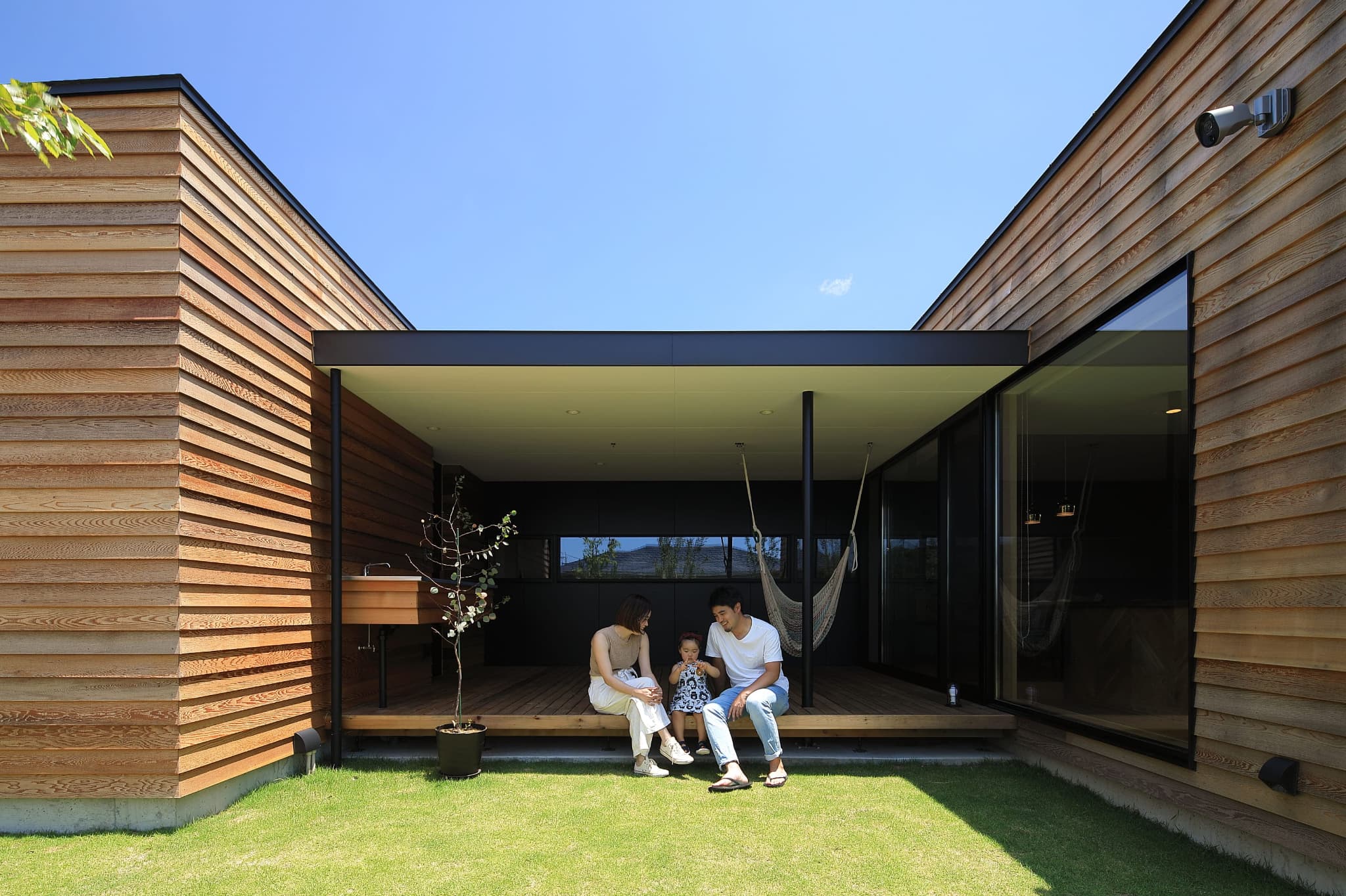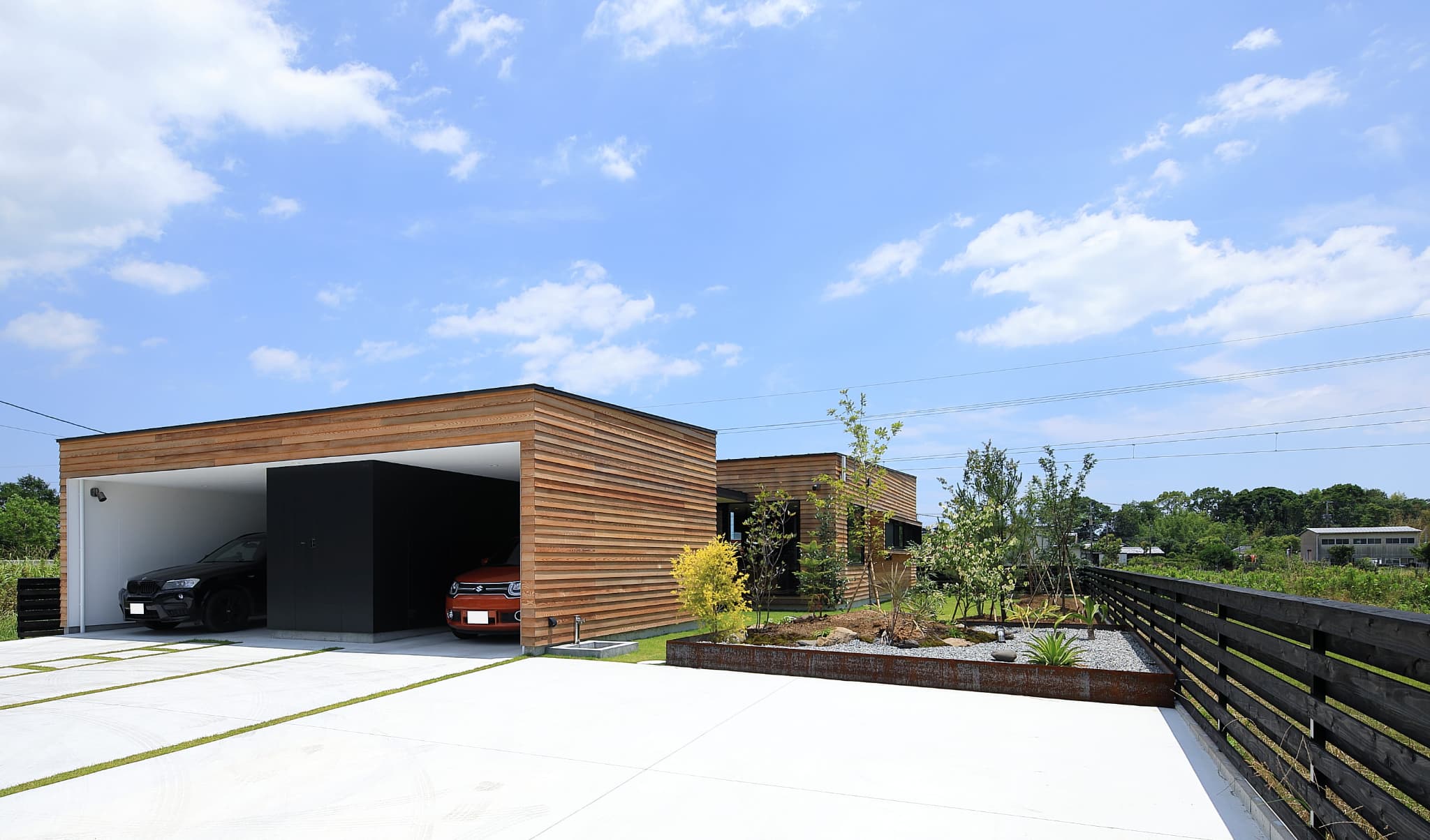 外壁をレッドシダーにすることで⽥園と線路の⾵景になじむ雰囲気。電⾞との視線を考慮