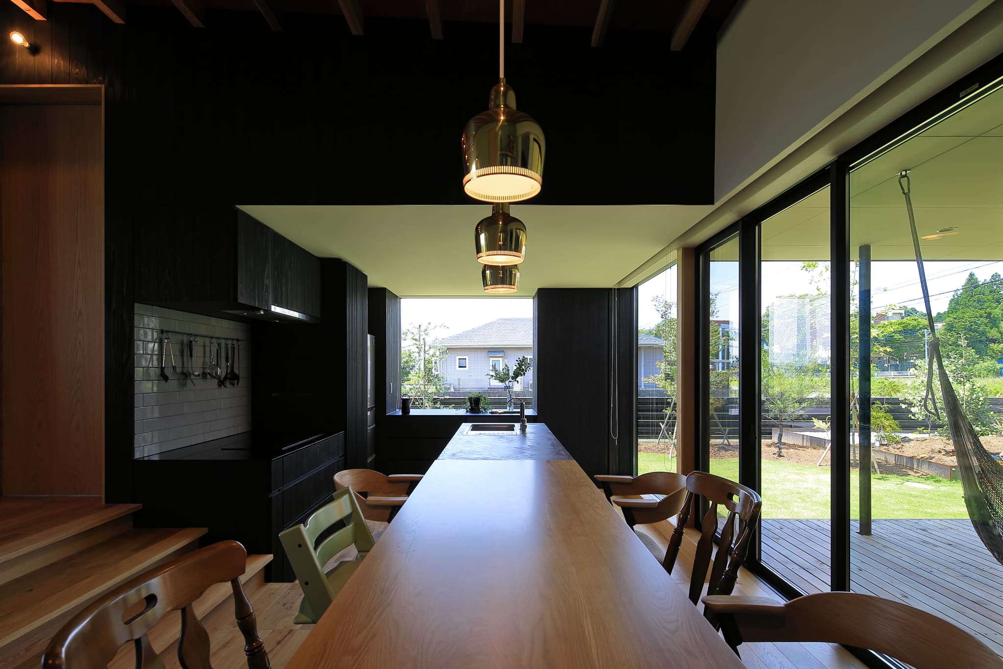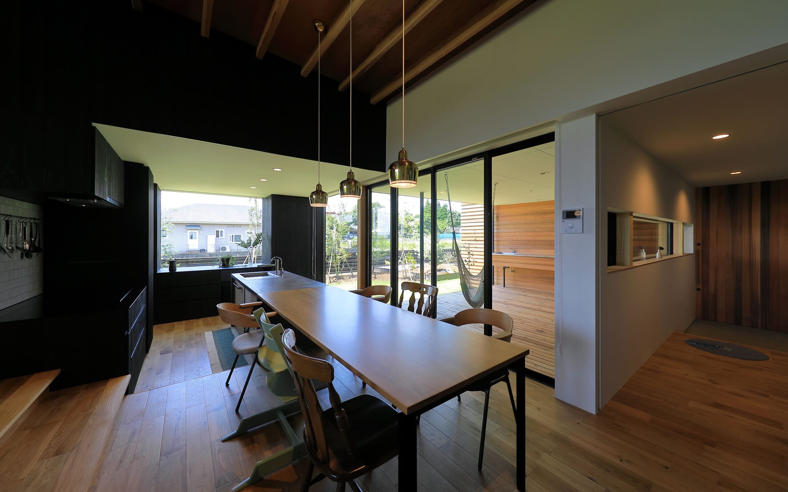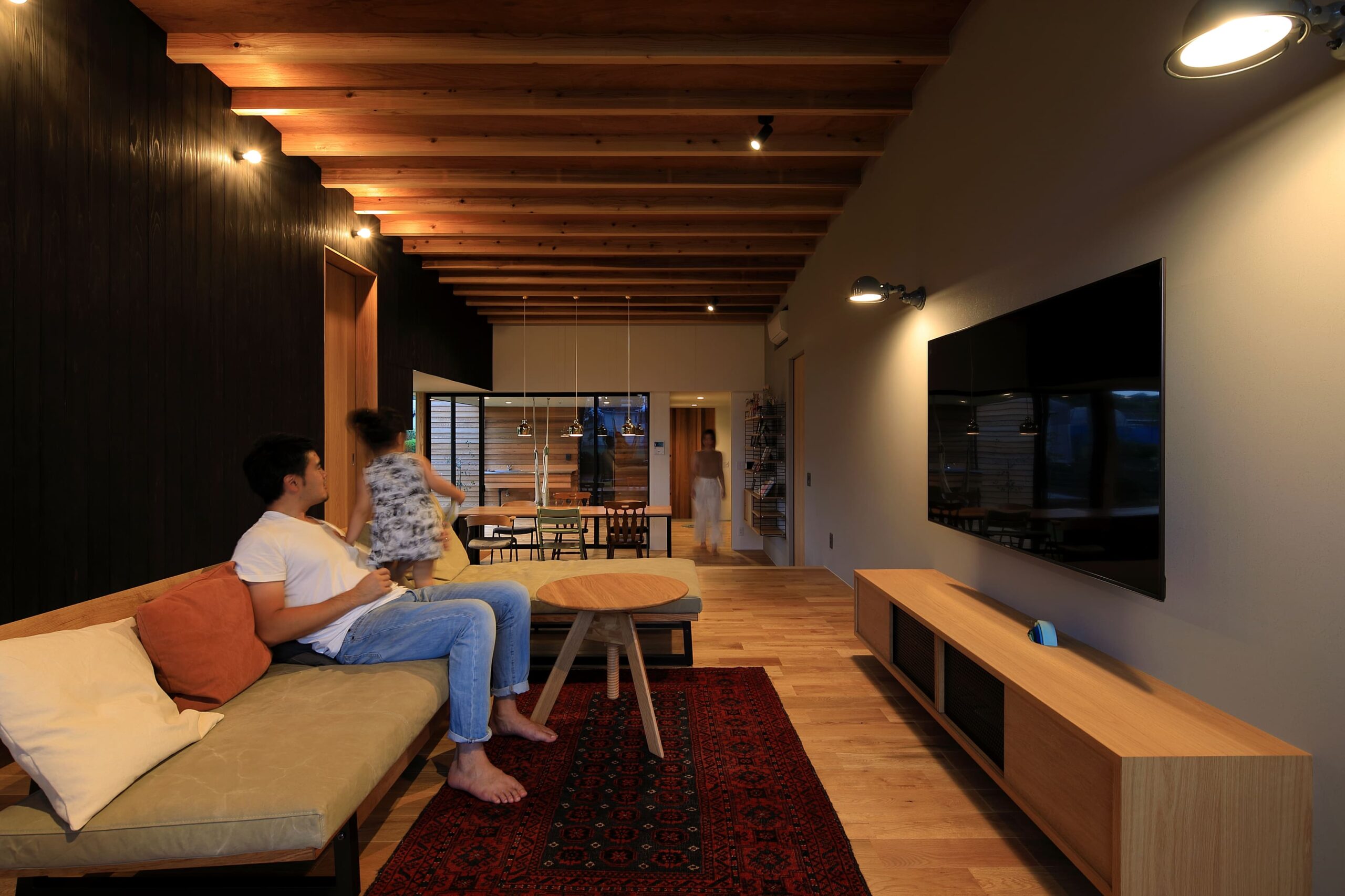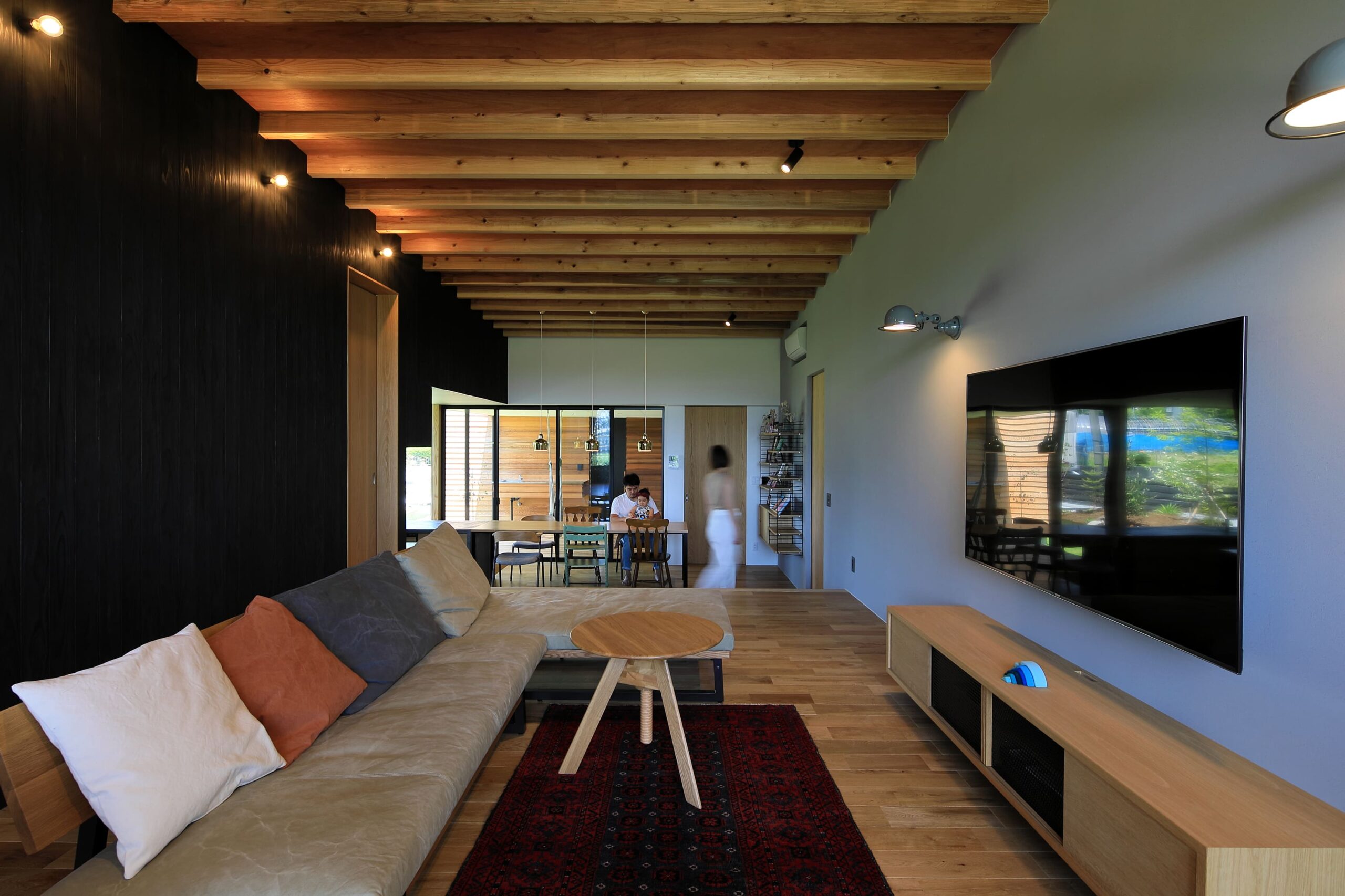 に開⼝部を設けることにより、適度な明るさで快適な LDK としている。