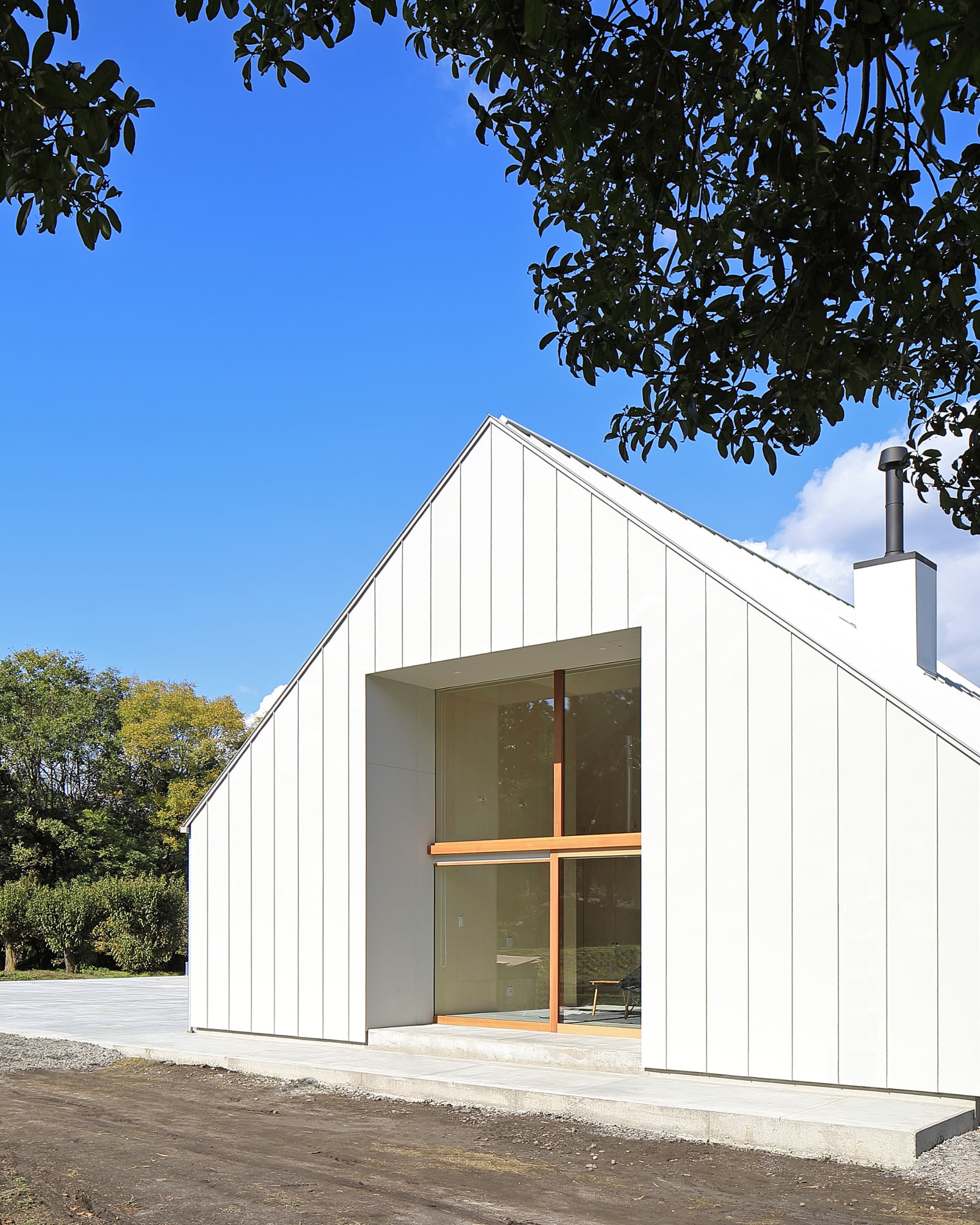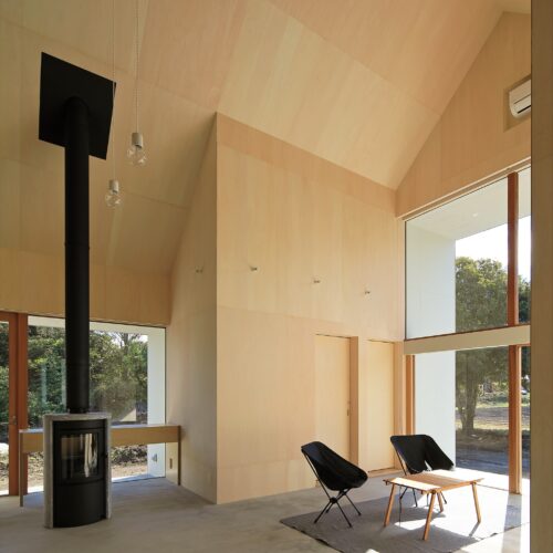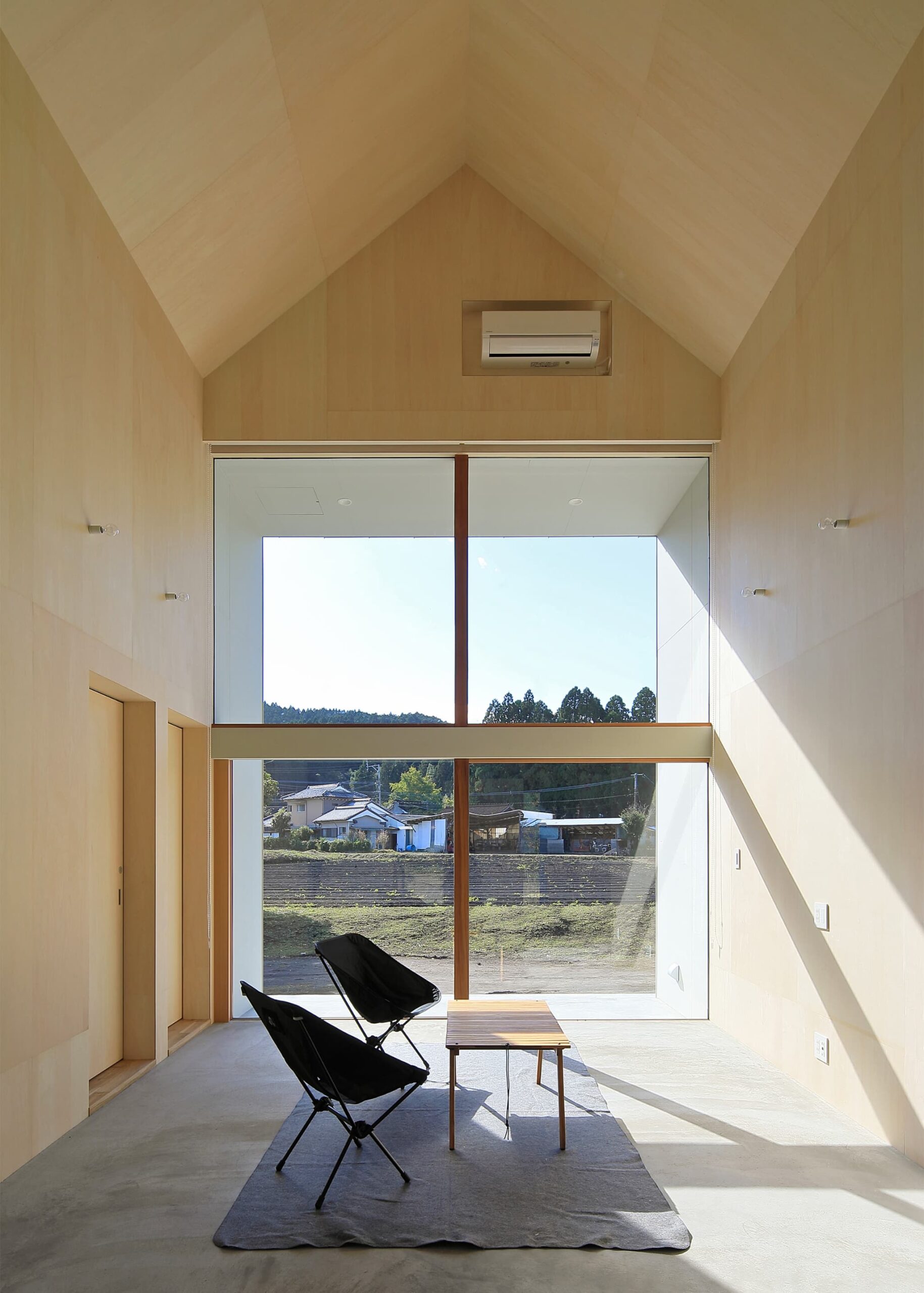 切妻の屋根にすることで、リビング等の天井は⾼いところで約 5.5m ある気持ちのよい共⽤