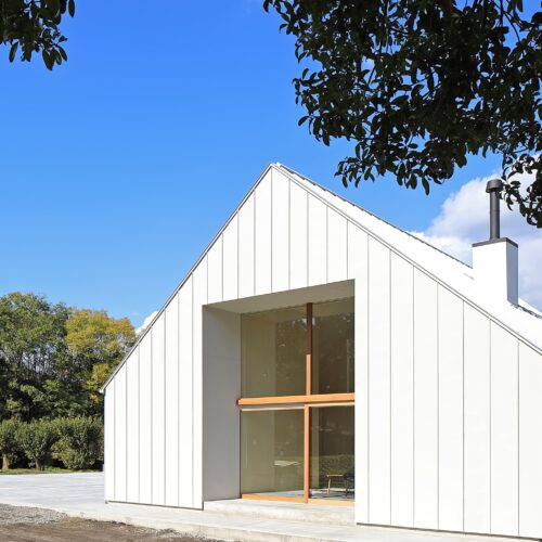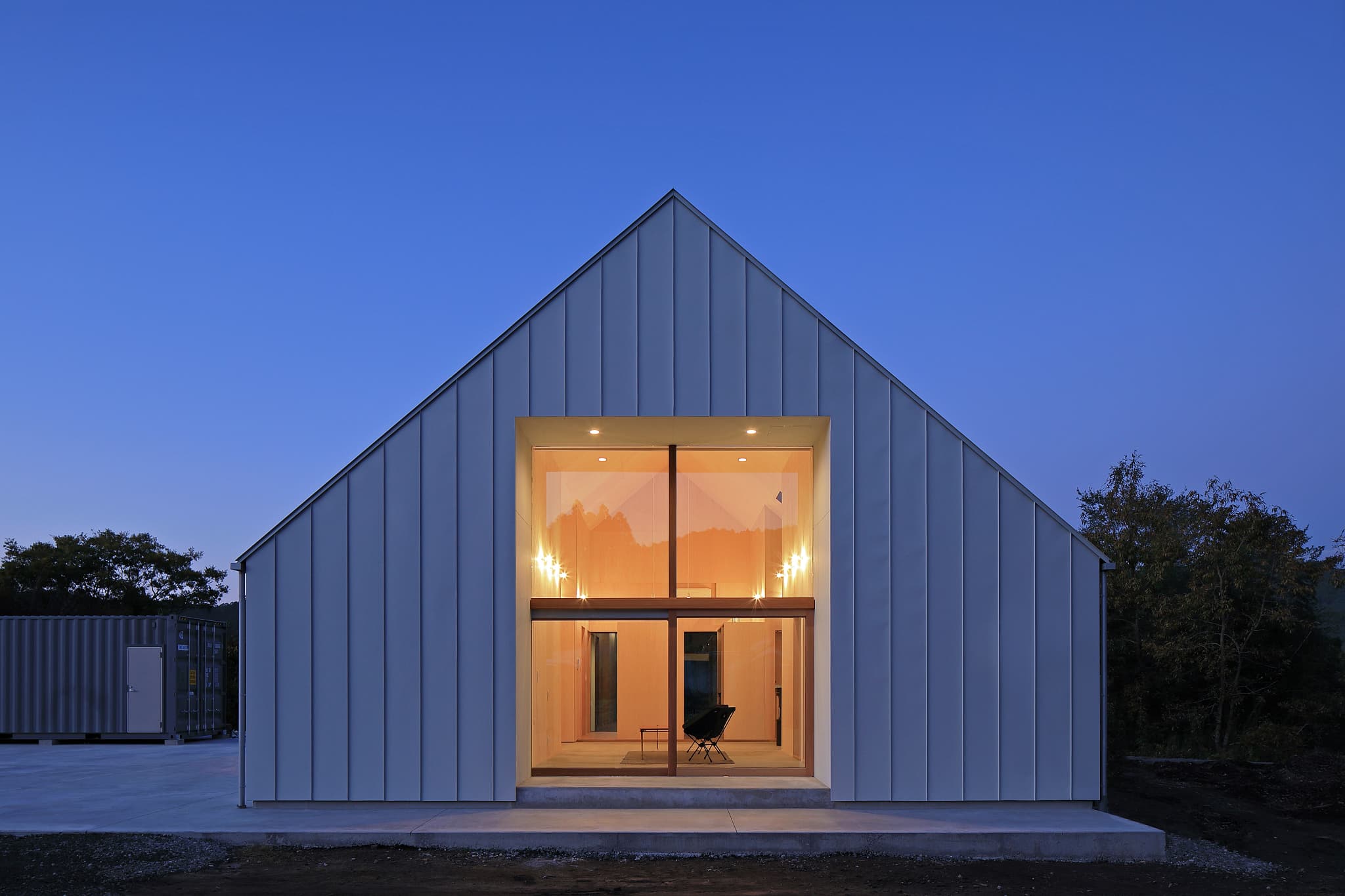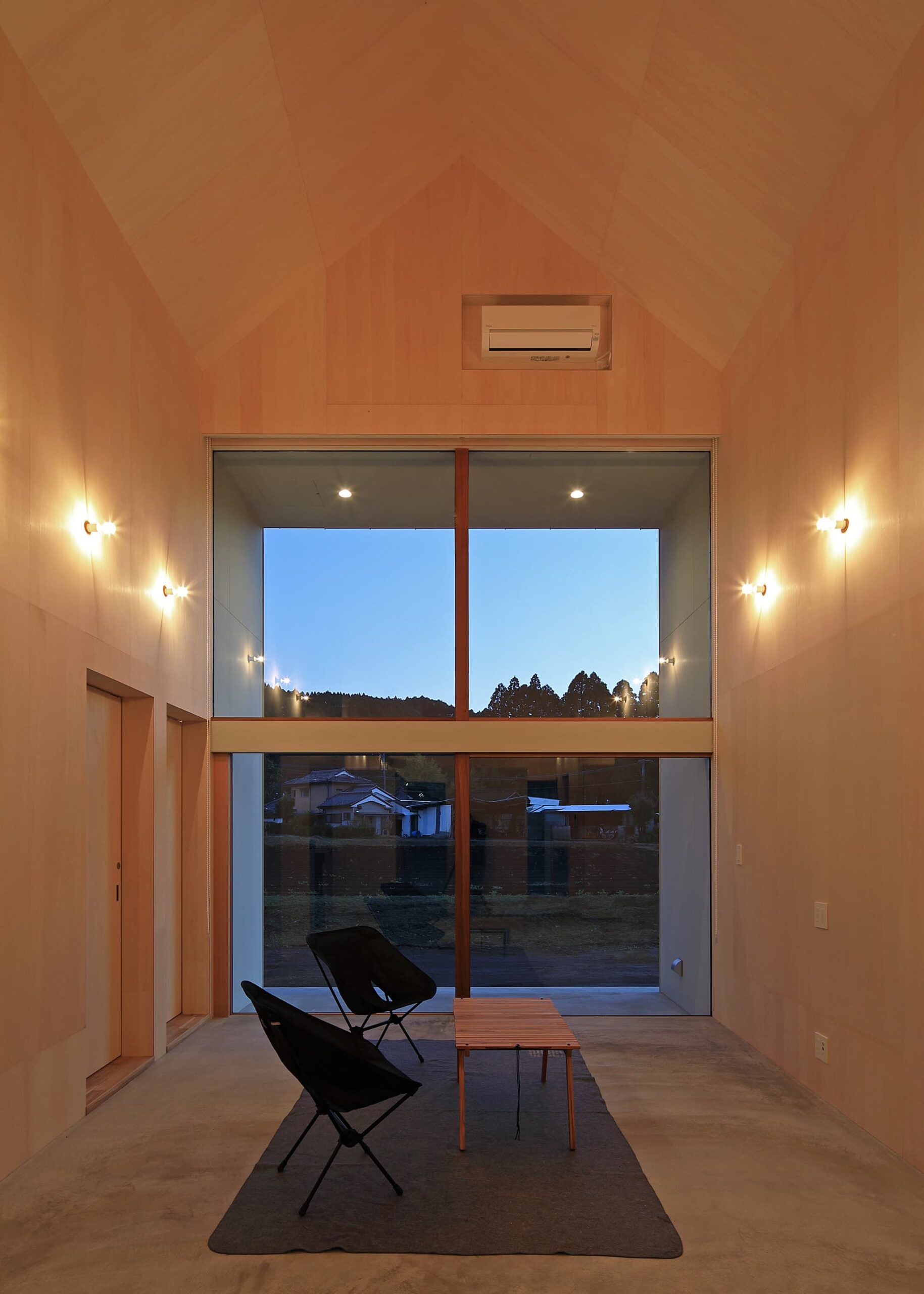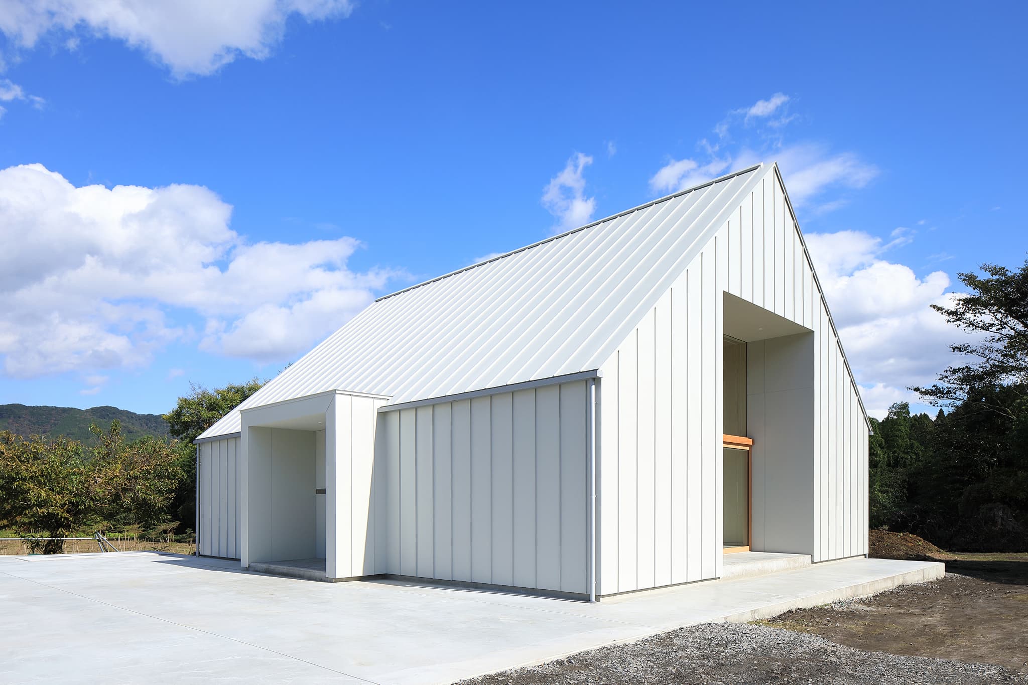 切妻の屋根にすることで、リビング等の天井は⾼いところで約 5.5m ある気持ちのよい共⽤