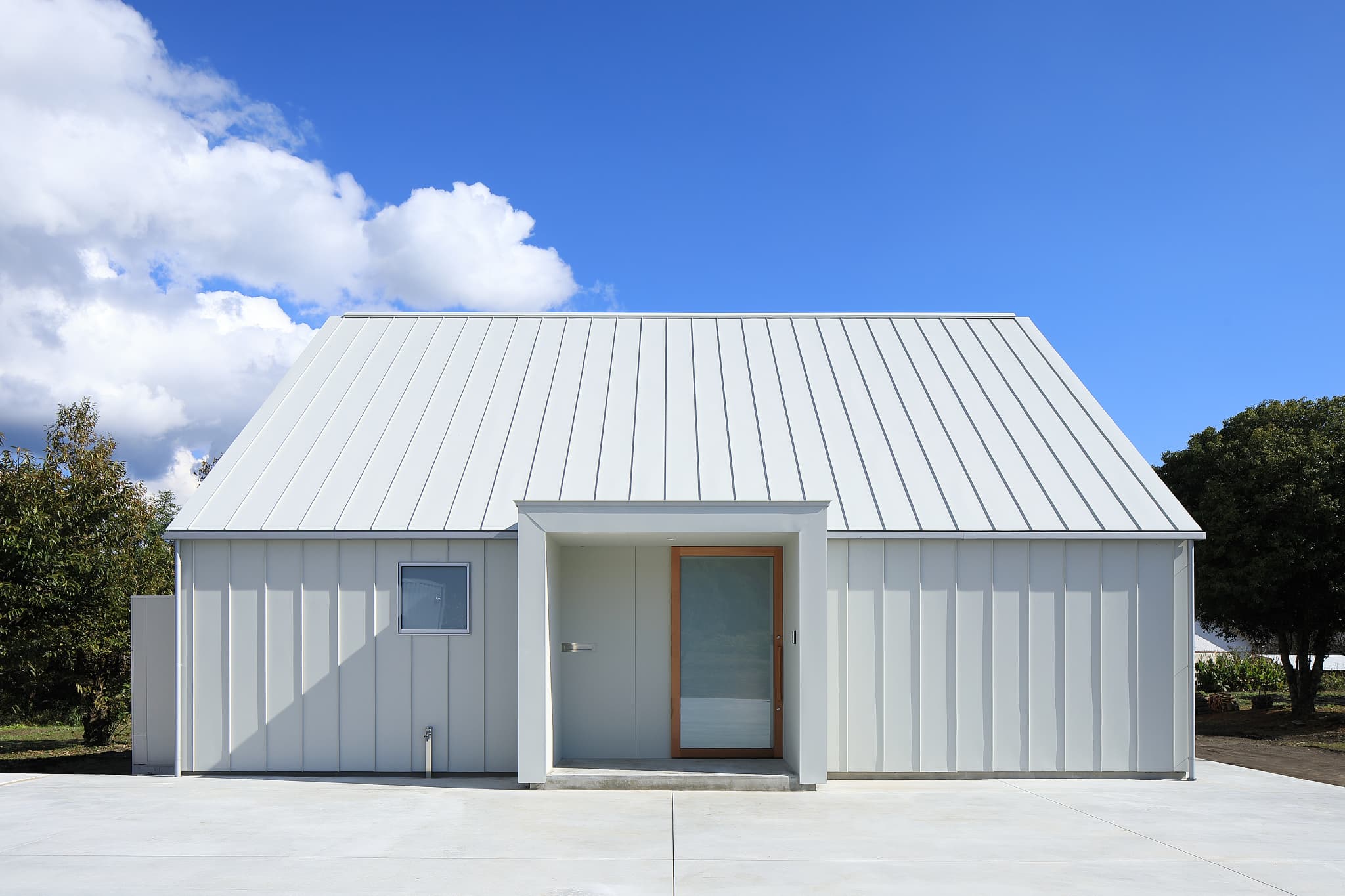 ⼩林市野尻町の幹線道路から少し⼊った樹林と畑に囲まれた落ち着いた雰囲気に位置する住宅。